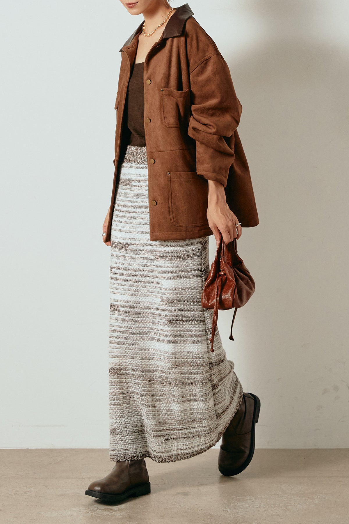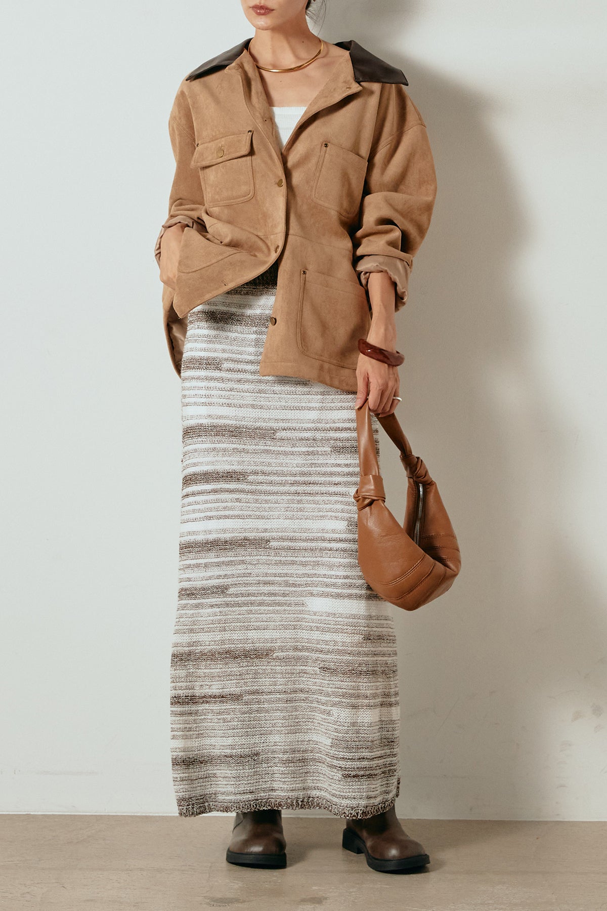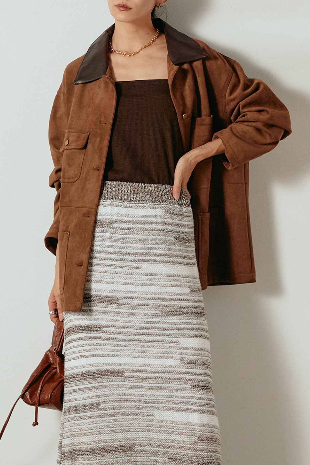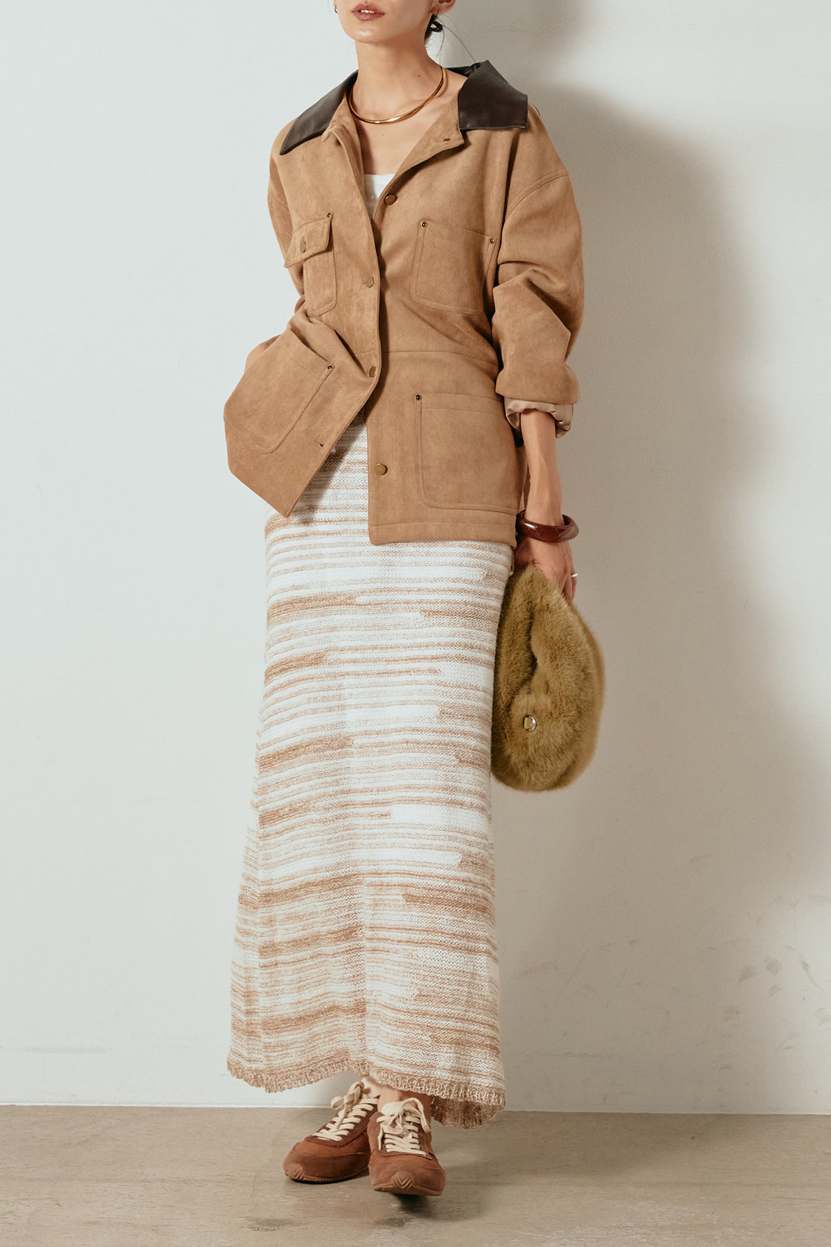 ニュアンス感のある“かすれライン柄”が目を惹く、表情豊かなニットスカート。