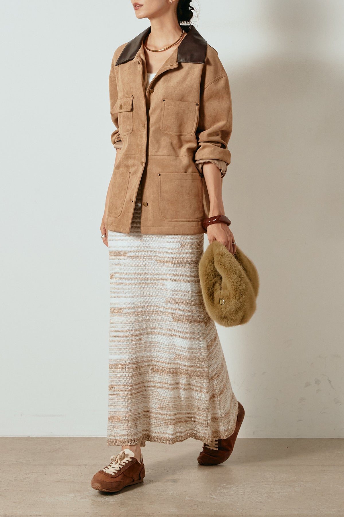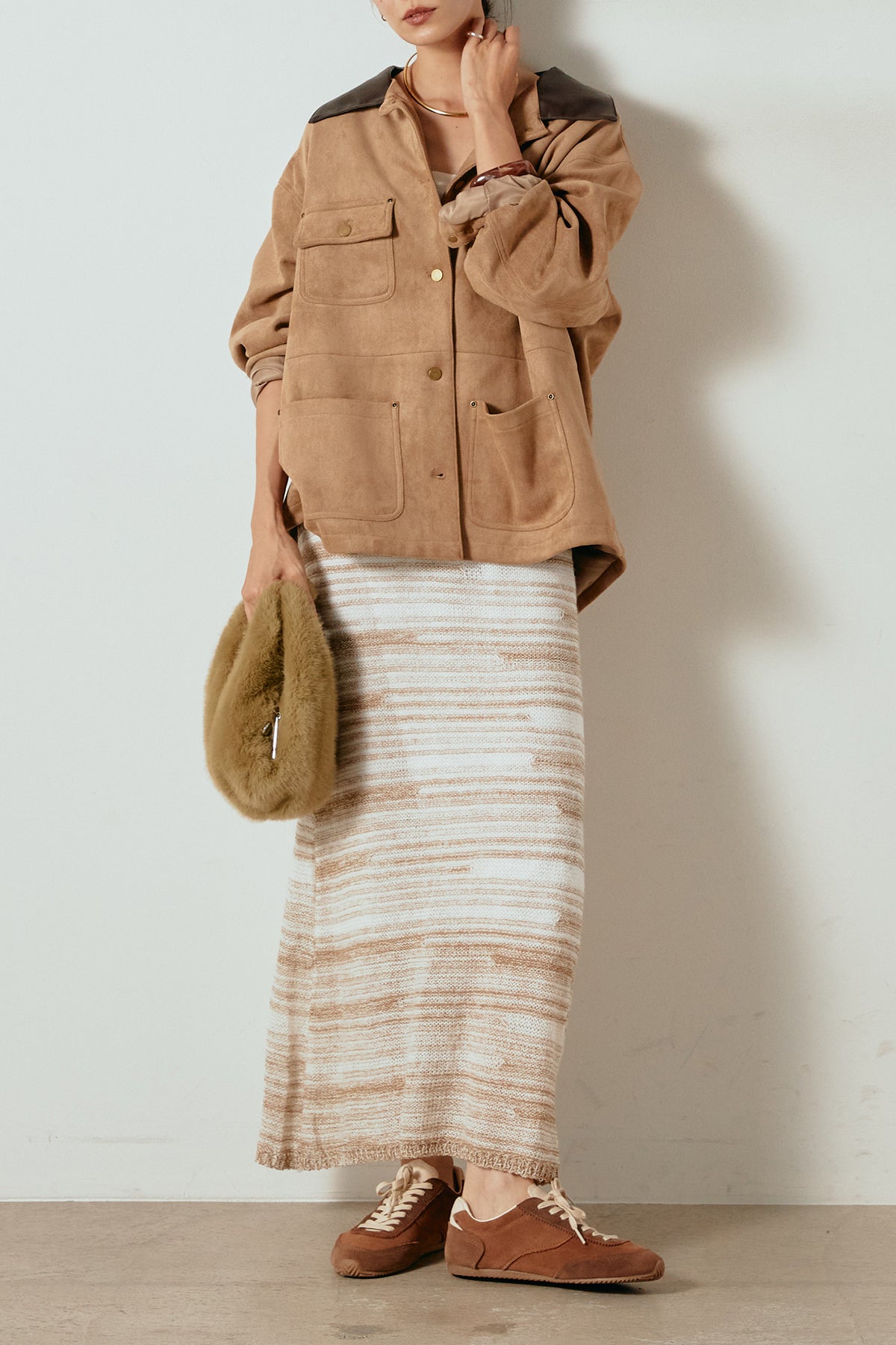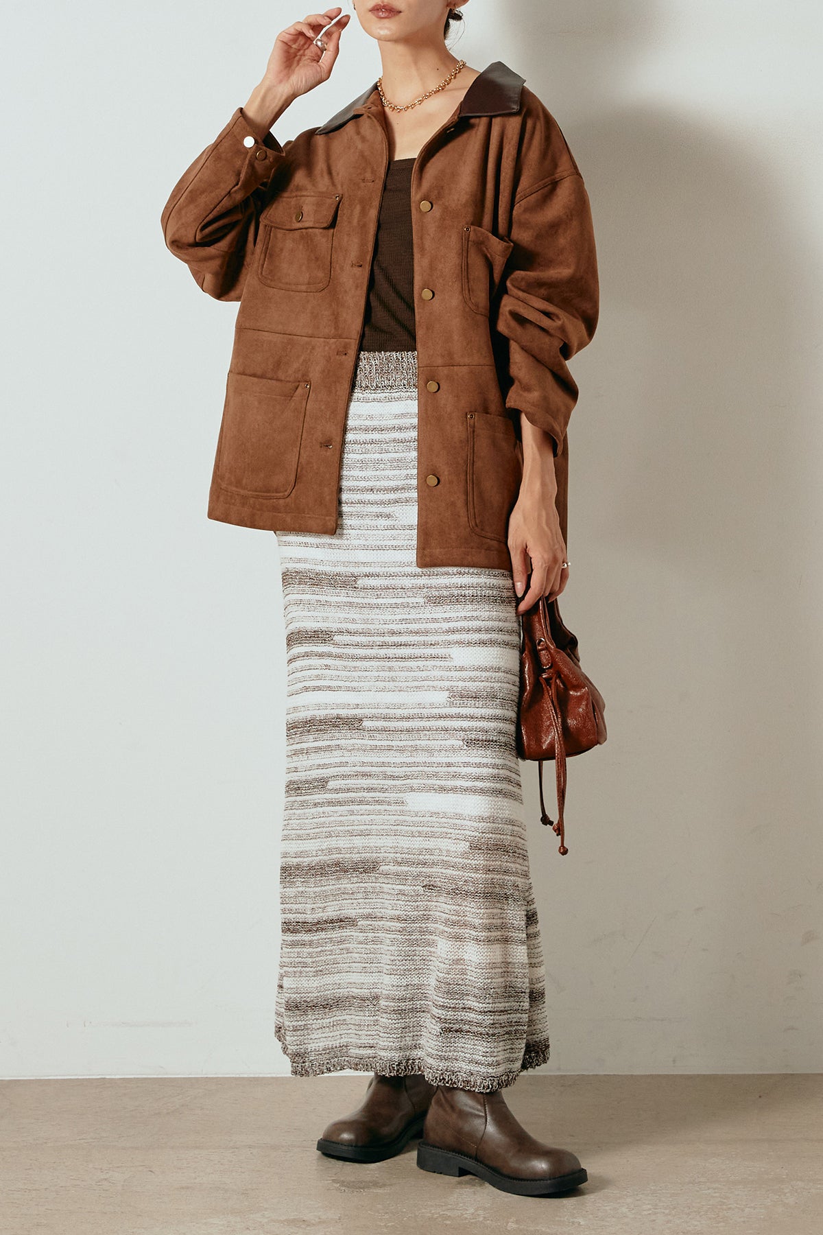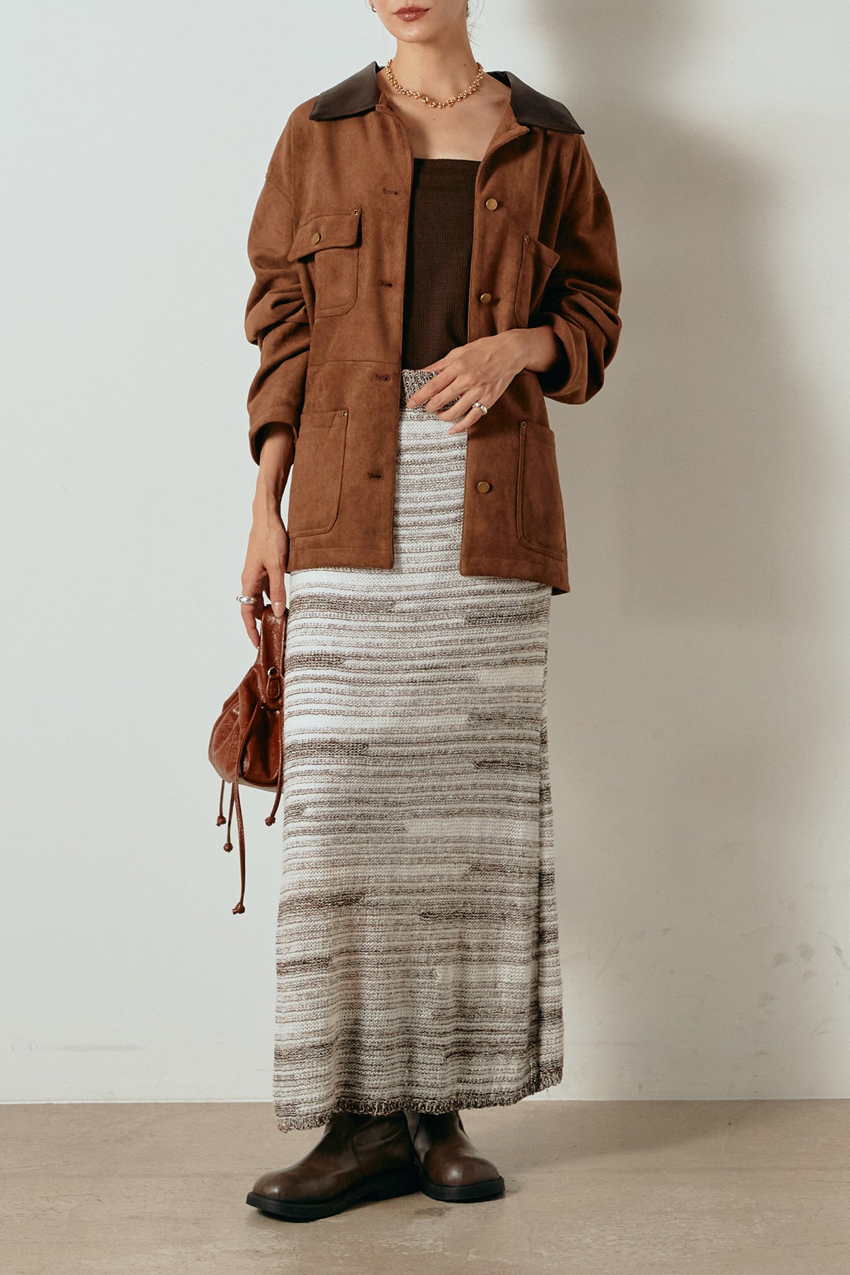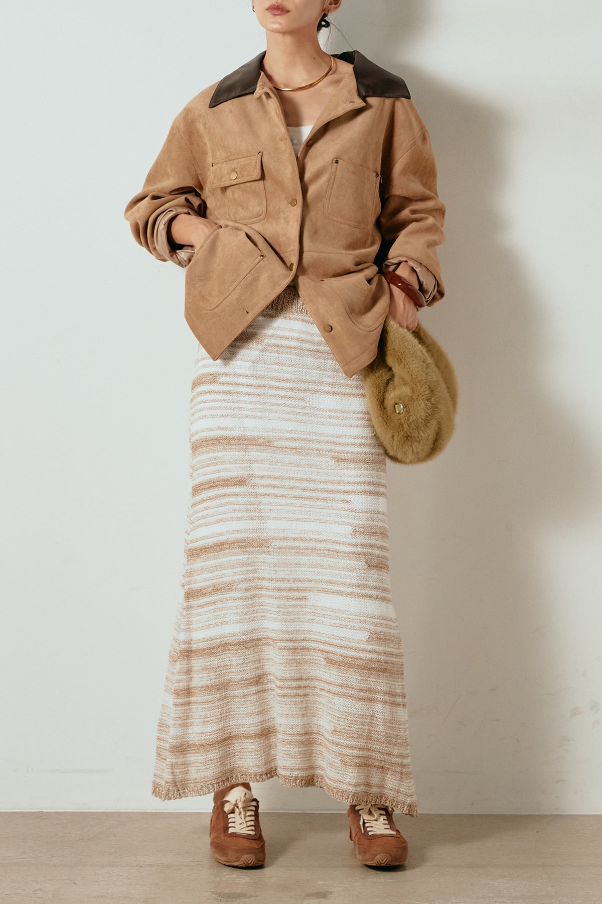 ニュアンス感のある“かすれライン柄”が目を惹く、表情豊かなニットスカート。