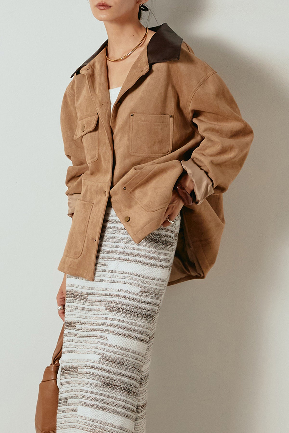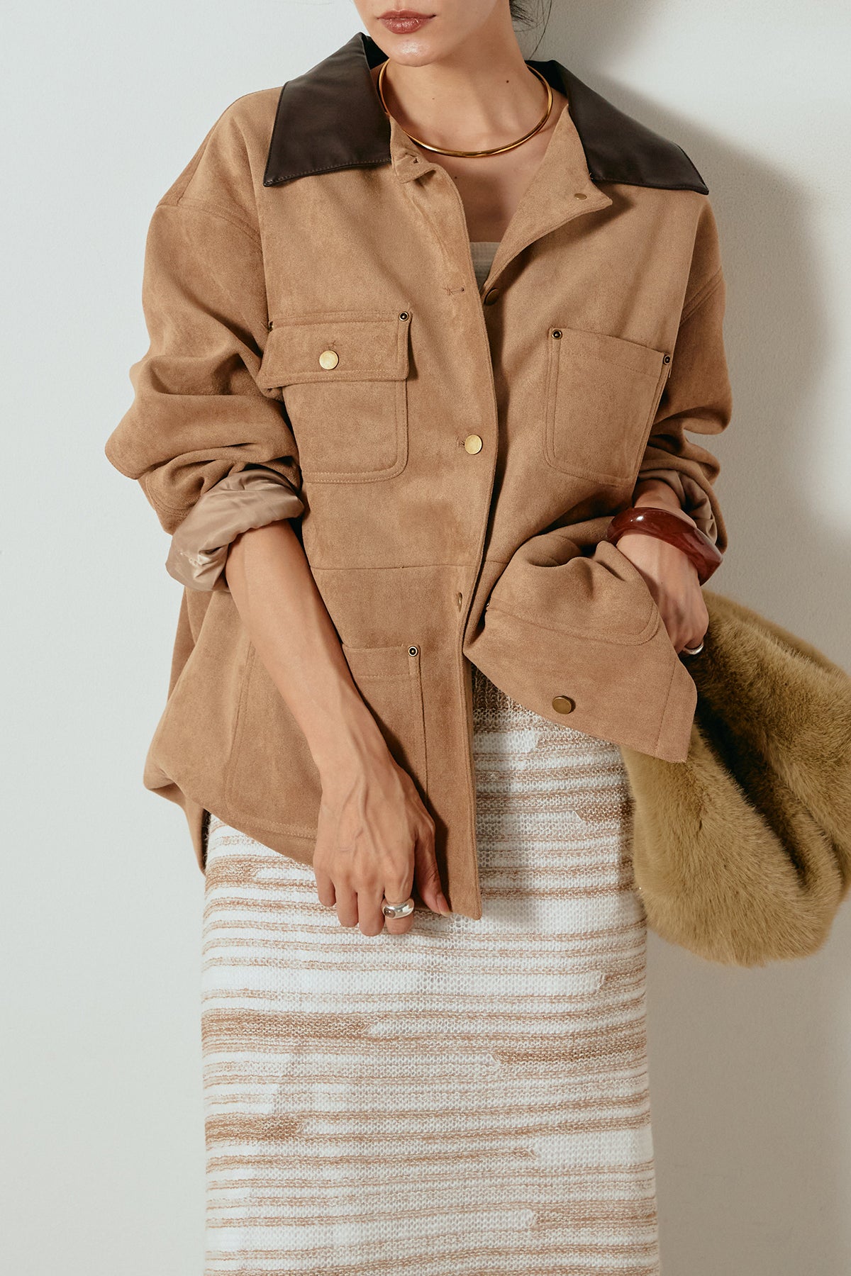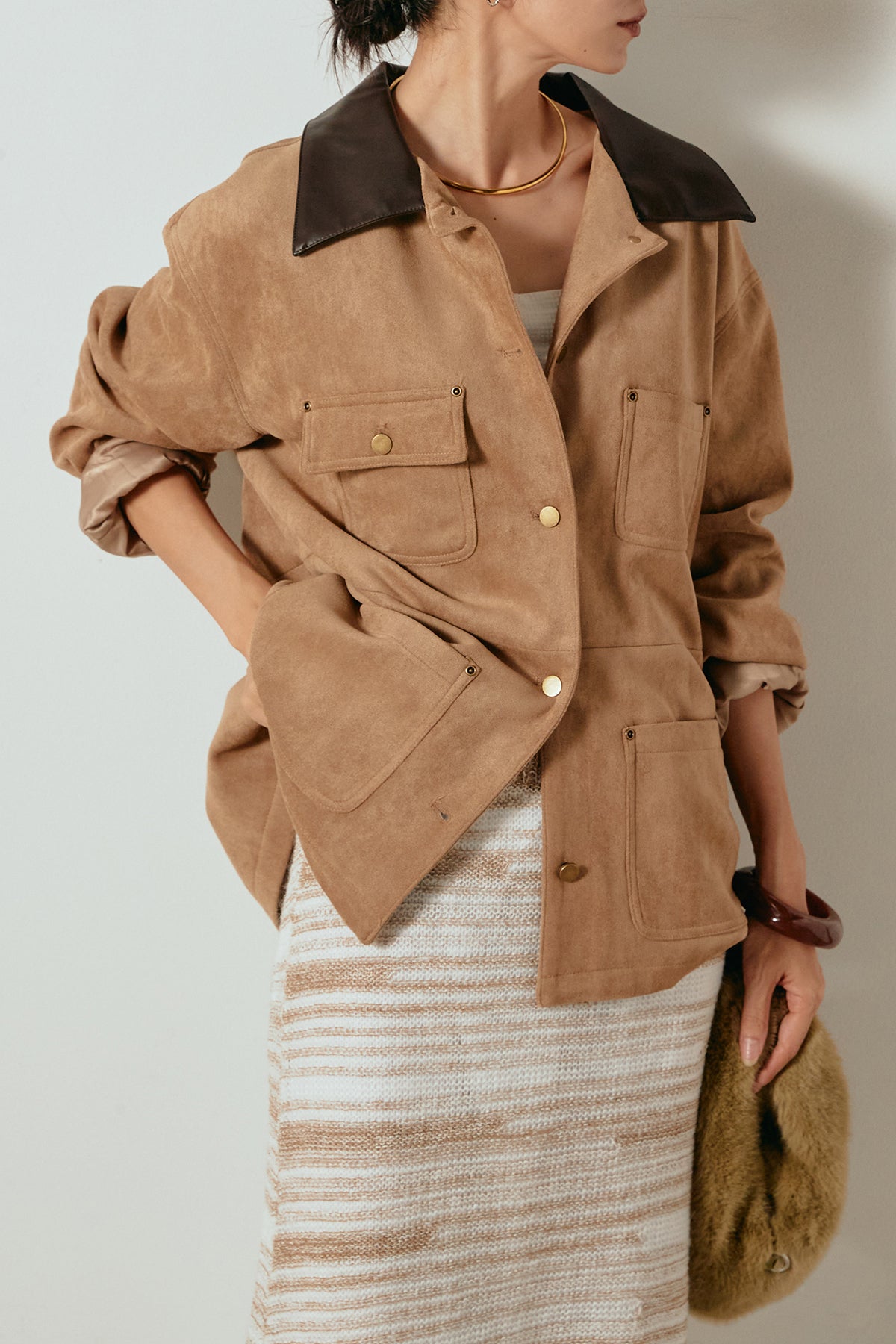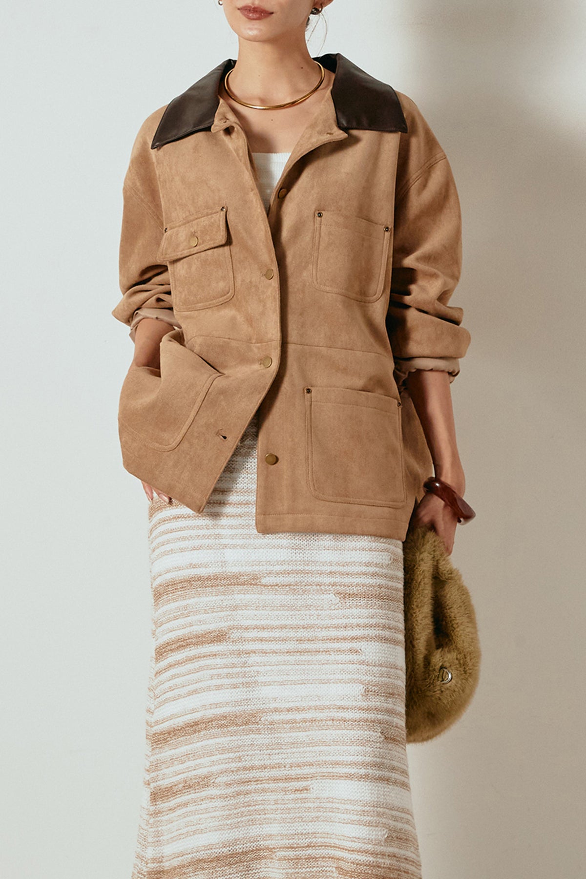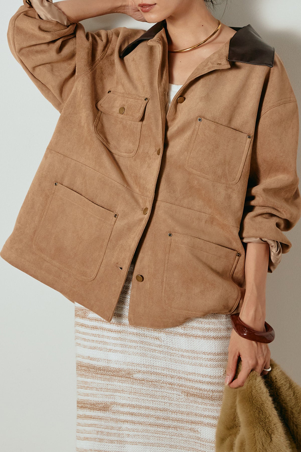 しっとりとしたスエードタッチにフェイクレザーの襟をアクセントに効かせたカバーオールジャケット。フロントの4つの大きめポケットがデザイン性と実用性を兼ね備え、スタイリングにワークテイストをプラスします。ゆったりとしたシルエットで重ね着しやすく、シャツ感覚で羽織れる一枚。季節の変わり目やライトアウターとして、カジュアルからきれいめまで幅広いコーディネートに活躍するアイテムです。