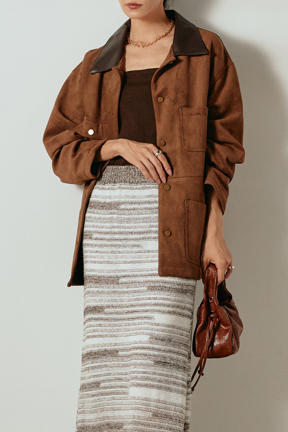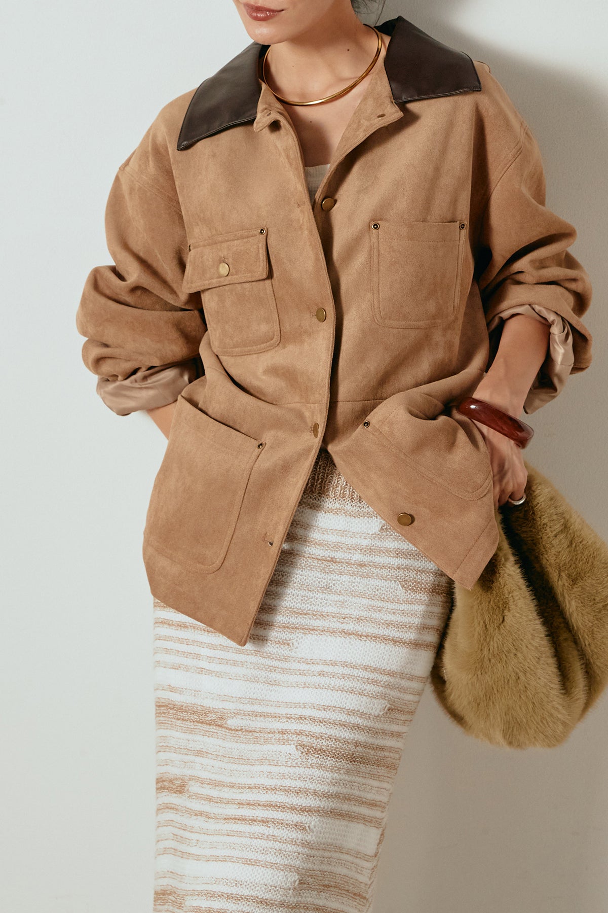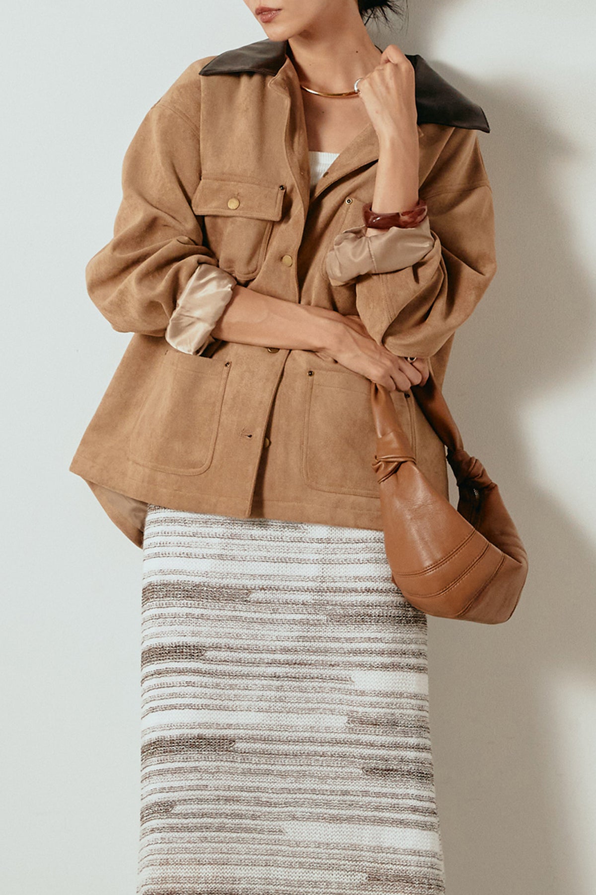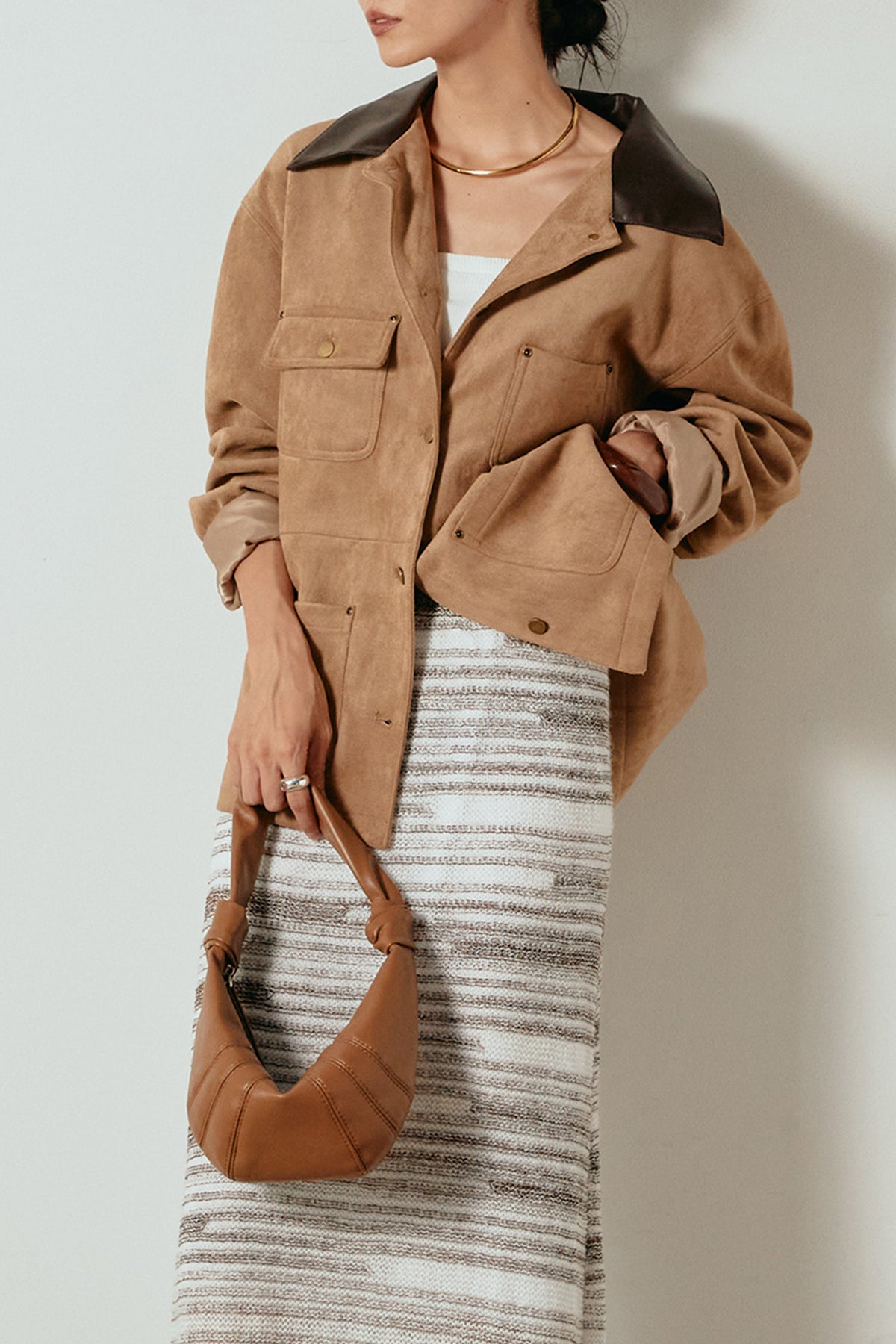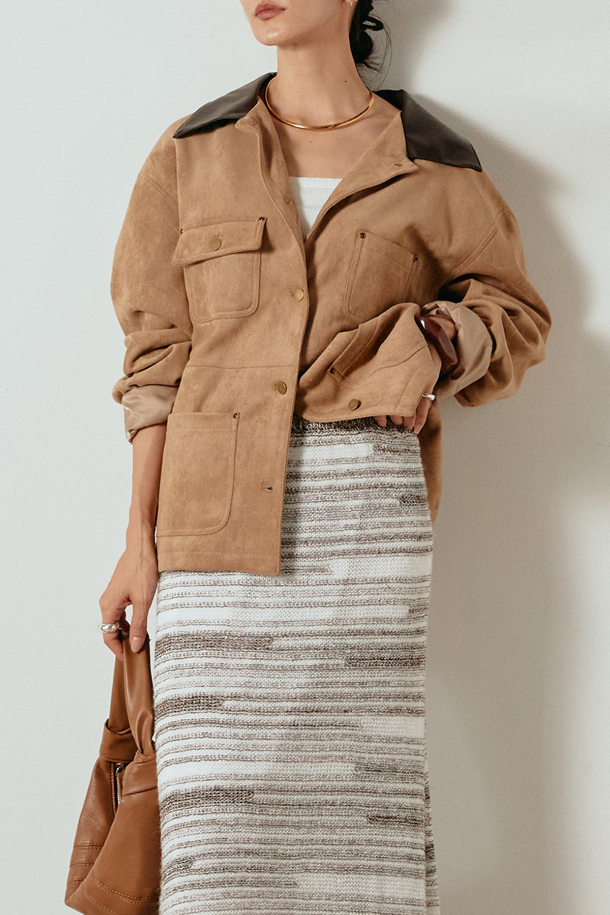 しっとりとしたスエードタッチにフェイクレザーの襟をアクセントに効かせたカバーオールジャケット。フロントの4つの大きめポケットがデザイン性と実用性を兼ね備え、スタイリングにワークテイストをプラスします。ゆったりとしたシルエットで重ね着しやすく、シャツ感覚で羽織れる一枚。季節の変わり目やライトアウターとして、カジュアルからきれいめまで幅広いコーディネートに活躍するアイテムです。