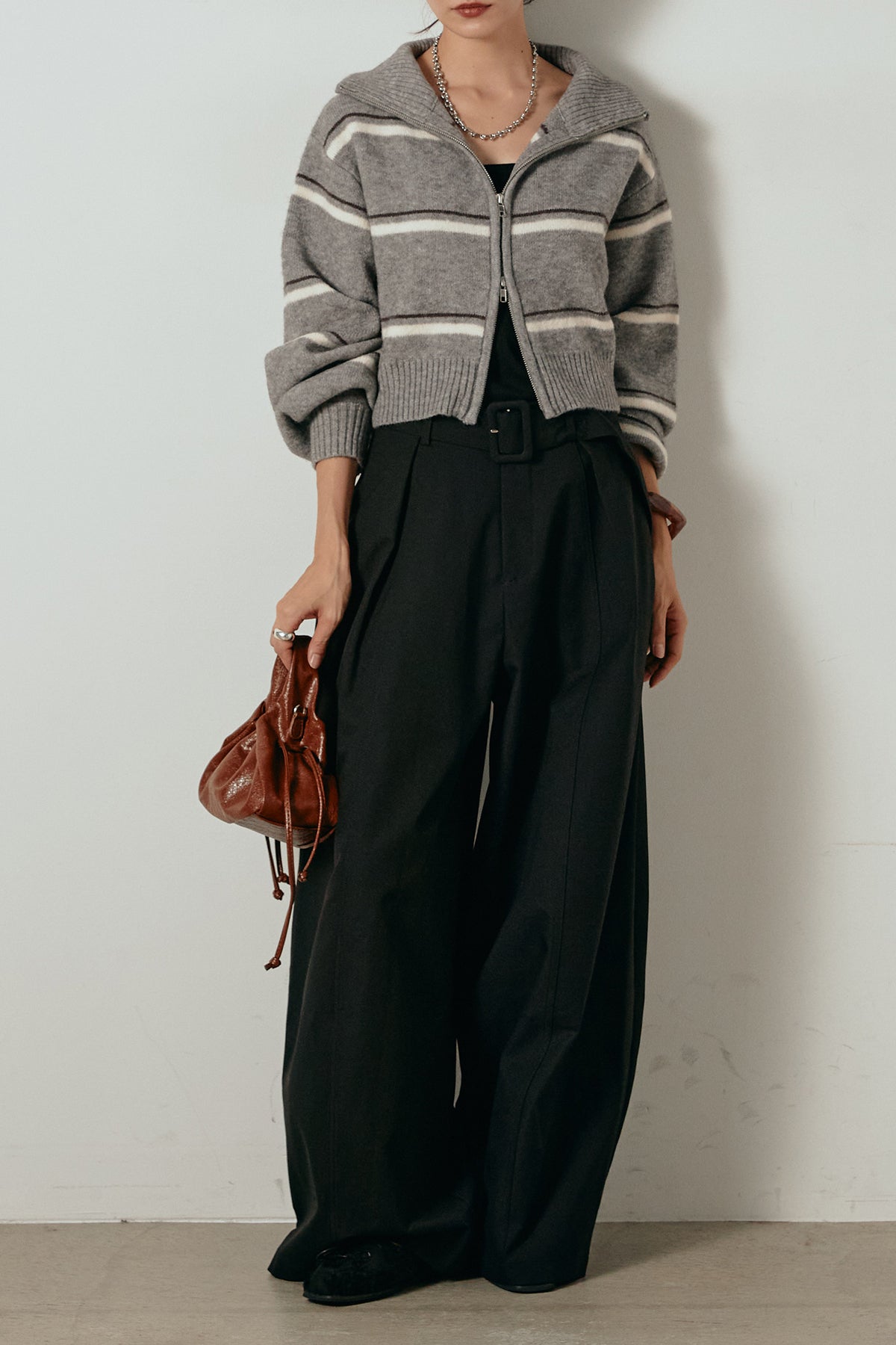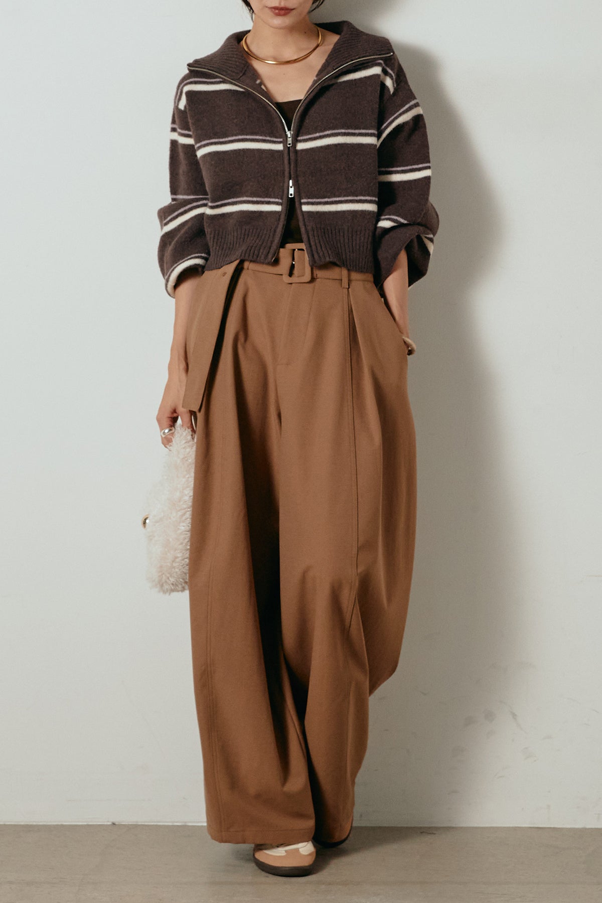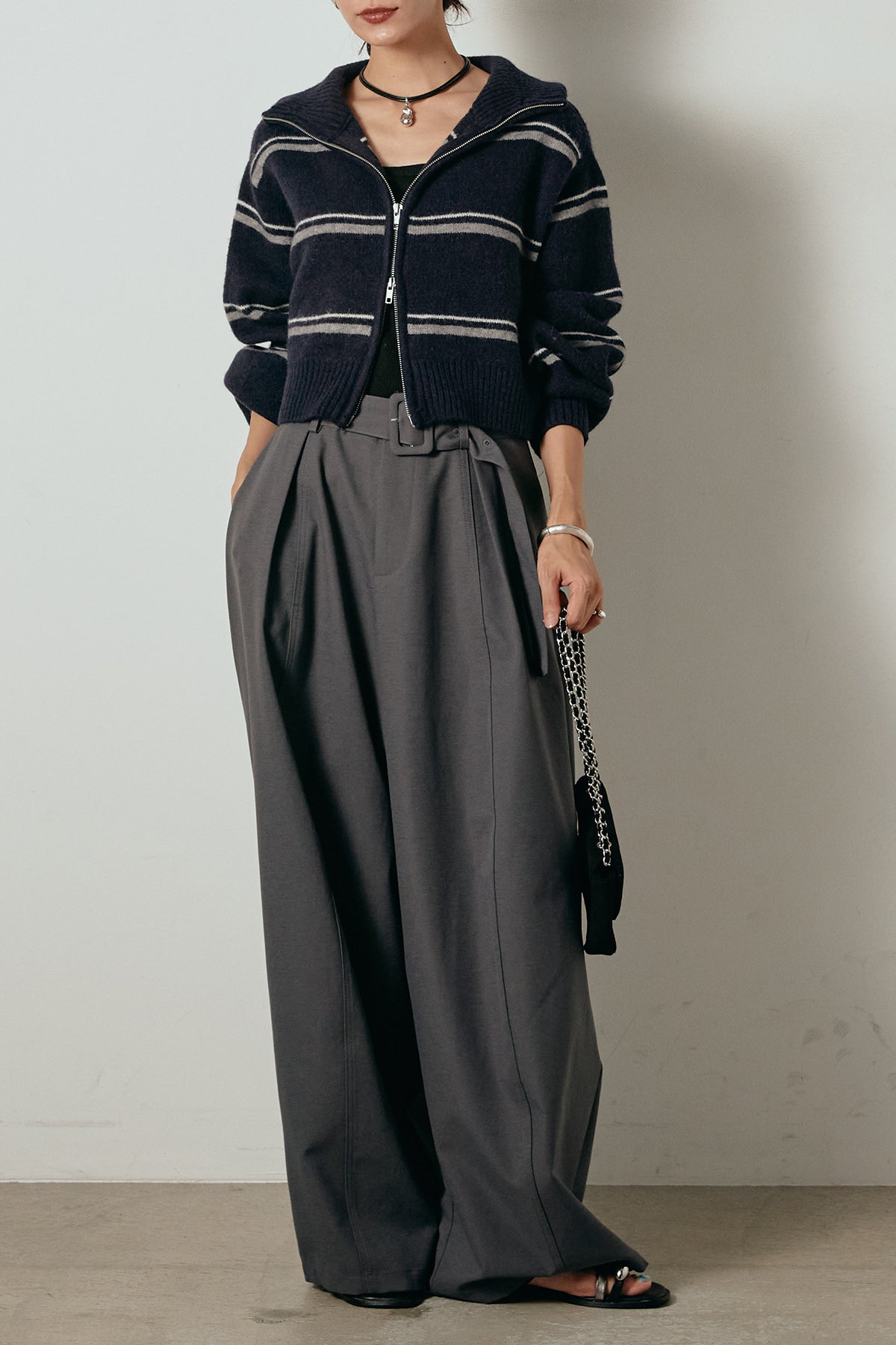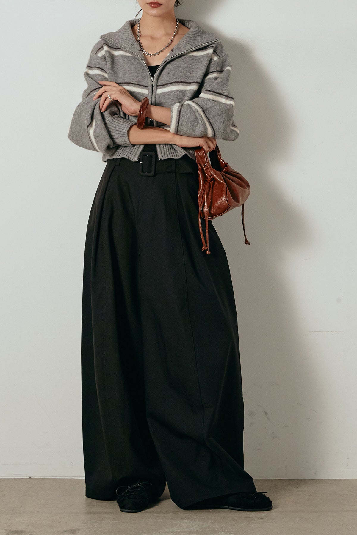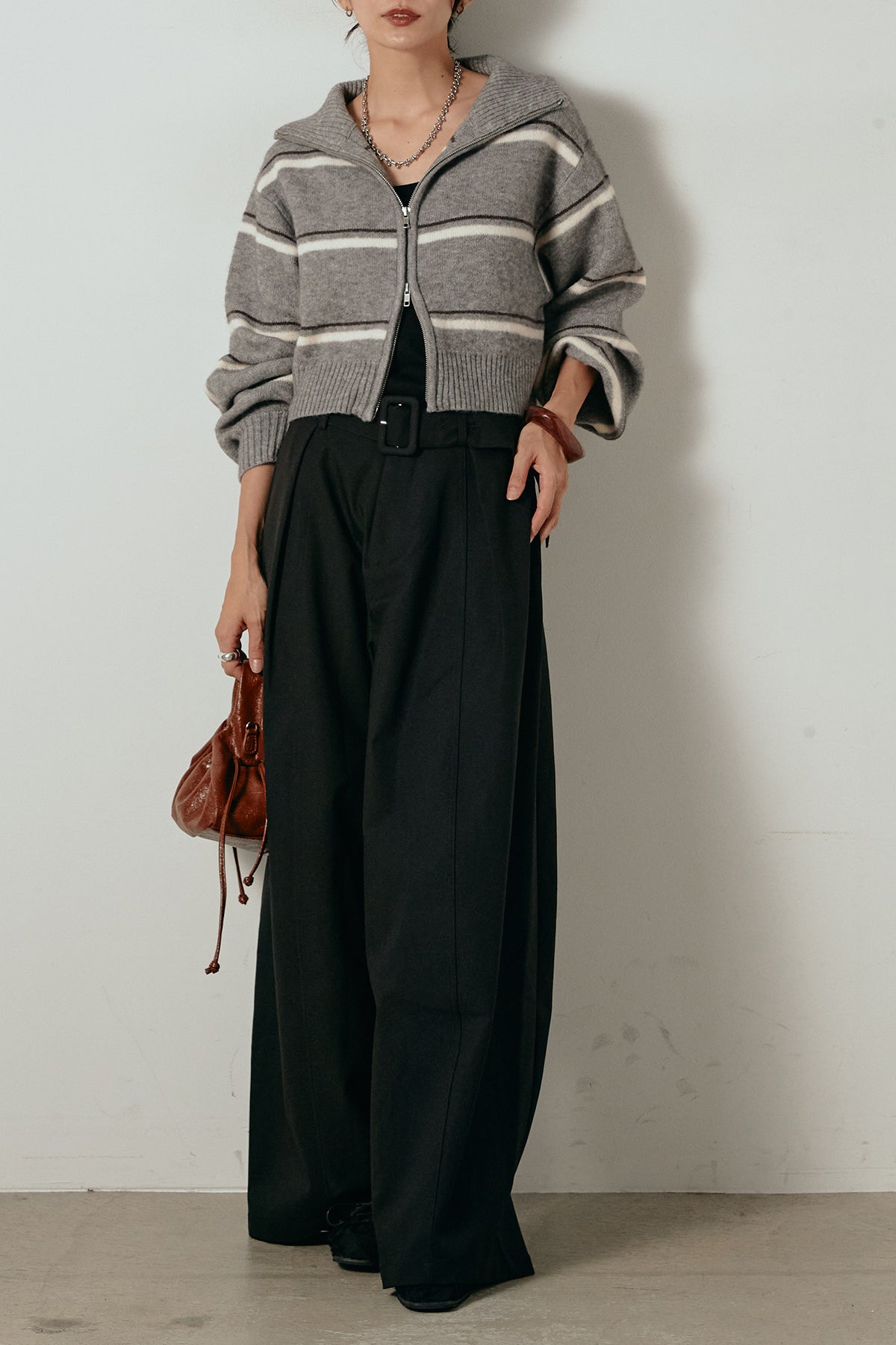 [SET]アルパカタッチボーダーダブルジップブルゾン+太ベルト付きタックワイドパンツ(2set)