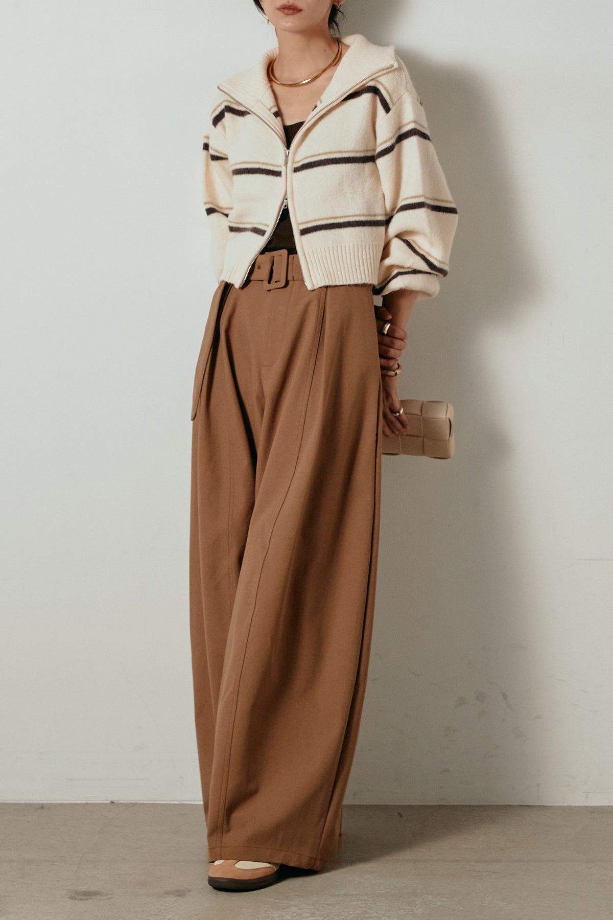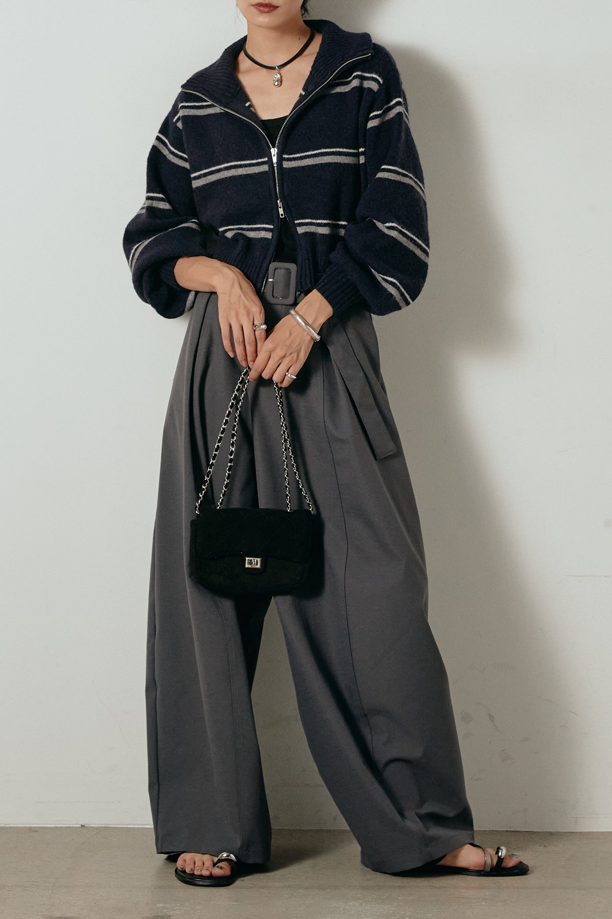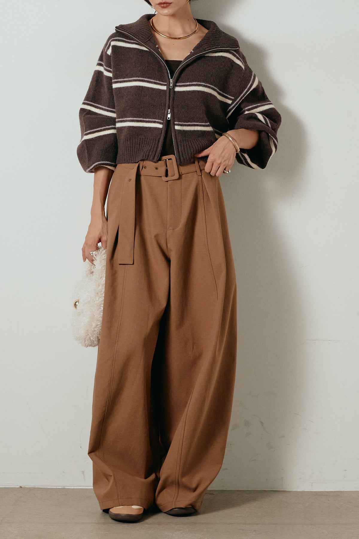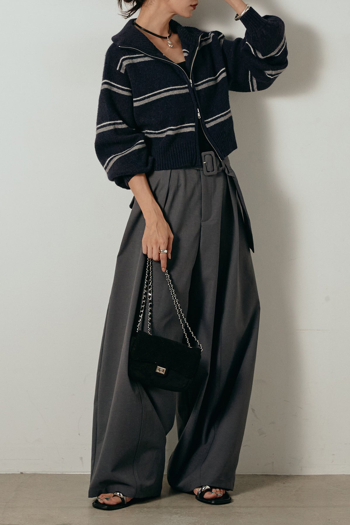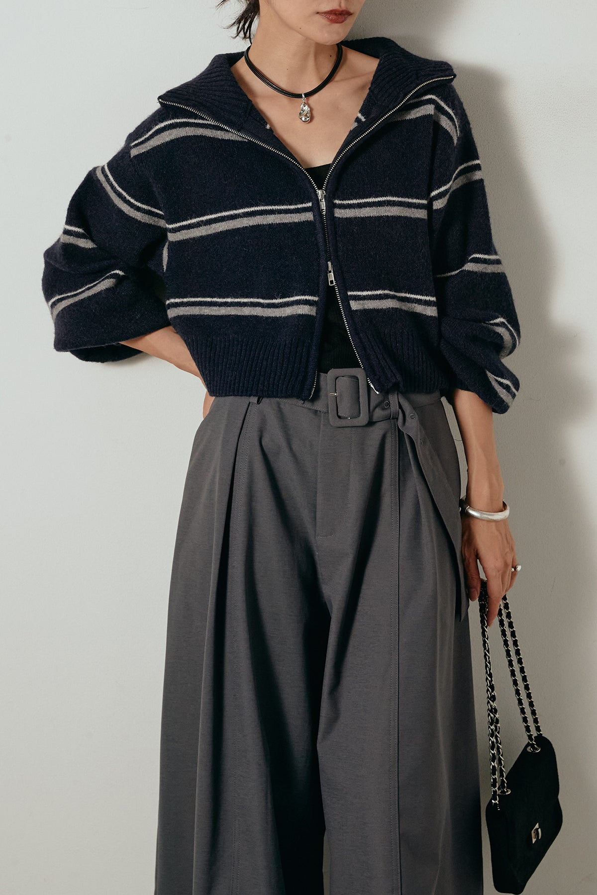 [SET]アルパカタッチボーダーダブルジップブルゾン+太ベルト付きタックワイドパンツ(2set)