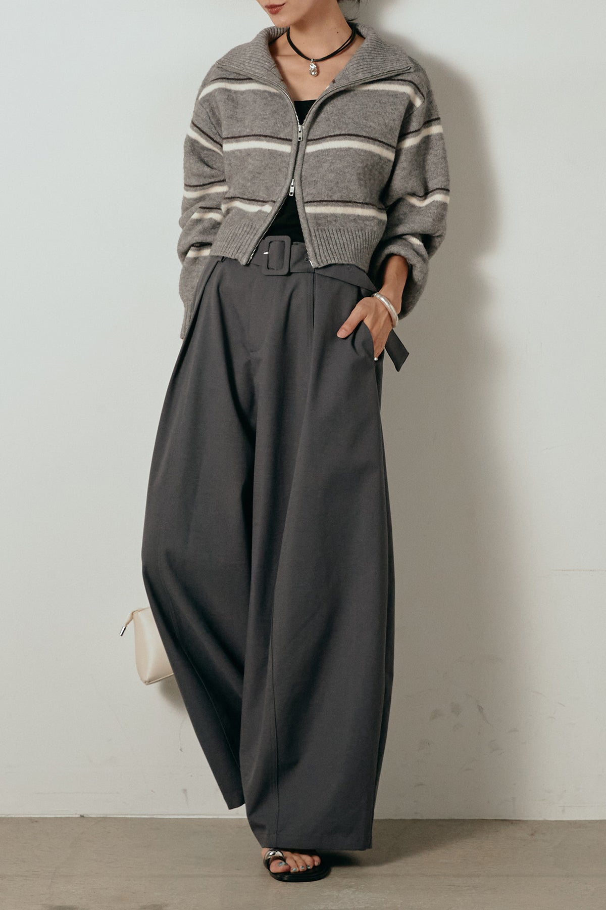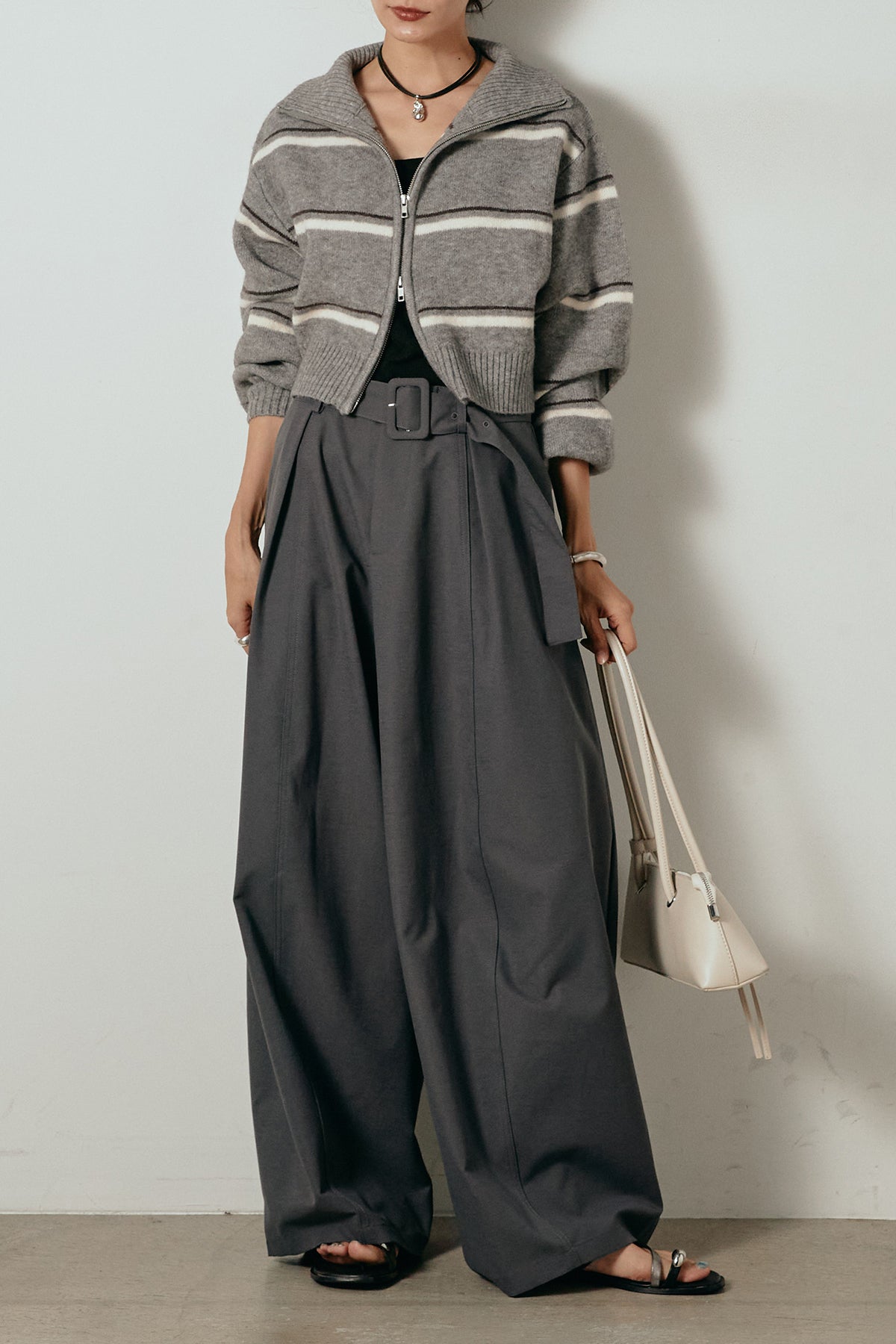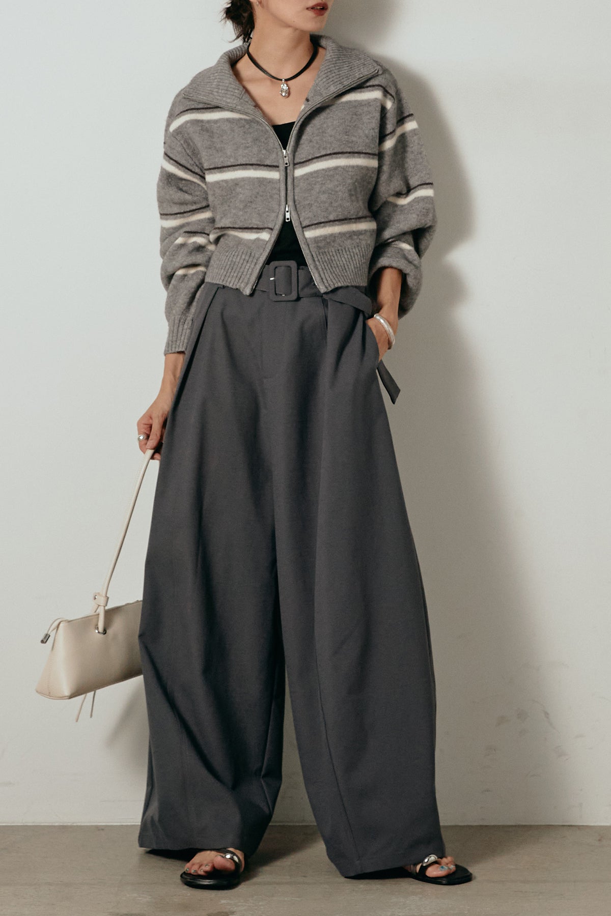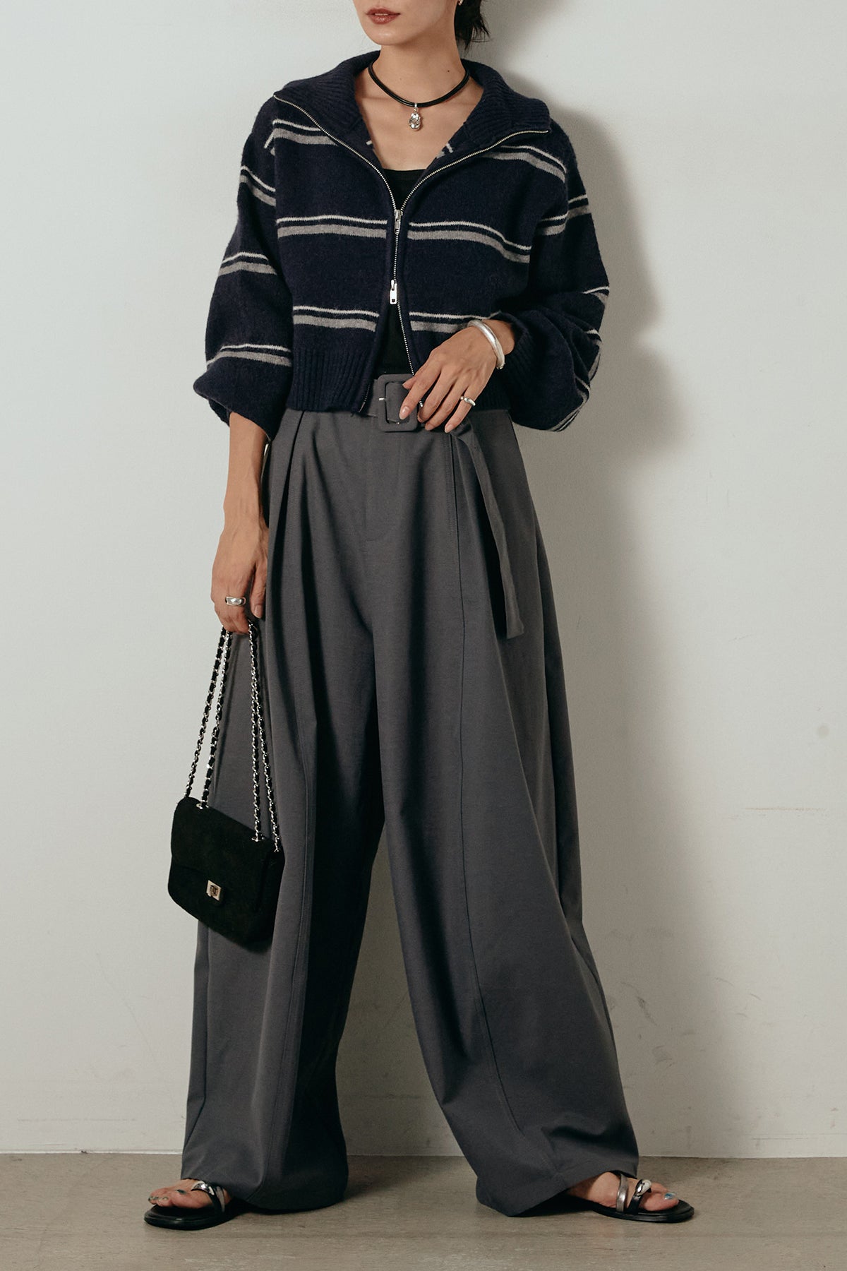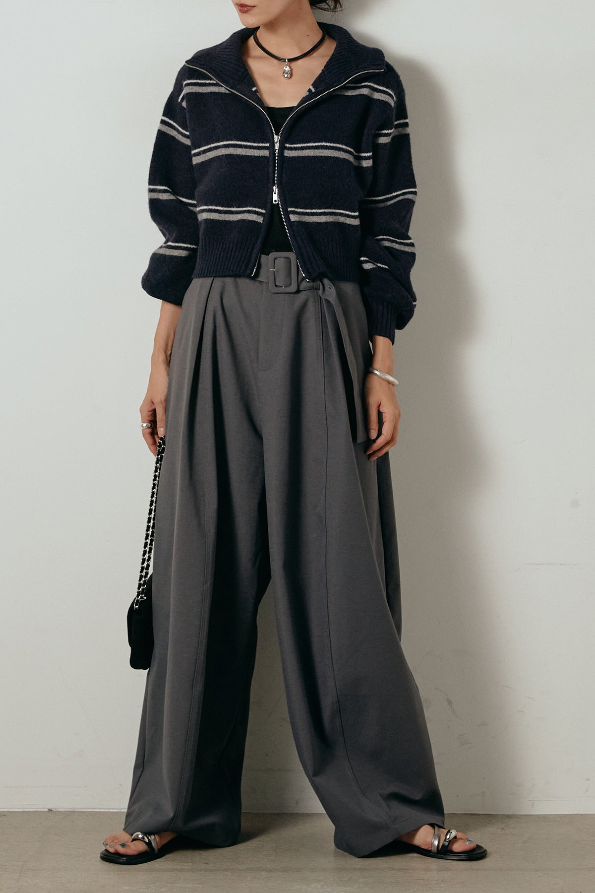 [SET]アルパカタッチボーダーダブルジップブルゾン+太ベルト付きタックワイドパンツ(2set)