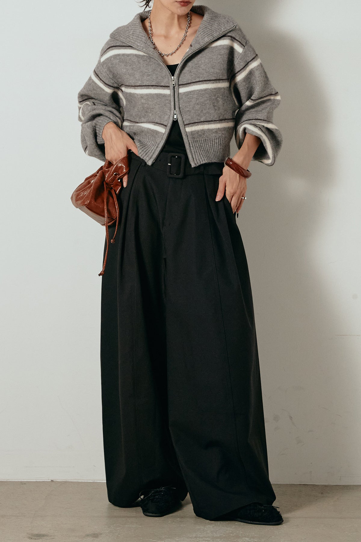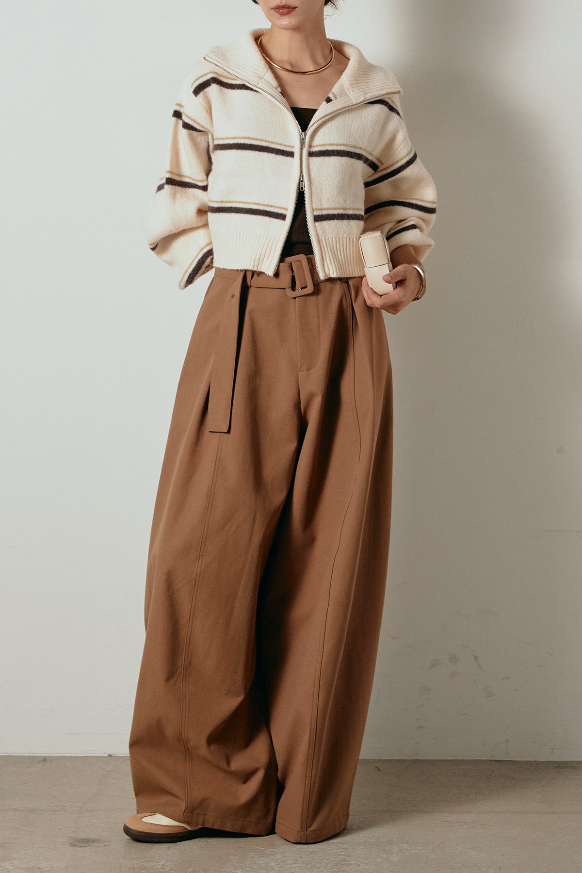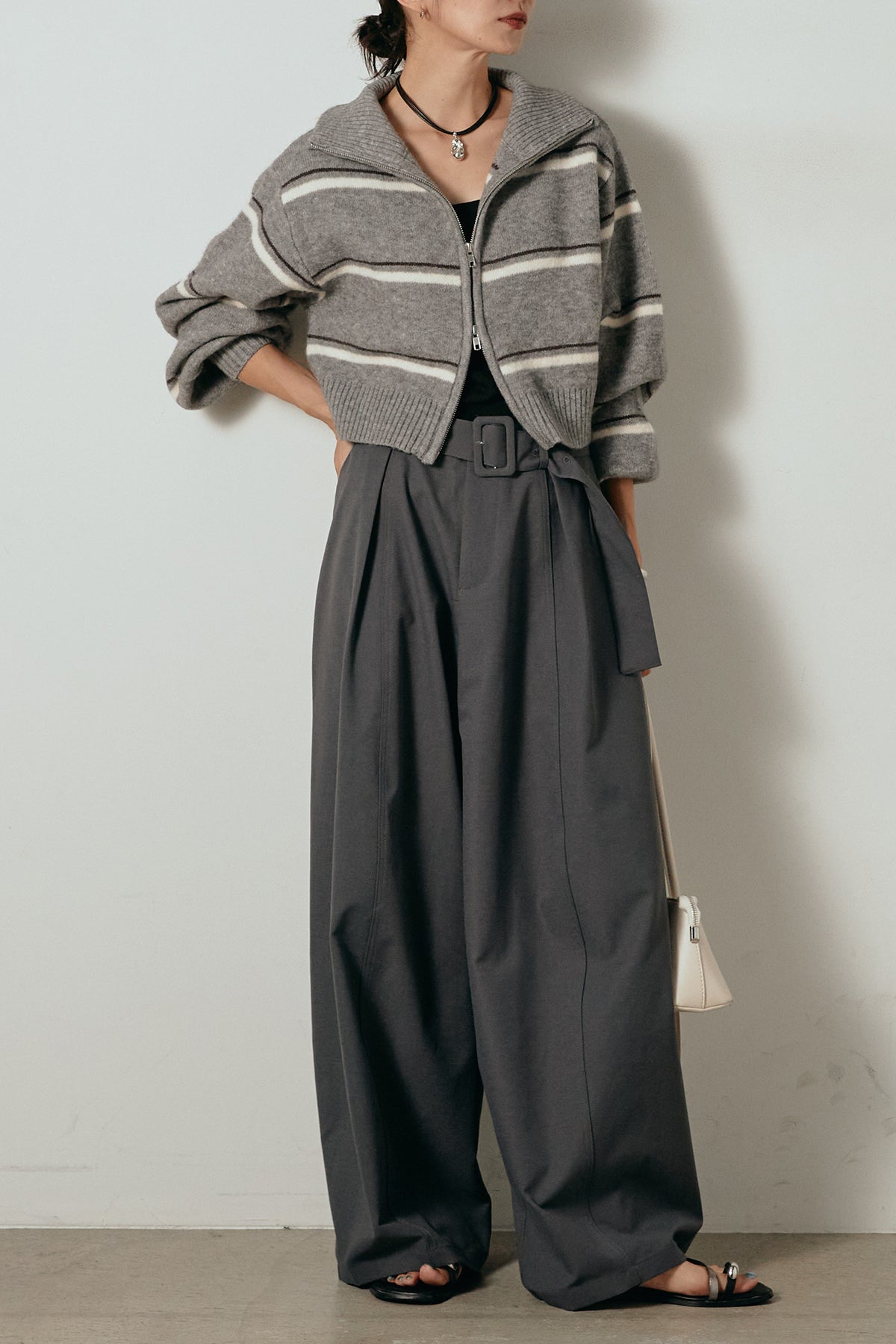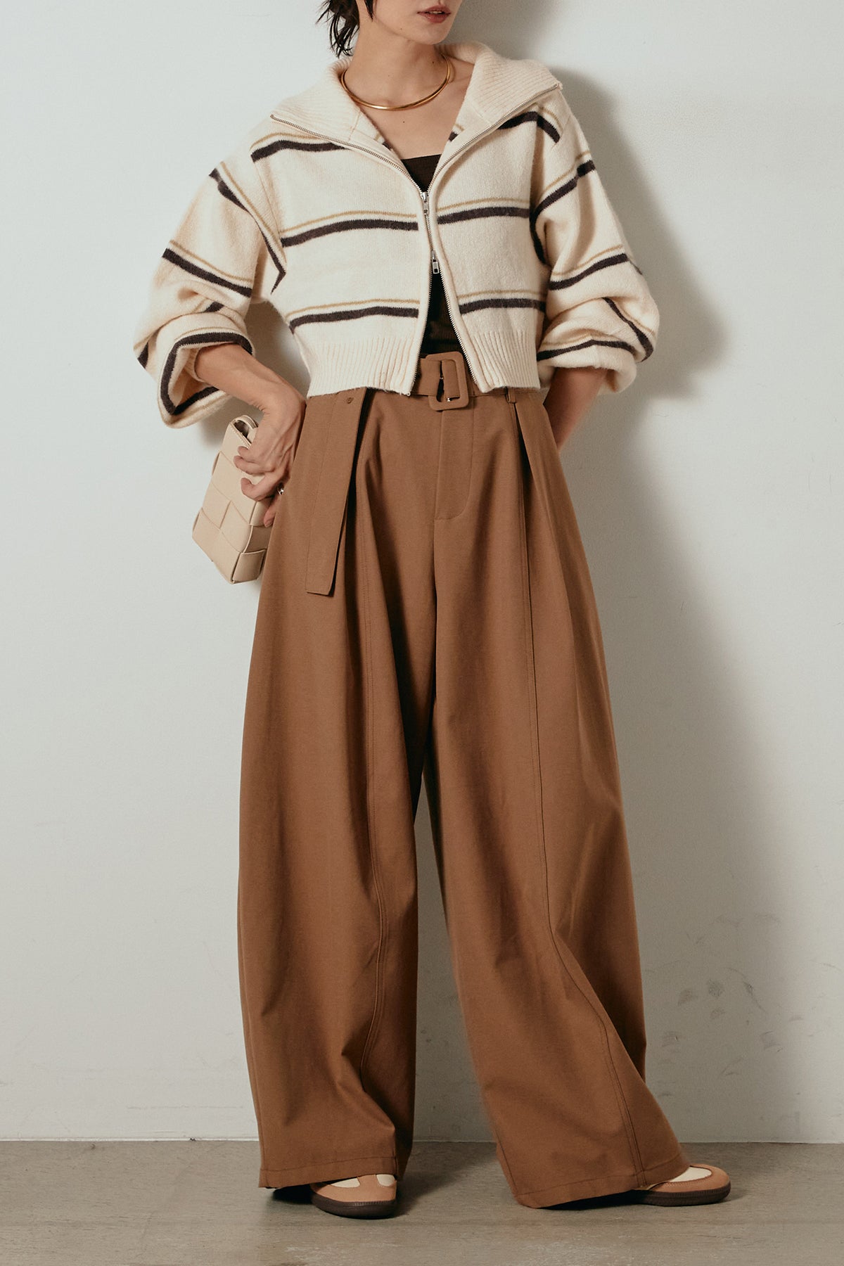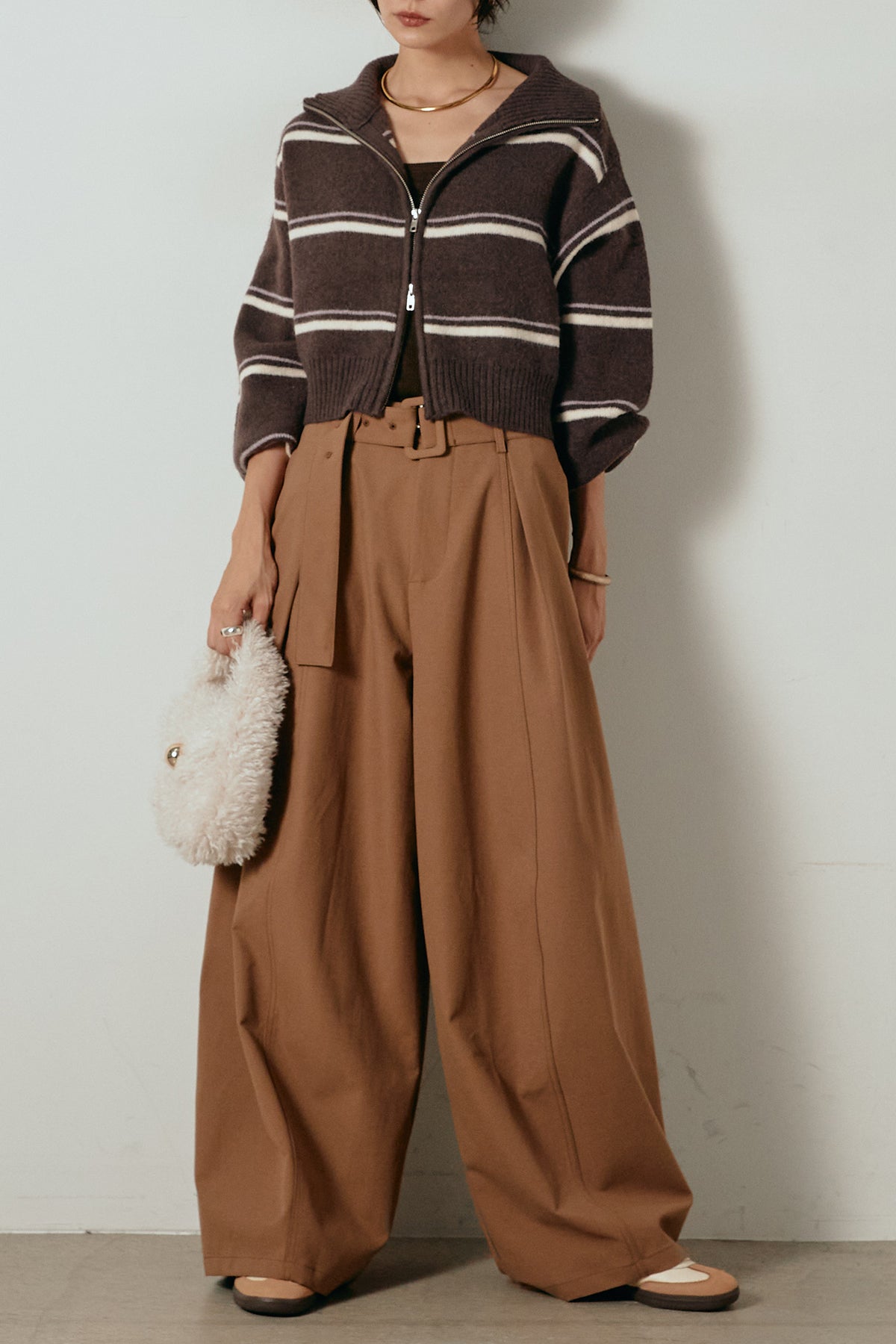 [SET]アルパカタッチボーダーダブルジップブルゾン+太ベルト付きタックワイドパンツ(2set)