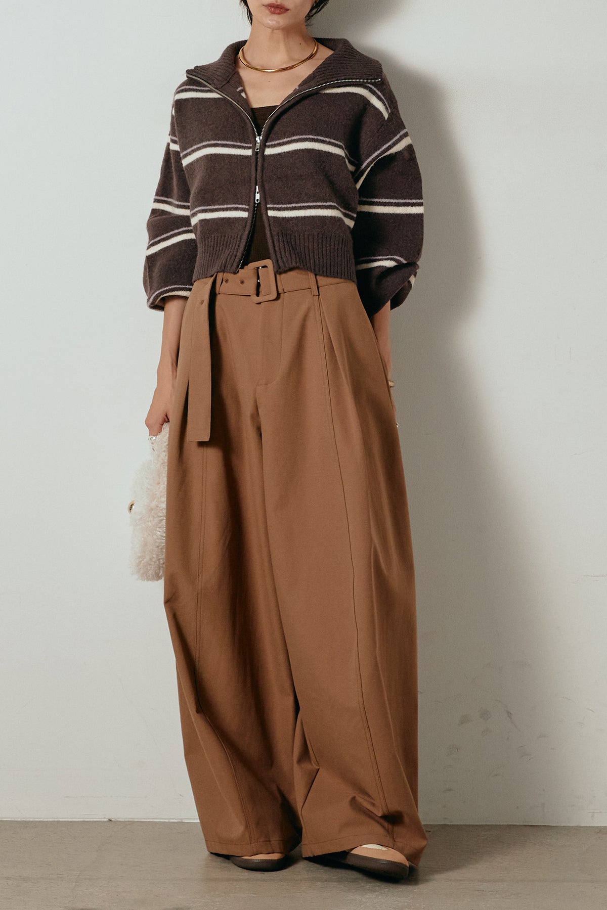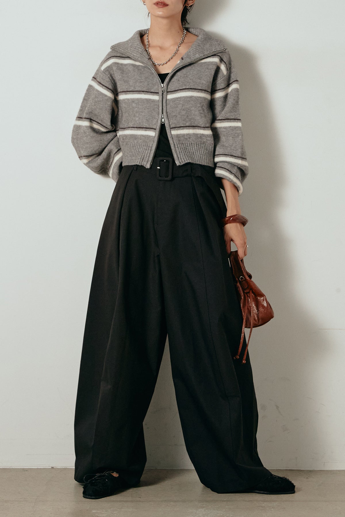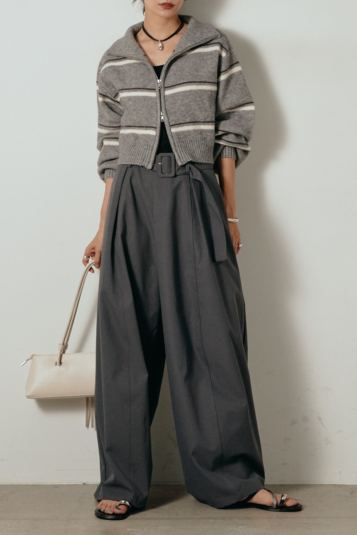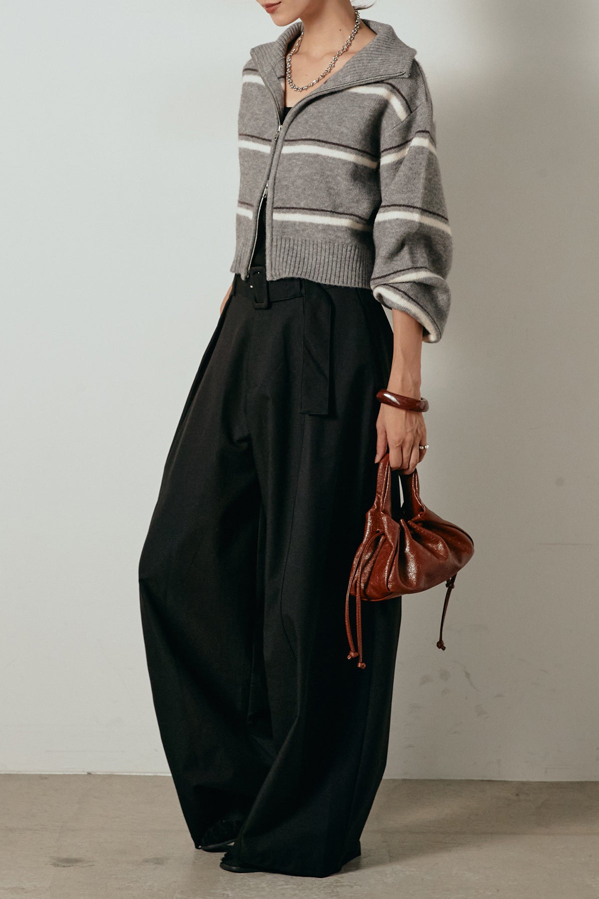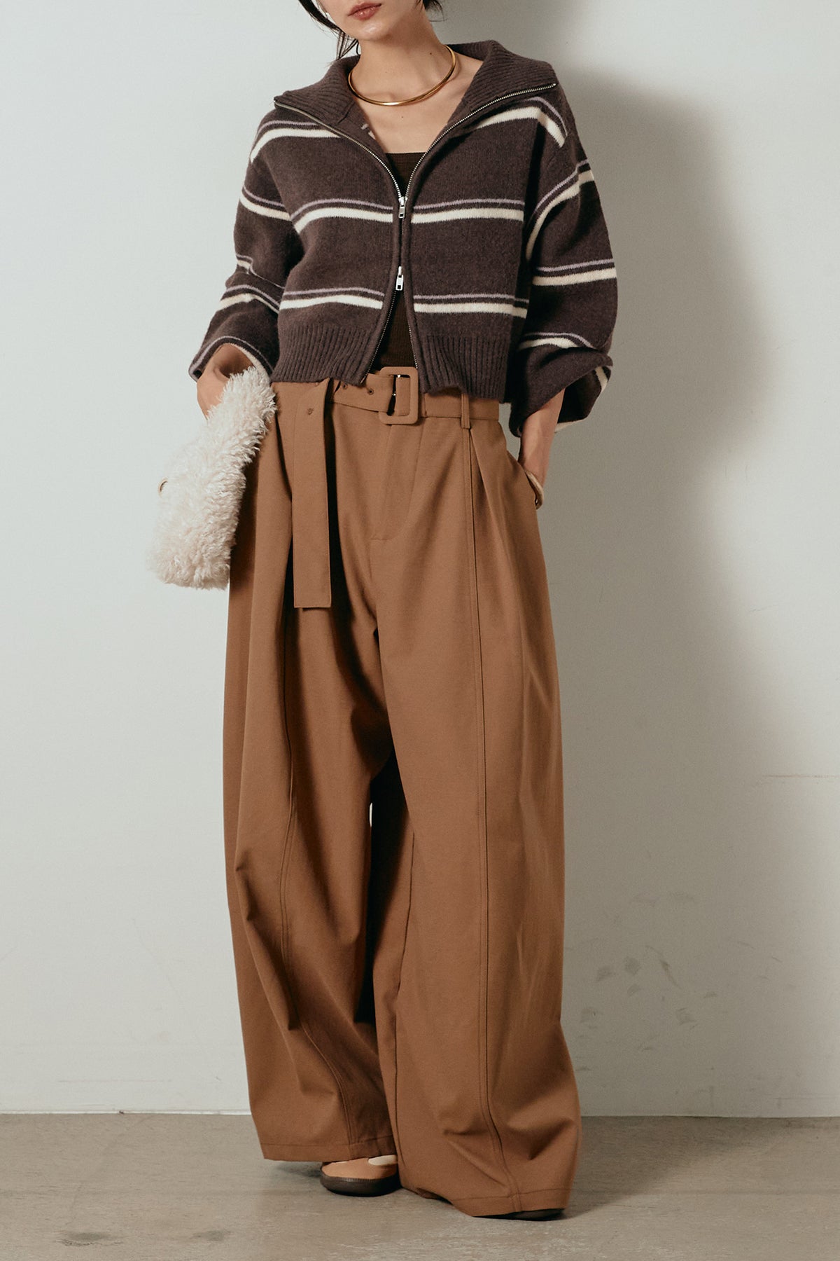 [SET]アルパカタッチボーダーダブルジップブルゾン+太ベルト付きタックワイドパンツ(2set)