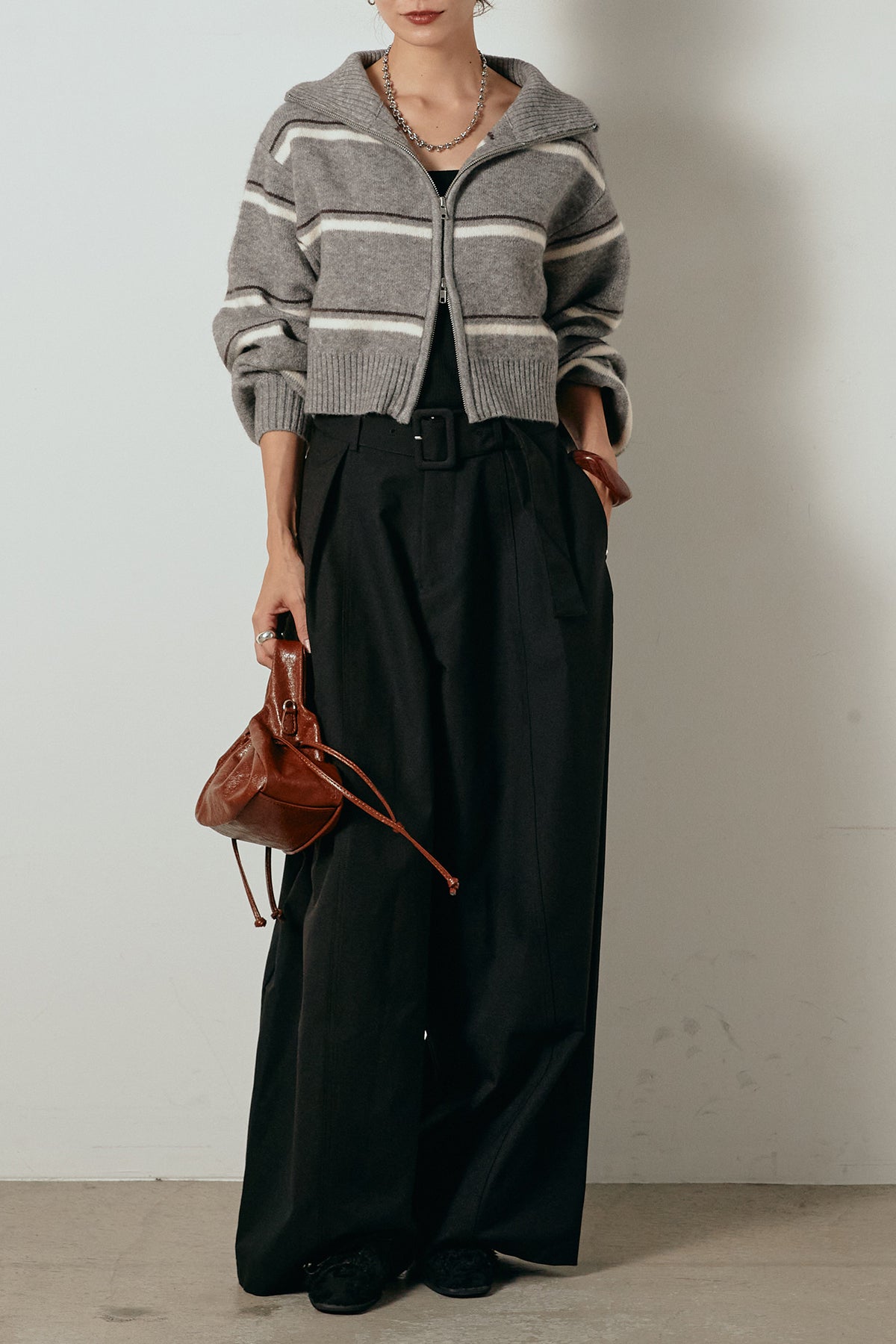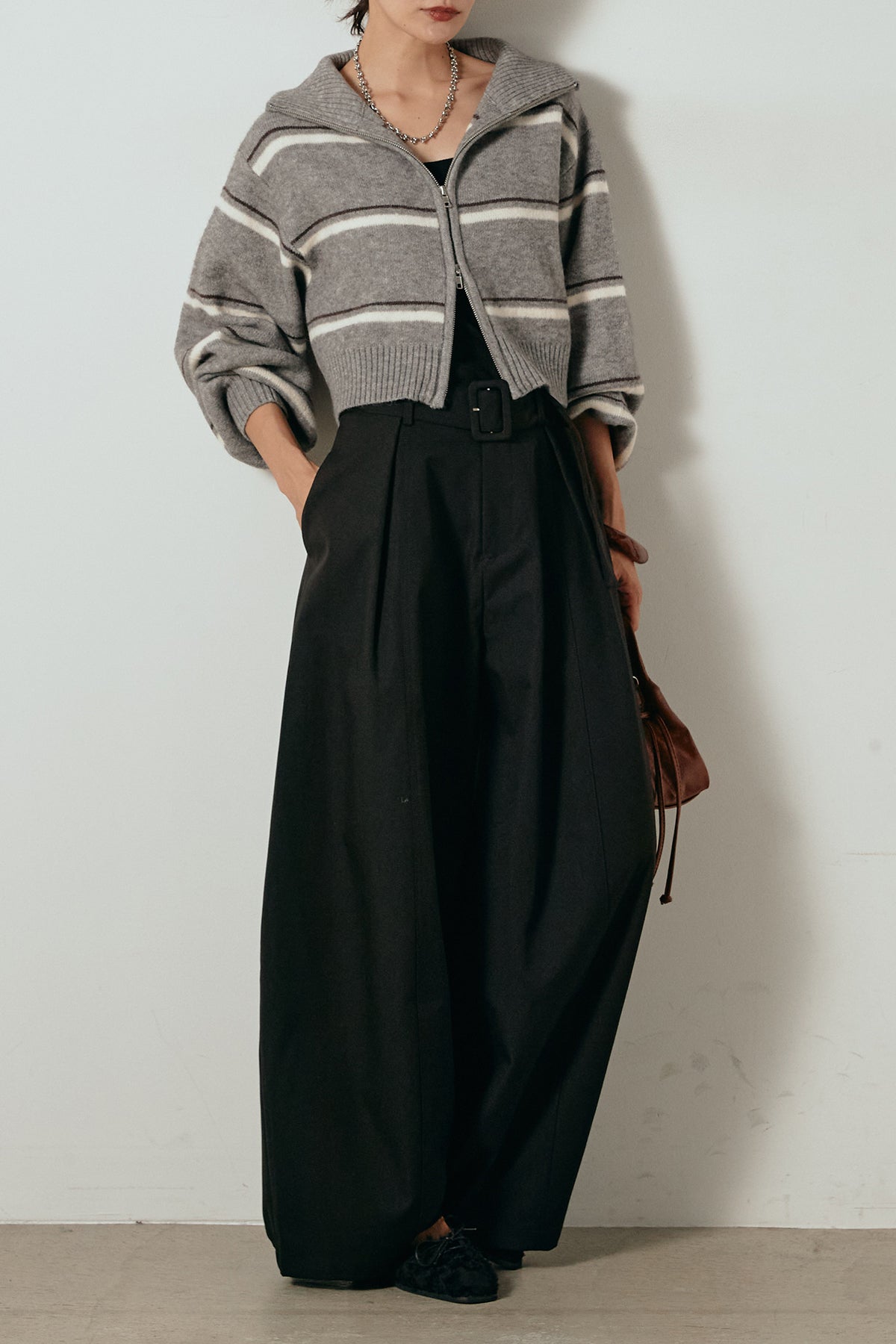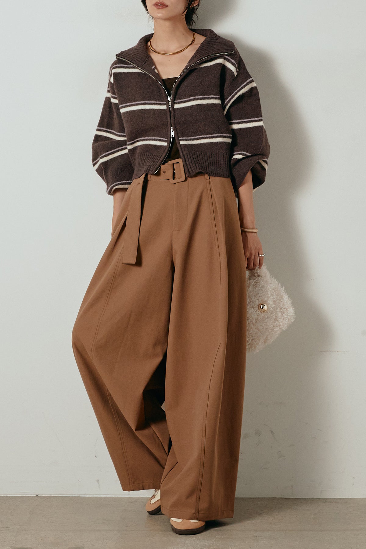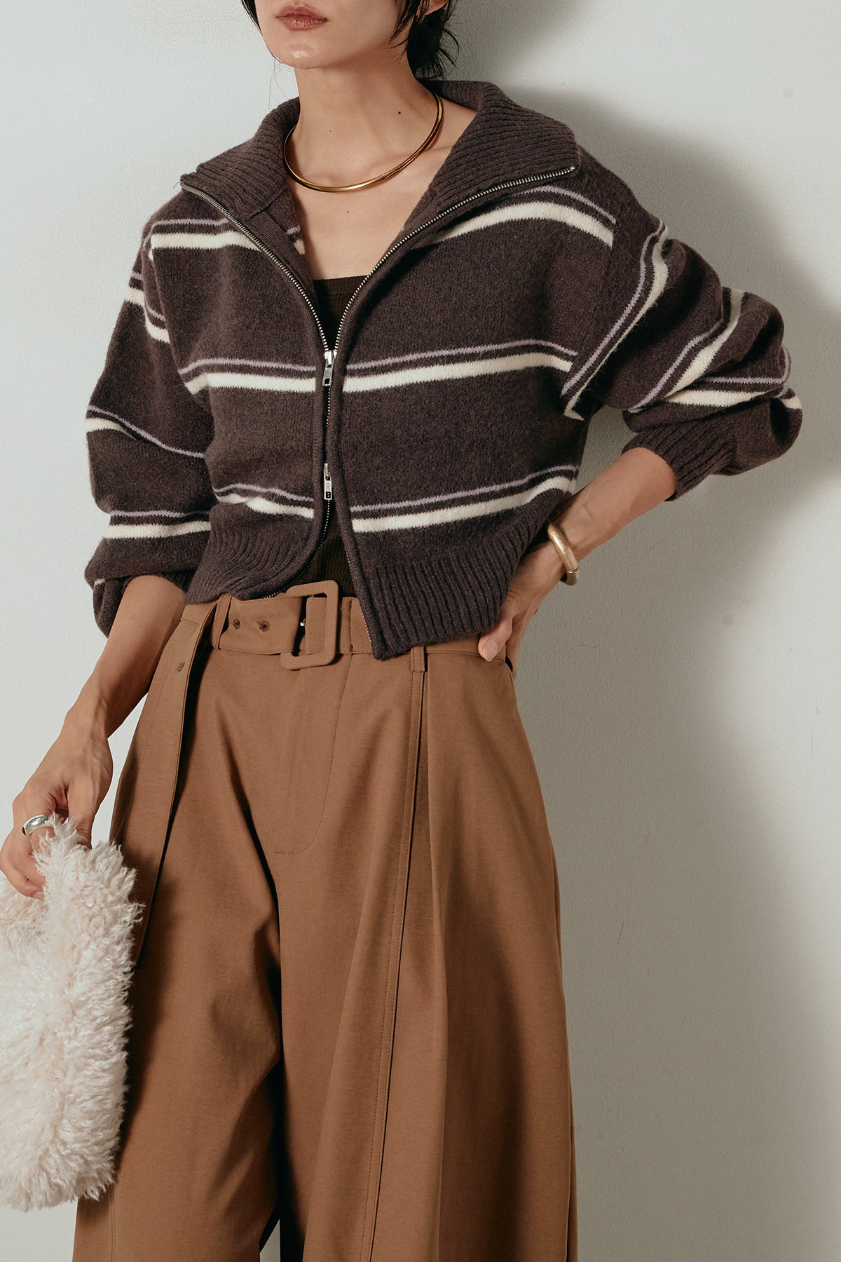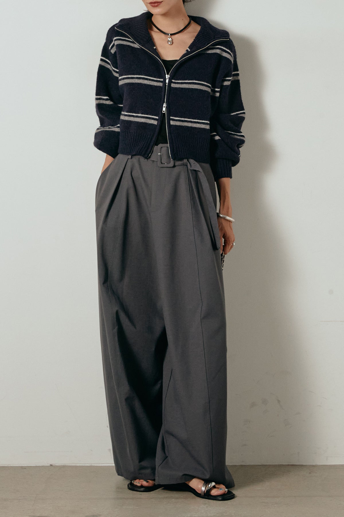 [SET]アルパカタッチボーダーダブルジップブルゾン+太ベルト付きタックワイドパンツ(2set)