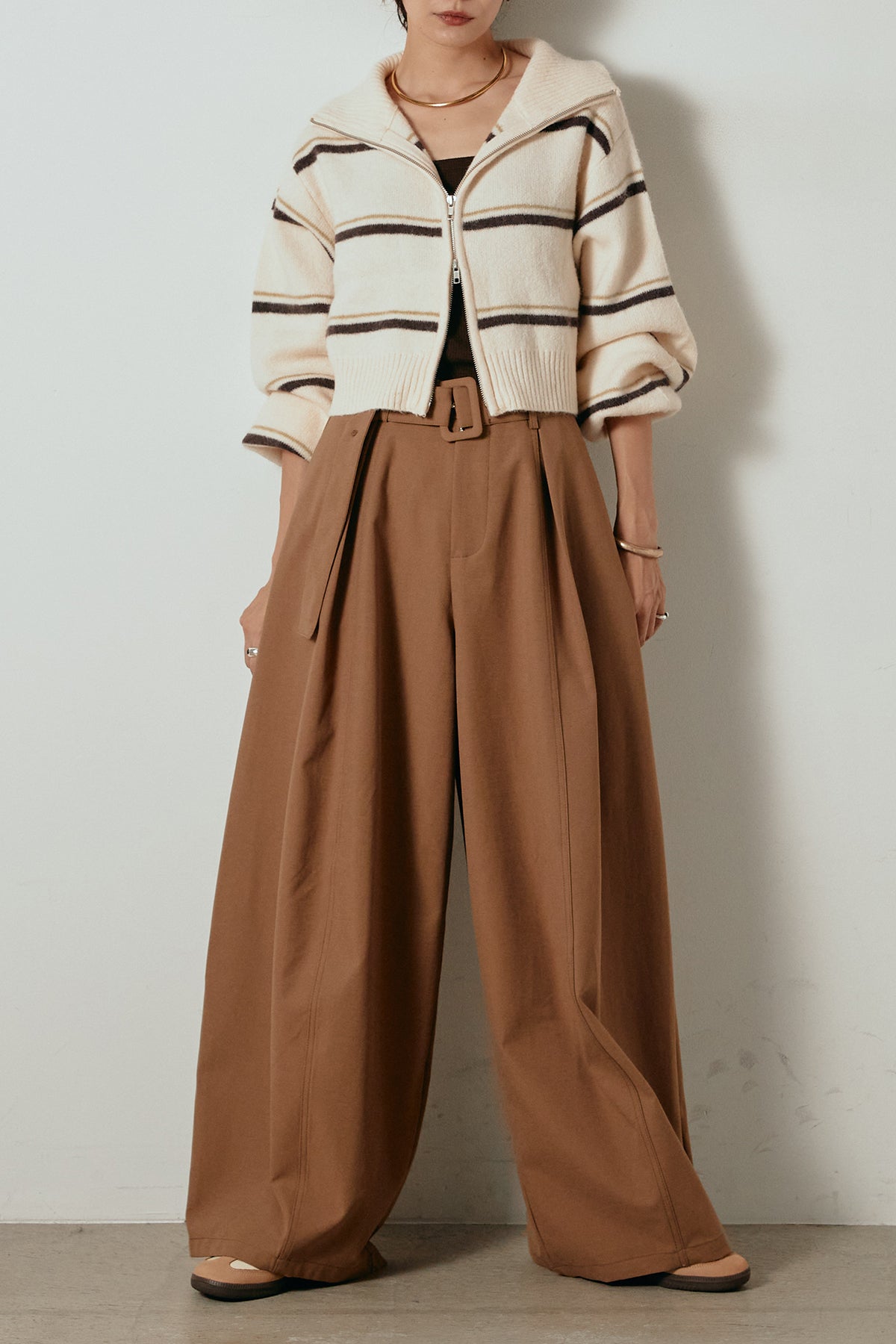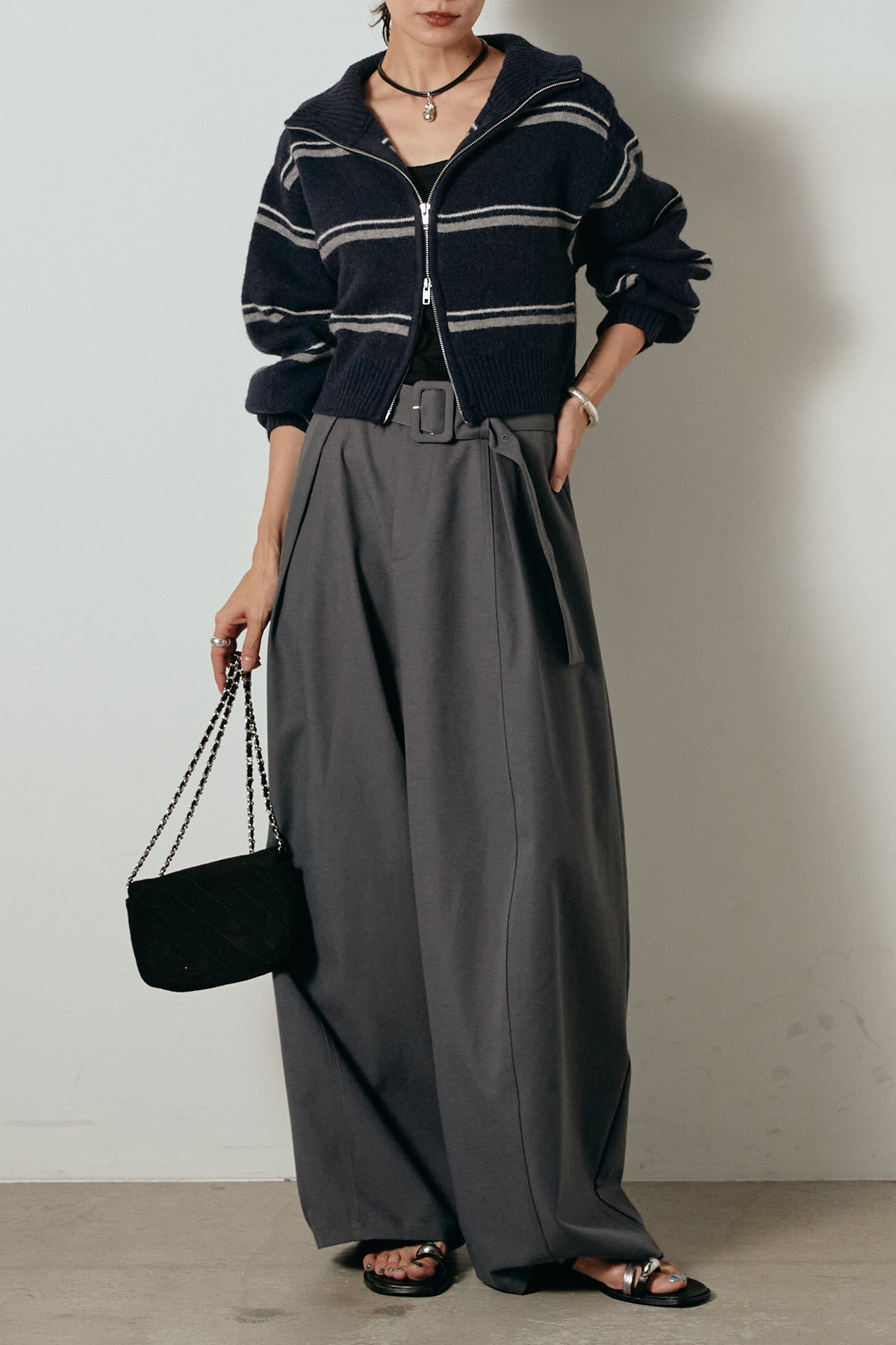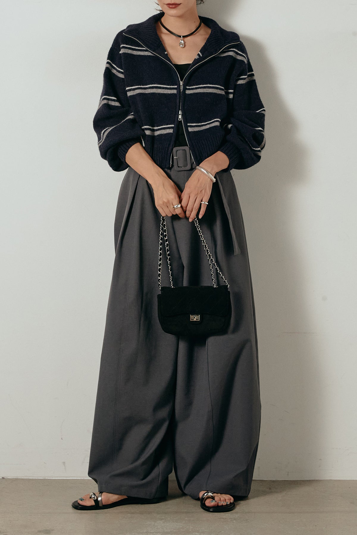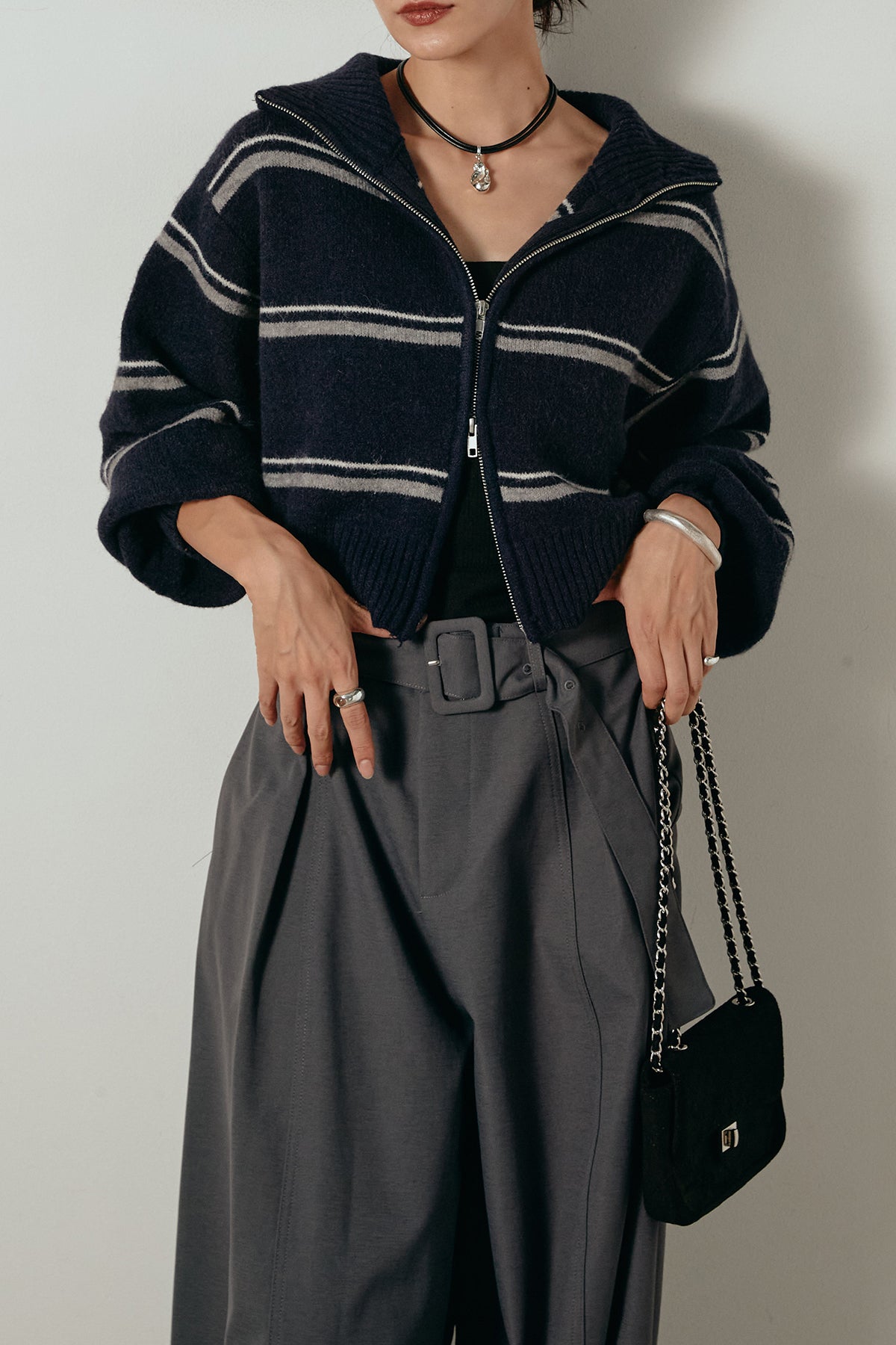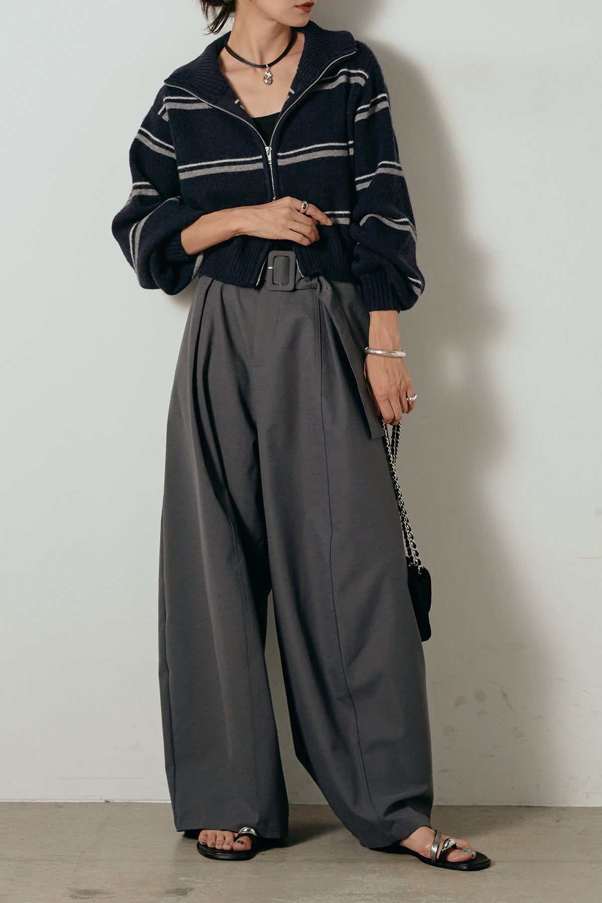 [SET]アルパカタッチボーダーダブルジップブルゾン+太ベルト付きタックワイドパンツ(2set)