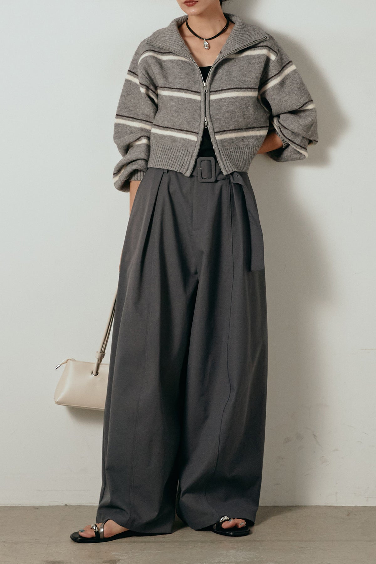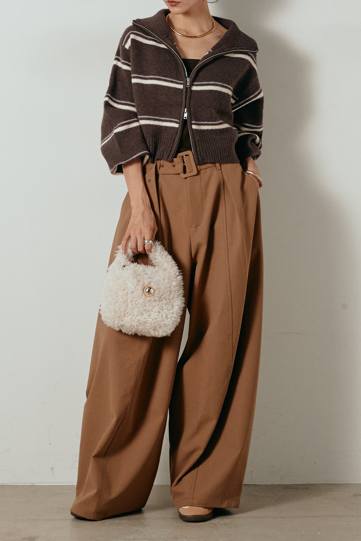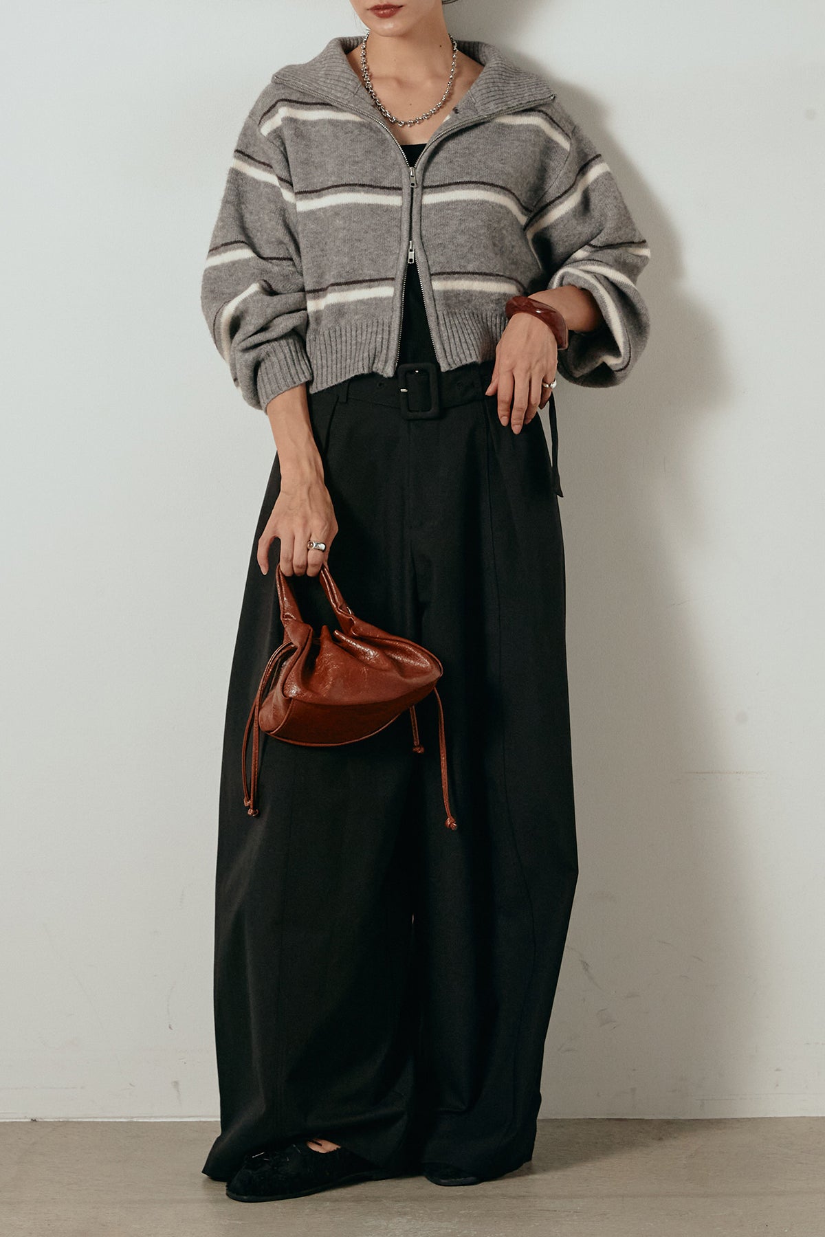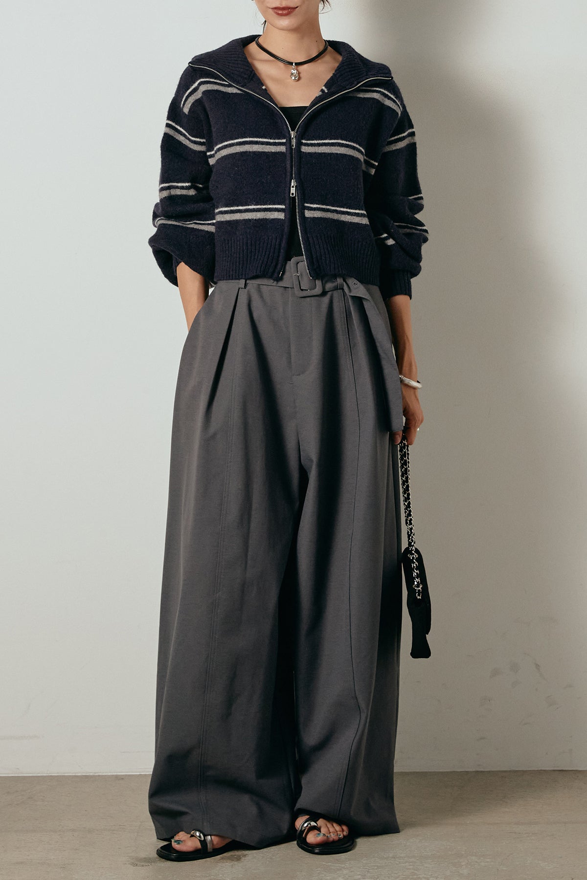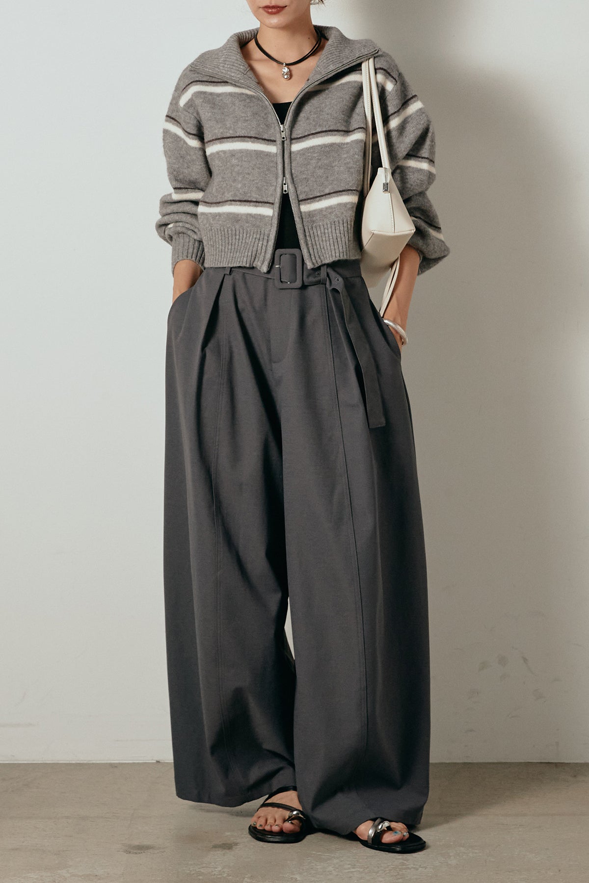 [SET]アルパカタッチボーダーダブルジップブルゾン+太ベルト付きタックワイドパンツ(2set)