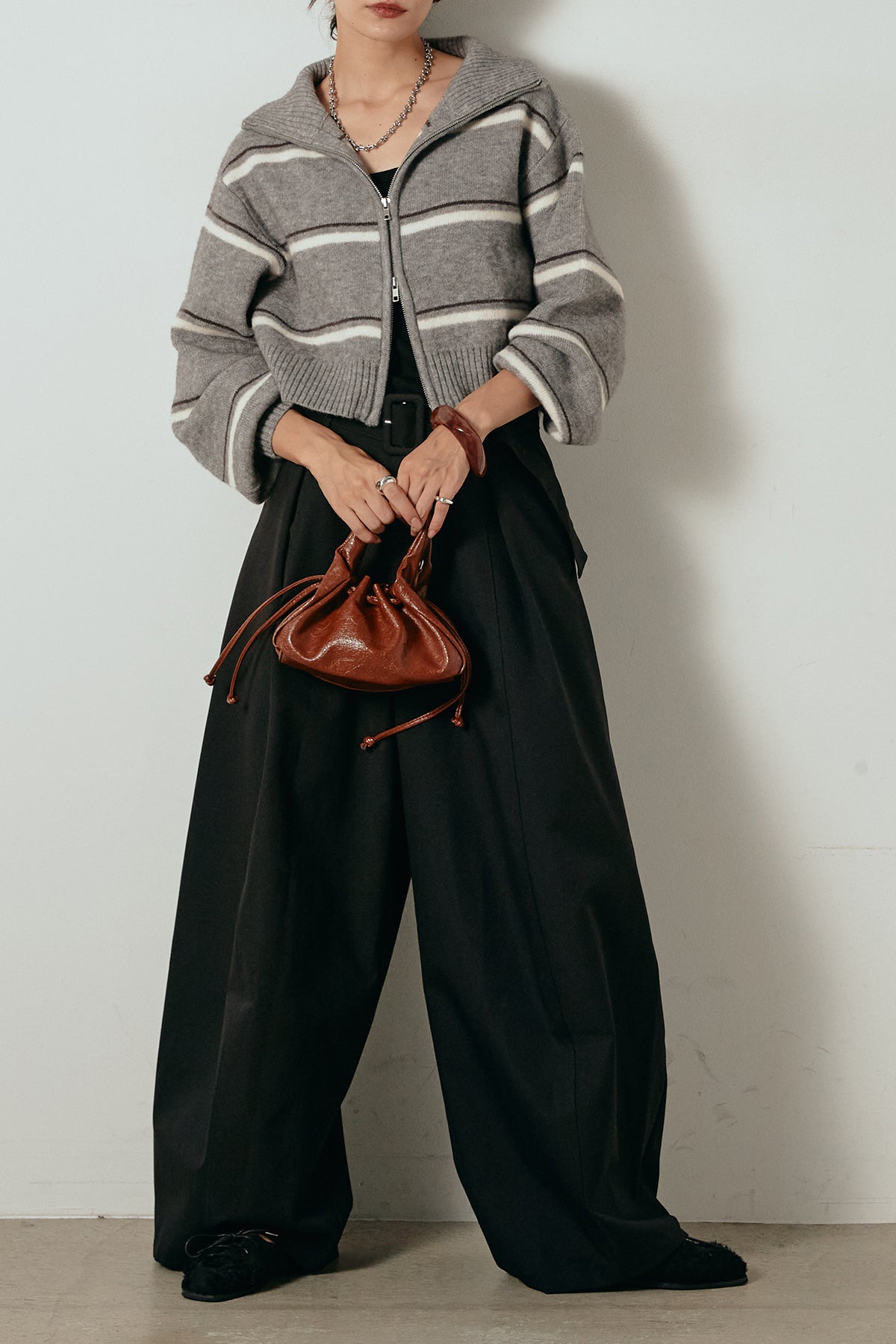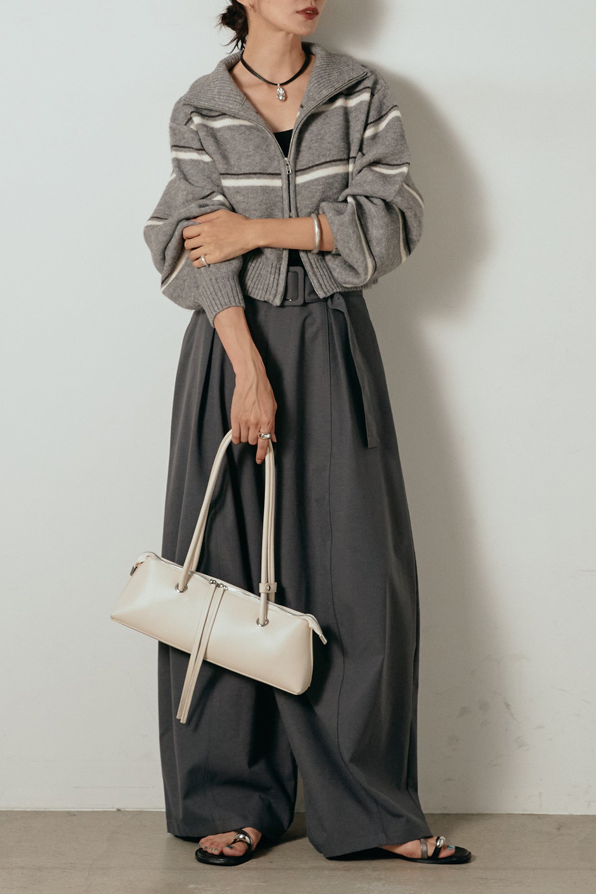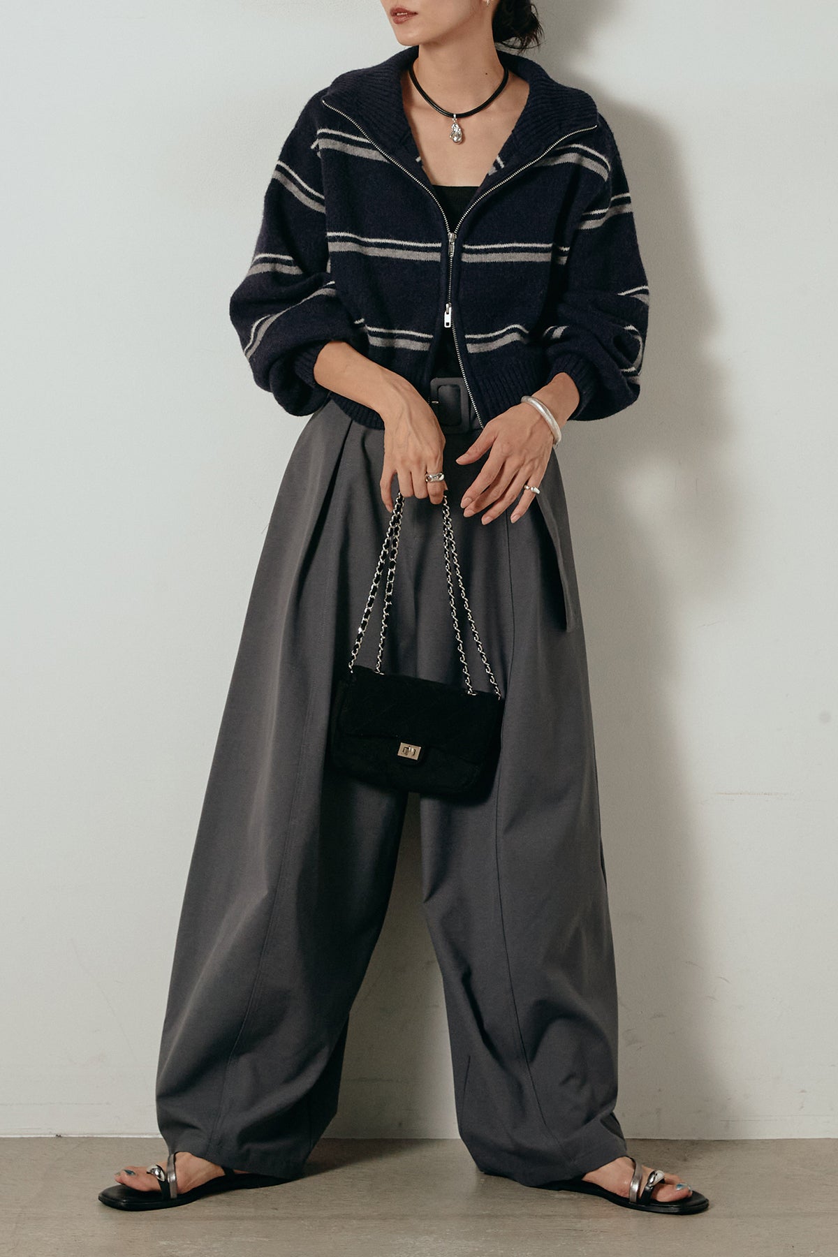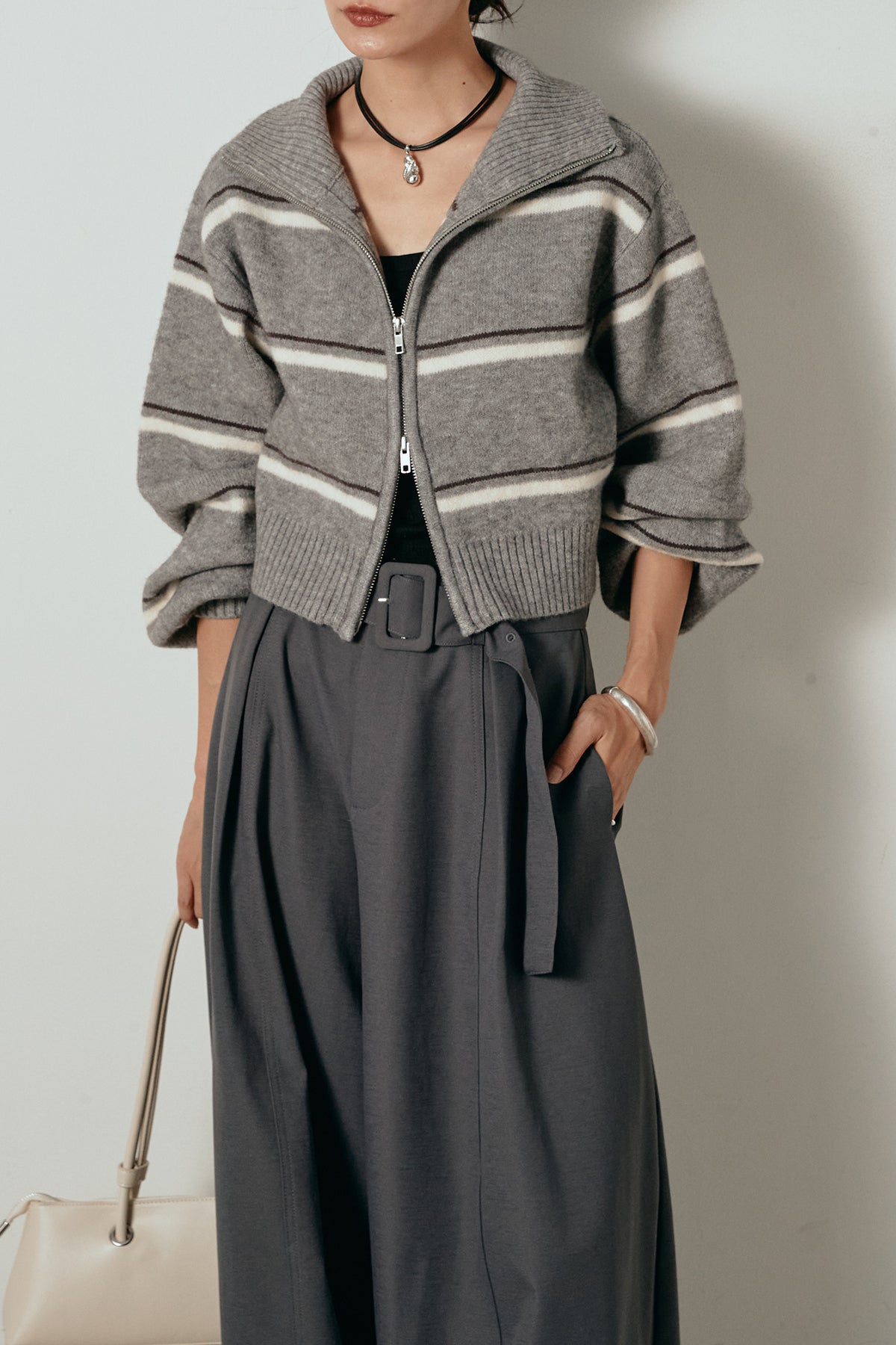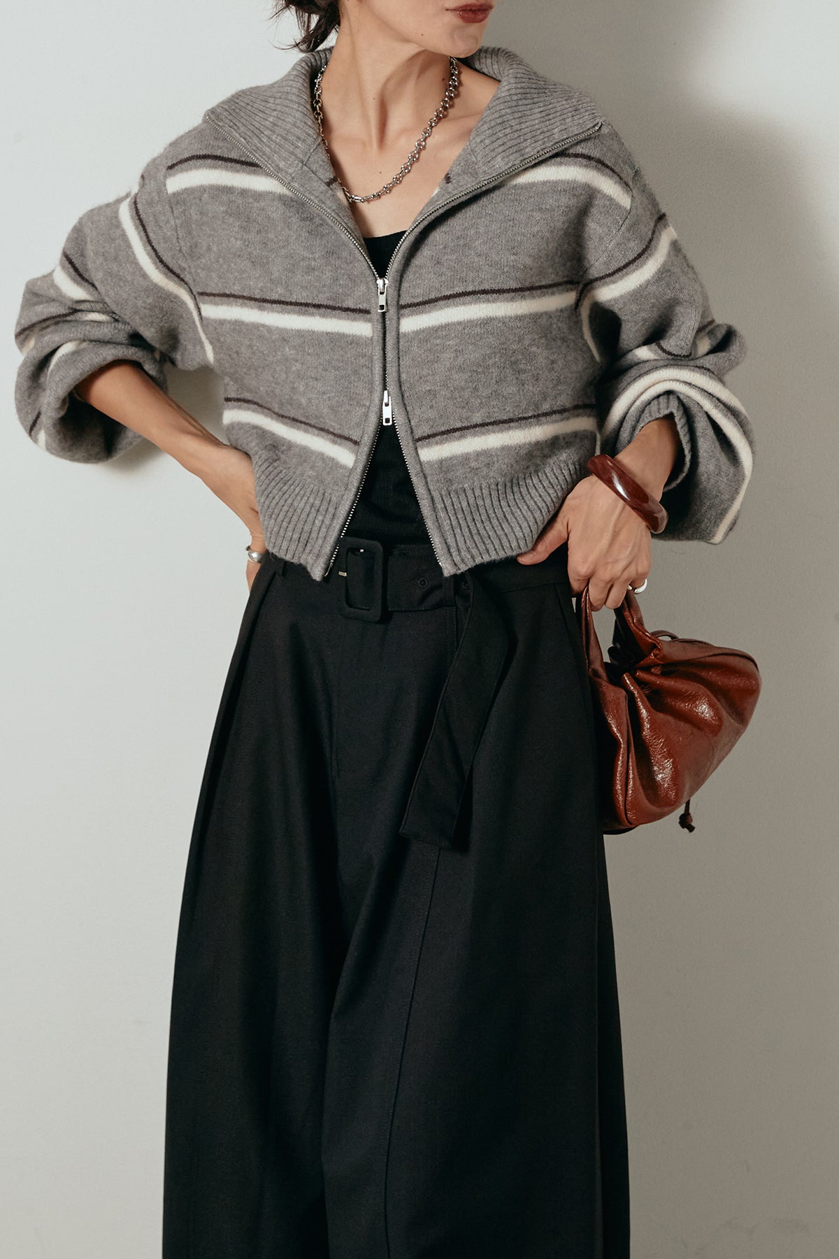 [SET]アルパカタッチボーダーダブルジップブルゾン+太ベルト付きタックワイドパンツ(2set)