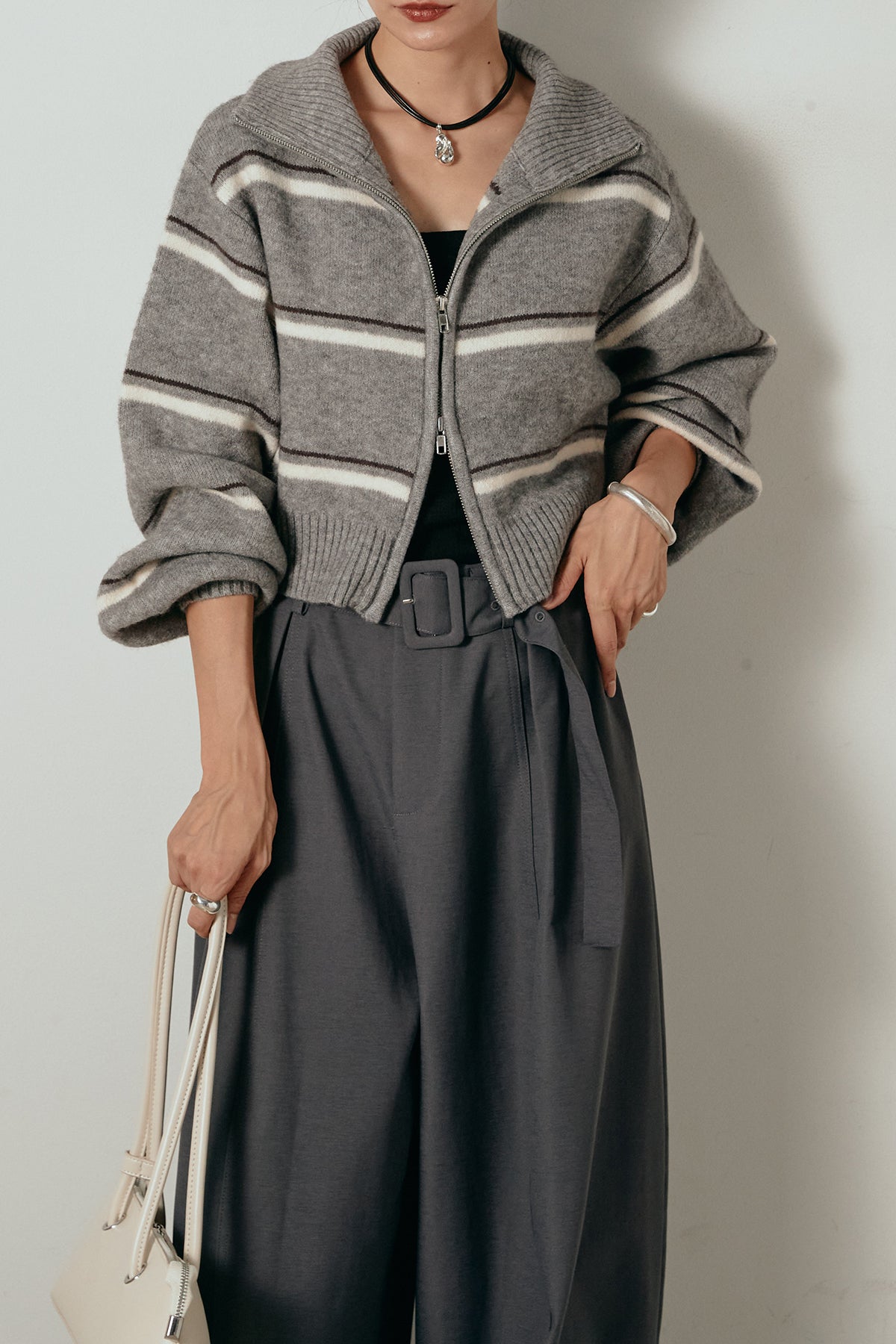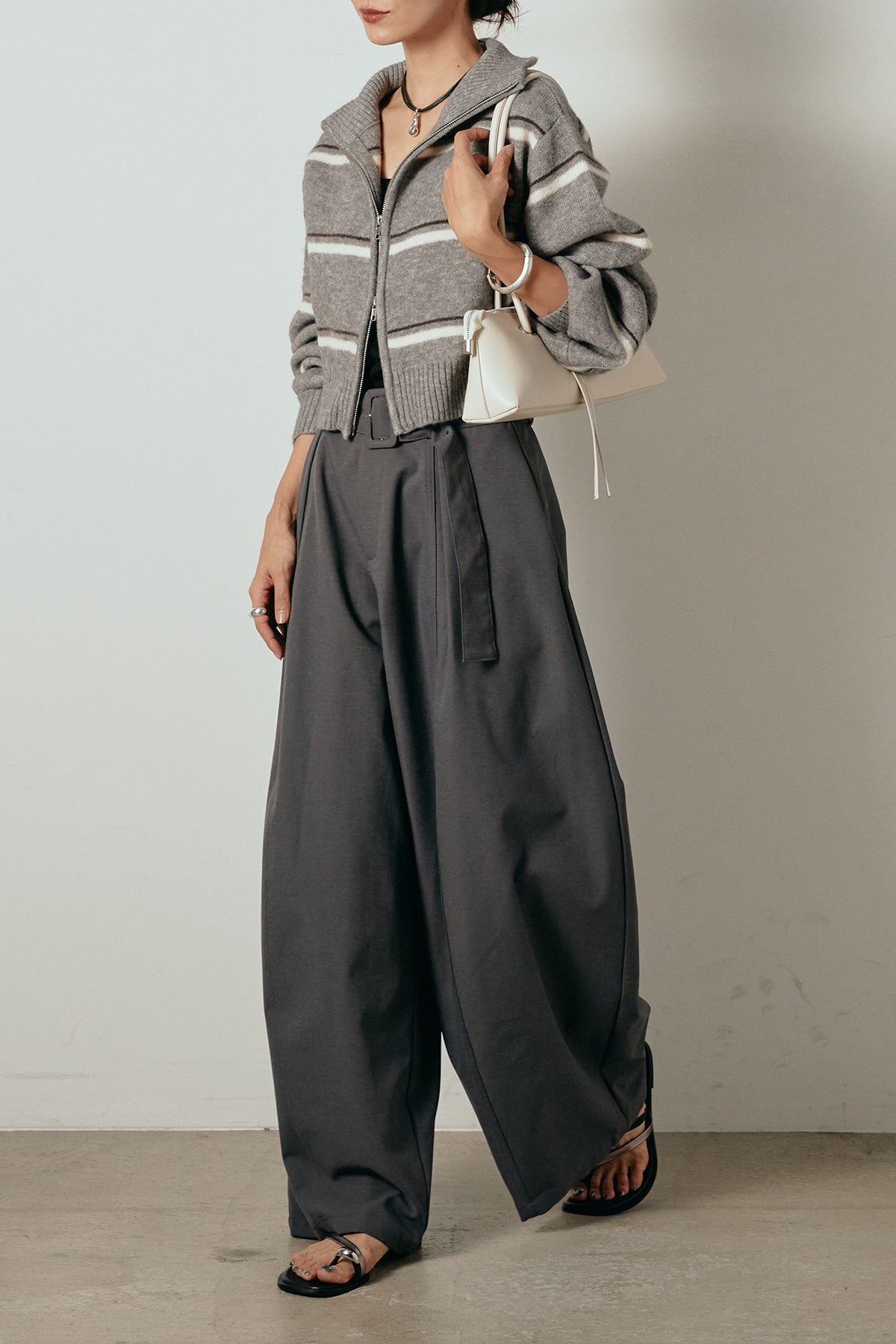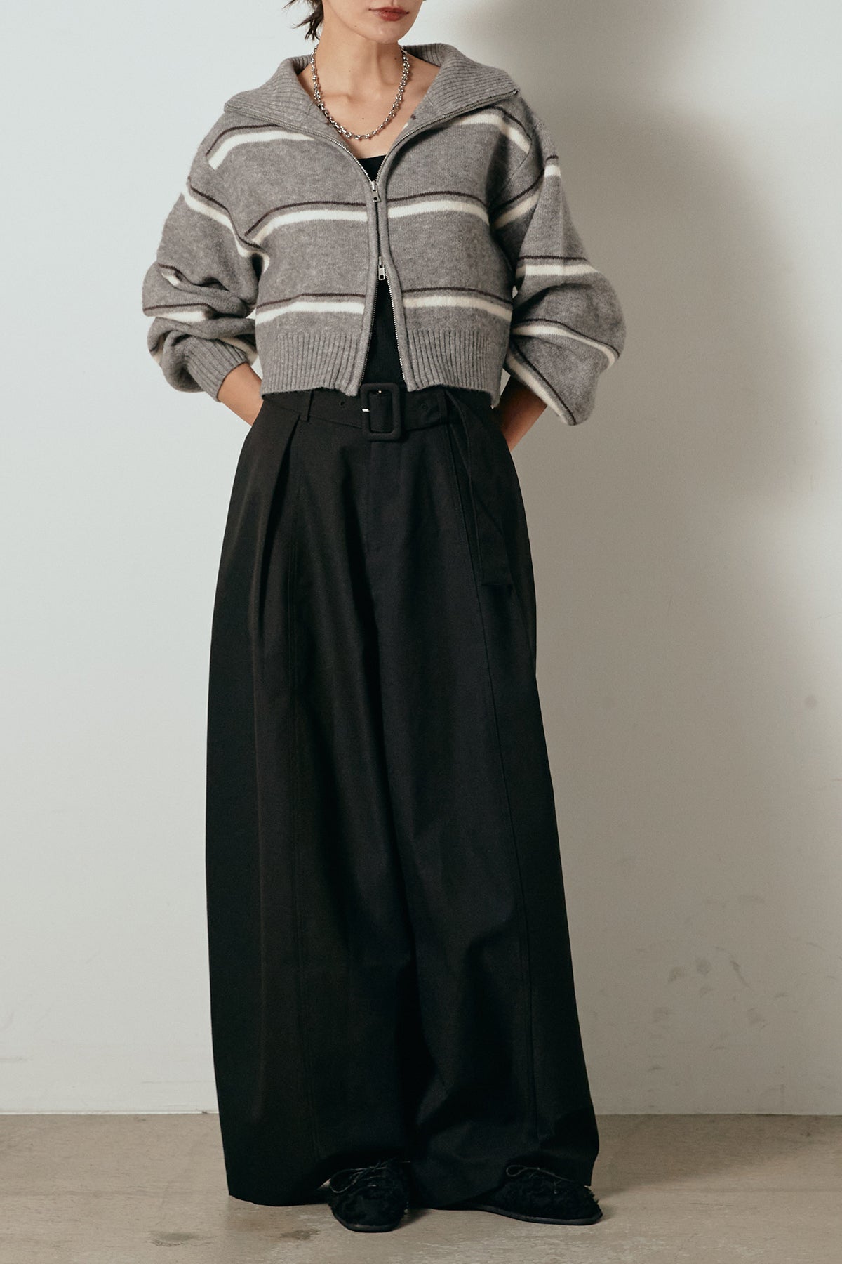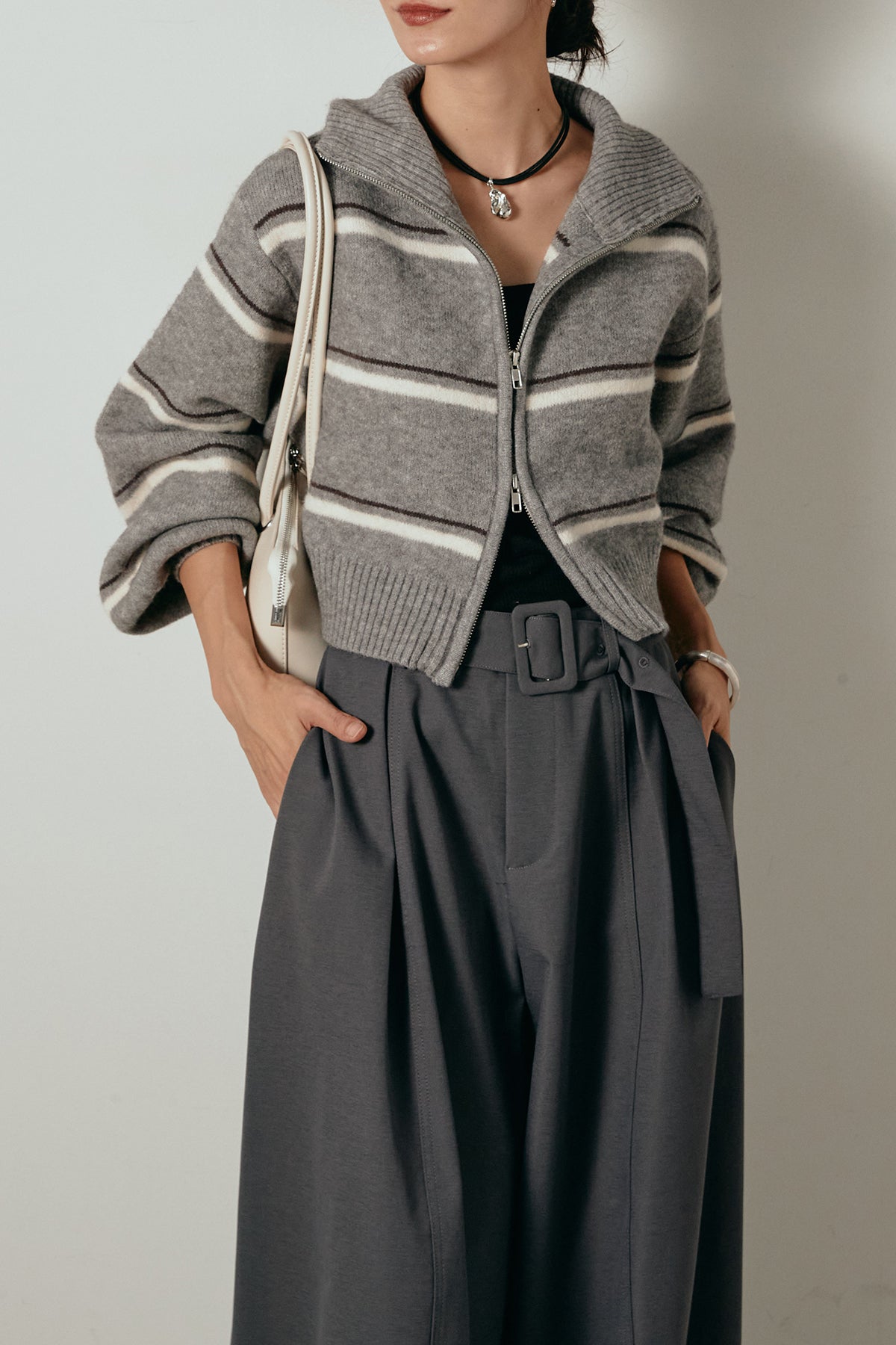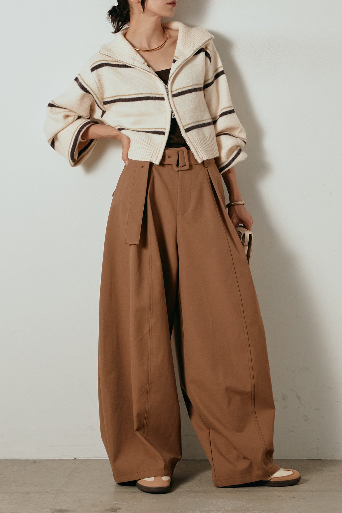 [SET]アルパカタッチボーダーダブルジップブルゾン+太ベルト付きタックワイドパンツ(2set)