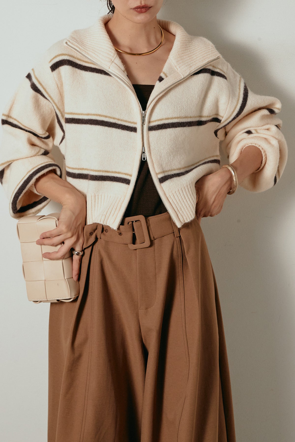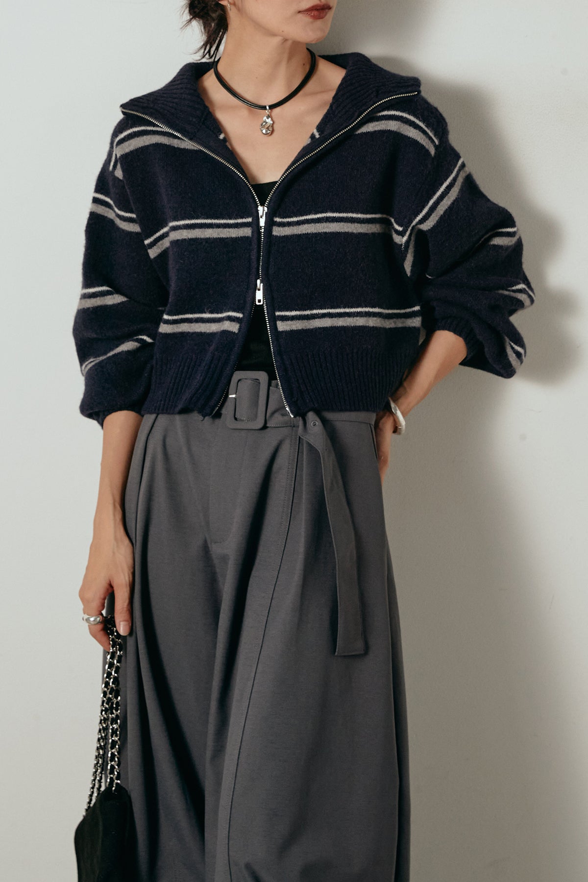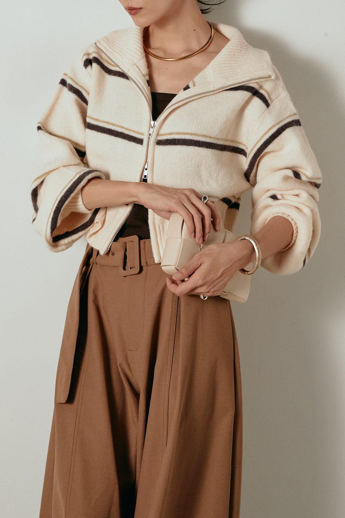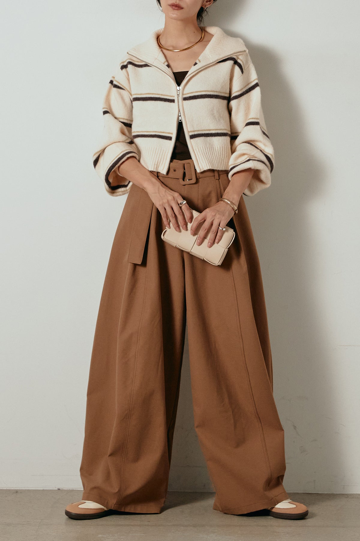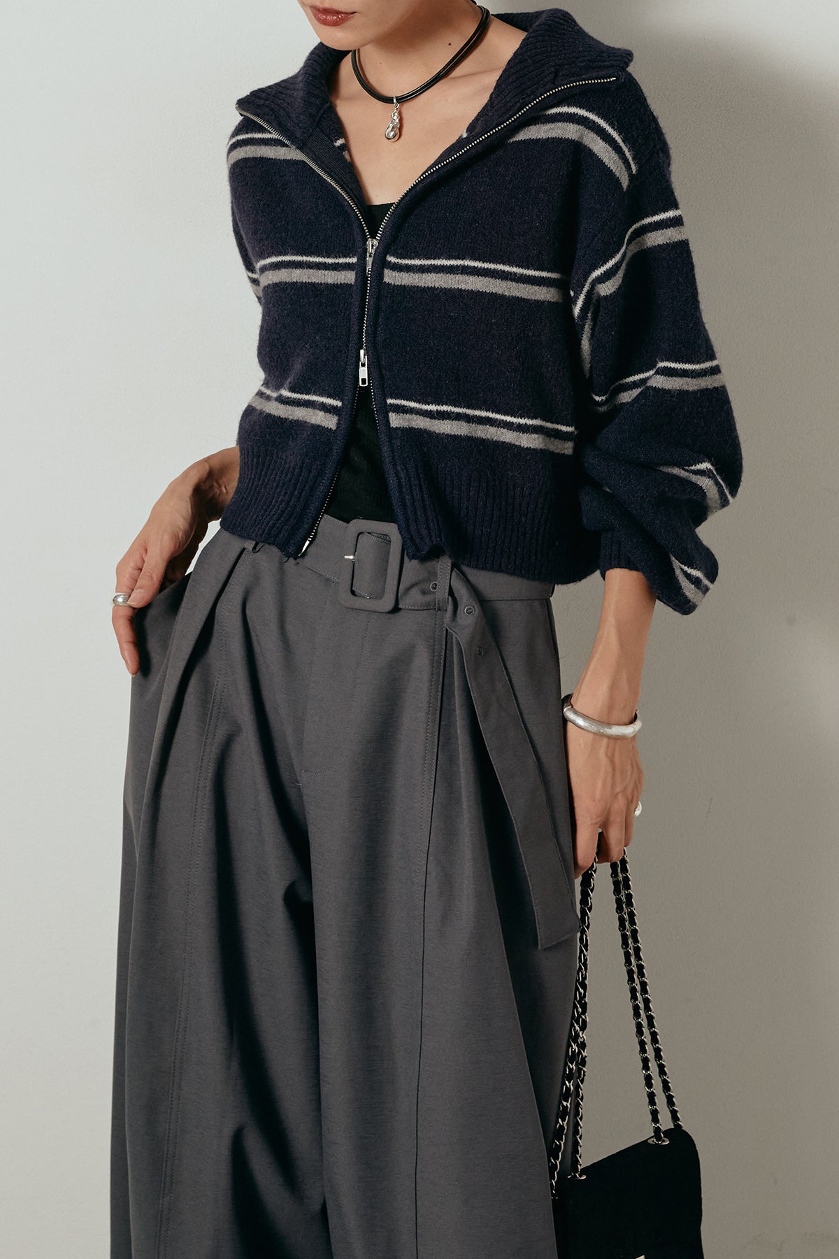 [SET]アルパカタッチボーダーダブルジップブルゾン+太ベルト付きタックワイドパンツ(2set)