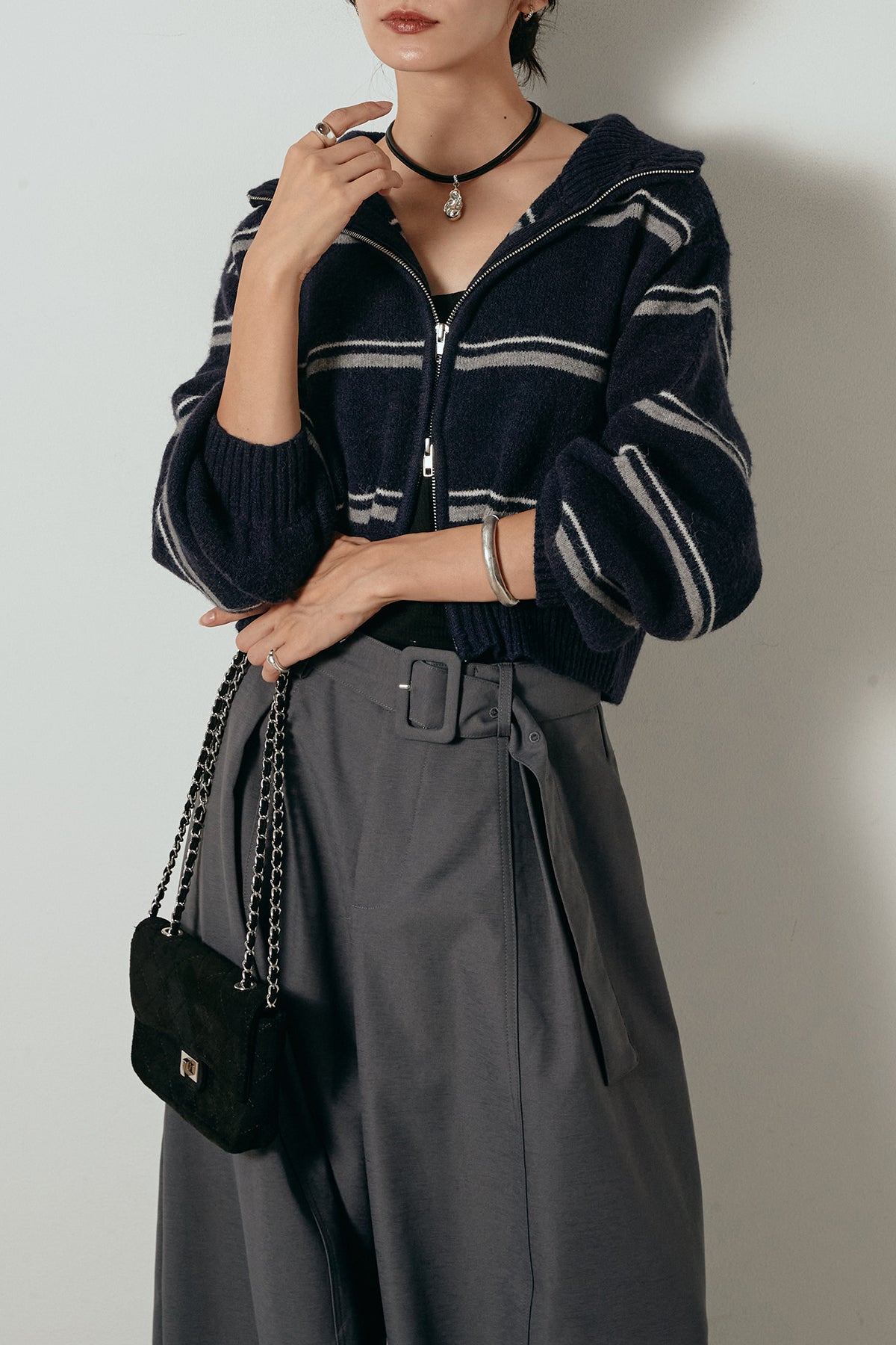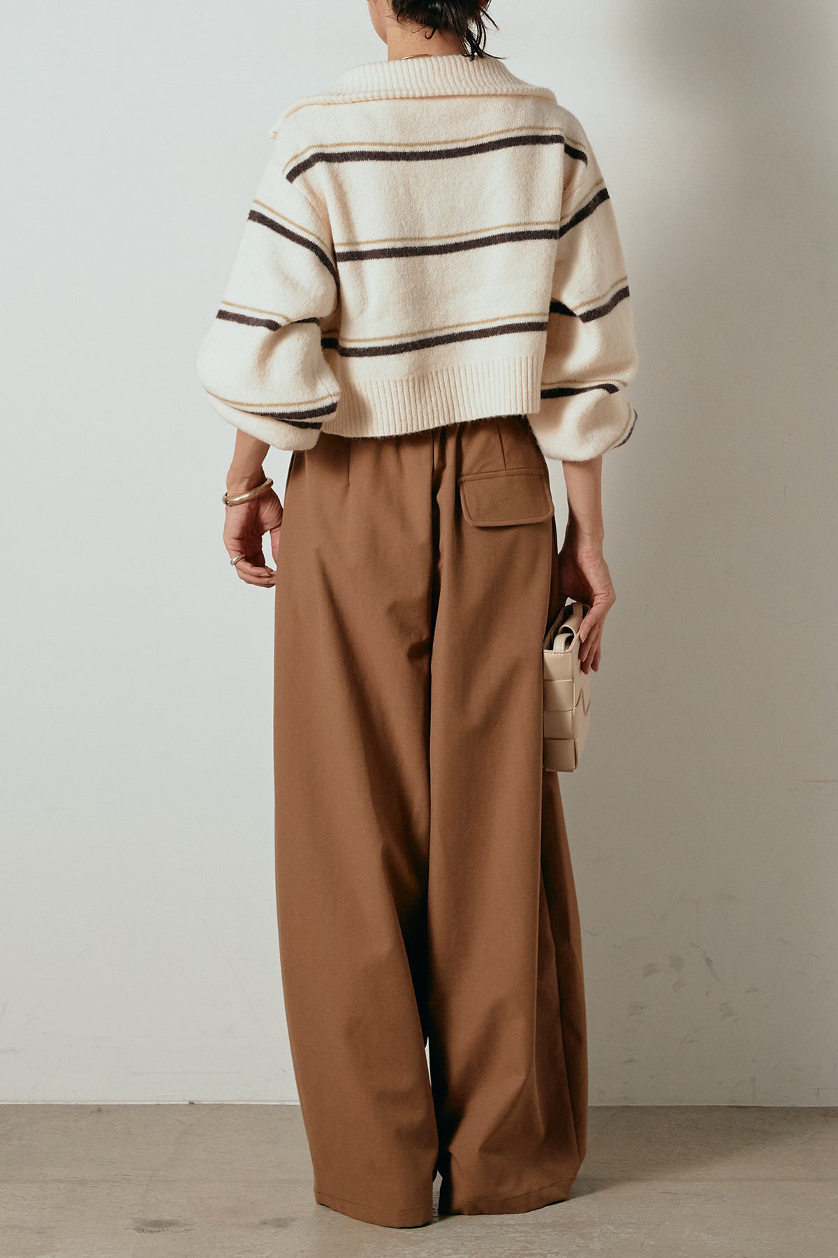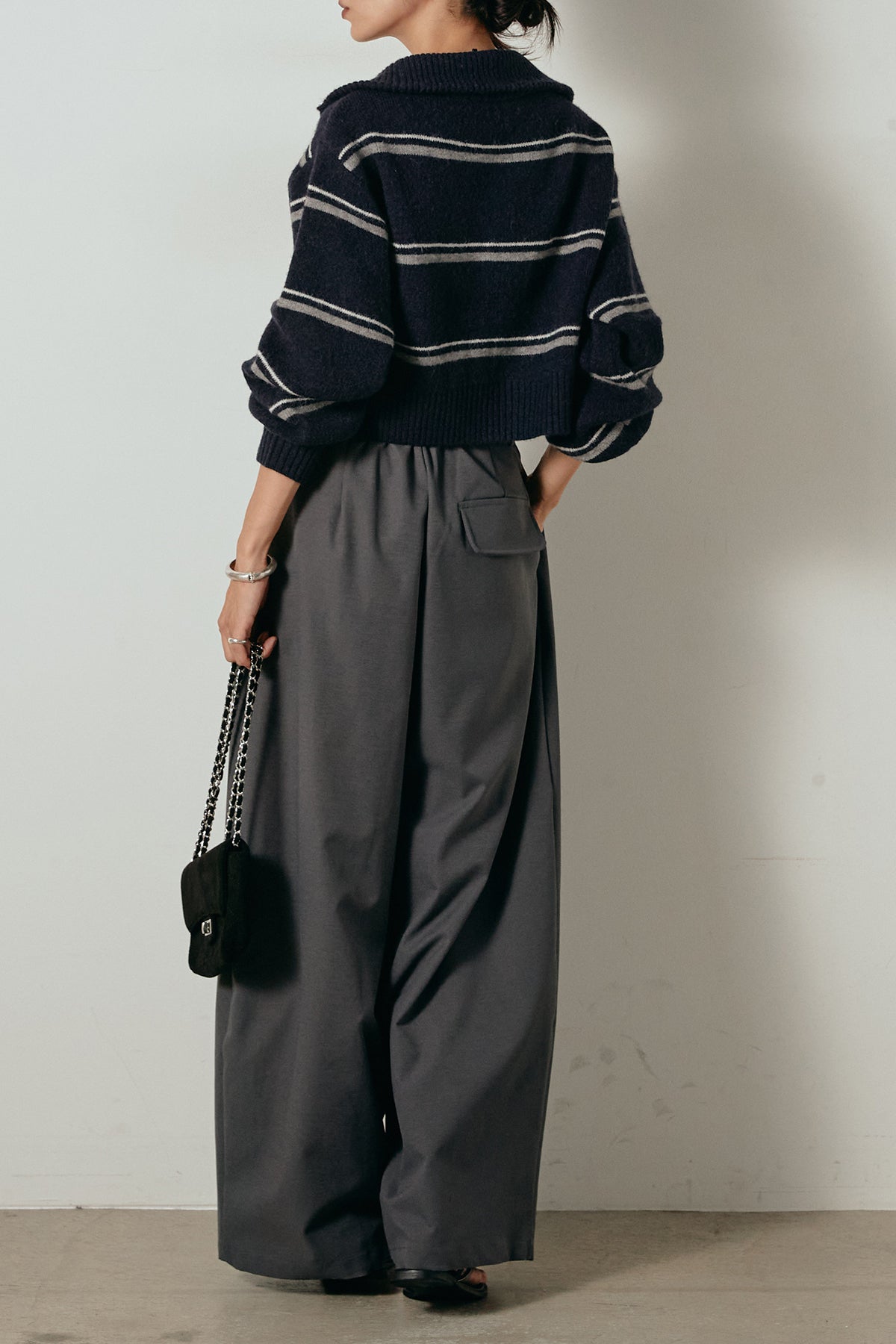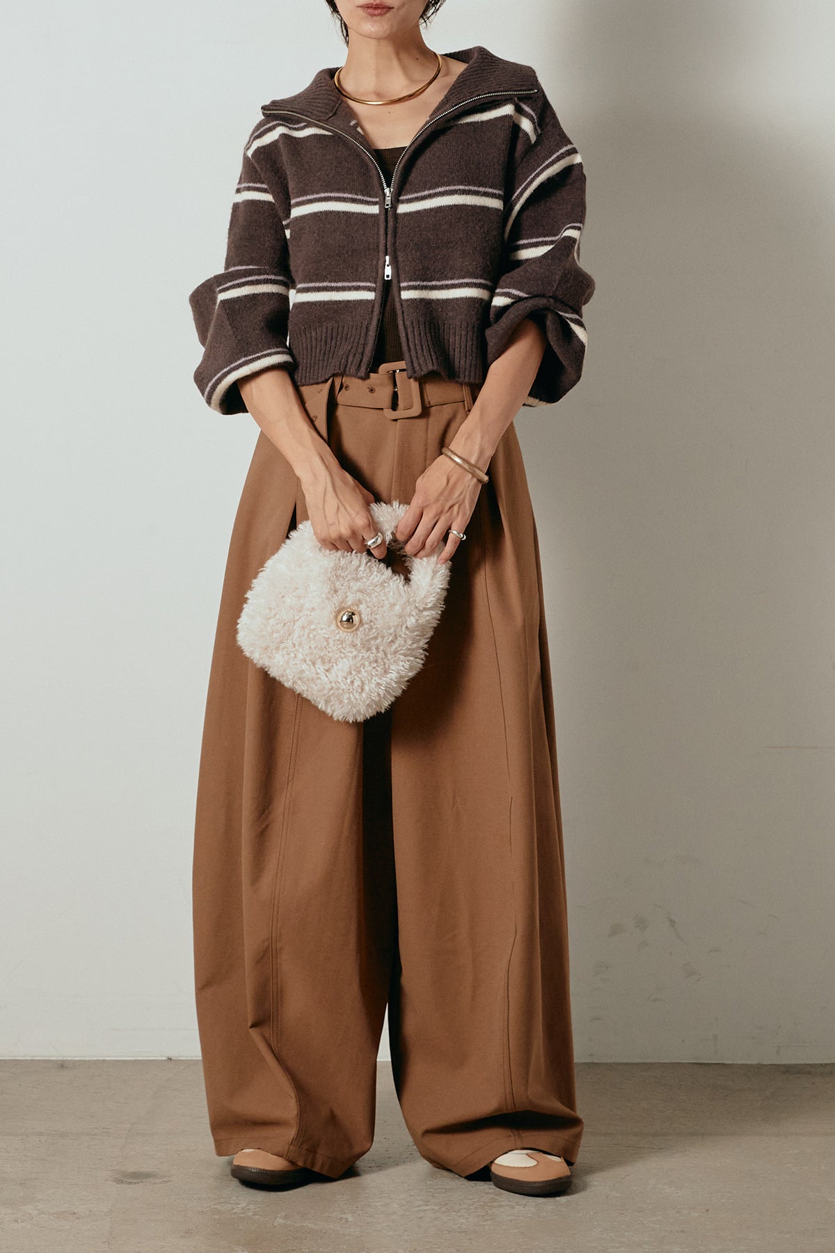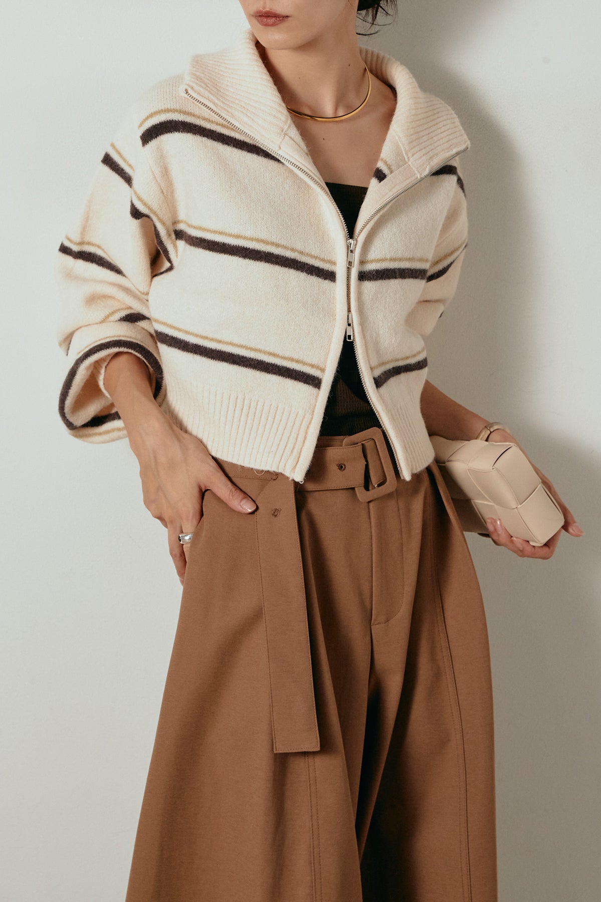 [SET]アルパカタッチボーダーダブルジップブルゾン+太ベルト付きタックワイドパンツ(2set)
