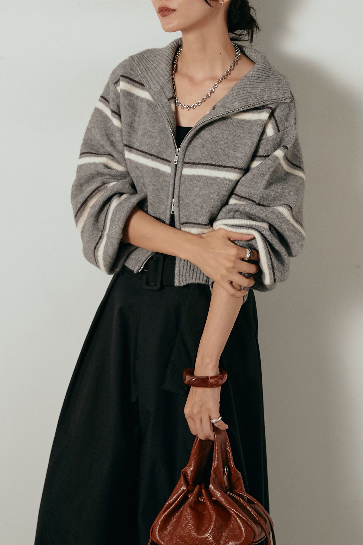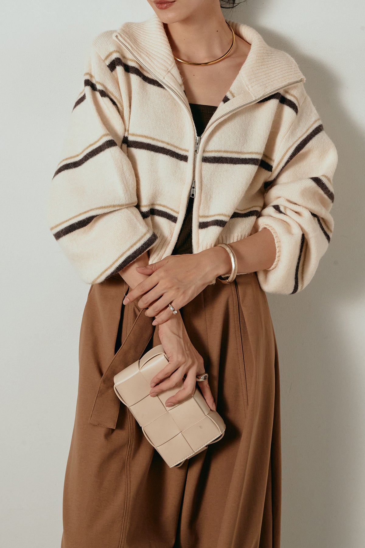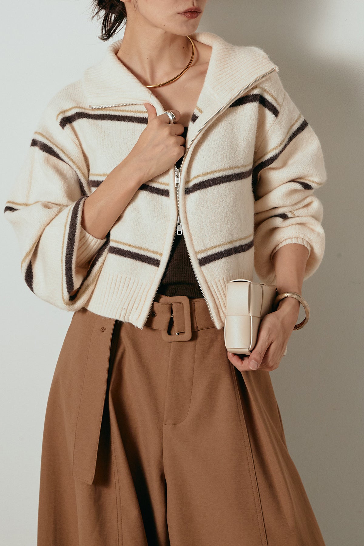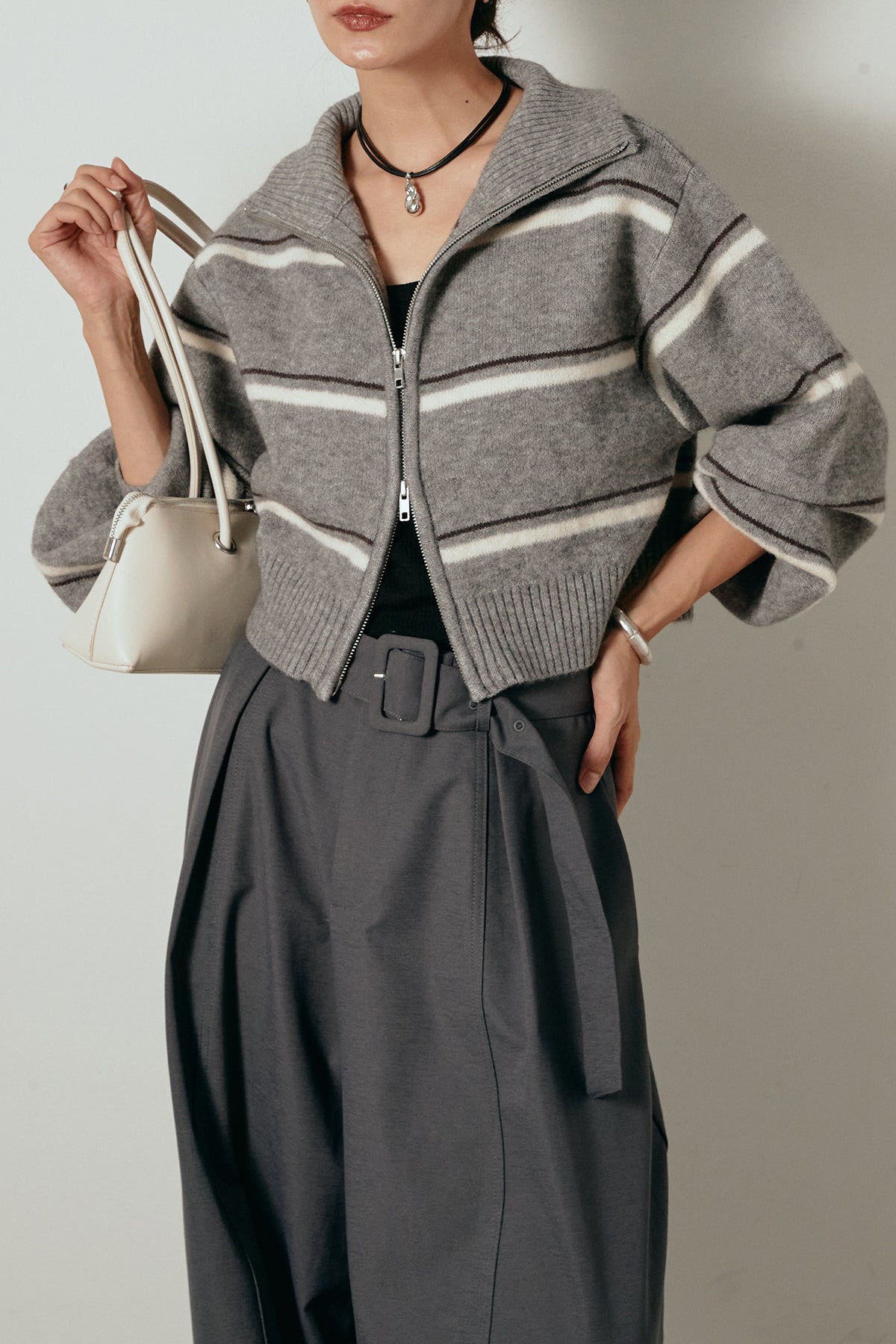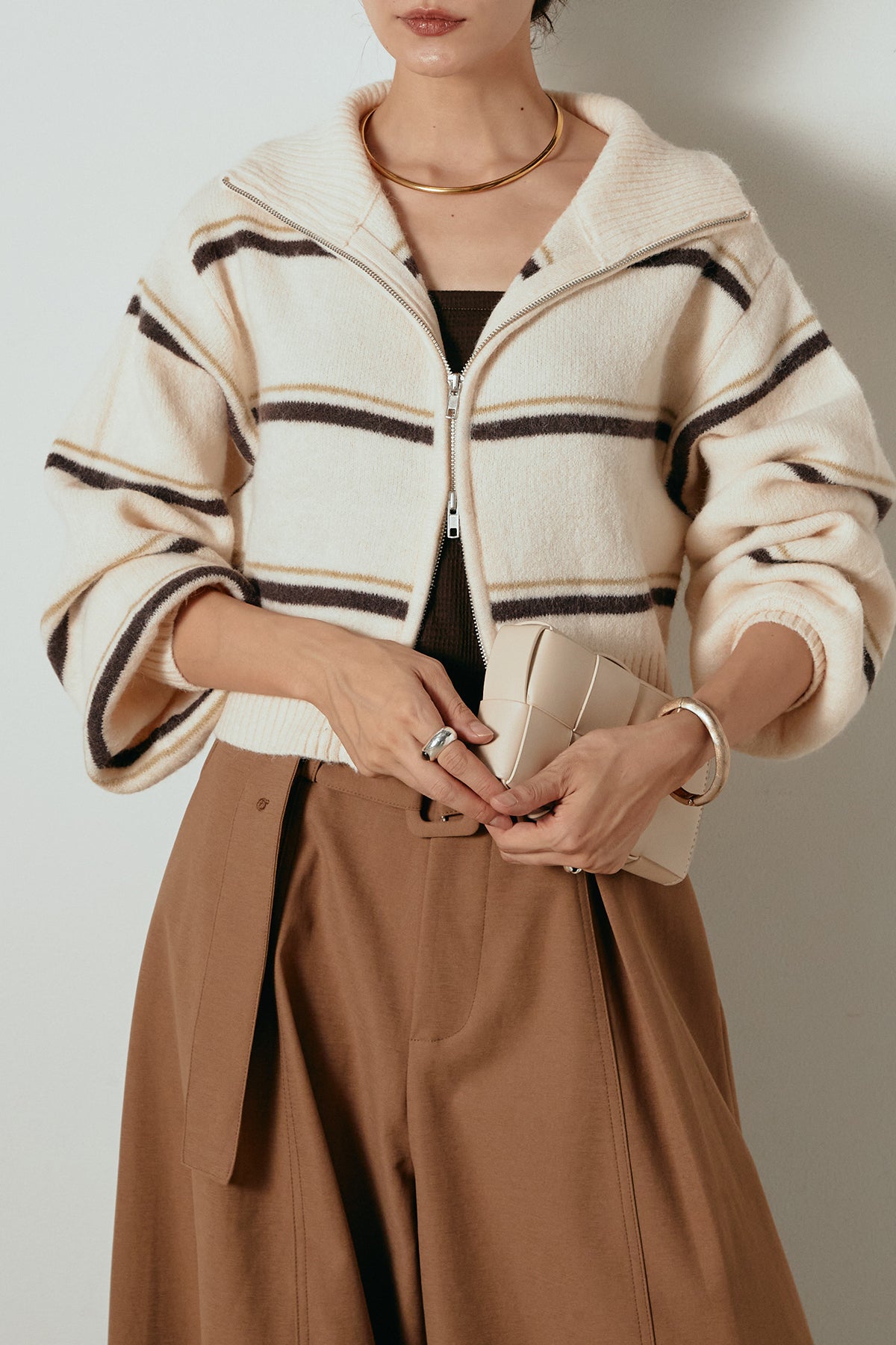 柔らかなアルパカタッチ素材で仕上げたボーダーブルゾン。ダブルジップ仕様でシルエットに変化をつけられ、気分やスタイルに合わせた着こなしが楽しめます。コンパクトな丈感がバランスを取りやすく、デイリーからトレンド感のあるスタイリングまで幅広く活躍する一枚です。