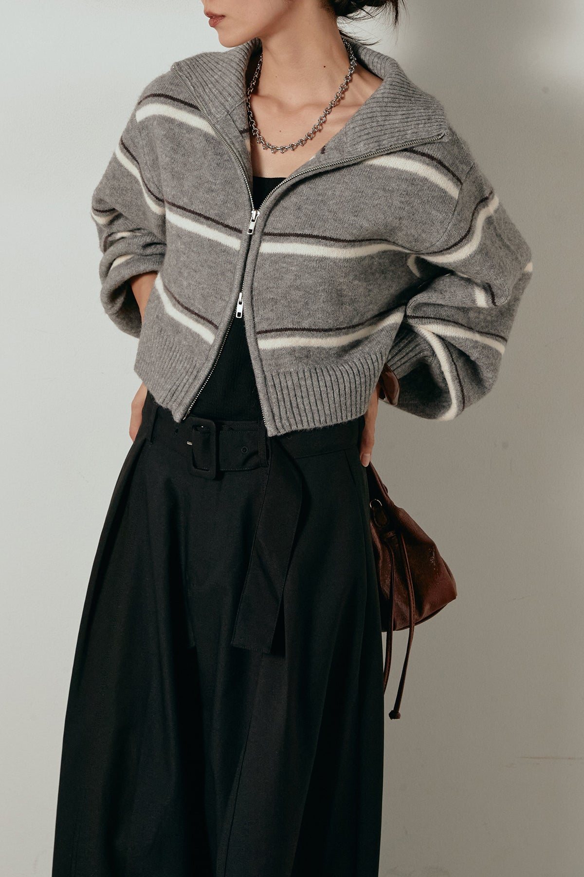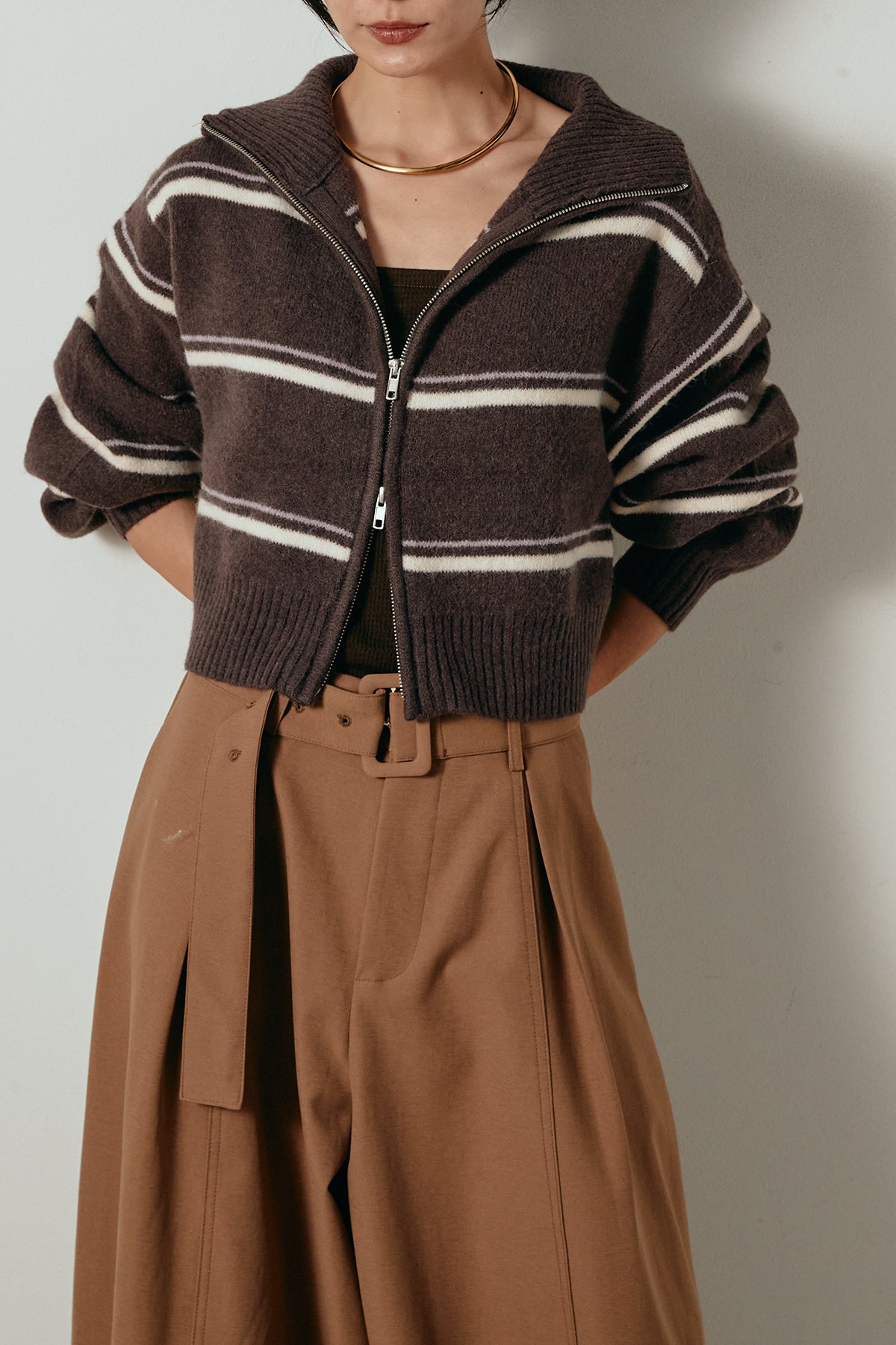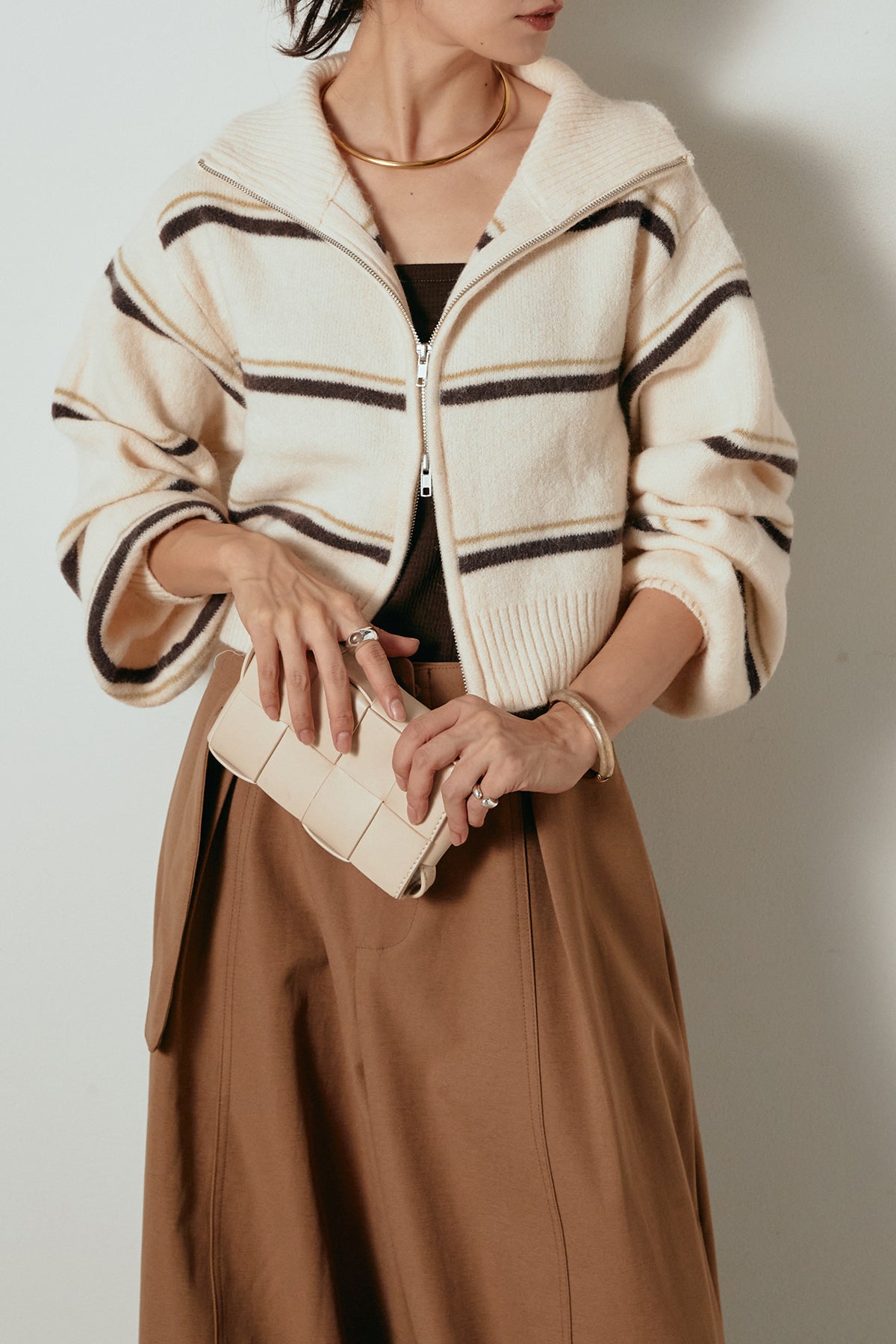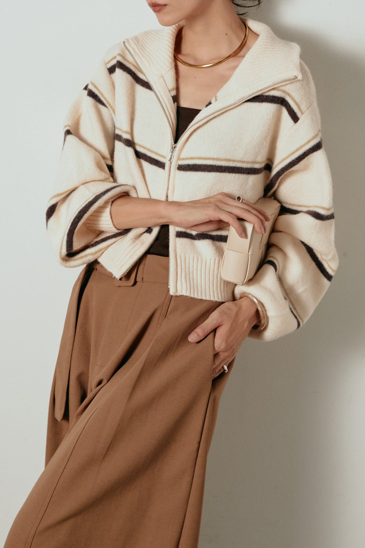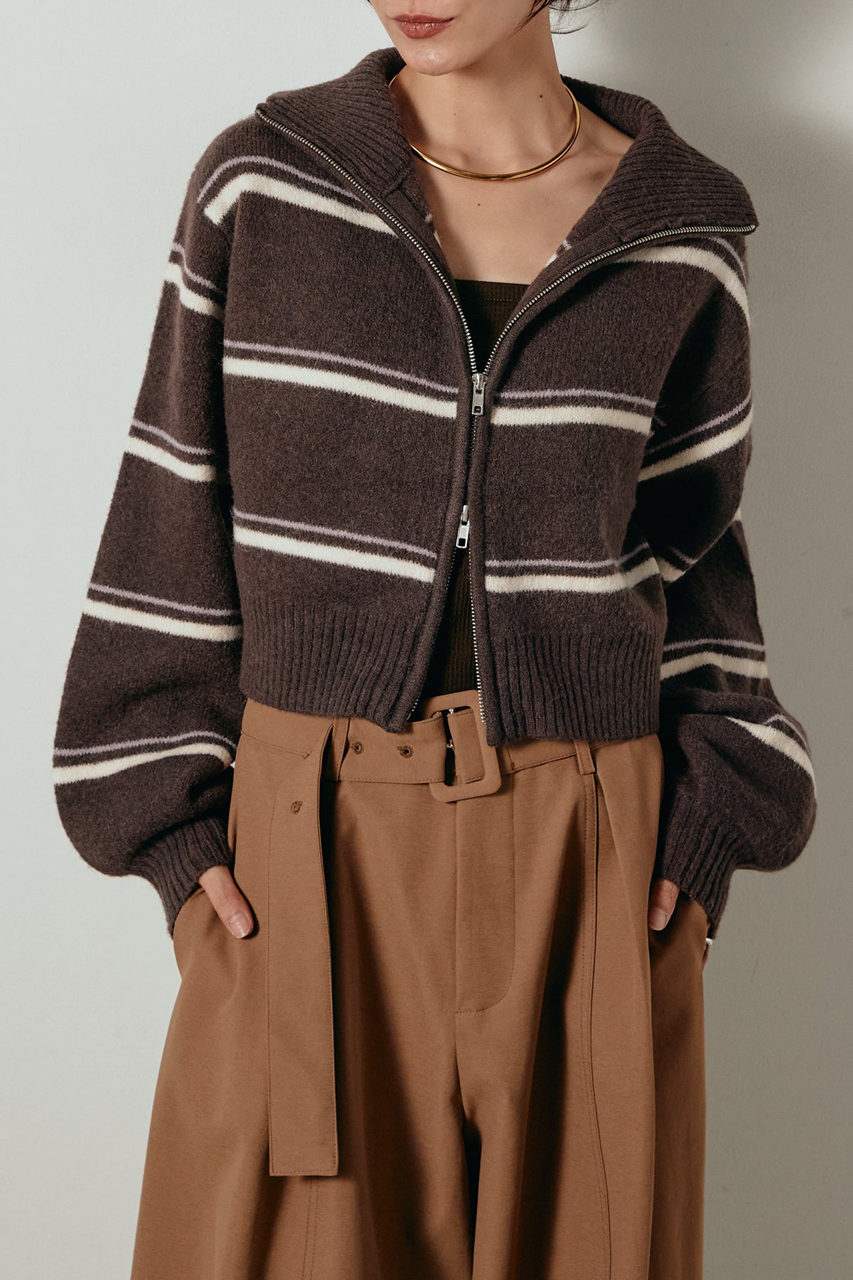 柔らかなアルパカタッチ素材で仕上げたボーダーブルゾン。ダブルジップ仕様でシルエットに変化をつけられ、気分やスタイルに合わせた着こなしが楽しめます。コンパクトな丈感がバランスを取りやすく、デイリーからトレンド感のあるスタイリングまで幅広く活躍する一枚です。
