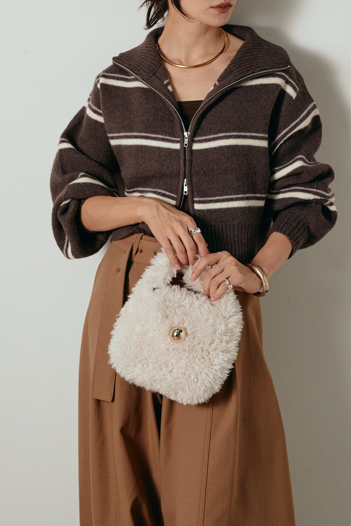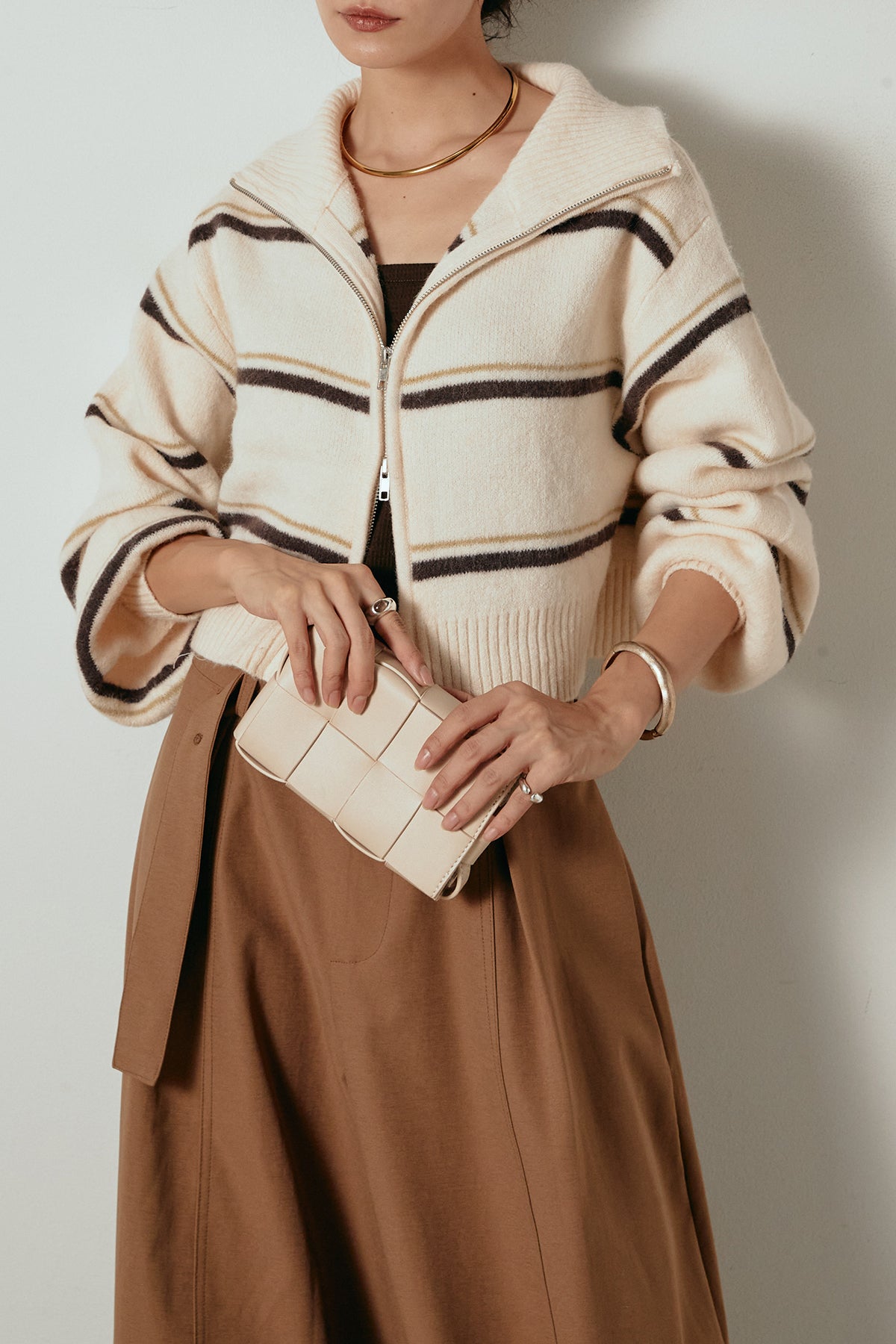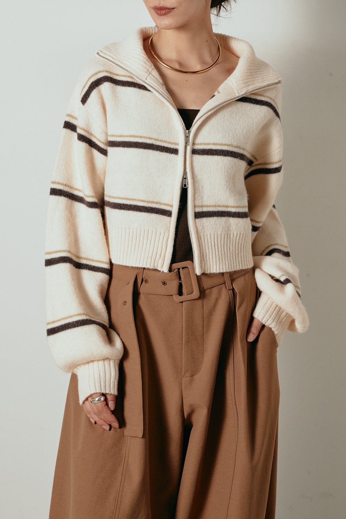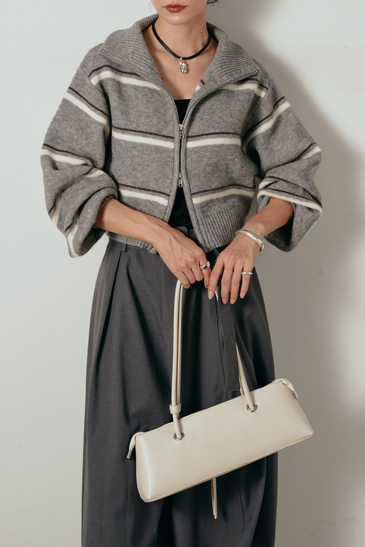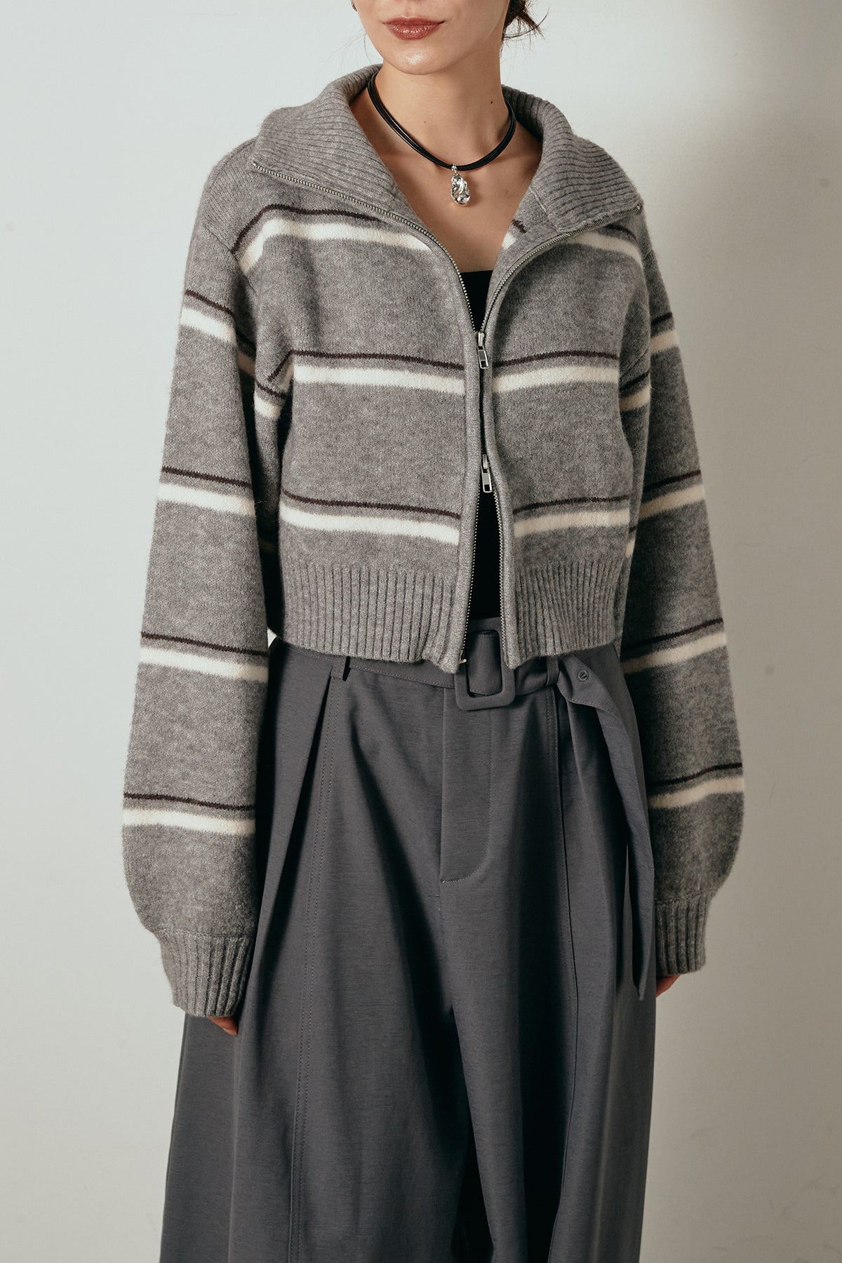 柔らかなアルパカタッチ素材で仕上げたボーダーブルゾン。ダブルジップ仕様でシルエットに変化をつけられ、気分やスタイルに合わせた着こなしが楽しめます。コンパクトな丈感がバランスを取りやすく、デイリーからトレンド感のあるスタイリングまで幅広く活躍する一枚です。