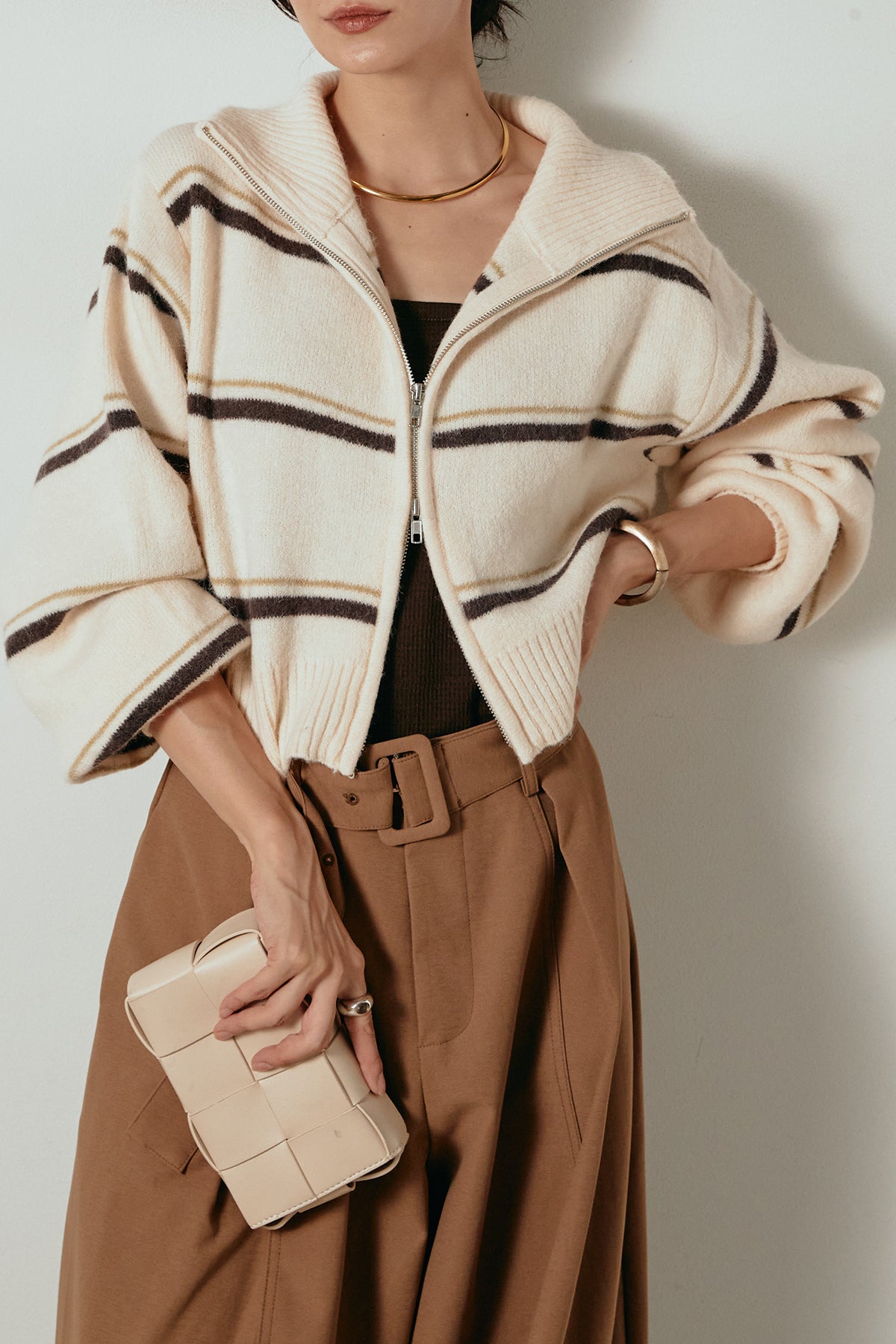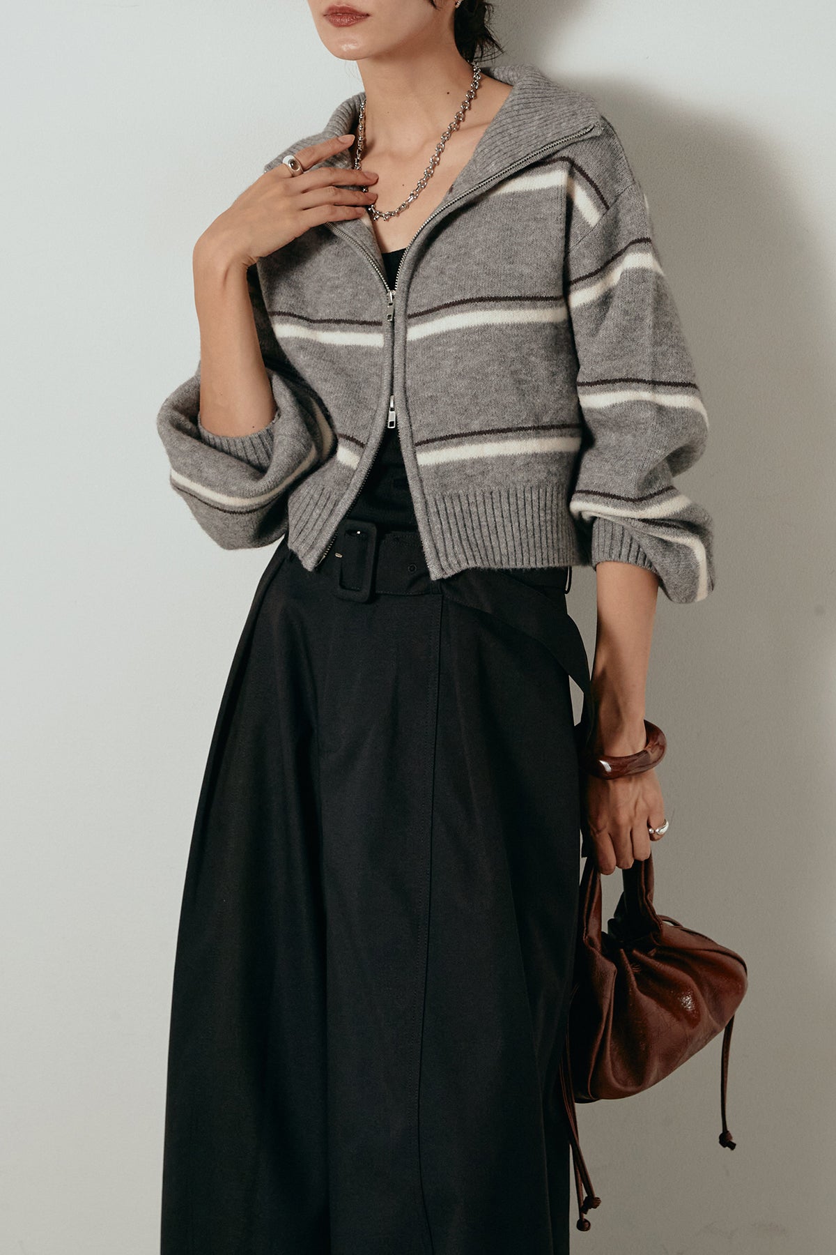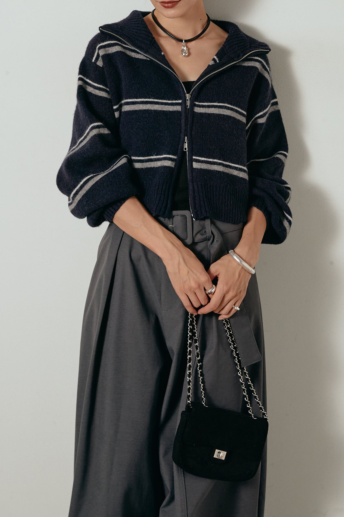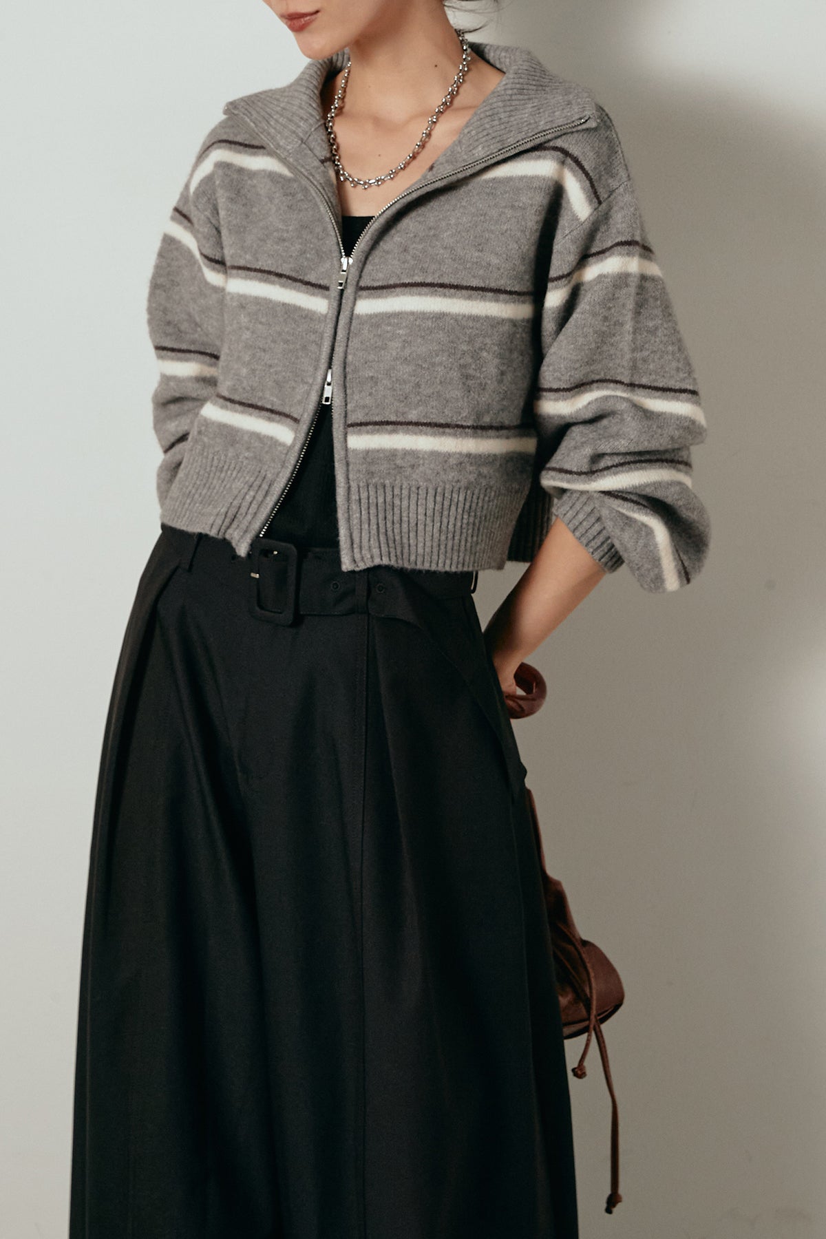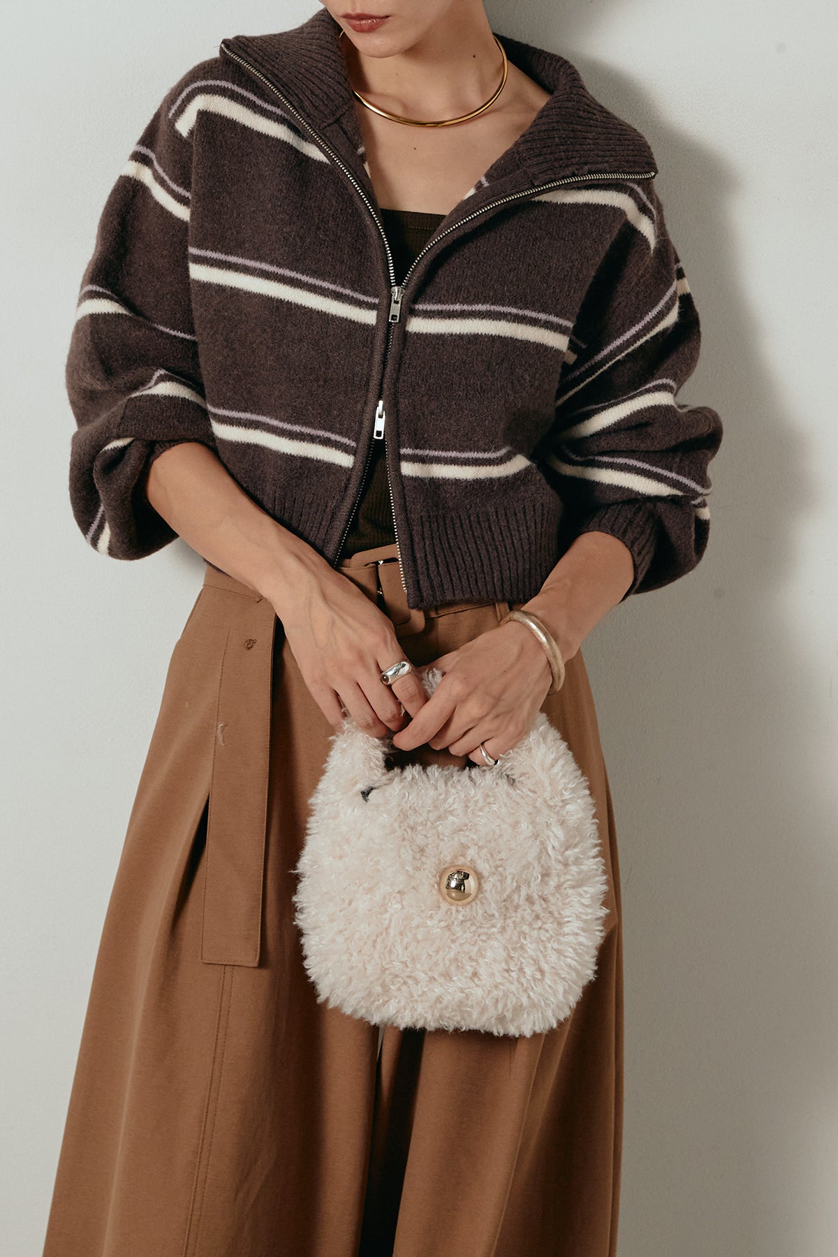 柔らかなアルパカタッチ素材で仕上げたボーダーブルゾン。ダブルジップ仕様でシルエットに変化をつけられ、気分やスタイルに合わせた着こなしが楽しめます。コンパクトな丈感がバランスを取りやすく、デイリーからトレンド感のあるスタイリングまで幅広く活躍する一枚です。