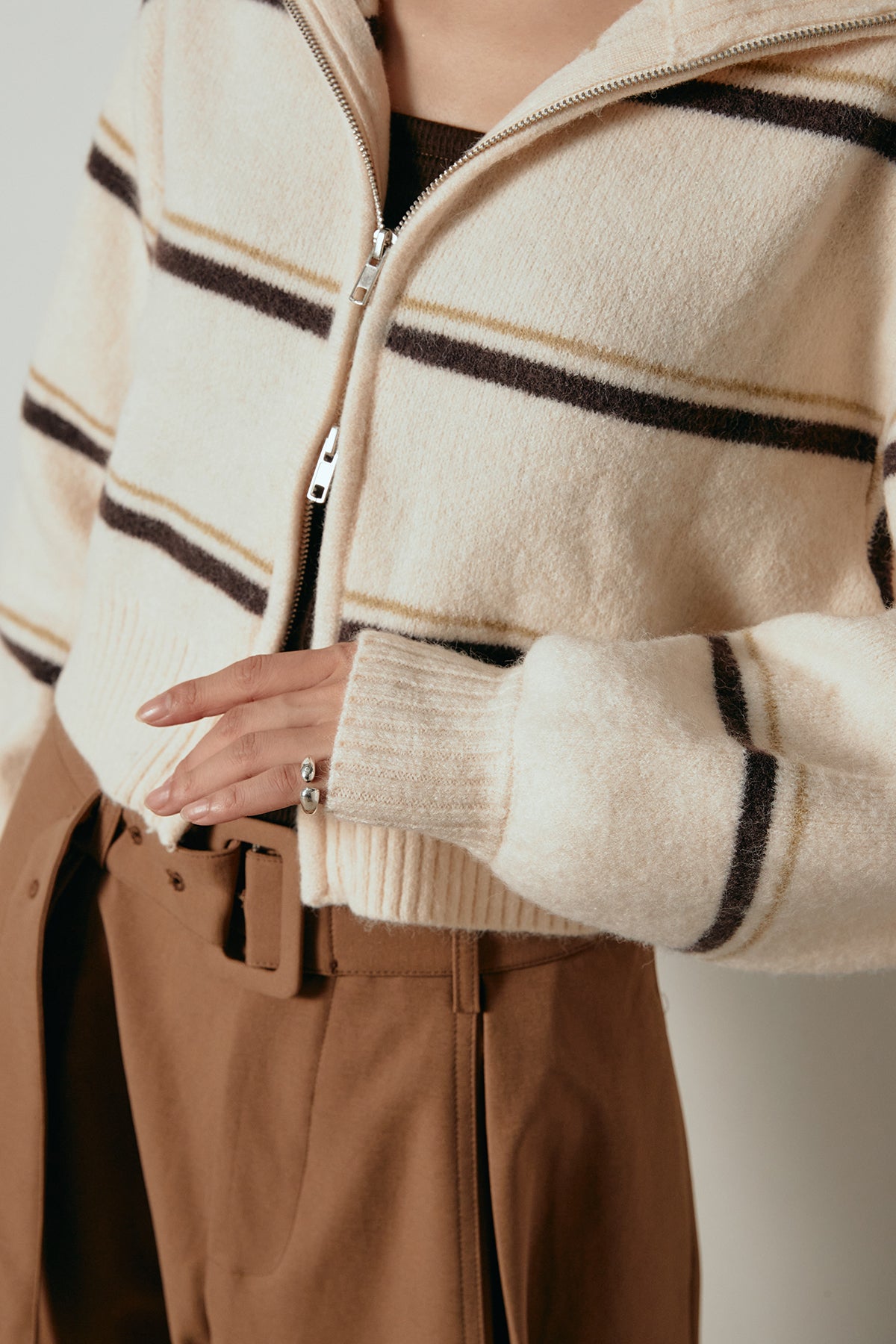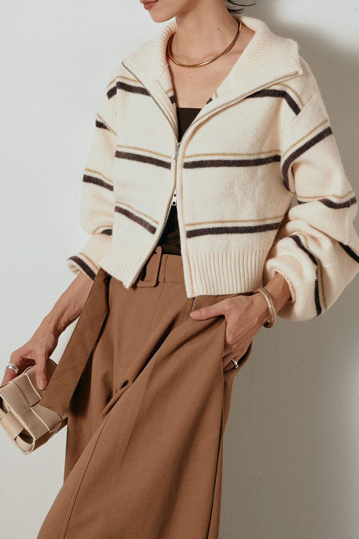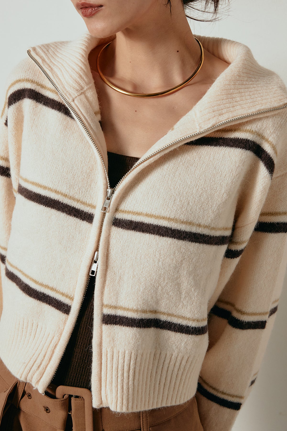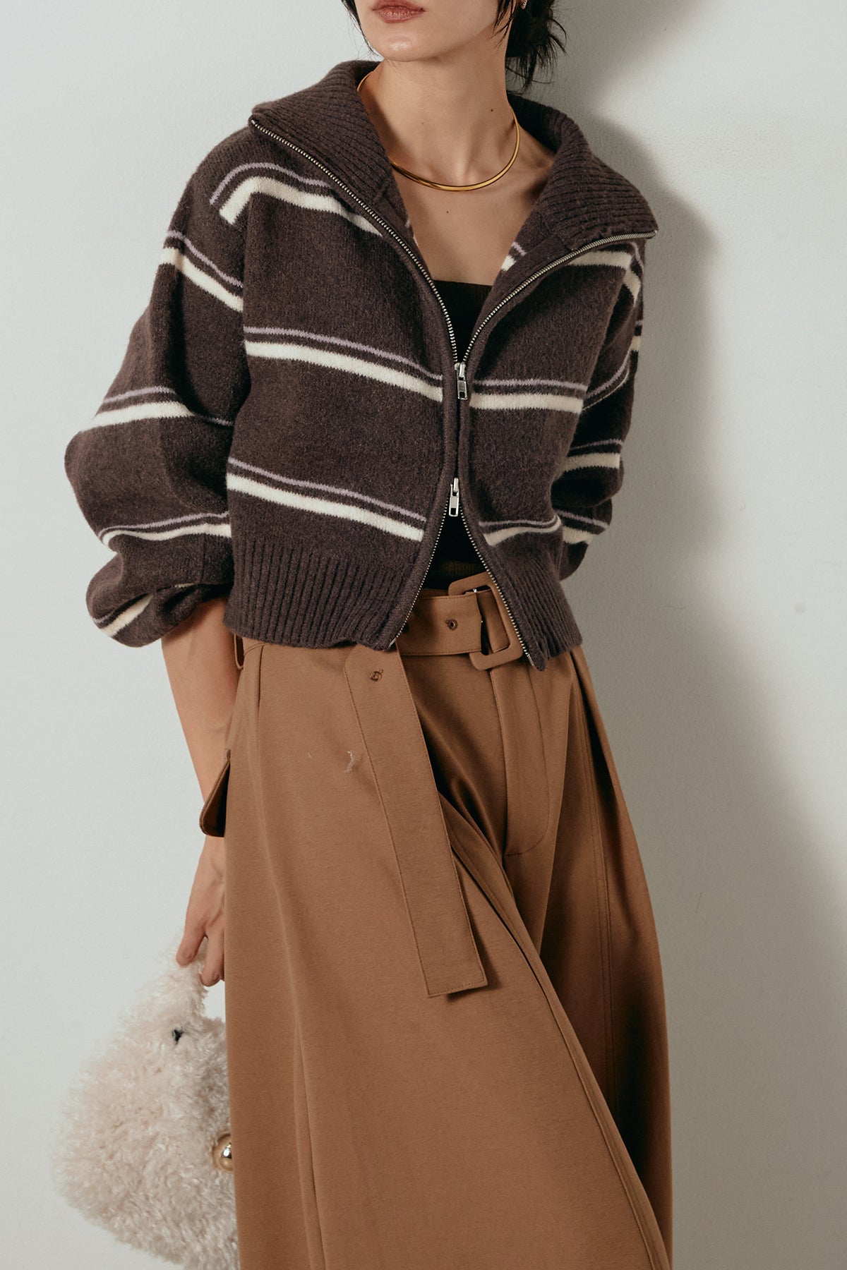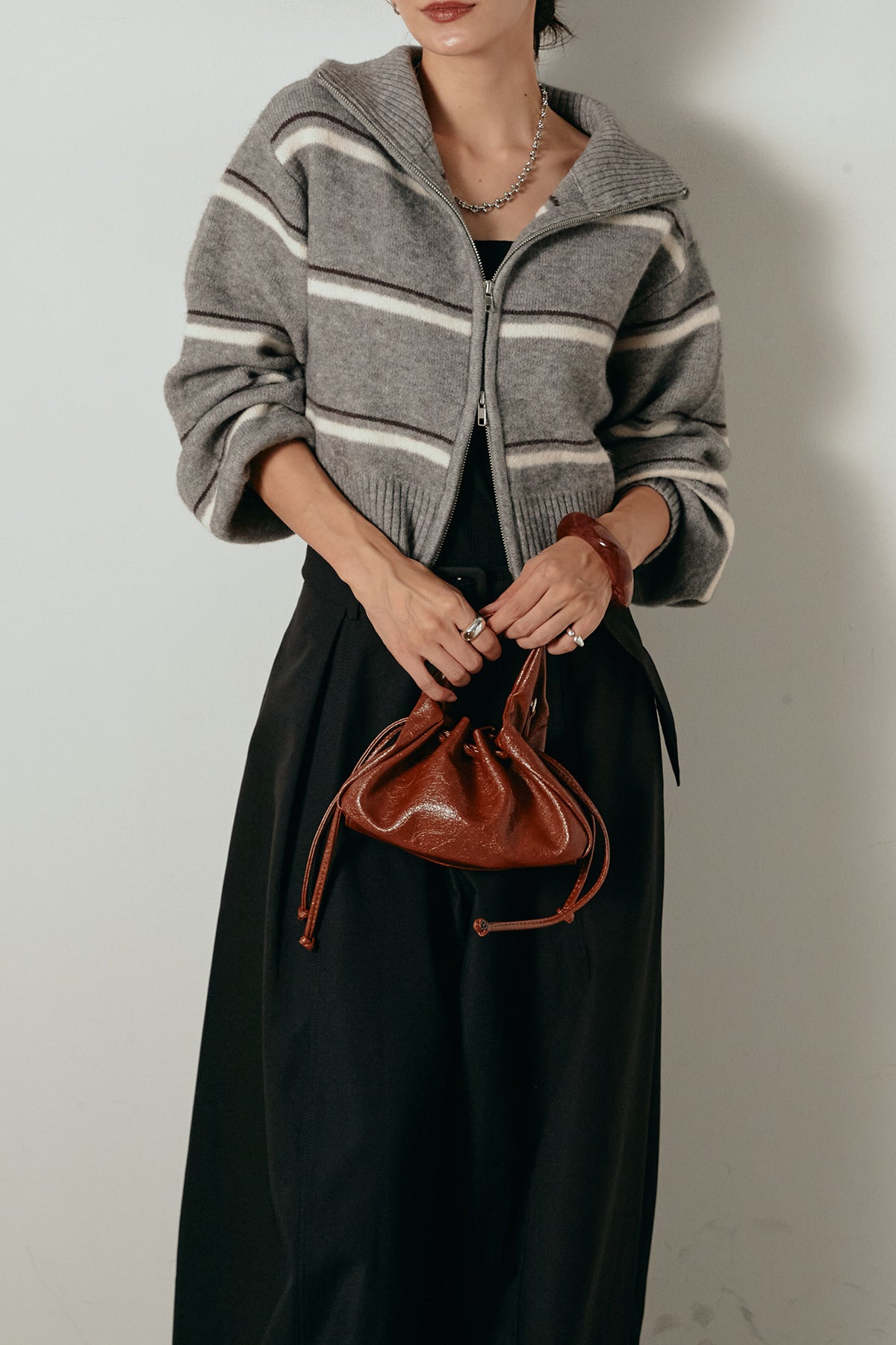 柔らかなアルパカタッチ素材で仕上げたボーダーブルゾン。ダブルジップ仕様でシルエットに変化をつけられ、気分やスタイルに合わせた着こなしが楽しめます。コンパクトな丈感がバランスを取りやすく、デイリーからトレンド感のあるスタイリングまで幅広く活躍する一枚です。