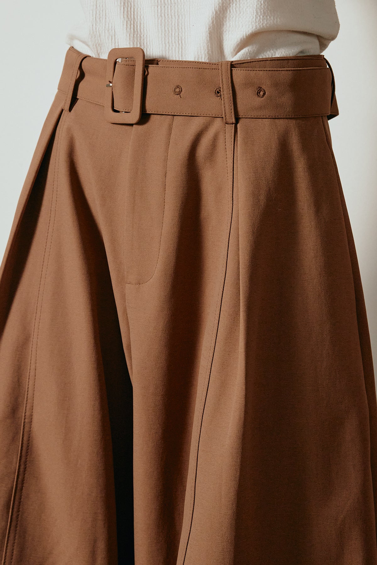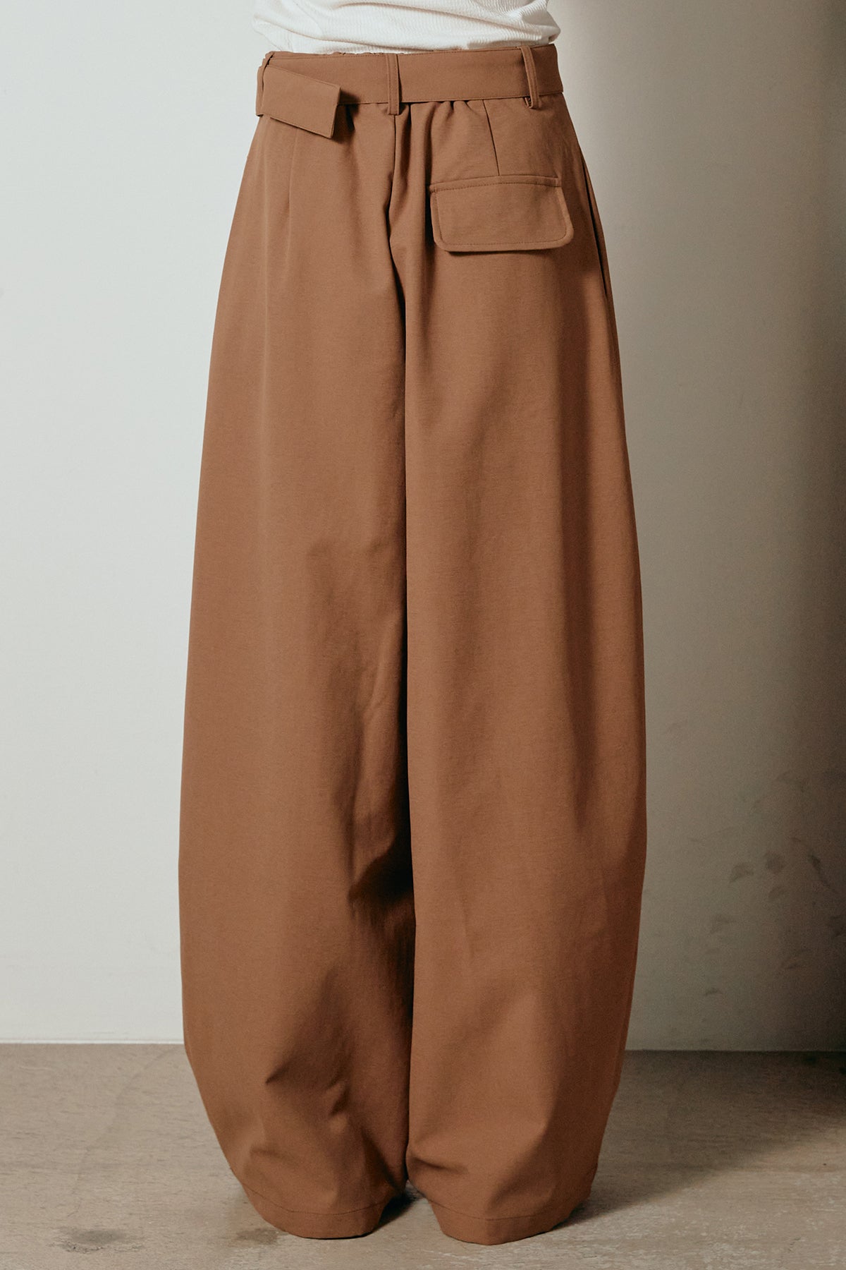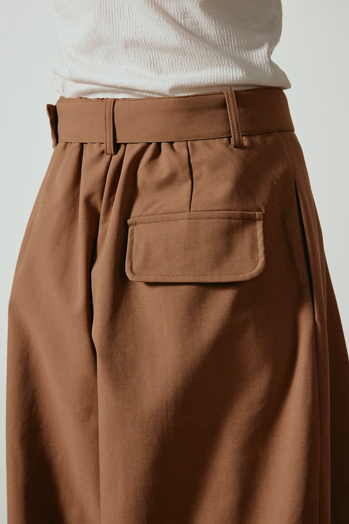 太めのベルトが目を引くワイドパンツ。 フロントタックと深めの股上が、立体的で美しいシルエットを生み出します。 しっかりとした生地感ながら、軽やかな穿き心地が魅力。 トップスをインしてベルトをアクセントにしたり、ゆるいニットと合わせて抜け感を出したり、幅広いコーディネートが楽しめる一本です。