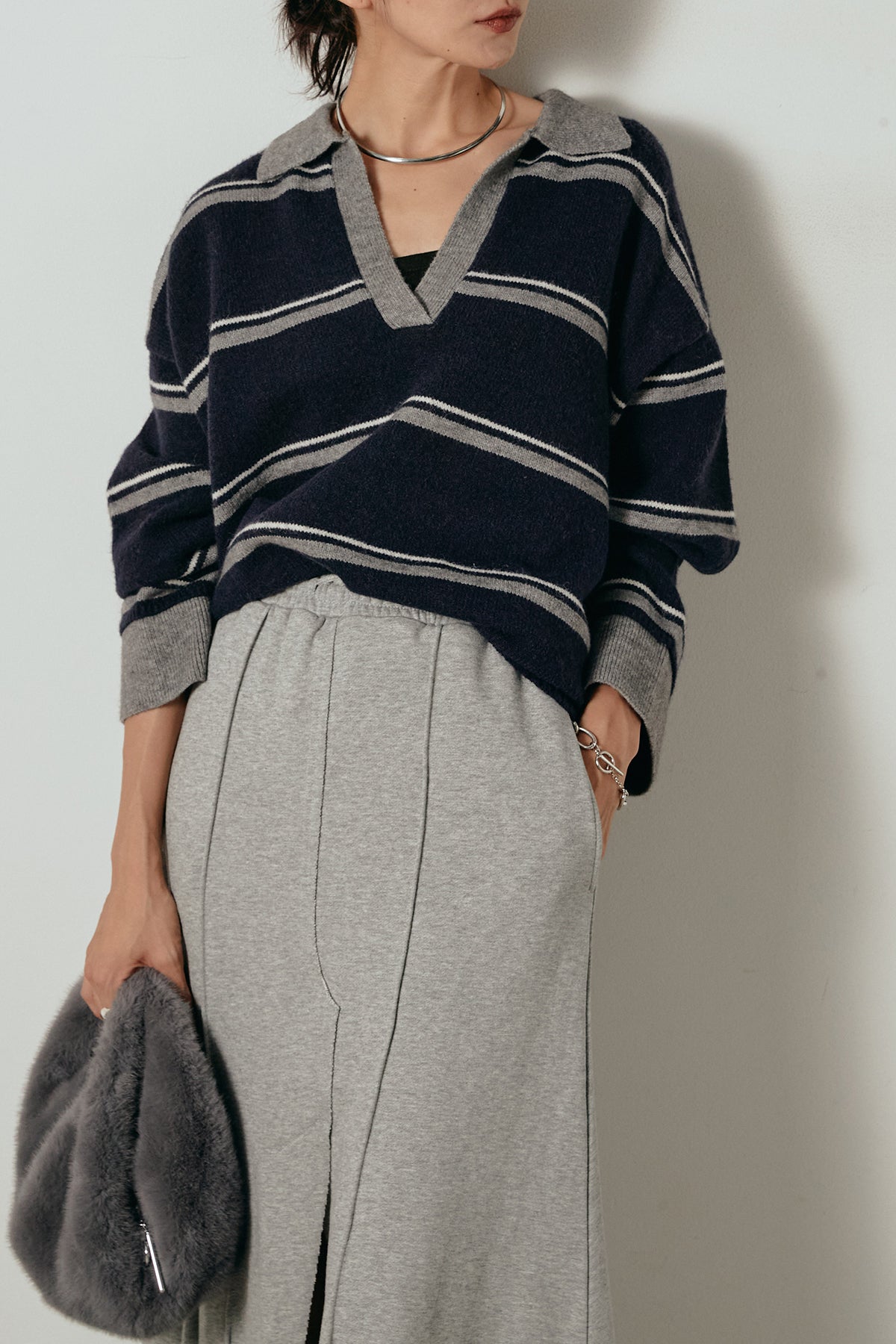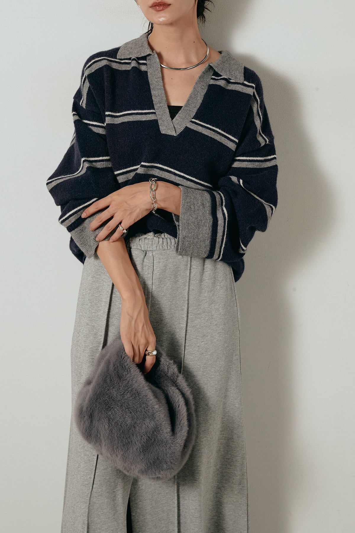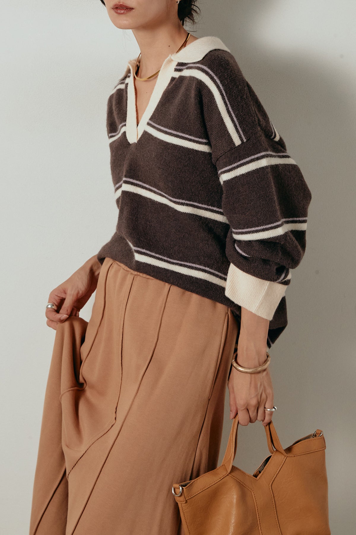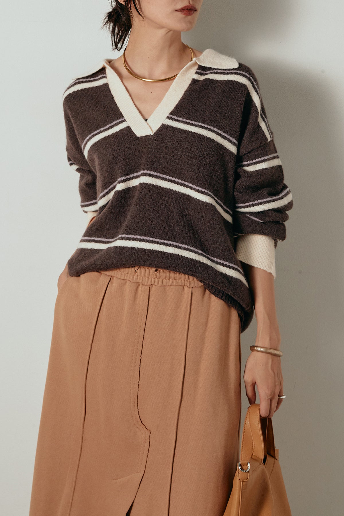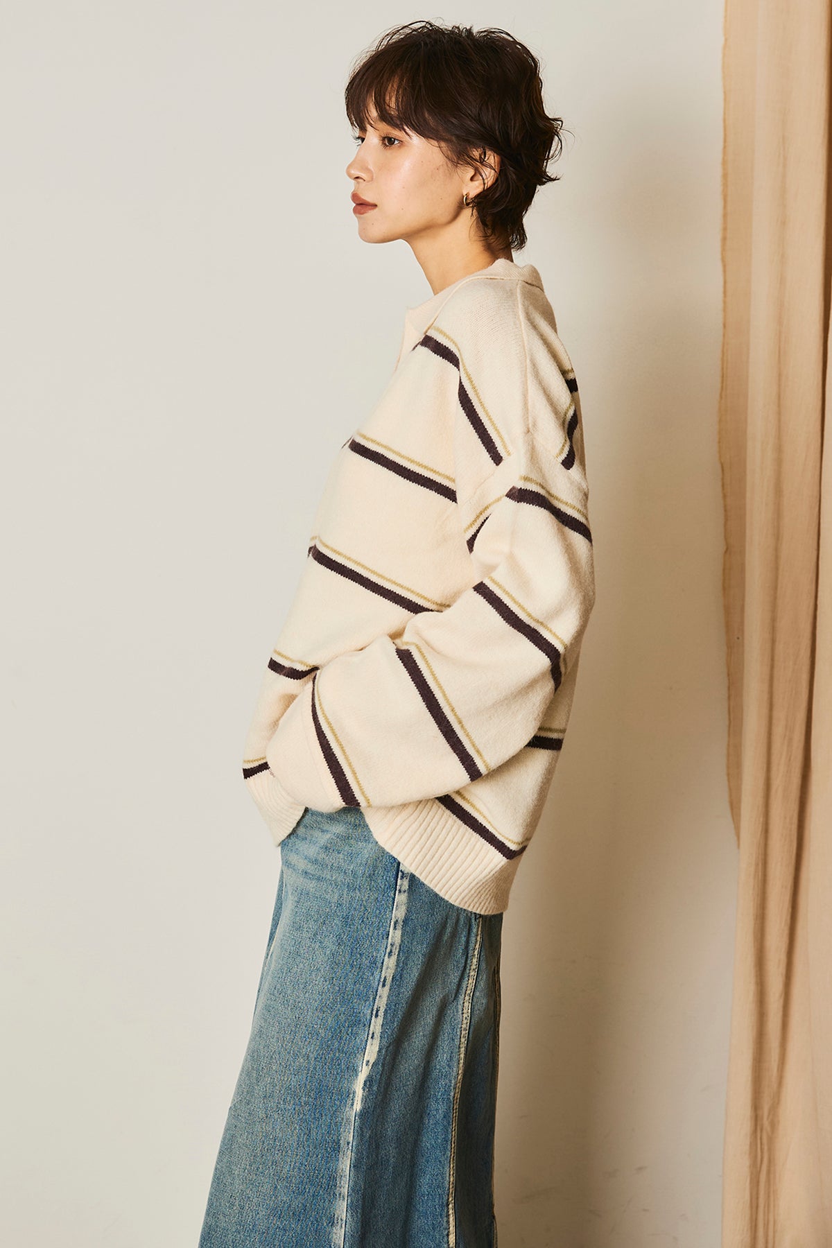 ふんわり柔らかなアルパカタッチ素材を使用した、ボーダー柄のラガーニット。 ほどよい厚みと軽さが魅力で、リラクシーな着心地を叶えつつシーズンムードを高めてくれます。 ラガーシャツ風の襟デザインがカジュアルなアクセントになり、存在感のあるボーダー柄で一枚着としてはもちろん、アウターのインナーにも映える仕上がり。 デニムやチノパンとのスタイリングでラフに、スカート合わせで抜け感のある着こなしにもおすすめです。