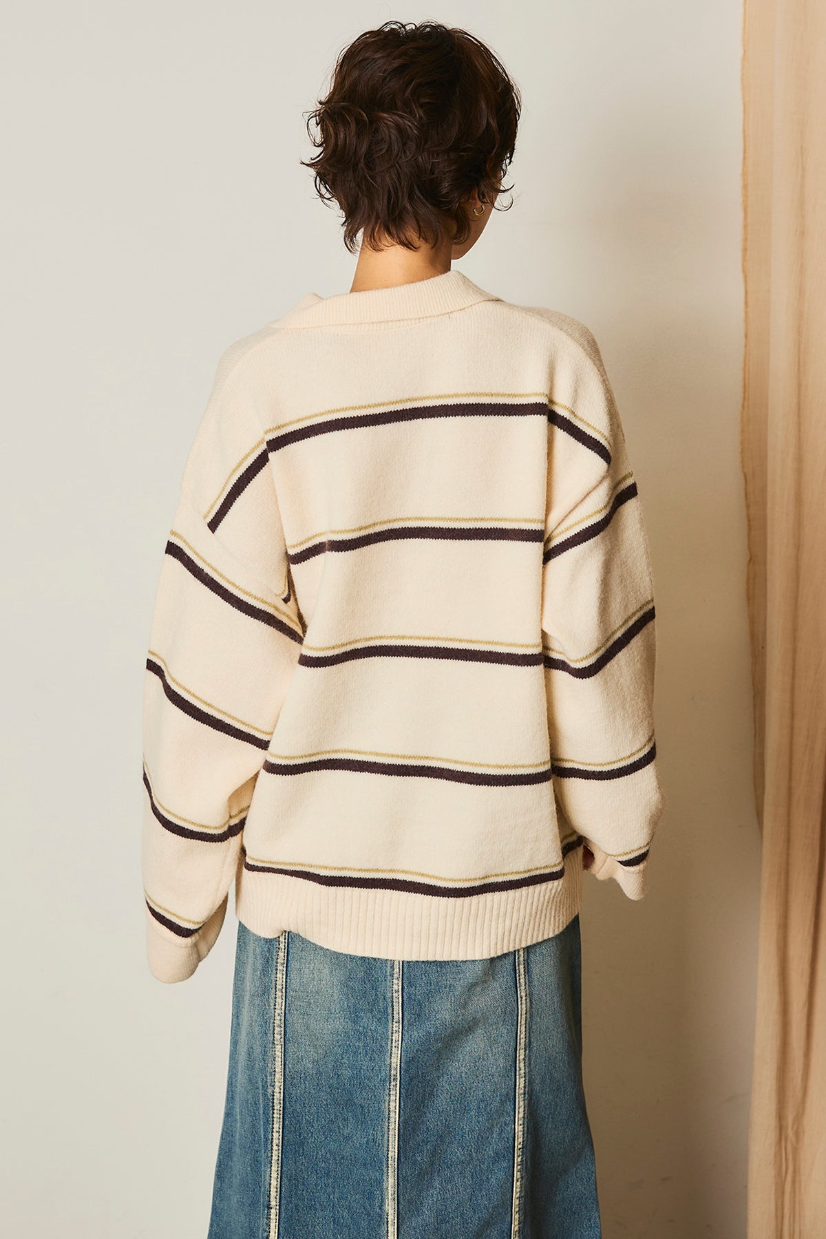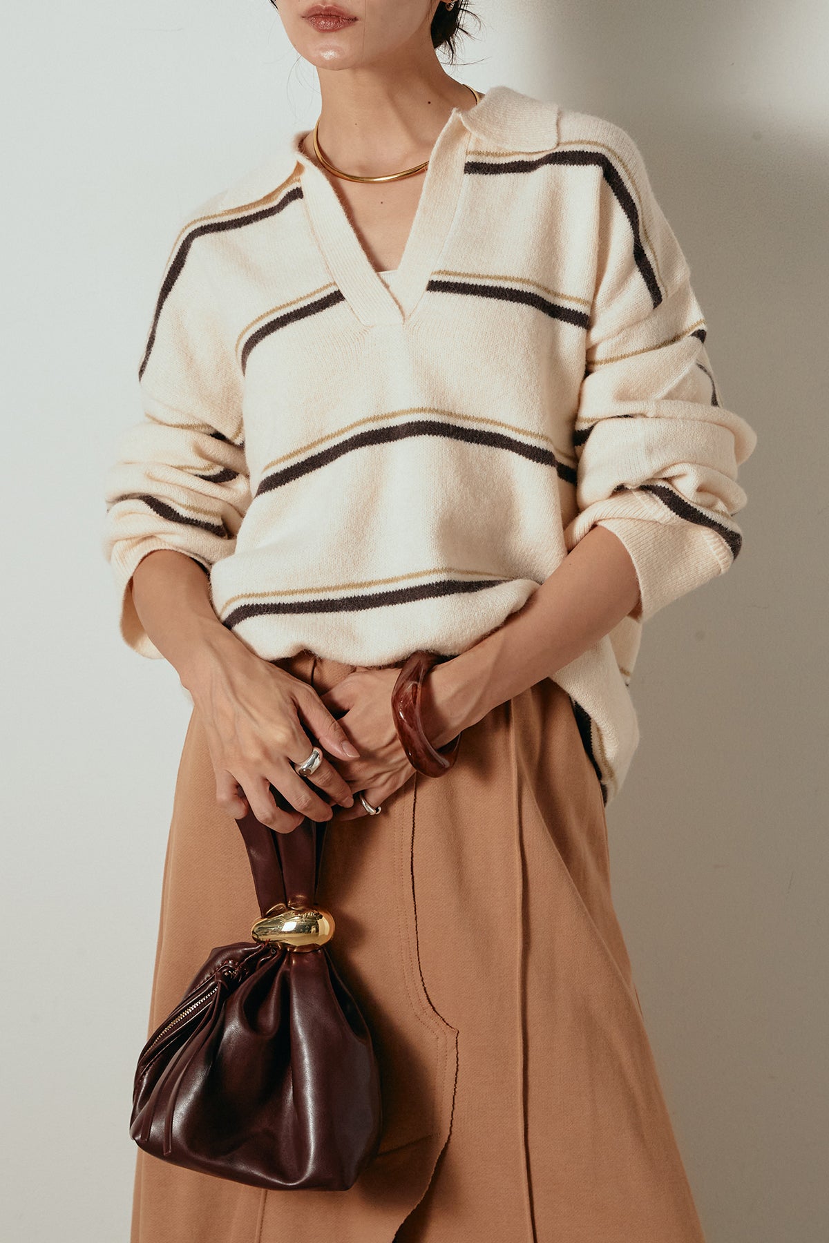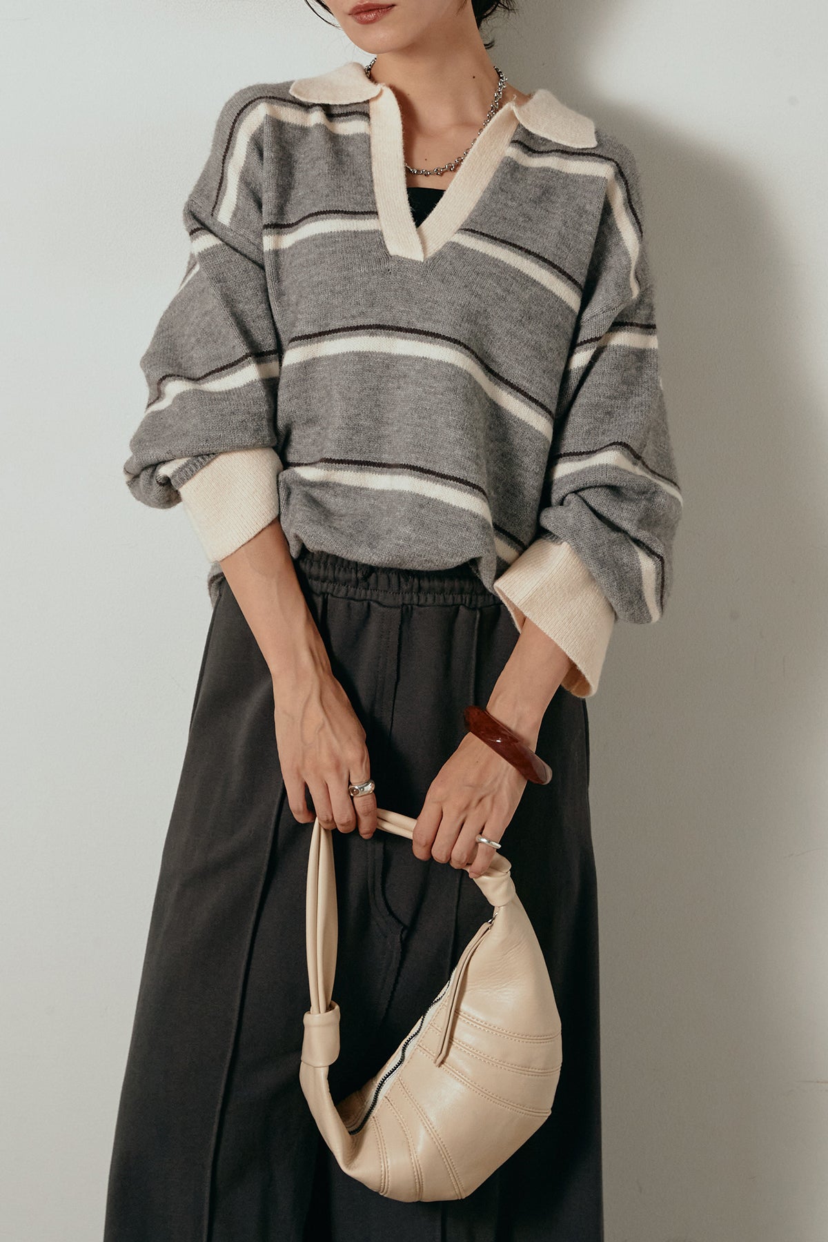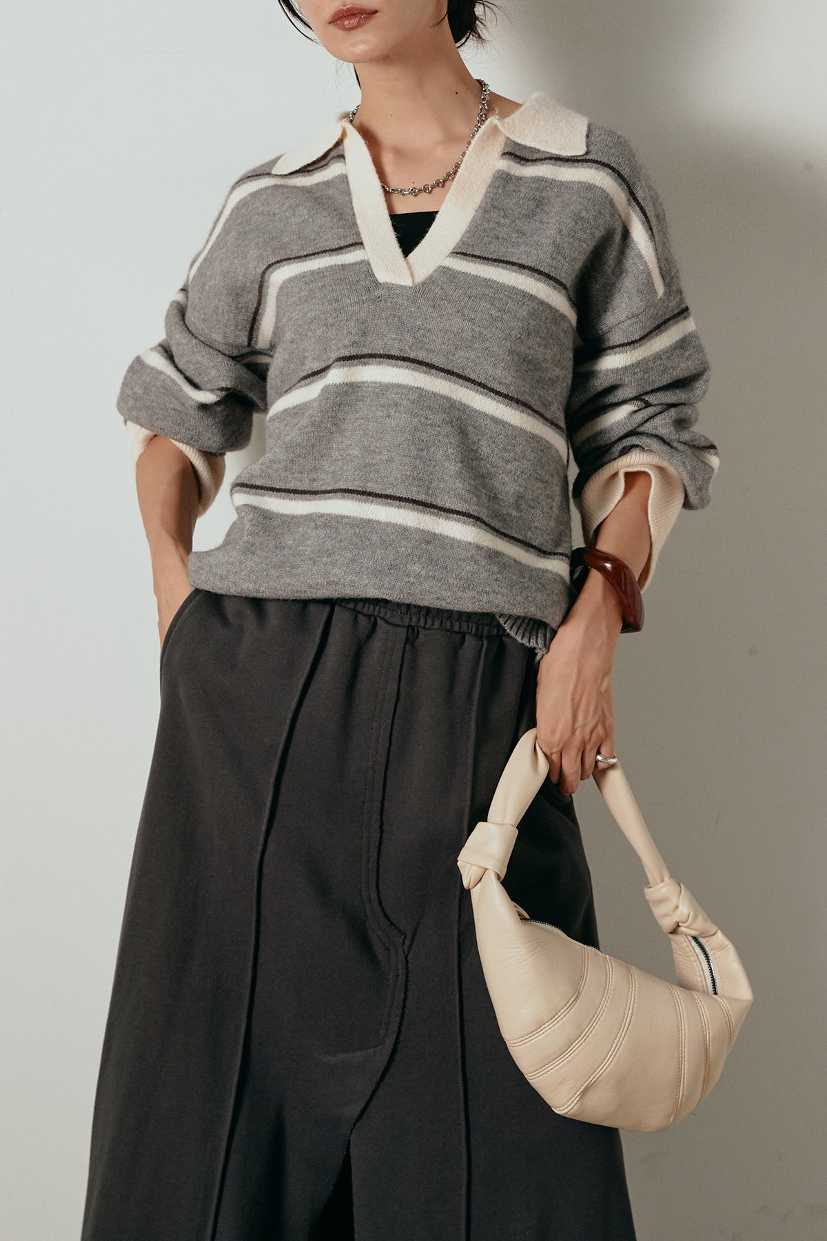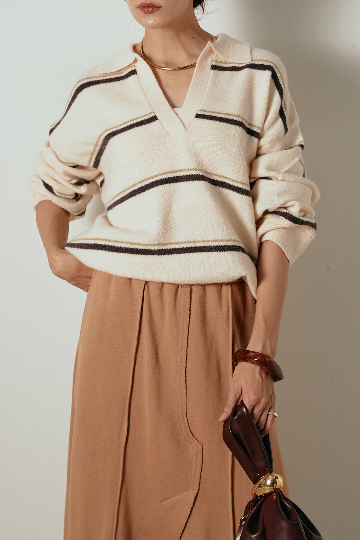 ふんわり柔らかなアルパカタッチ素材を使用した、ボーダー柄のラガーニット。 ほどよい厚みと軽さが魅力で、リラクシーな着心地を叶えつつシーズンムードを高めてくれます。 ラガーシャツ風の襟デザインがカジュアルなアクセントになり、存在感のあるボーダー柄で一枚着としてはもちろん、アウターのインナーにも映える仕上がり。 デニムやチノパンとのスタイリングでラフに、スカート合わせで抜け感のある着こなしにもおすすめです。
