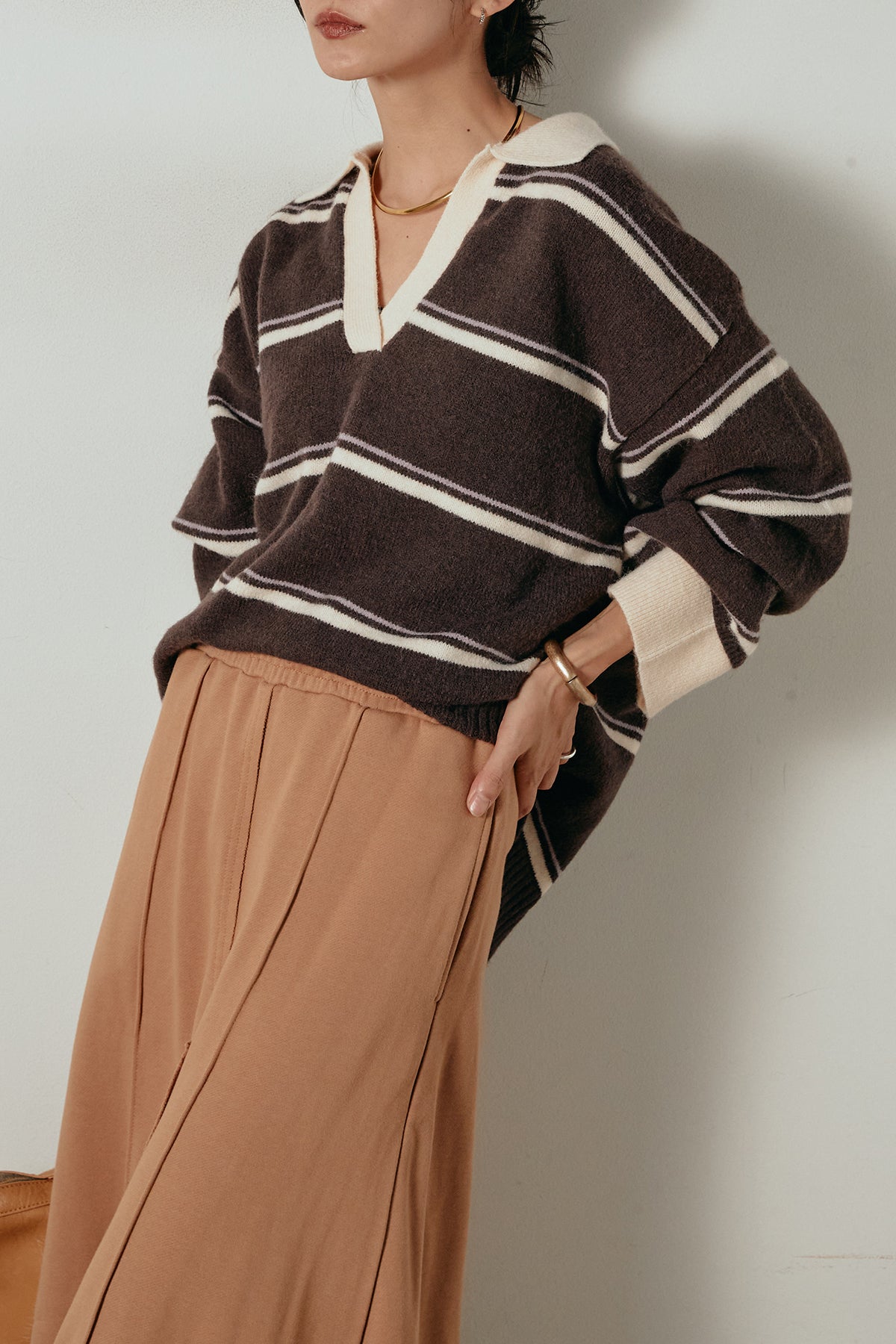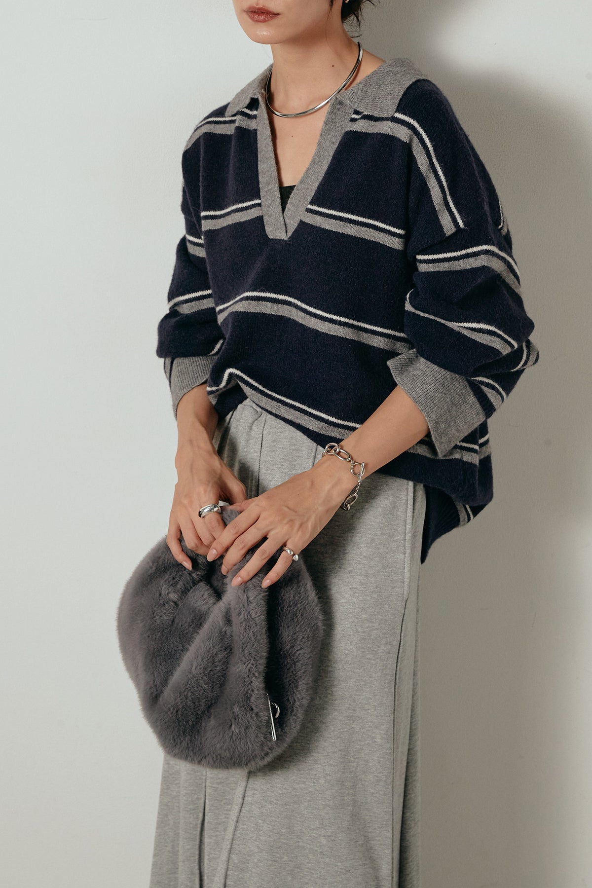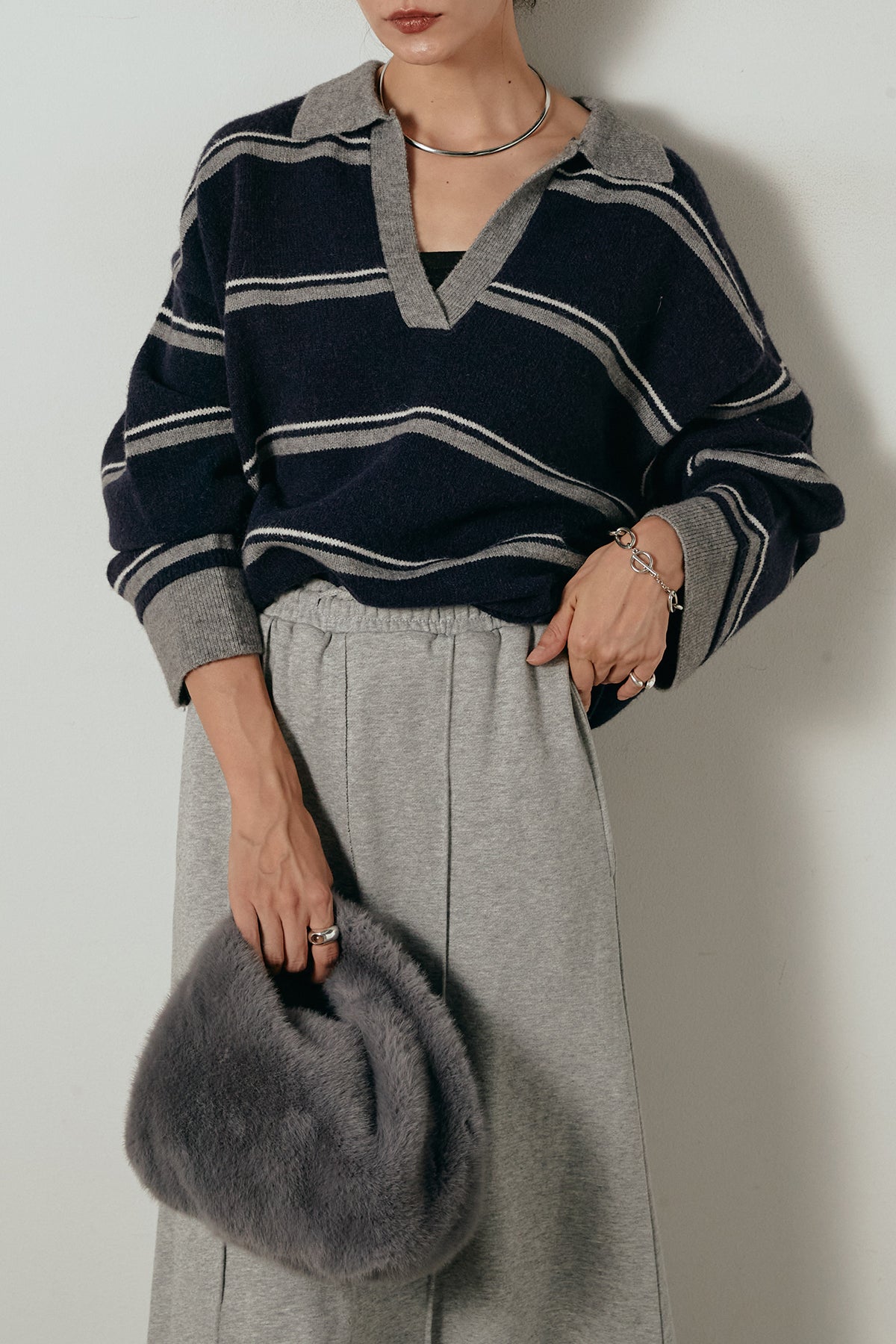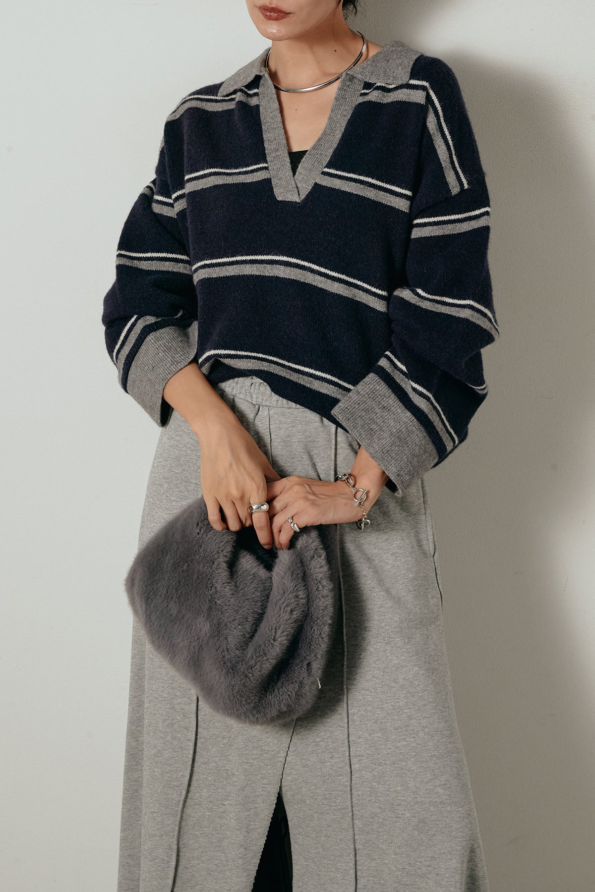 ふんわり柔らかなアルパカタッチ素材を使用した、ボーダー柄のラガーニット。 ほどよい厚みと軽さが魅力で、リラクシーな着心地を叶えつつシーズンムードを高めてくれます。 ラガーシャツ風の襟デザインがカジュアルなアクセントになり、存在感のあるボーダー柄で一枚着としてはもちろん、アウターのインナーにも映える仕上がり。 デニムやチノパンとのスタイリングでラフに、スカート合わせで抜け感のある着こなしにもおすすめです。