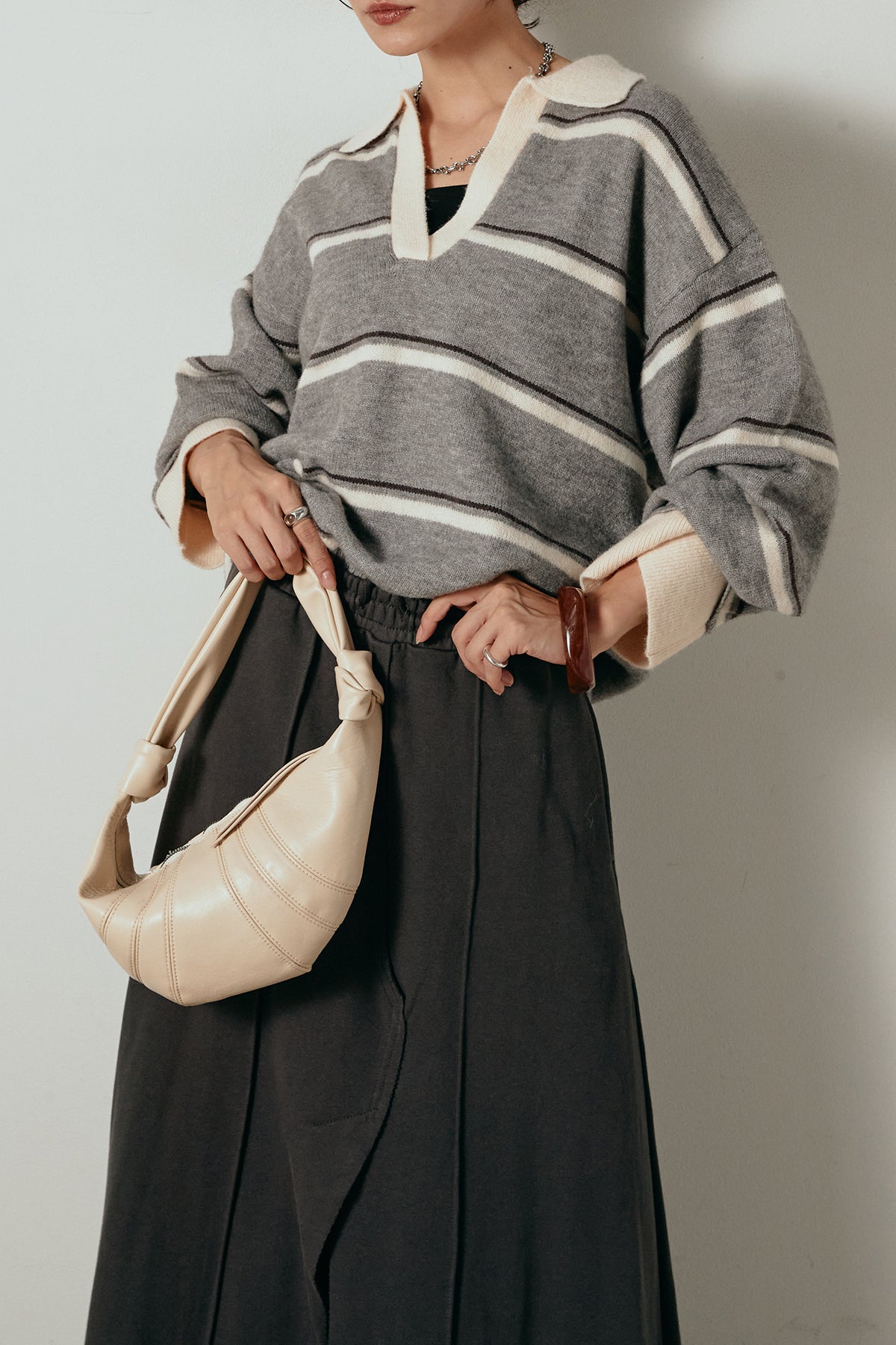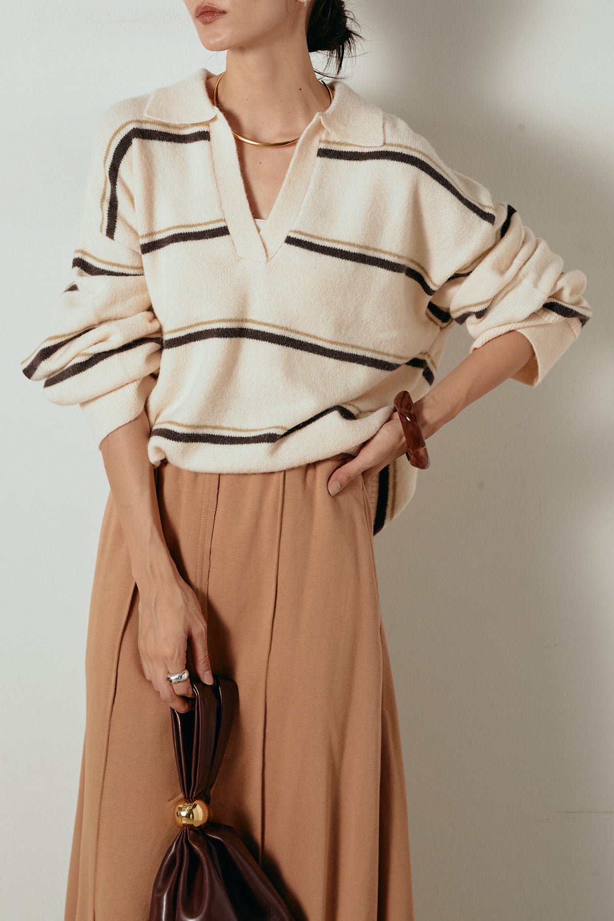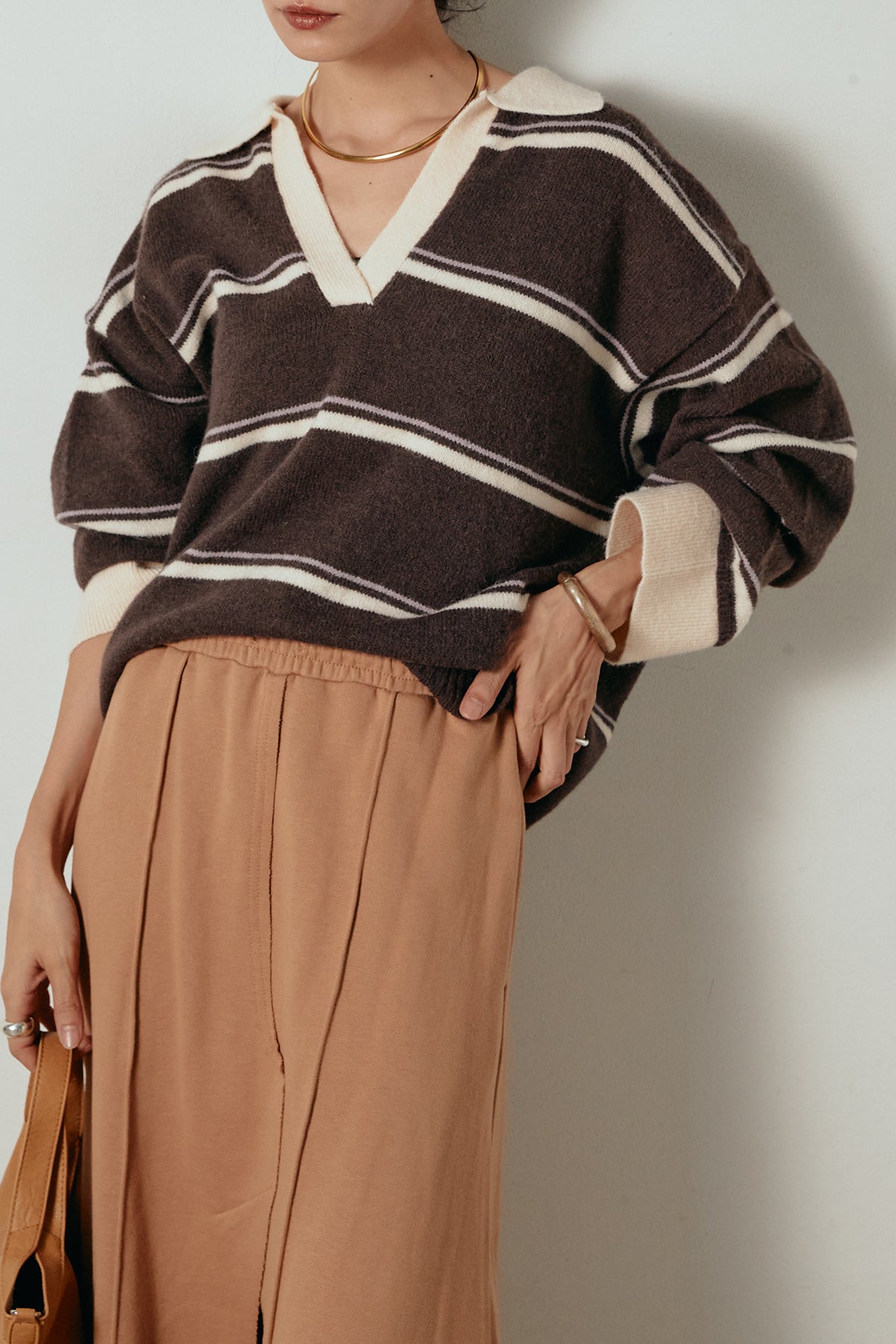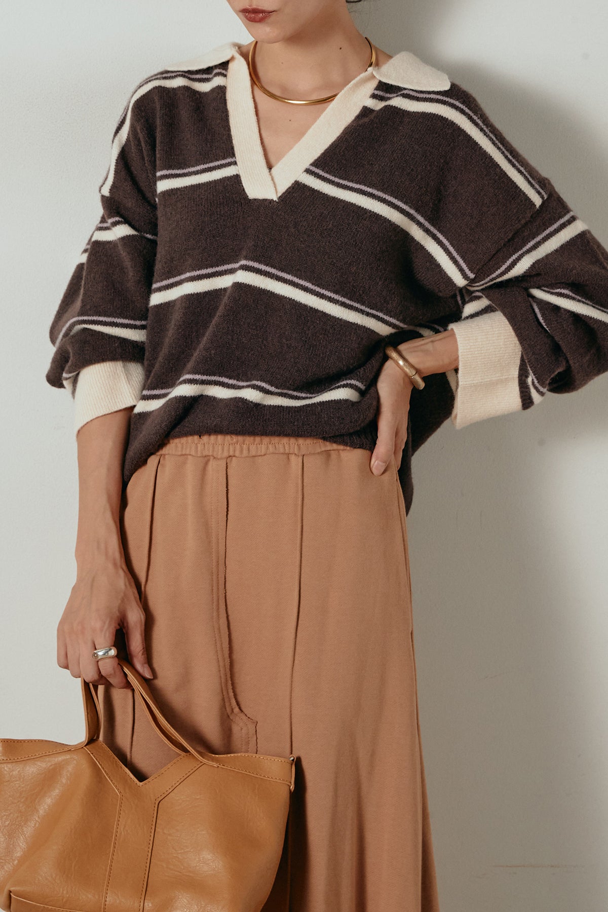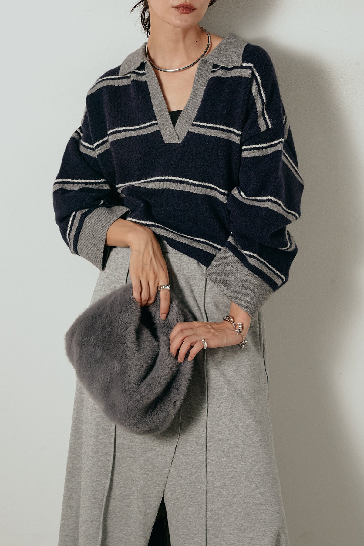 ふんわり柔らかなアルパカタッチ素材を使用した、ボーダー柄のラガーニット。 ほどよい厚みと軽さが魅力で、リラクシーな着心地を叶えつつシーズンムードを高めてくれます。 ラガーシャツ風の襟デザインがカジュアルなアクセントになり、存在感のあるボーダー柄で一枚着としてはもちろん、アウターのインナーにも映える仕上がり。 デニムやチノパンとのスタイリングでラフに、スカート合わせで抜け感のある着こなしにもおすすめです。