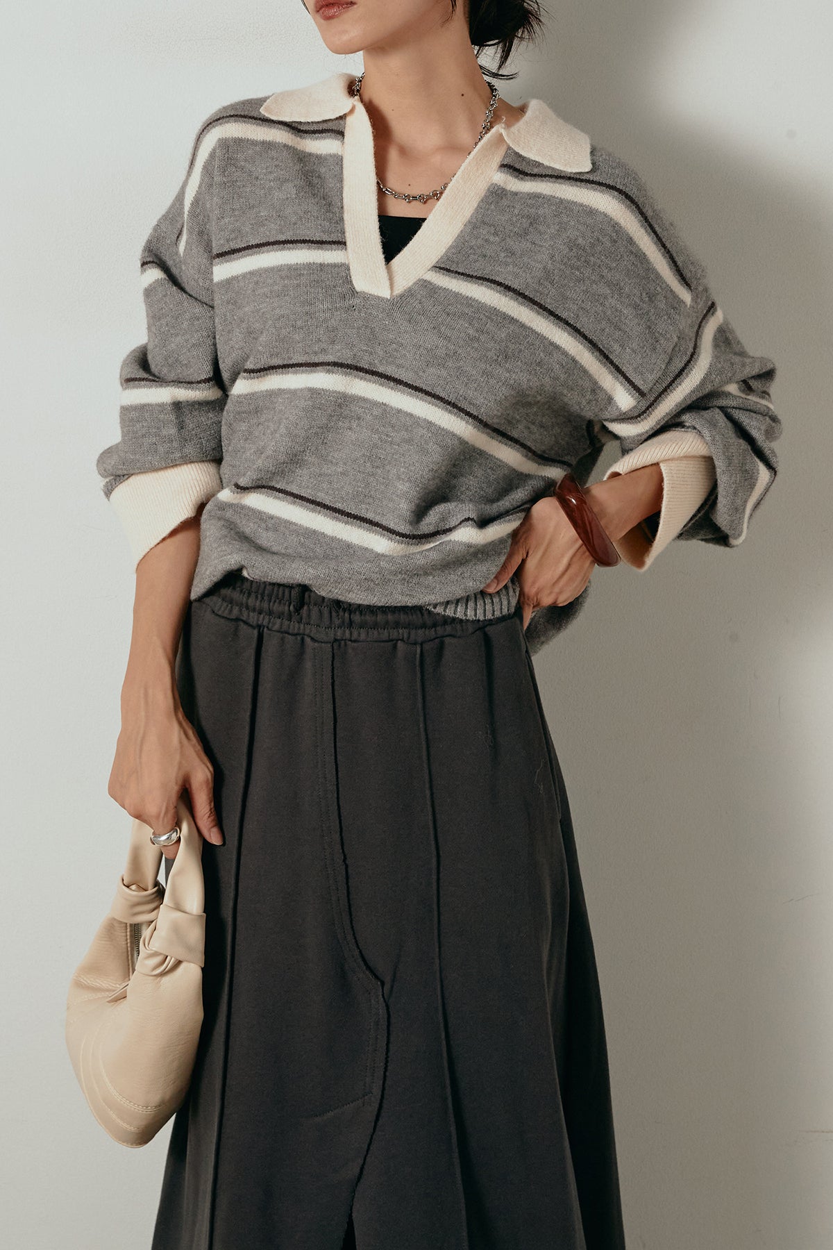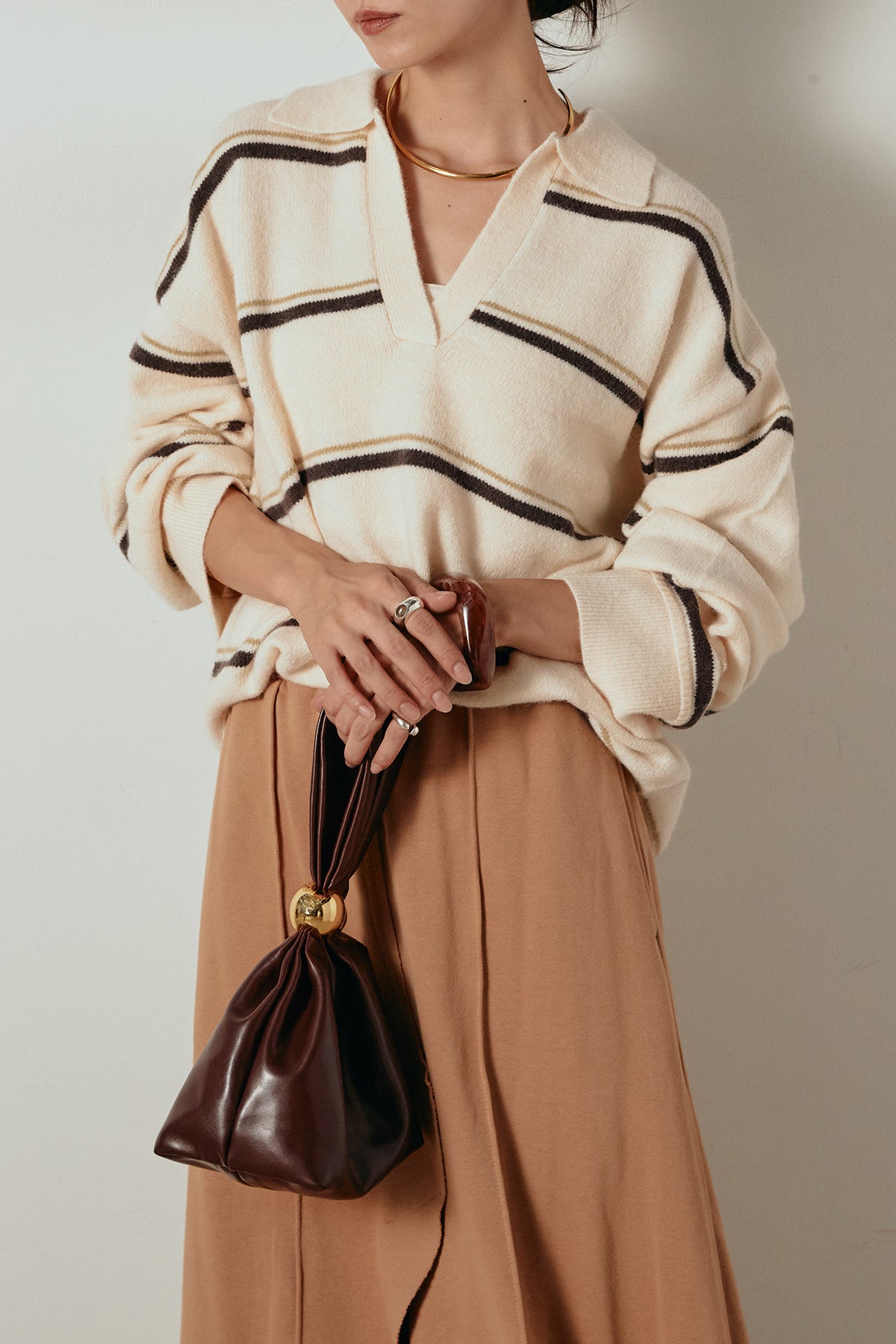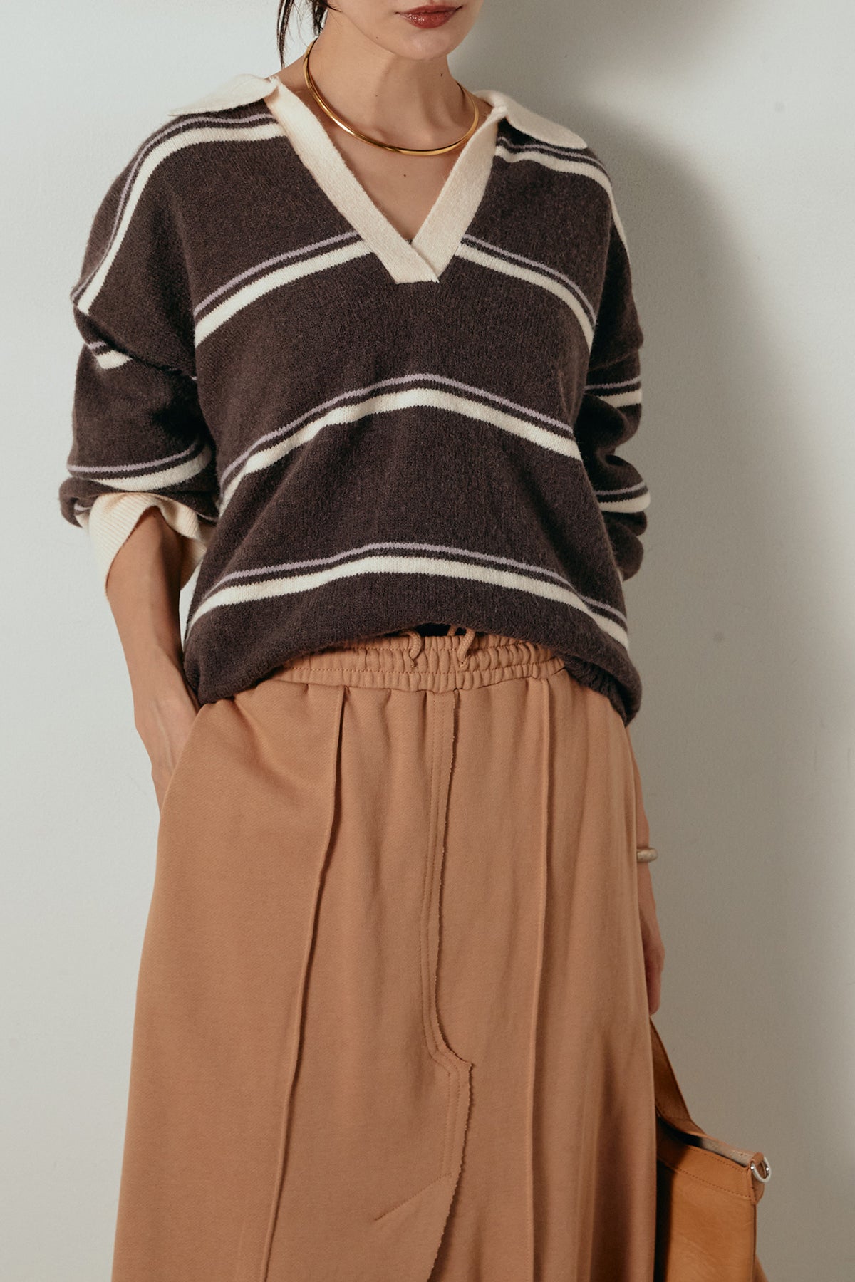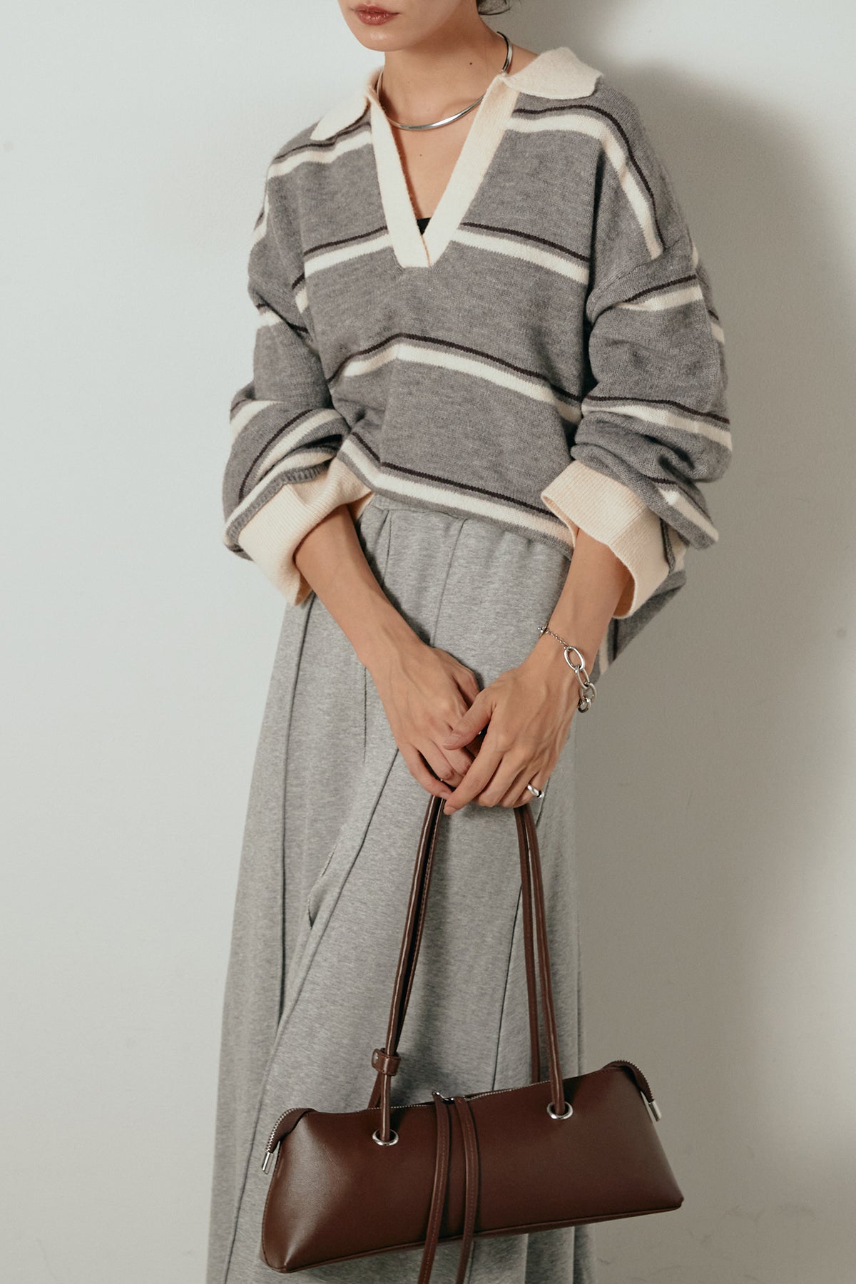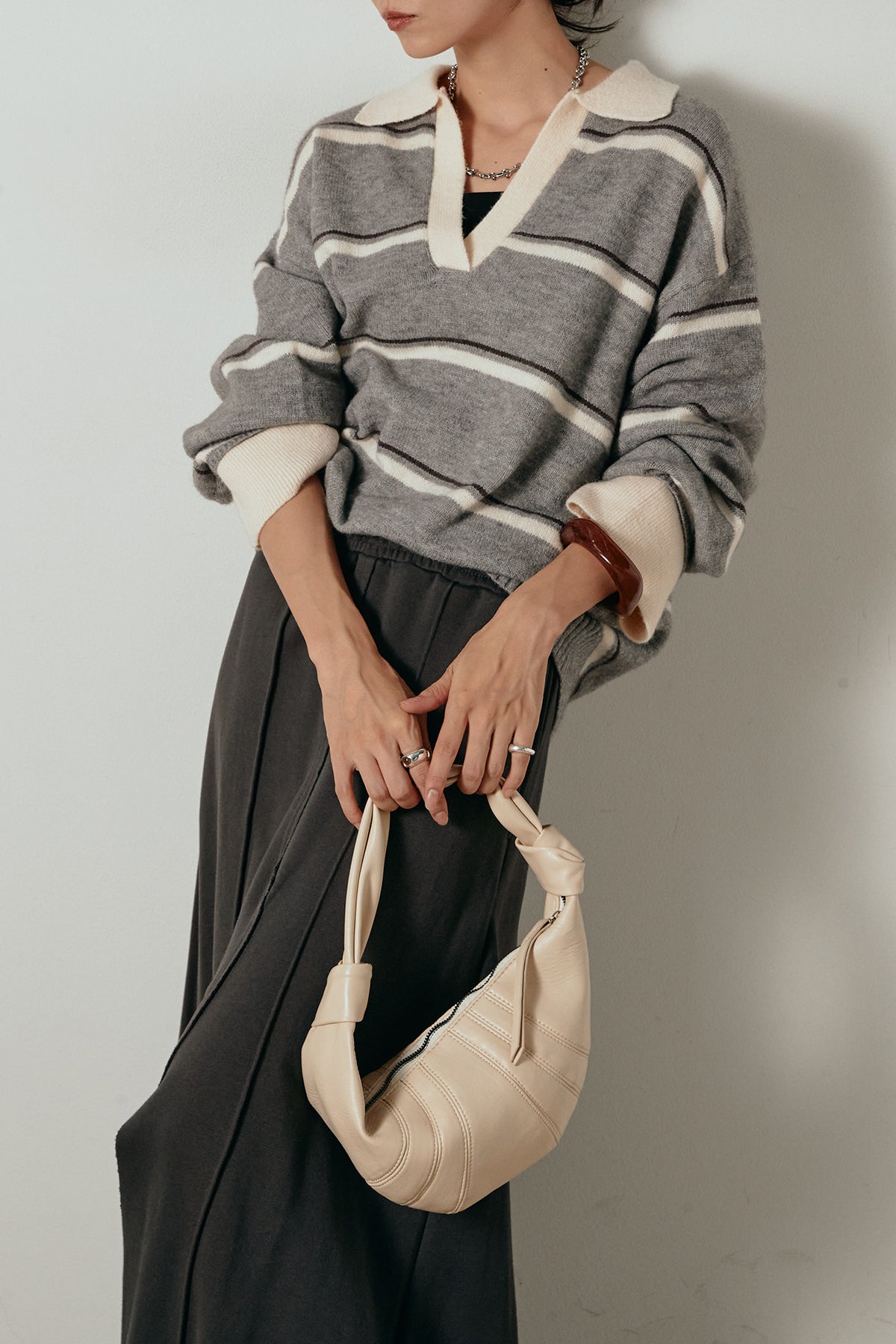 ふんわり柔らかなアルパカタッチ素材を使用した、ボーダー柄のラガーニット。 ほどよい厚みと軽さが魅力で、リラクシーな着心地を叶えつつシーズンムードを高めてくれます。 ラガーシャツ風の襟デザインがカジュアルなアクセントになり、存在感のあるボーダー柄で一枚着としてはもちろん、アウターのインナーにも映える仕上がり。 デニムやチノパンとのスタイリングでラフに、スカート合わせで抜け感のある着こなしにもおすすめです。
