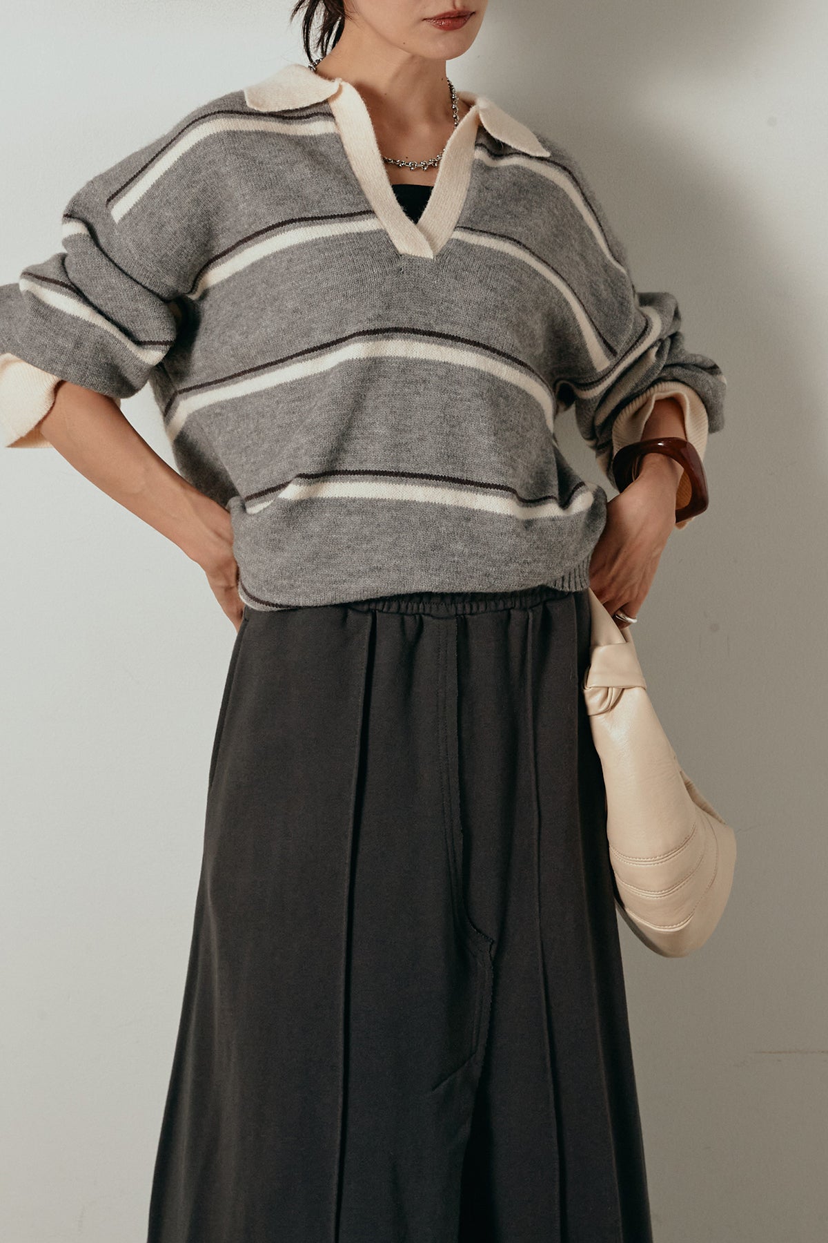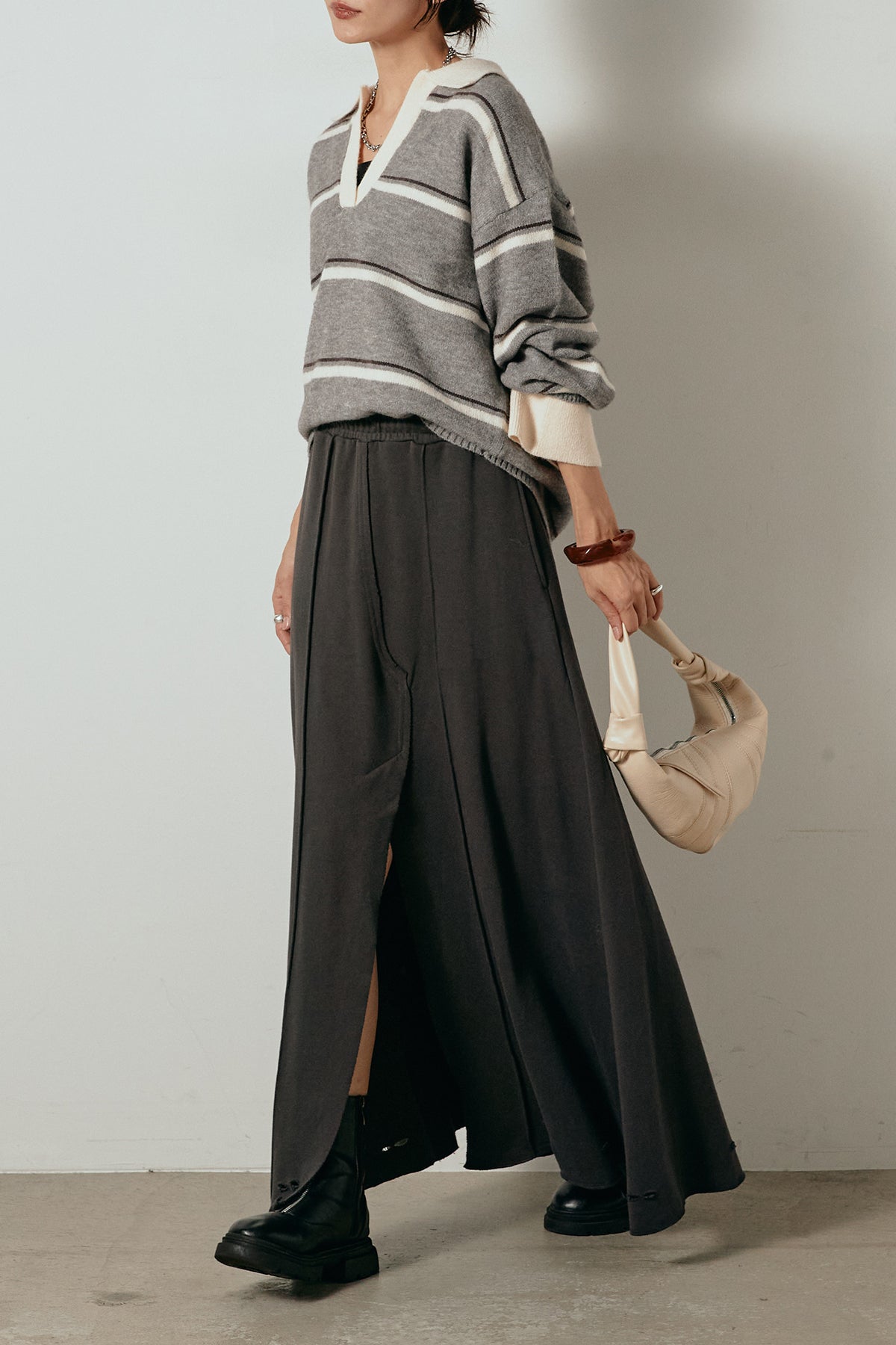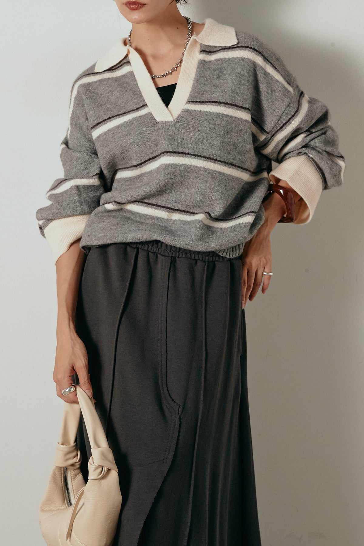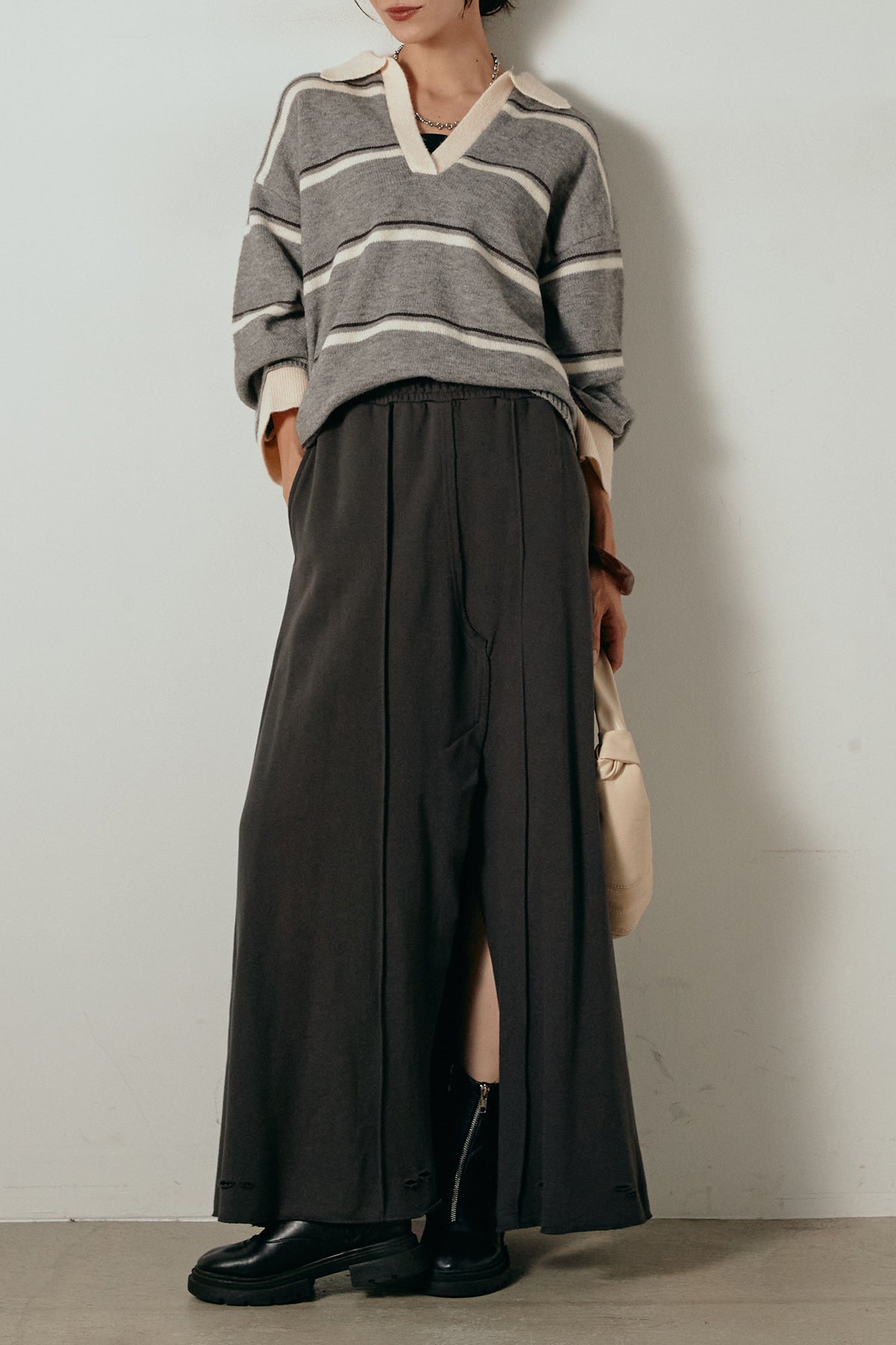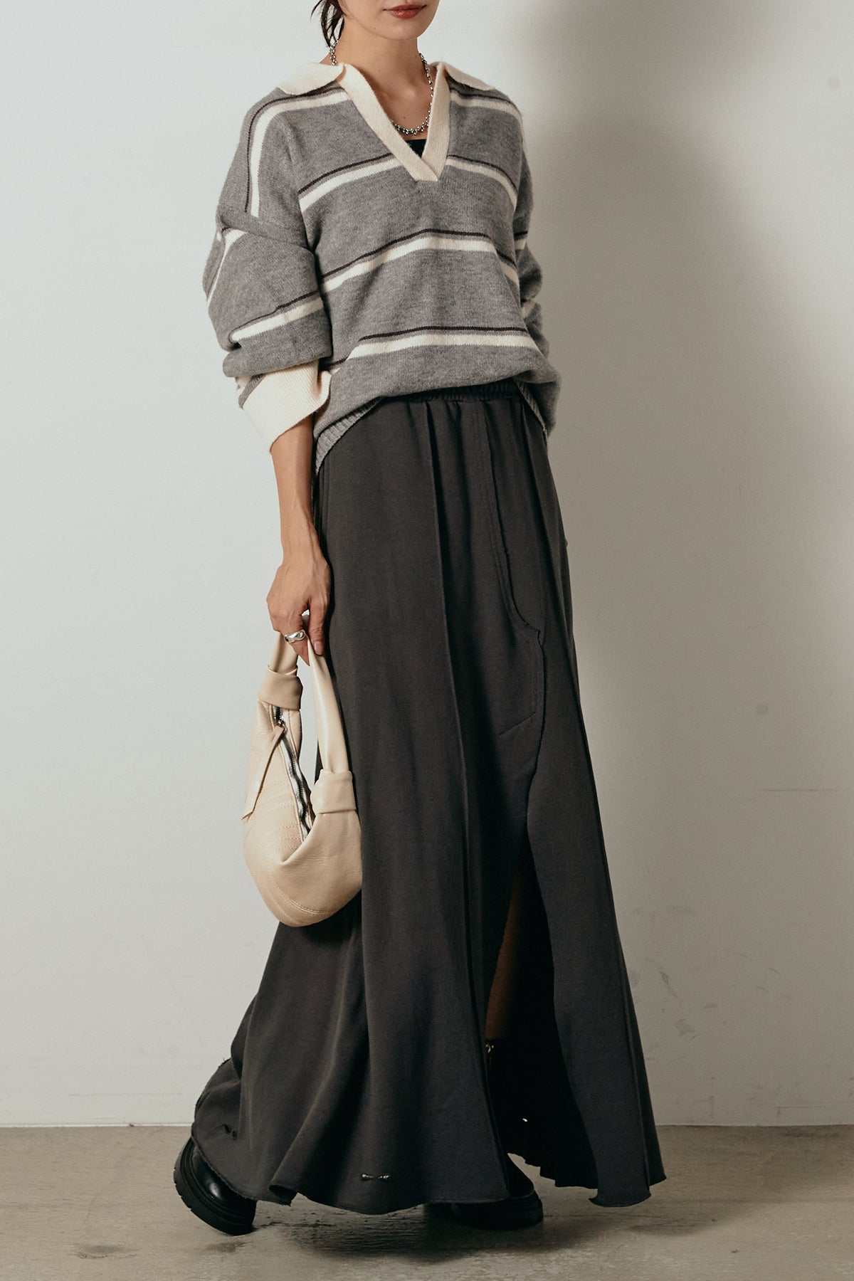 [SET]アルパカタッチボーダーラガーニット+切り替えスウェットフレアスカート(2set)