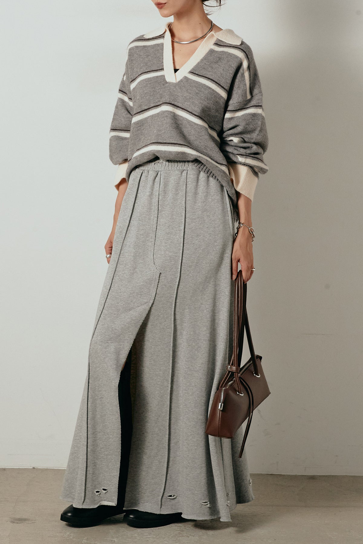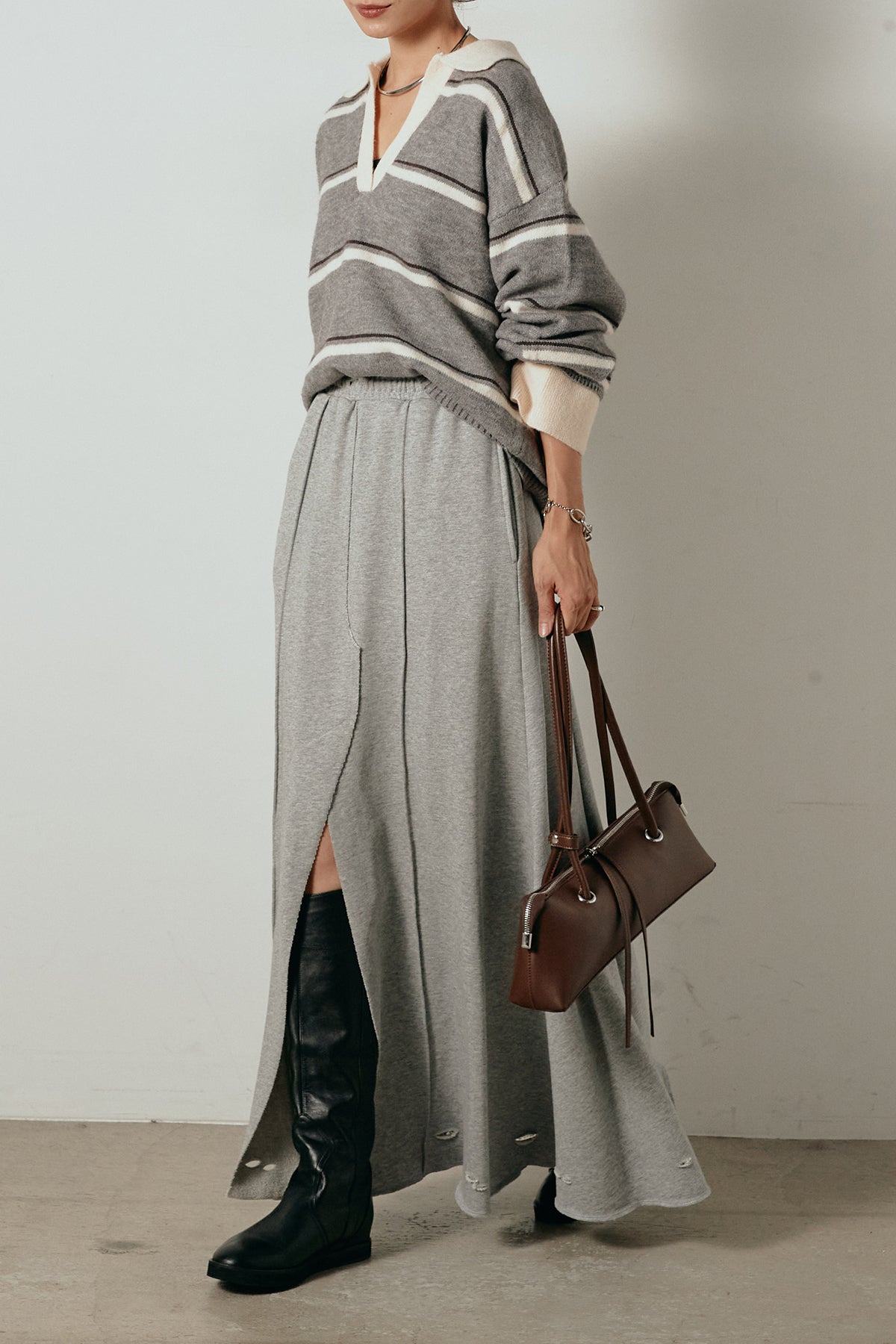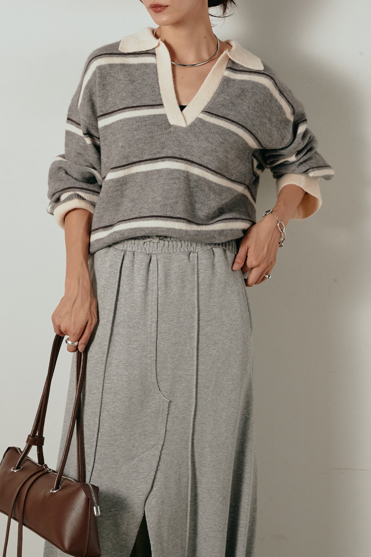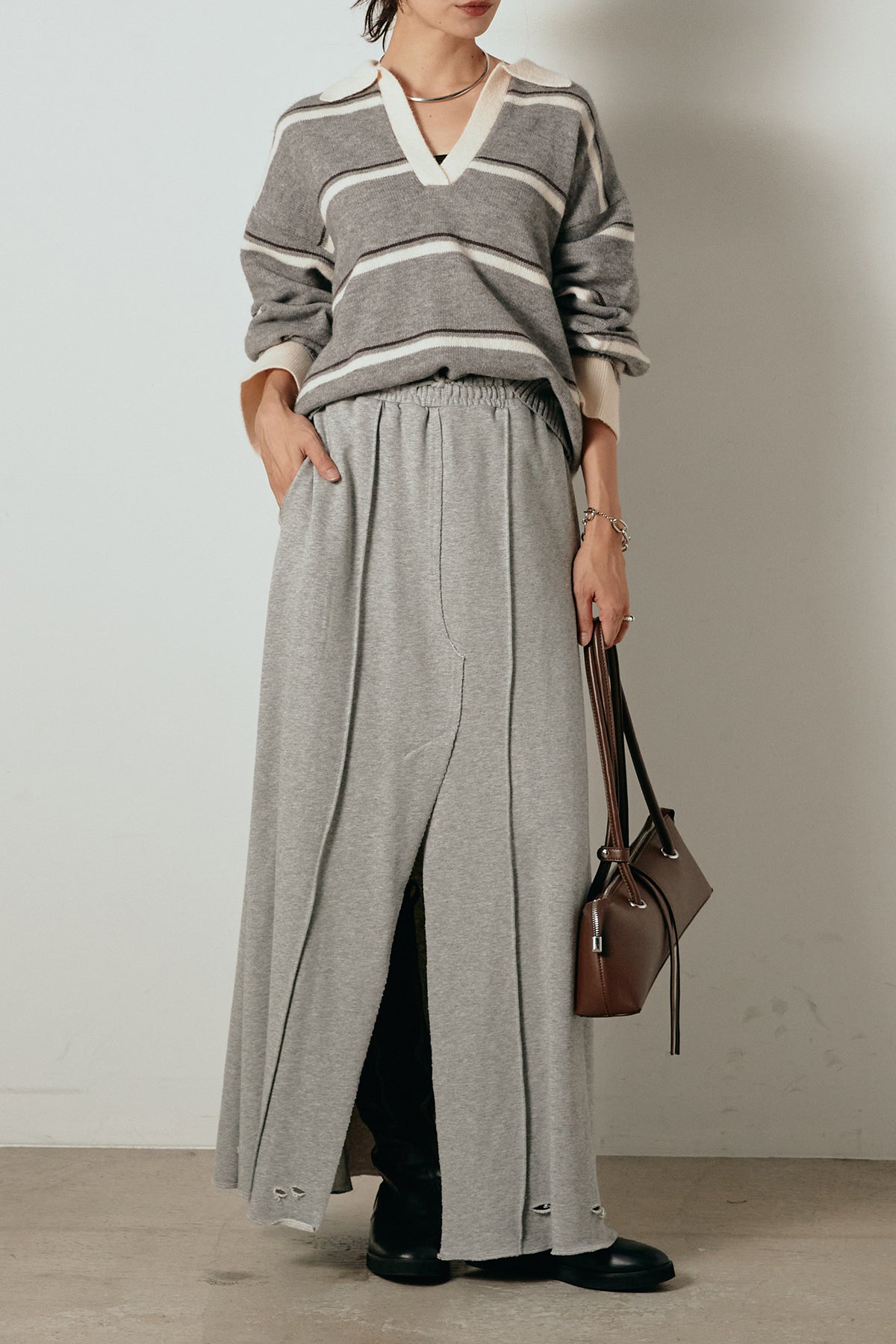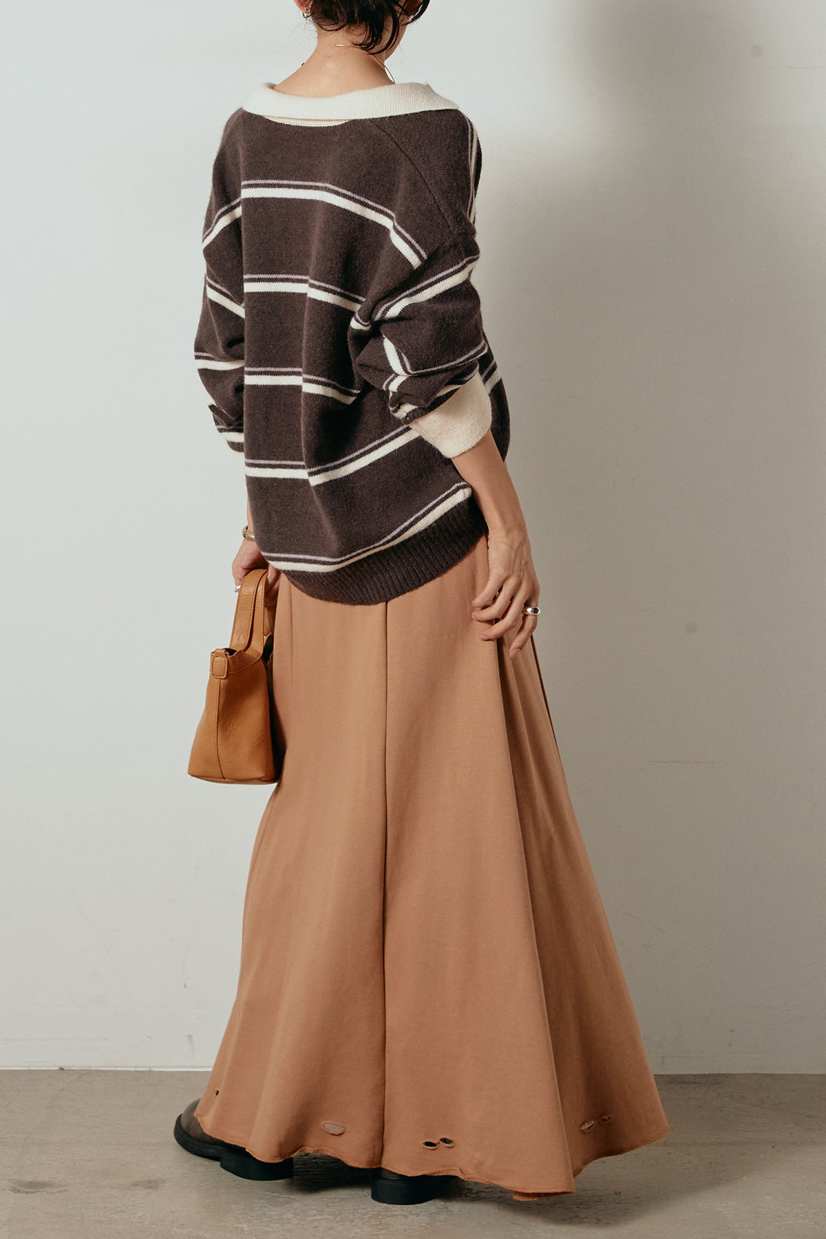 [SET]アルパカタッチボーダーラガーニット+切り替えスウェットフレアスカート(2set)