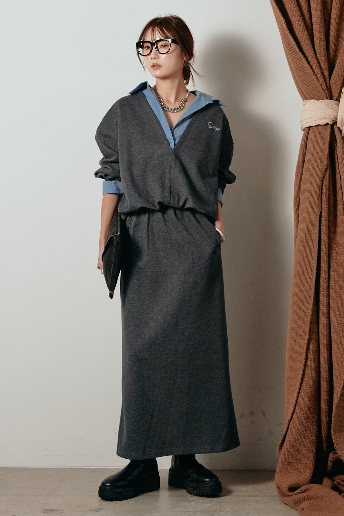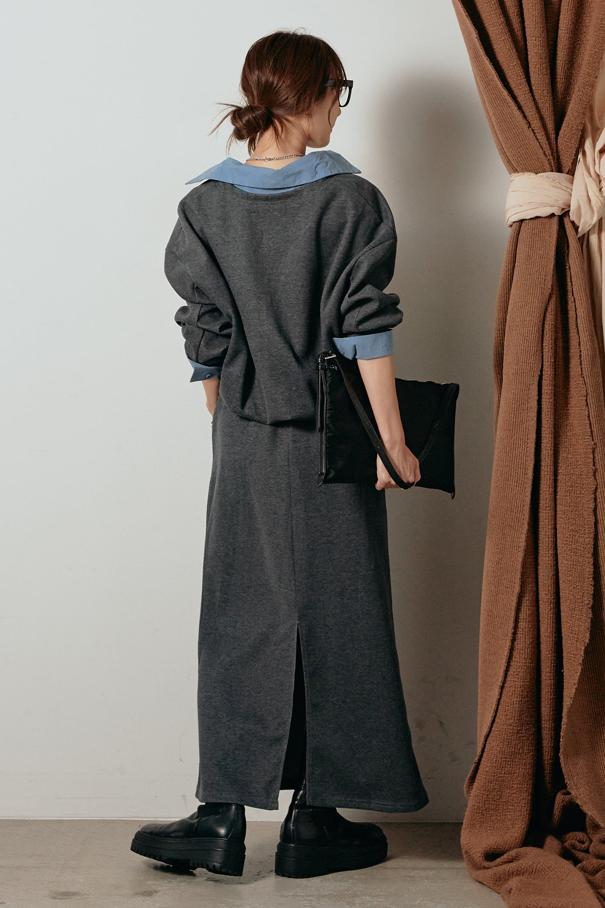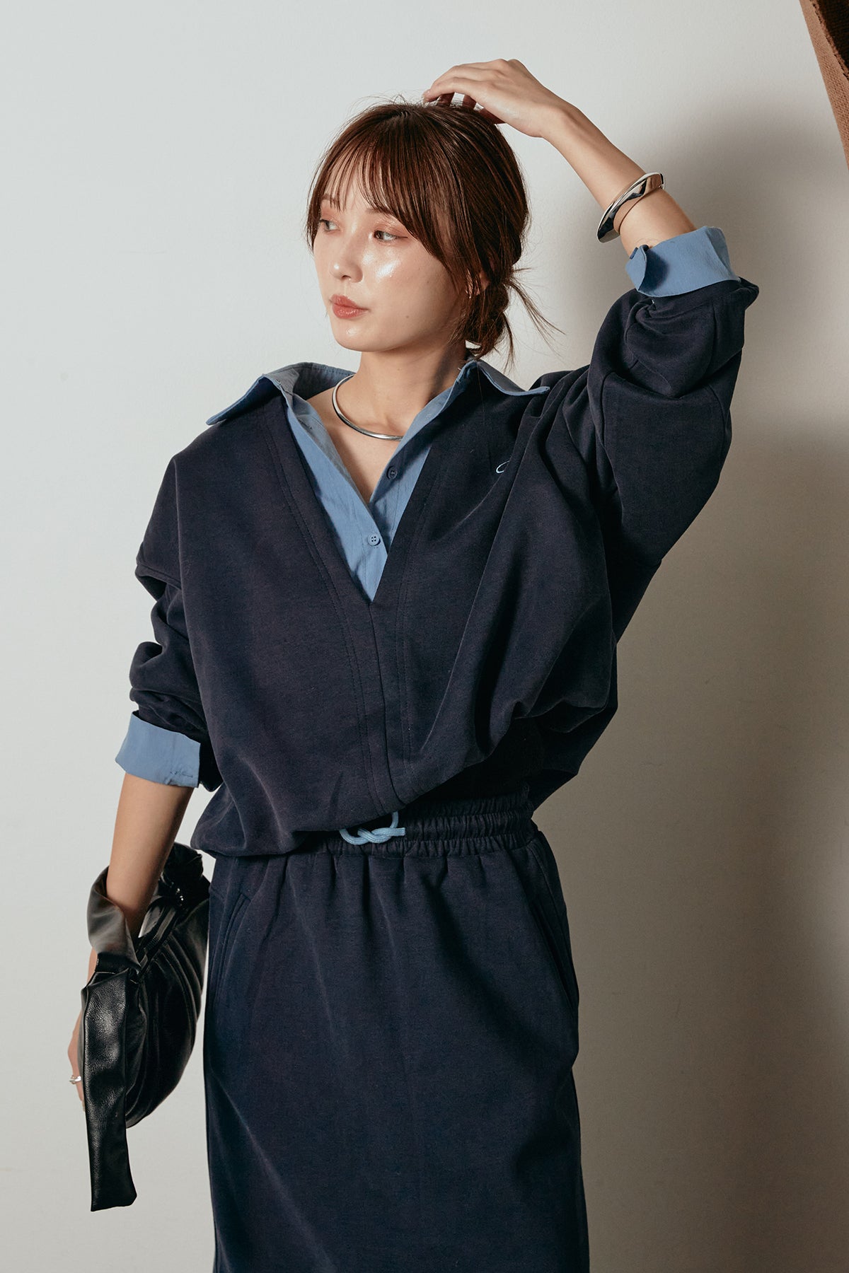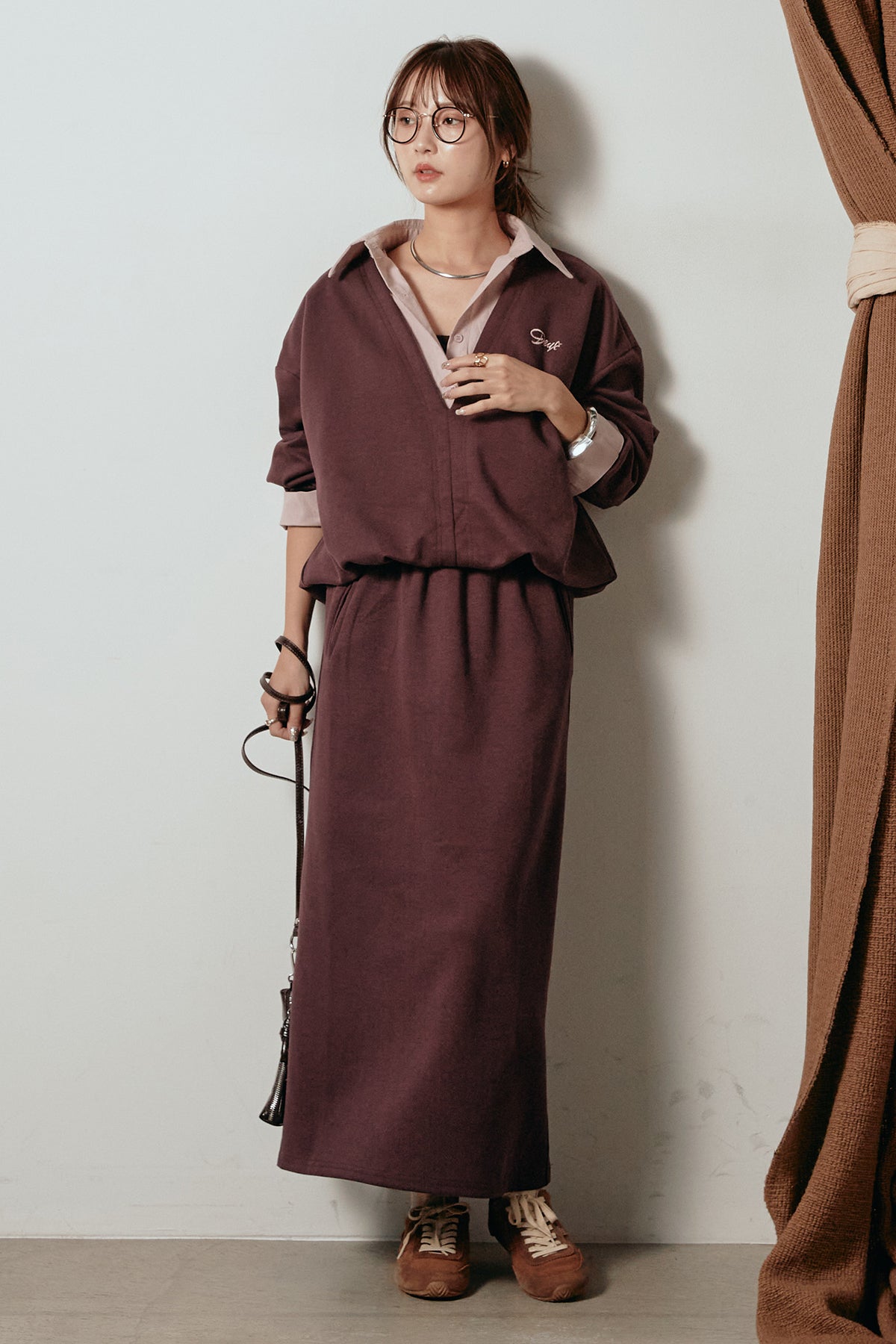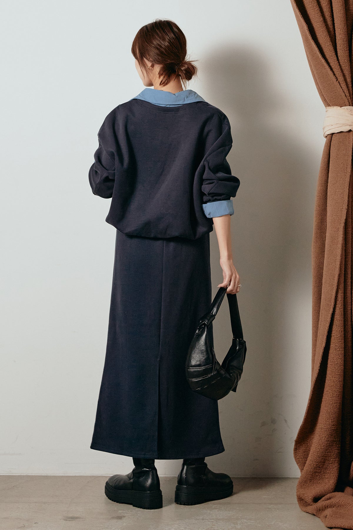 シャツを重ね着したようなドッキングデザインが目を惹くスウェットセットアップ。程よくゆとりのあるトップスと、すっきりとしたIラインスカートのバランスがこなれた印象を与えます。カジュアルなスウェット素材ながらも襟や袖のシャツディテールで品よく仕上げ、1枚で完成度の高いスタイリングが叶うアイテム。デイリーからお出かけまで幅広く活躍します。