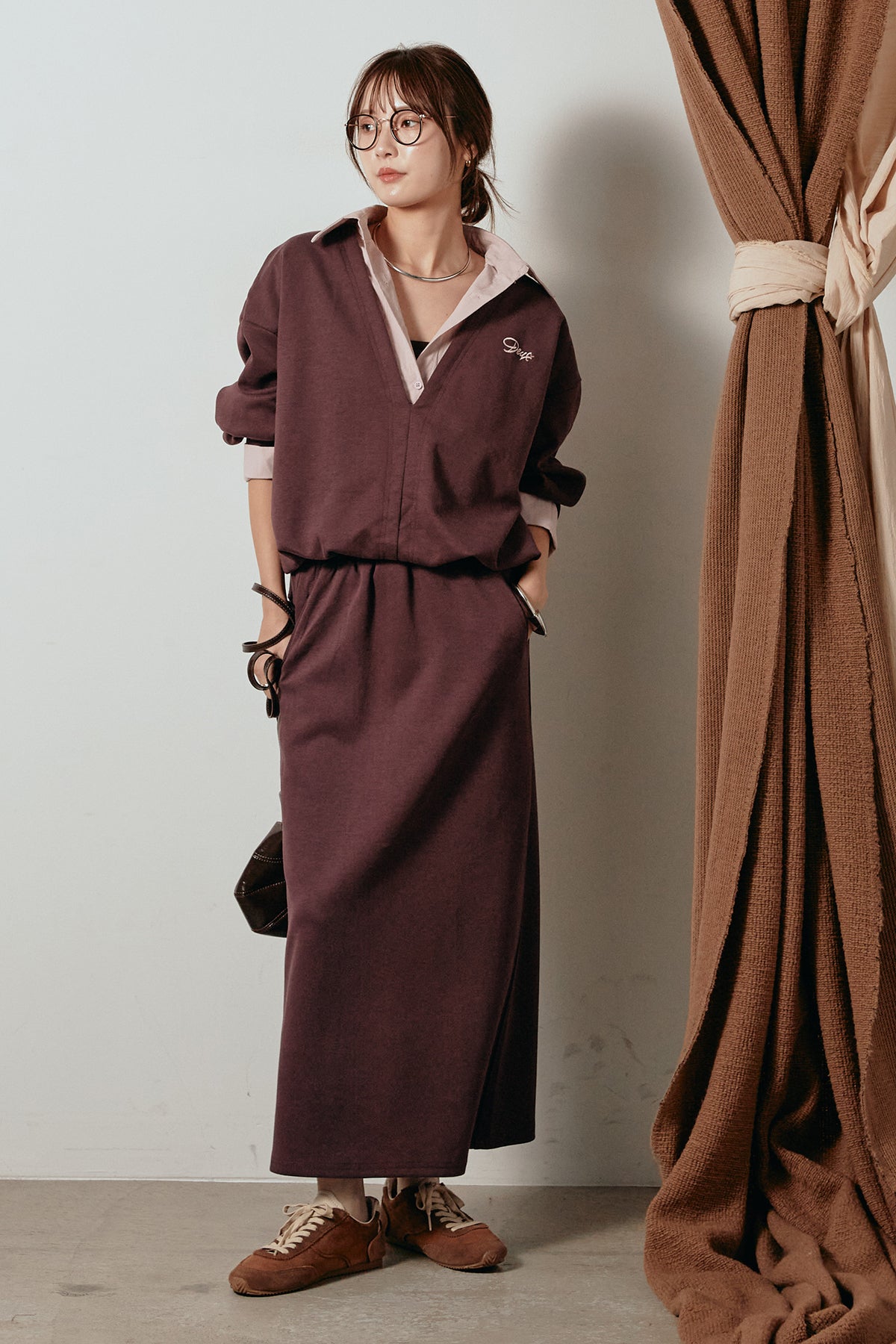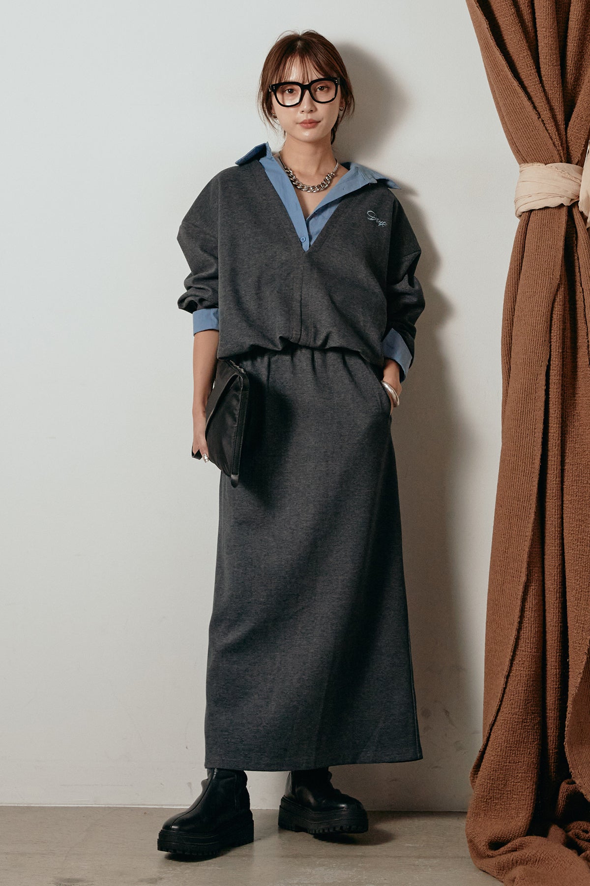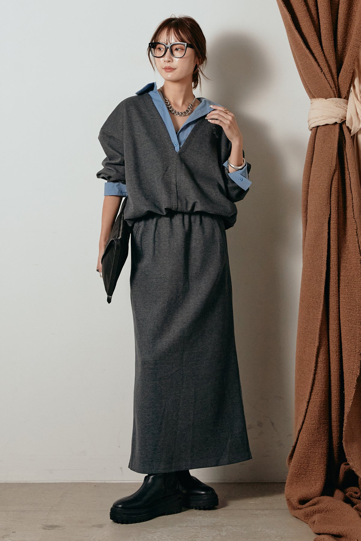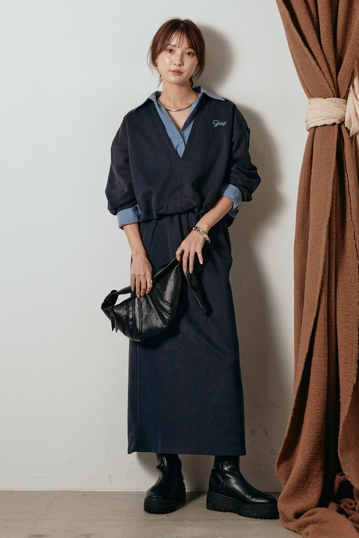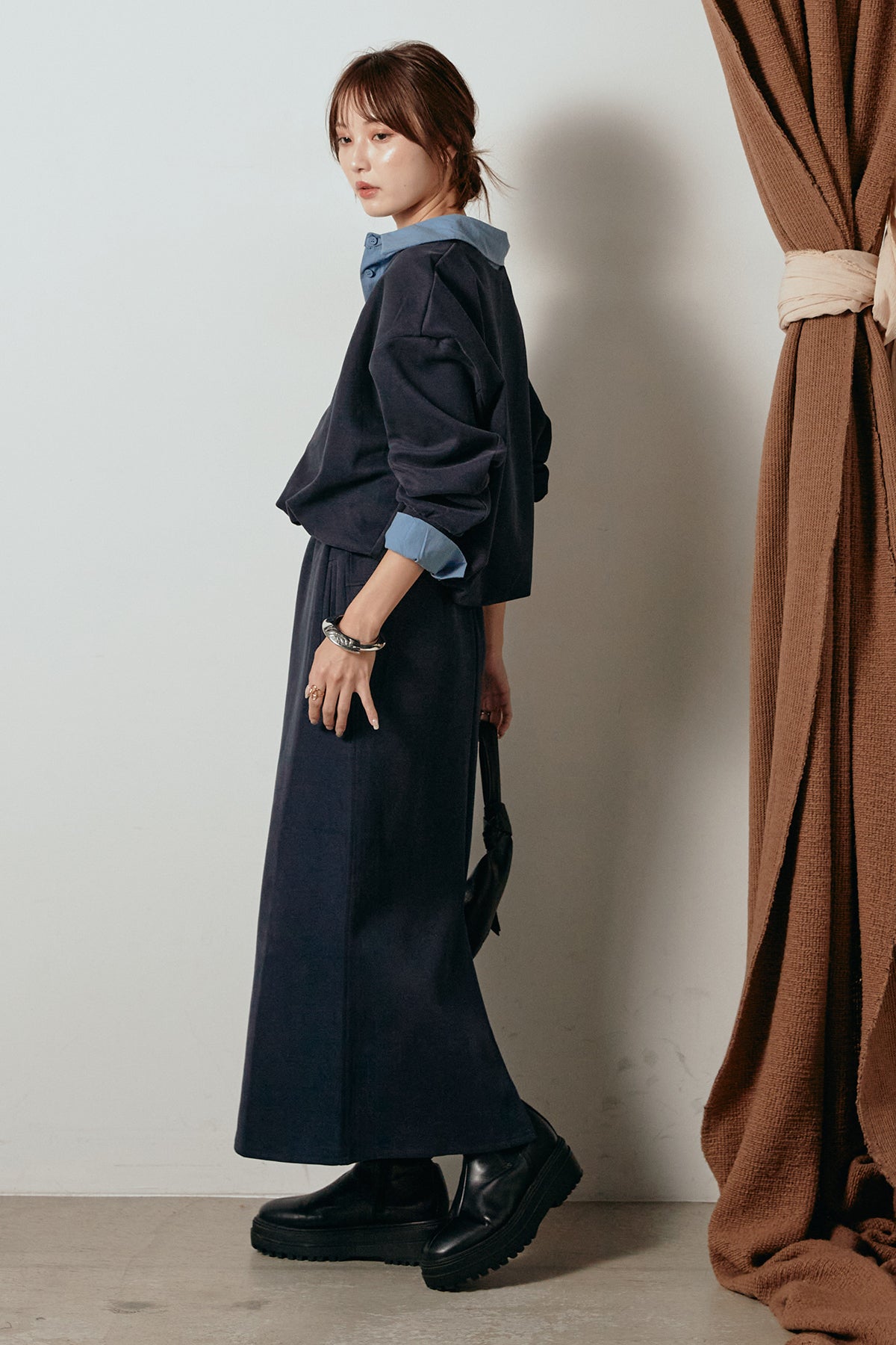 シャツを重ね着したようなドッキングデザインが目を惹くスウェットセットアップ。程よくゆとりのあるトップスと、すっきりとしたIラインスカートのバランスがこなれた印象を与えます。カジュアルなスウェット素材ながらも襟や袖のシャツディテールで品よく仕上げ、1枚で完成度の高いスタイリングが叶うアイテム。デイリーからお出かけまで幅広く活躍します。