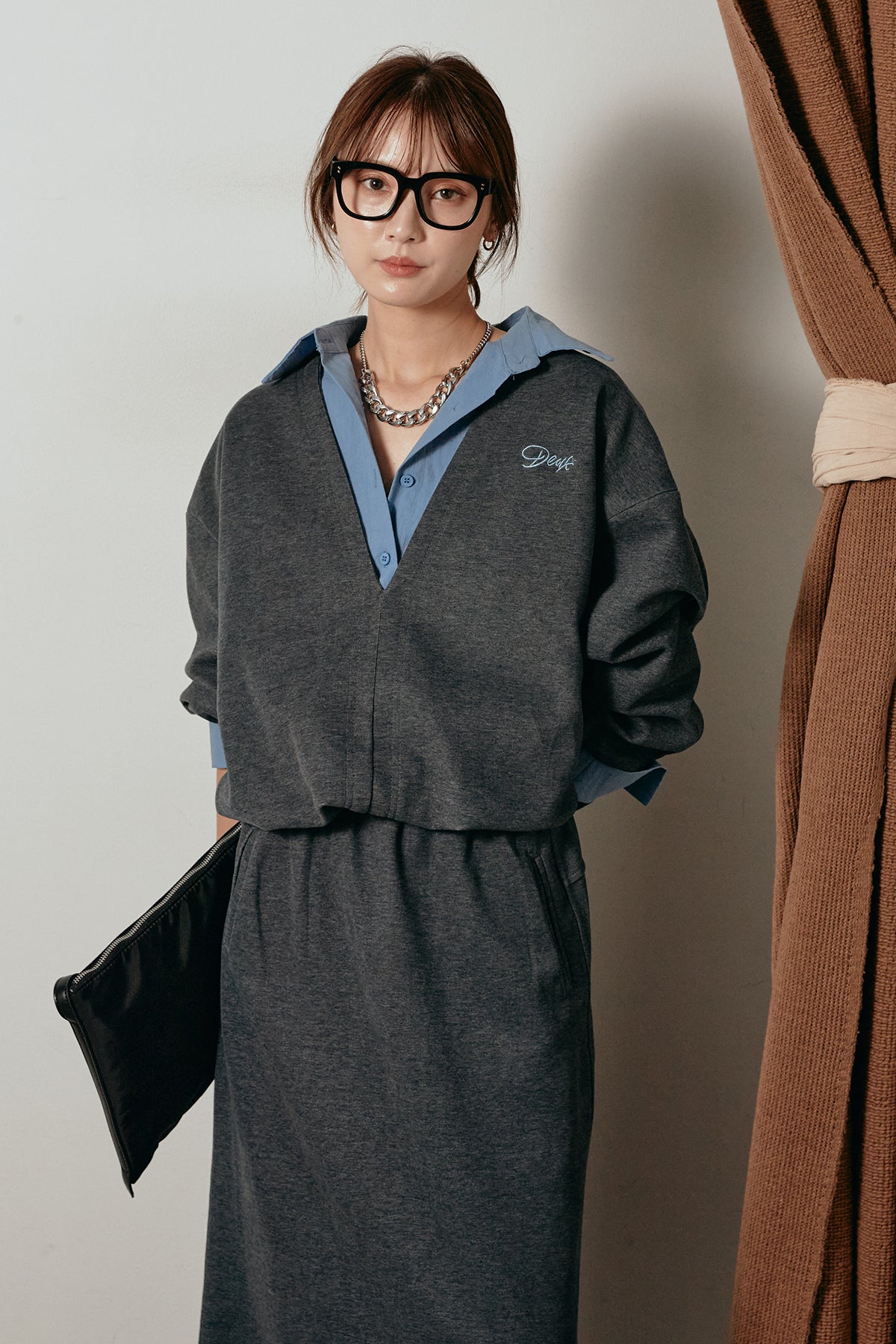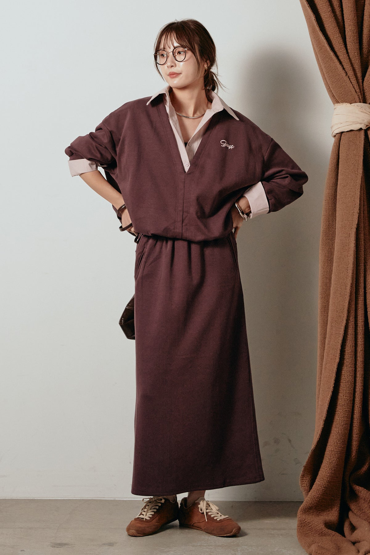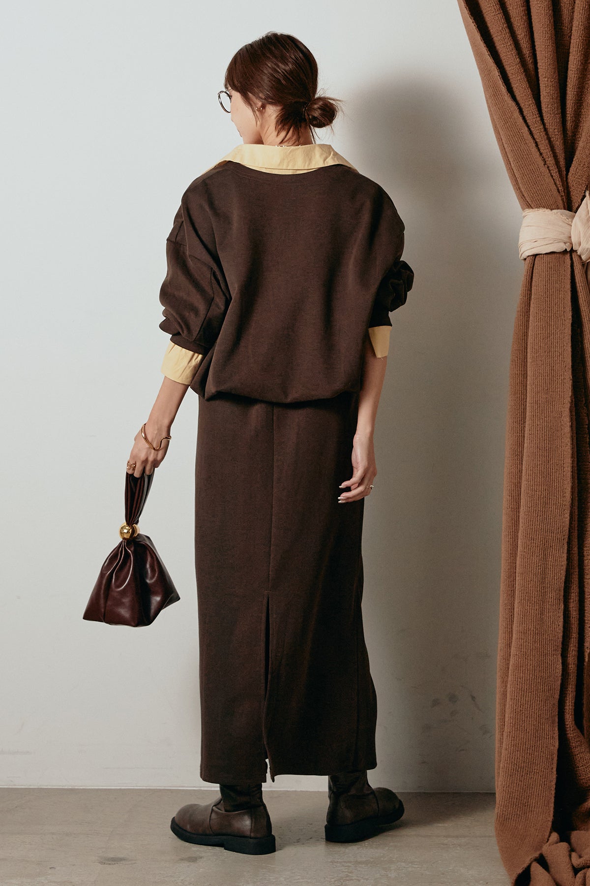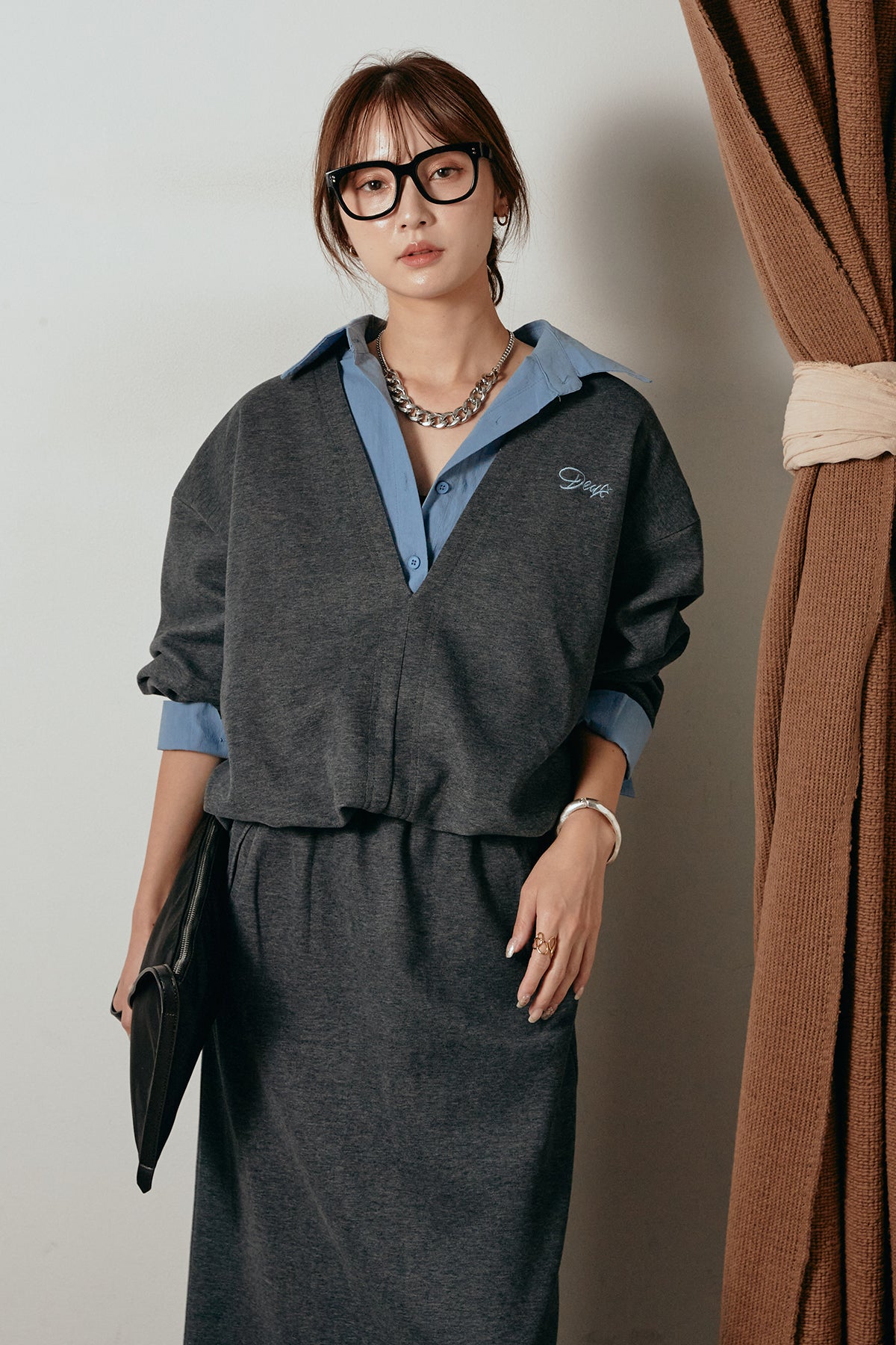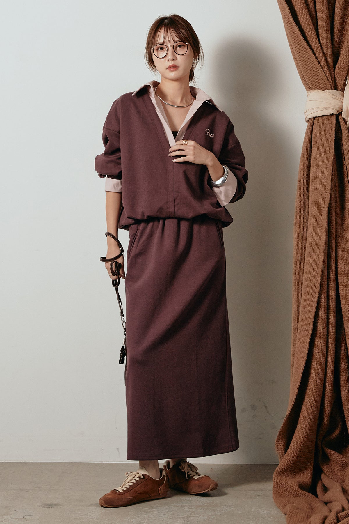 シャツを重ね着したようなドッキングデザインが目を惹くスウェットセットアップ。程よくゆとりのあるトップスと、すっきりとしたIラインスカートのバランスがこなれた印象を与えます。カジュアルなスウェット素材ながらも襟や袖のシャツディテールで品よく仕上げ、1枚で完成度の高いスタイリングが叶うアイテム。デイリーからお出かけまで幅広く活躍します。