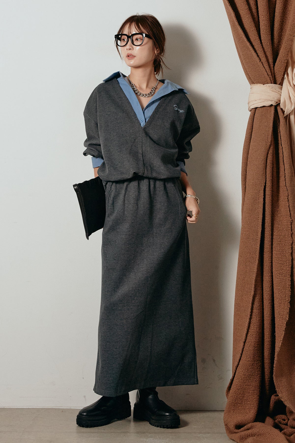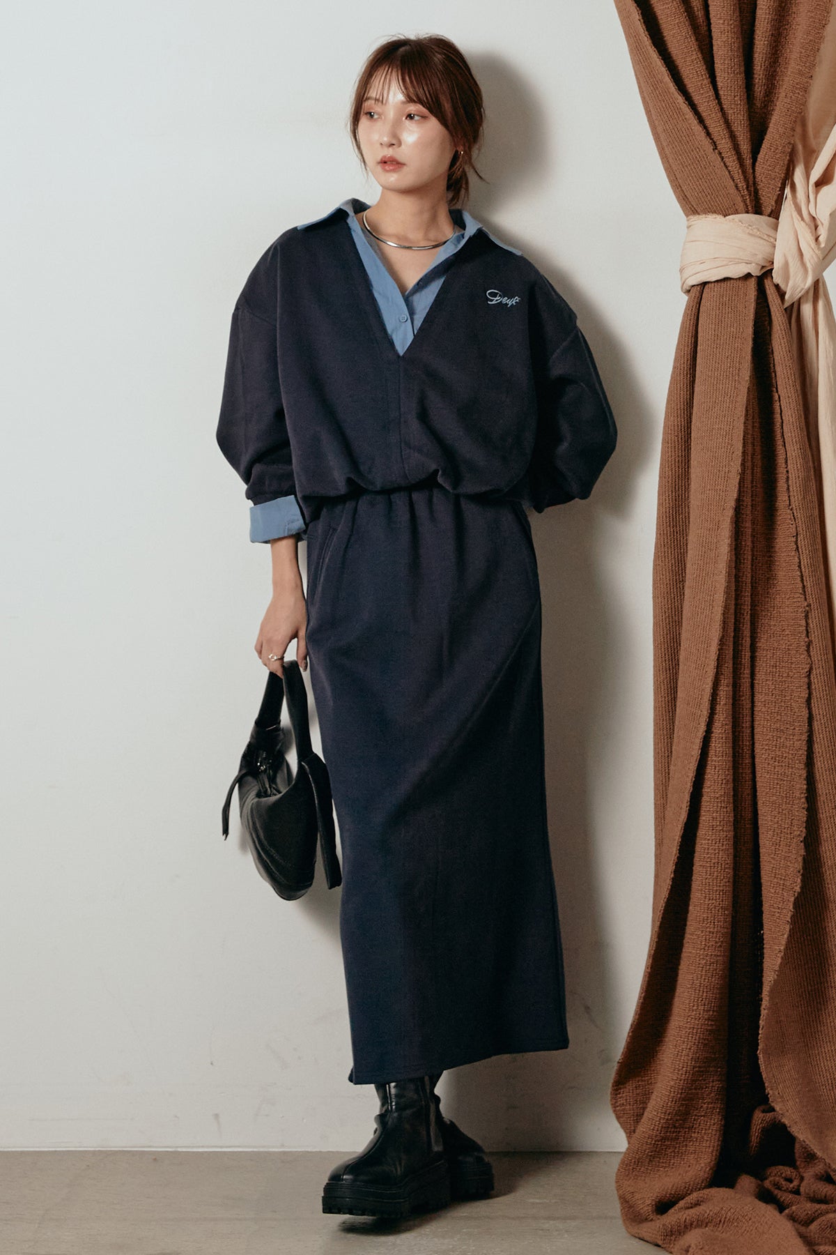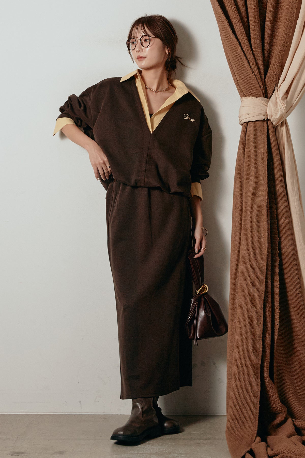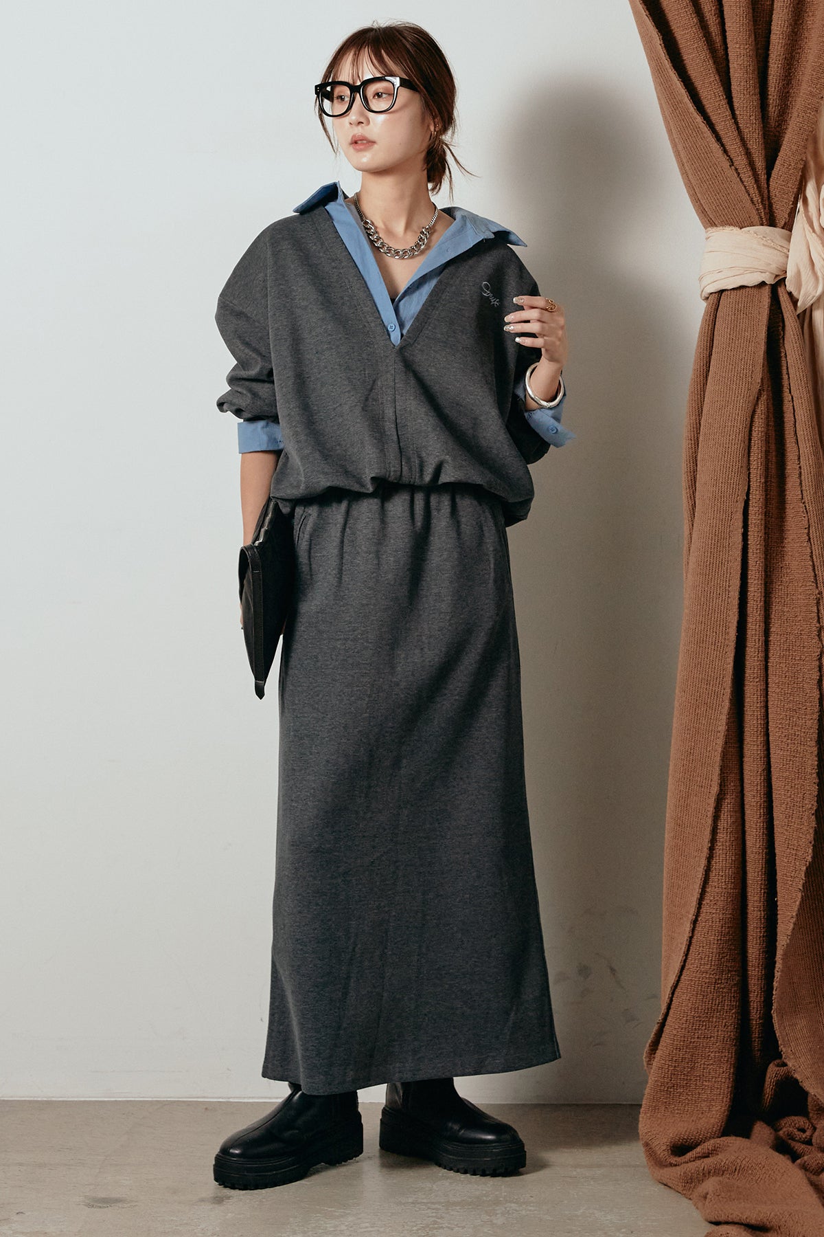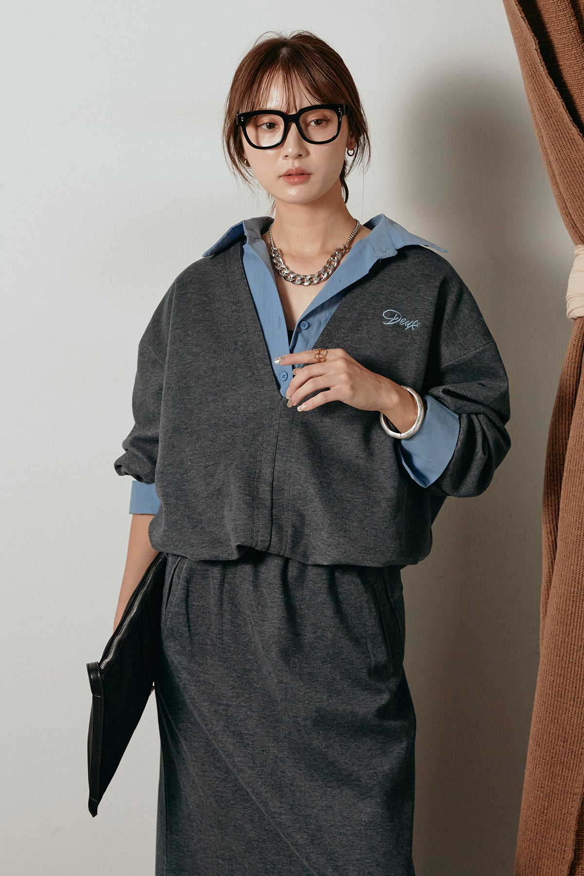 シャツを重ね着したようなドッキングデザインが目を惹くスウェットセットアップ。程よくゆとりのあるトップスと、すっきりとしたIラインスカートのバランスがこなれた印象を与えます。カジュアルなスウェット素材ながらも襟や袖のシャツディテールで品よく仕上げ、1枚で完成度の高いスタイリングが叶うアイテム。デイリーからお出かけまで幅広く活躍します。