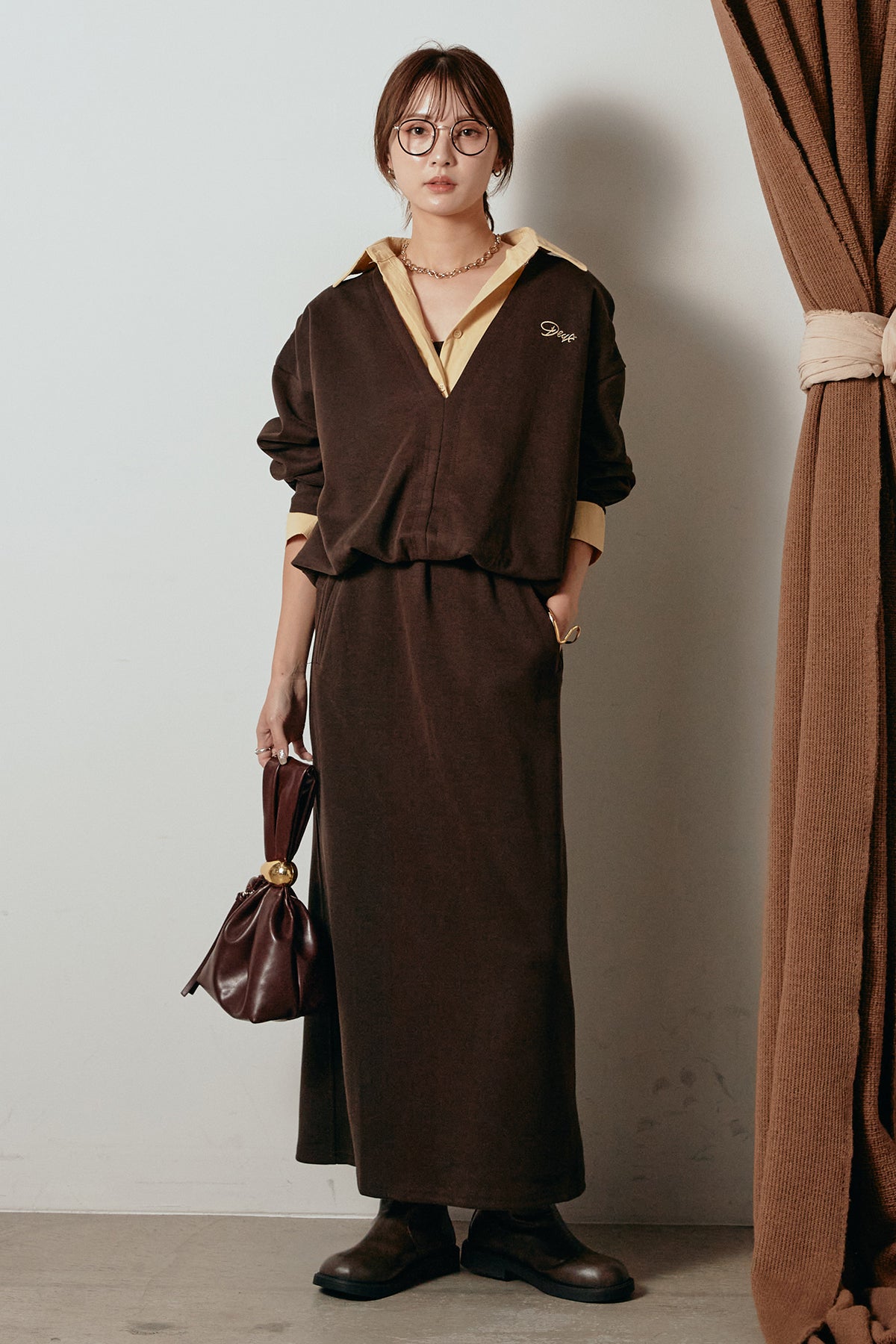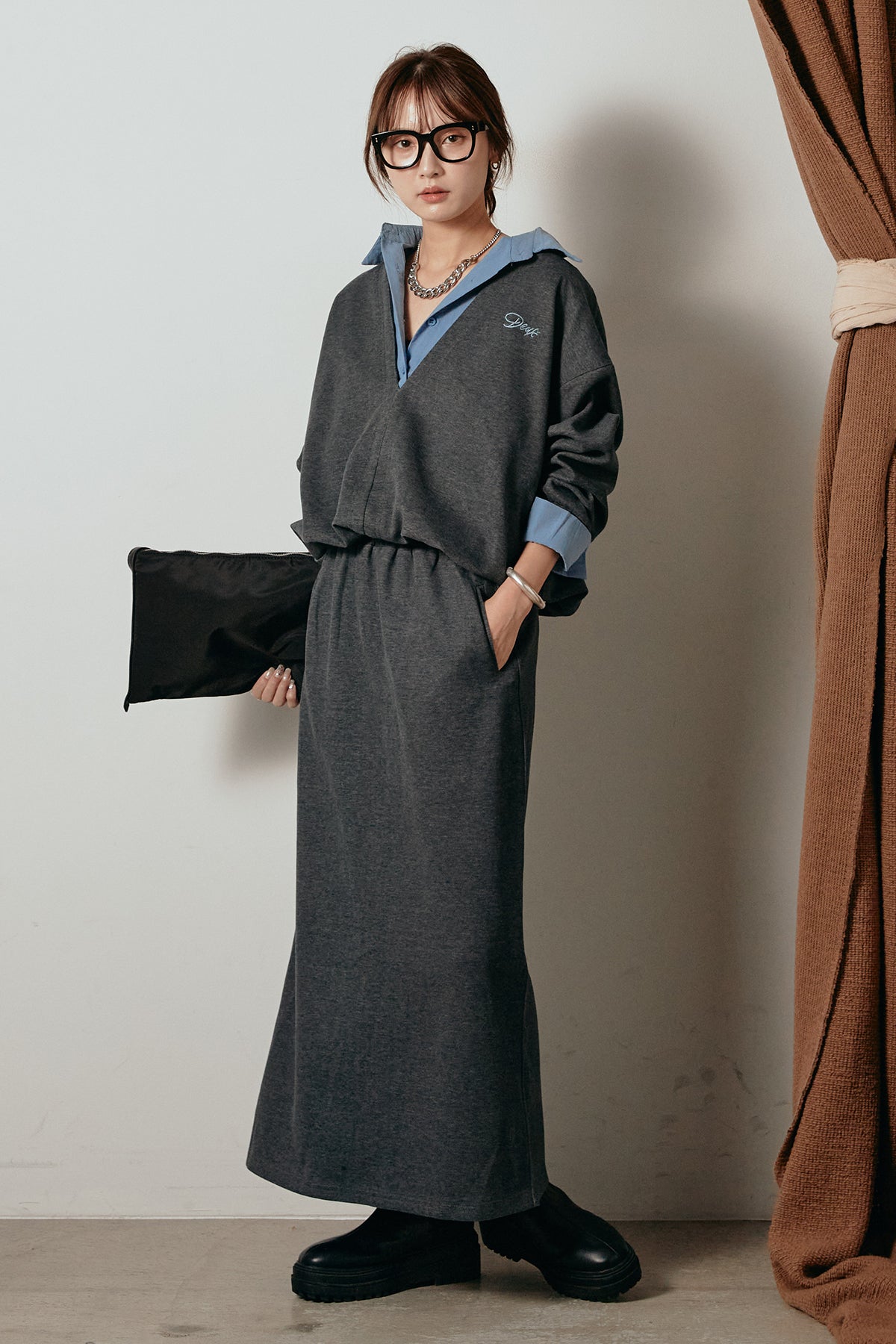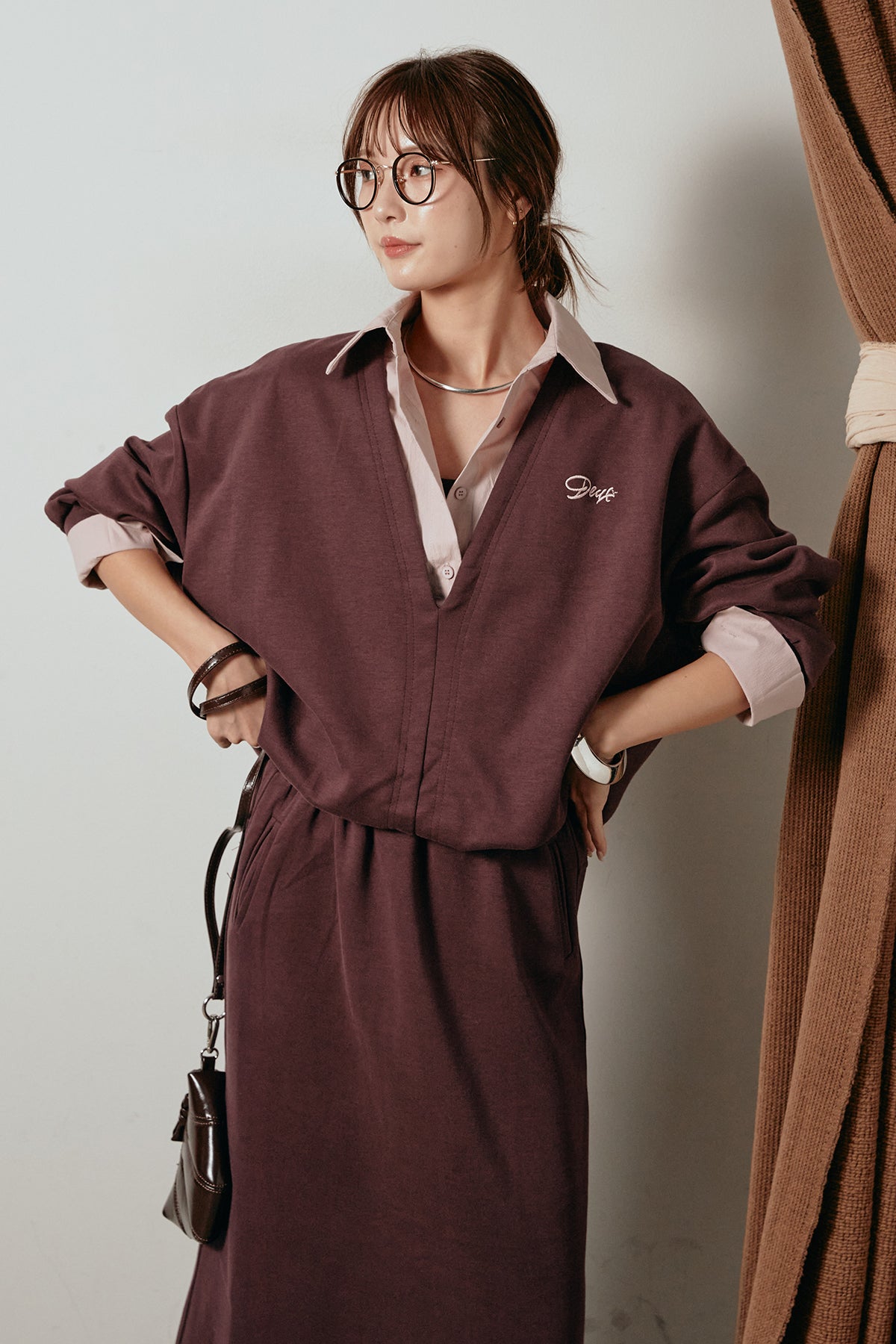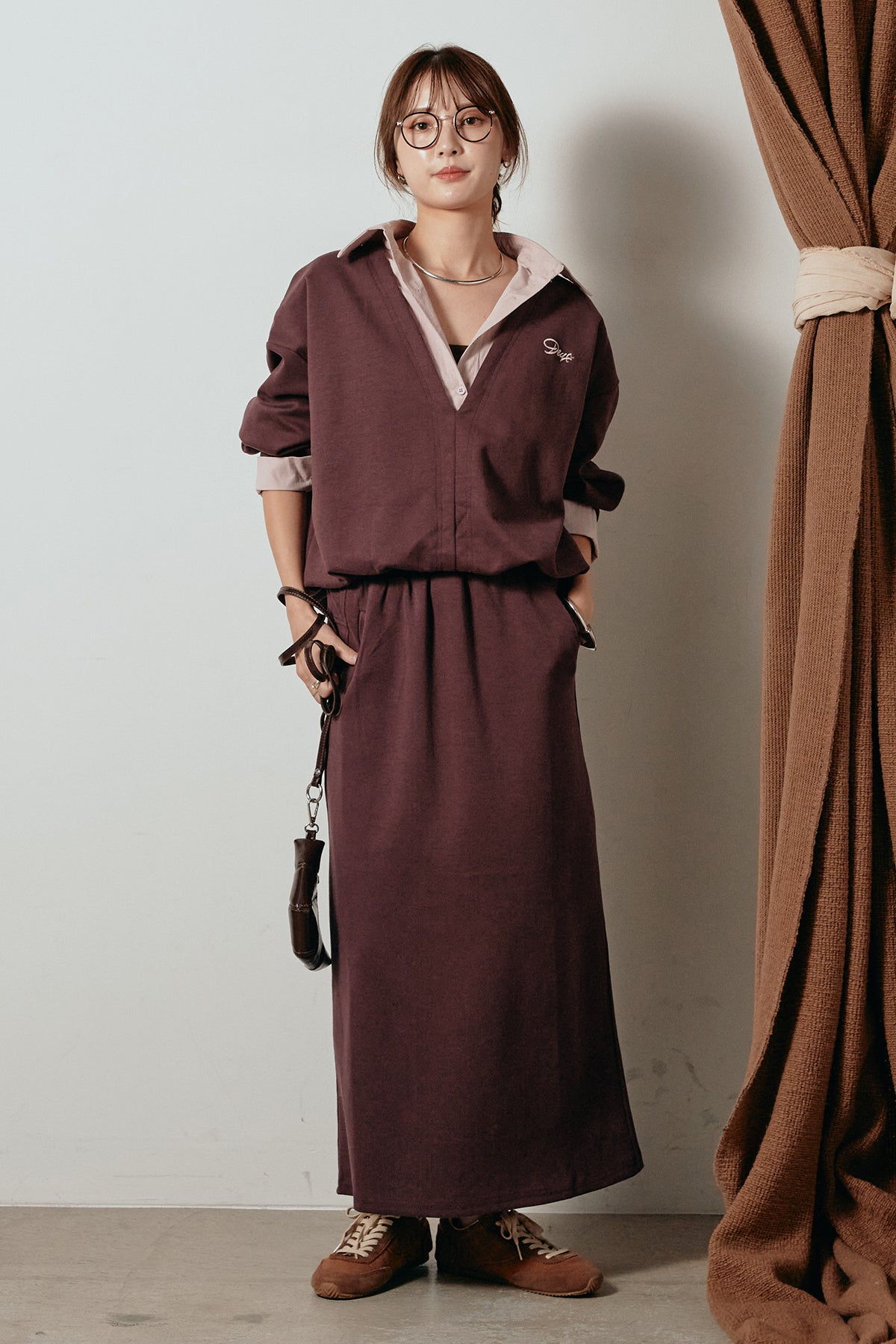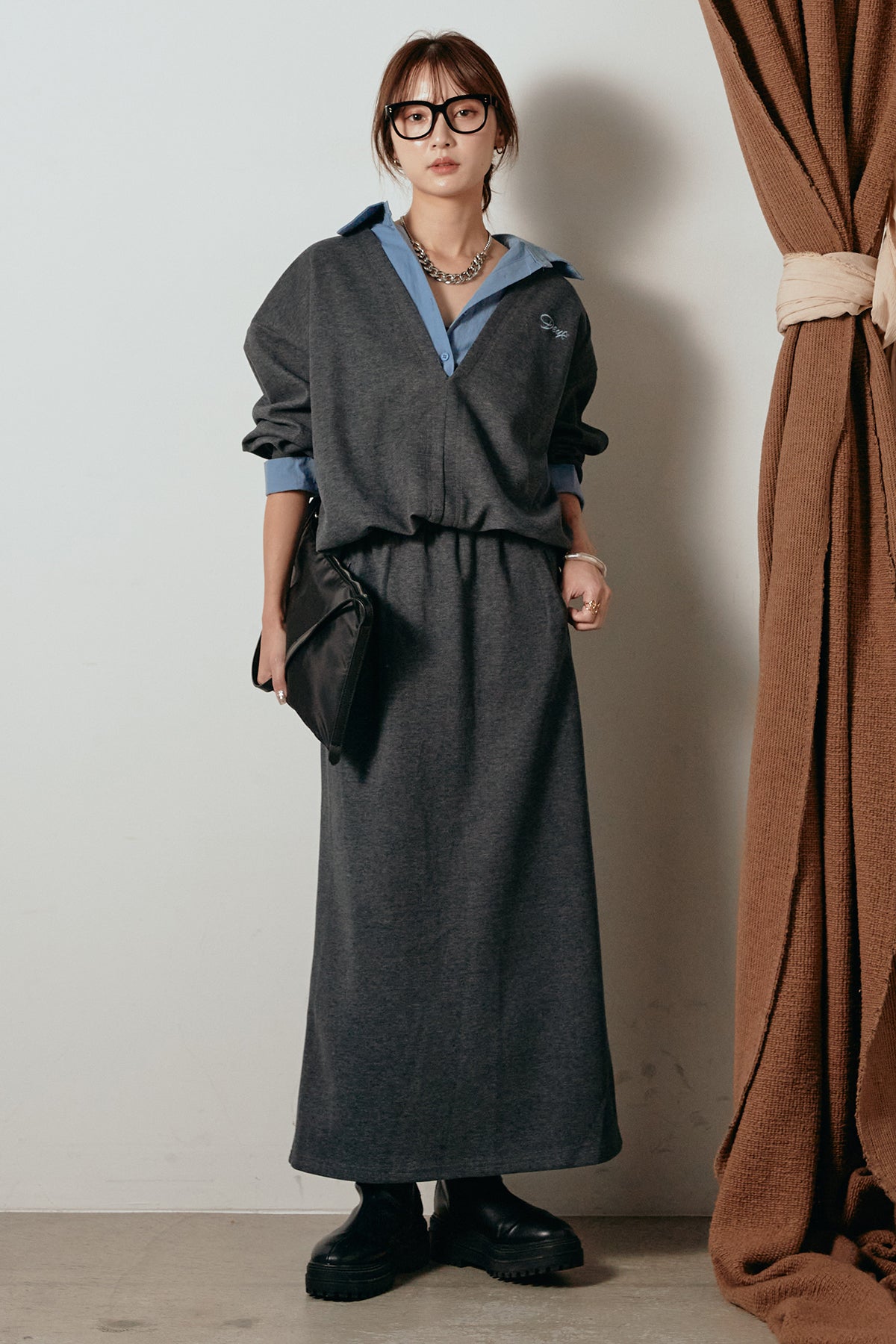 シャツを重ね着したようなドッキングデザインが目を惹くスウェットセットアップ。程よくゆとりのあるトップスと、すっきりとしたIラインスカートのバランスがこなれた印象を与えます。カジュアルなスウェット素材ながらも襟や袖のシャツディテールで品よく仕上げ、1枚で完成度の高いスタイリングが叶うアイテム。デイリーからお出かけまで幅広く活躍します。