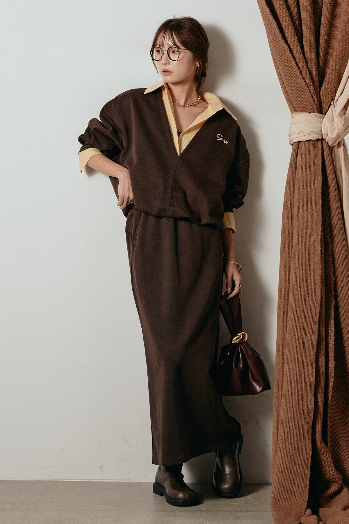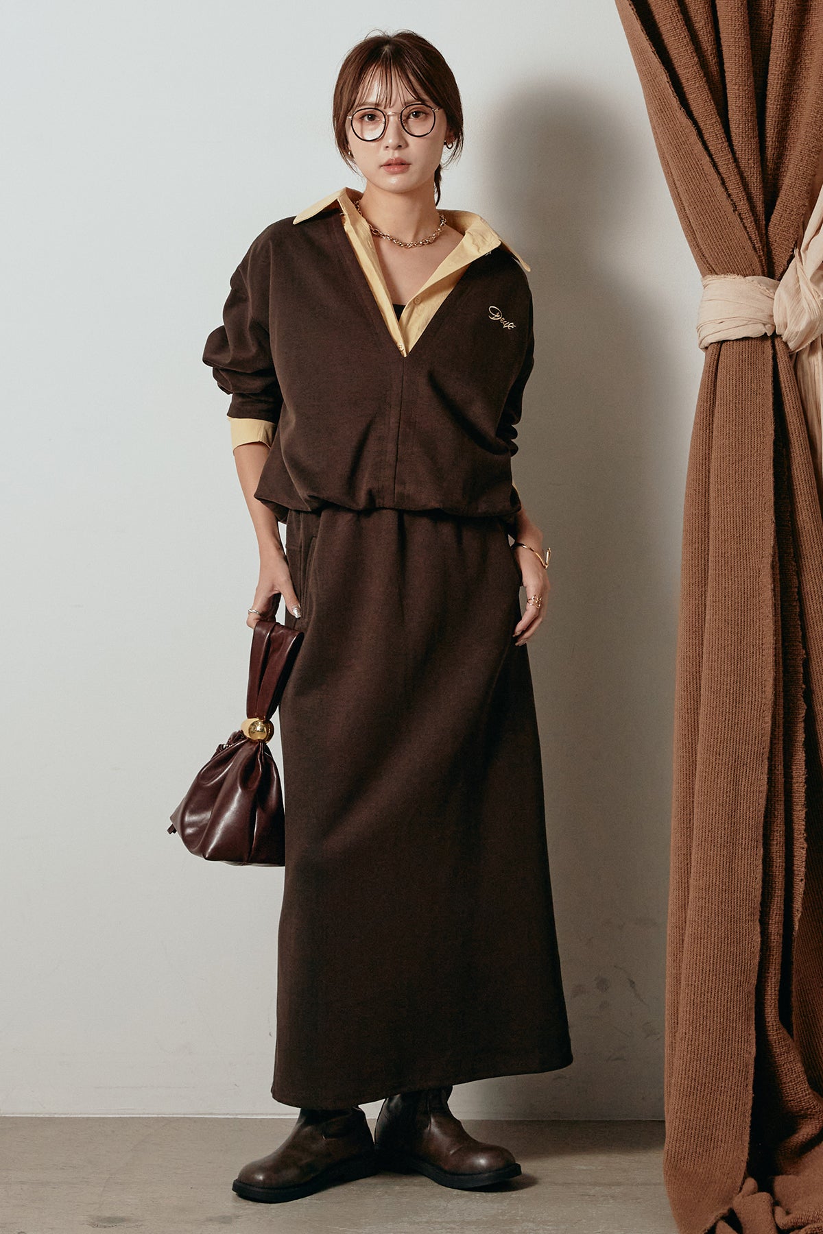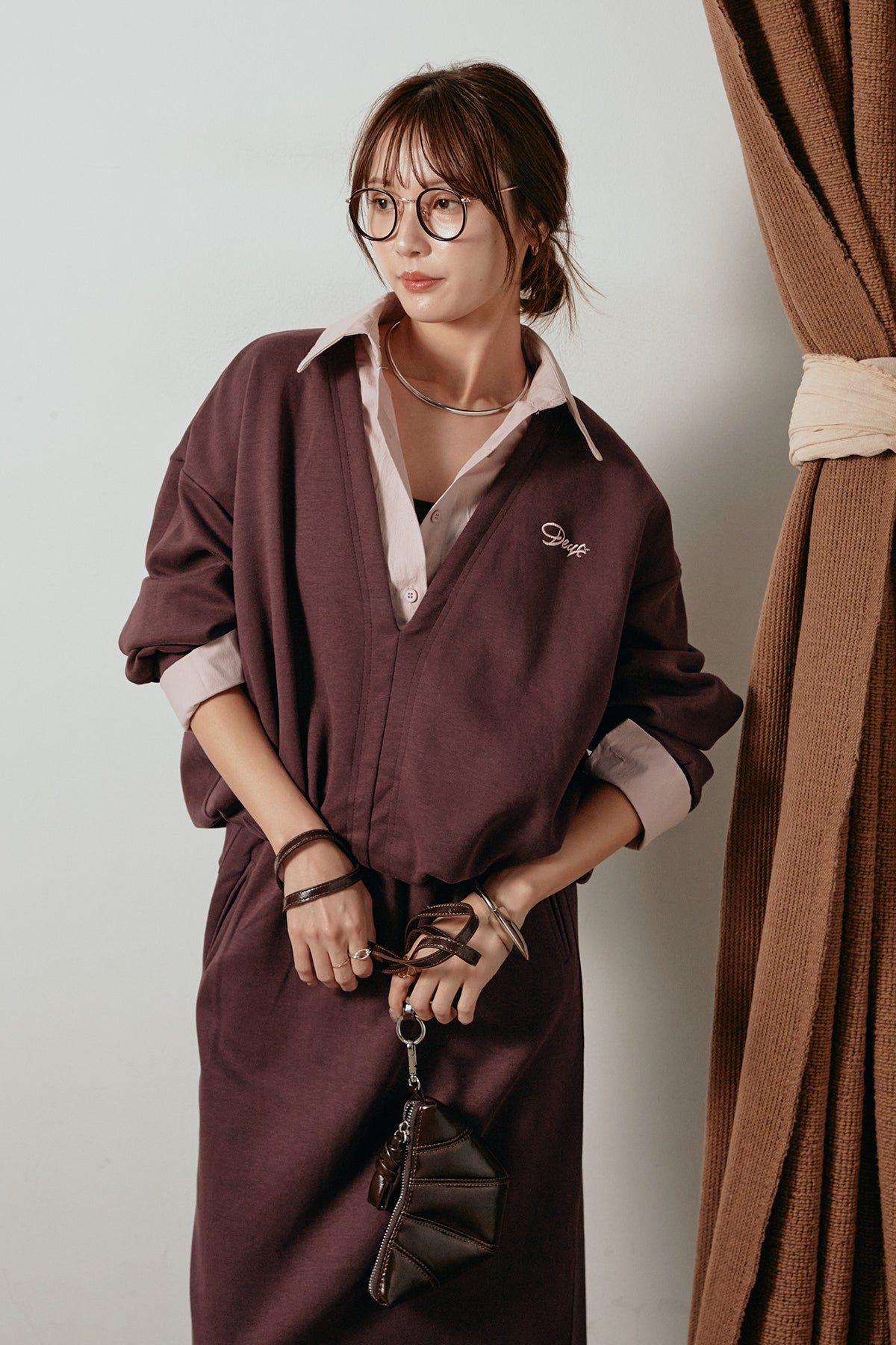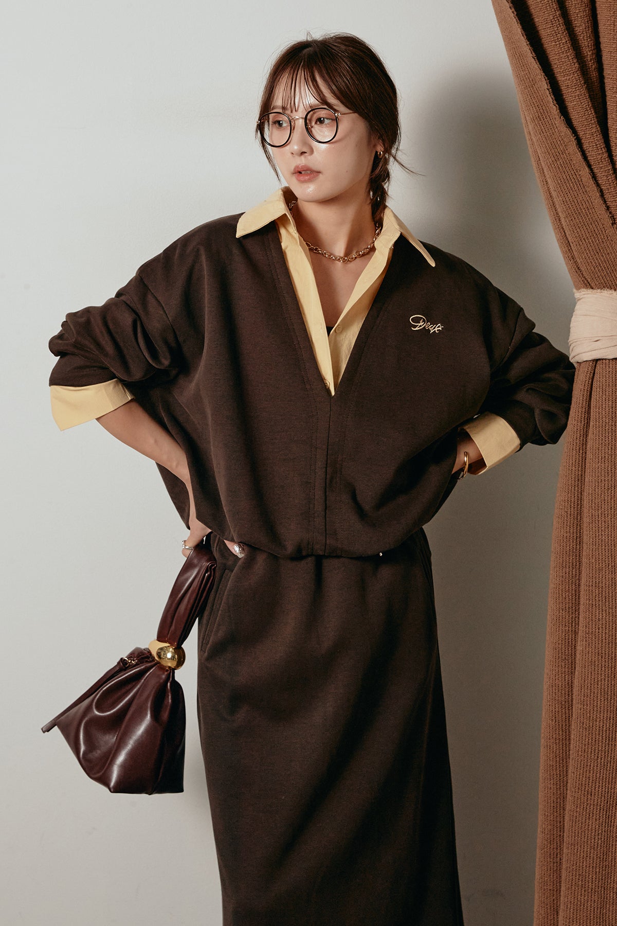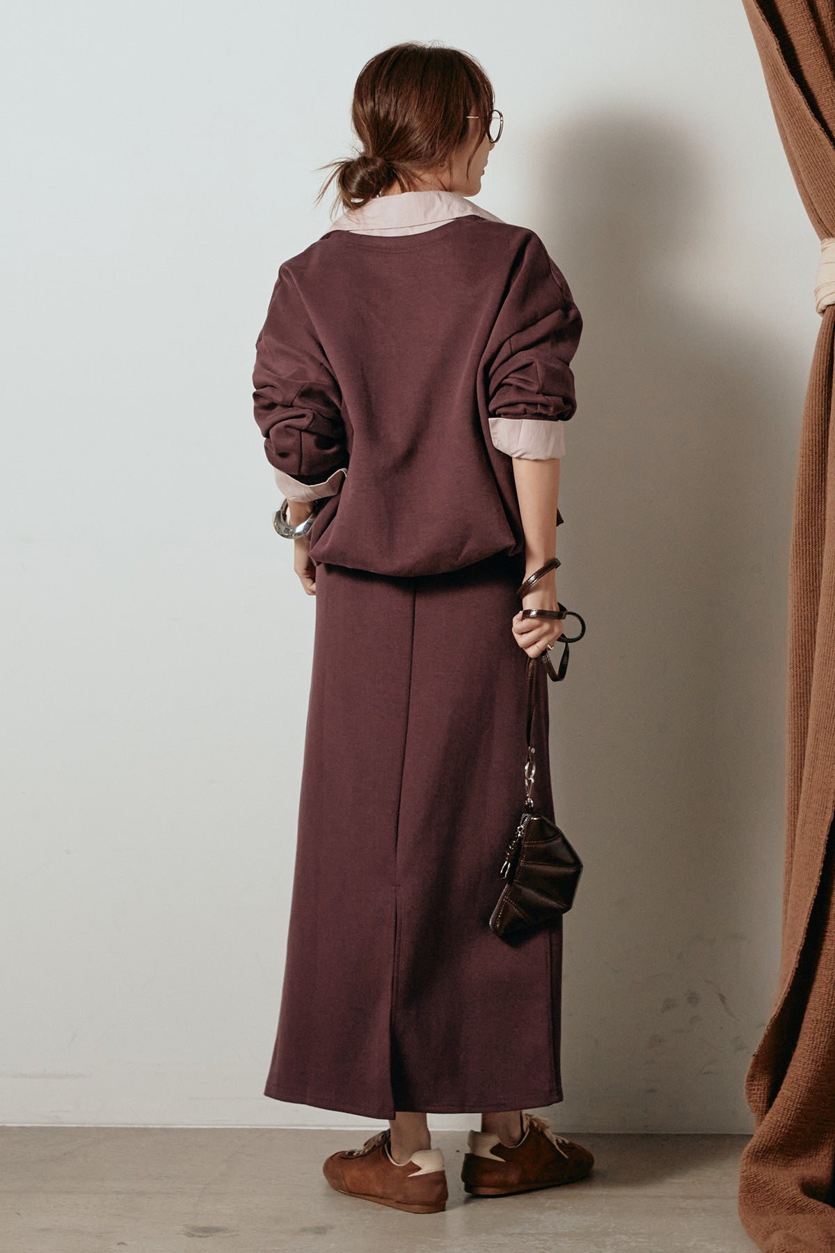 シャツを重ね着したようなドッキングデザインが目を惹くスウェットセットアップ。程よくゆとりのあるトップスと、すっきりとしたIラインスカートのバランスがこなれた印象を与えます。カジュアルなスウェット素材ながらも襟や袖のシャツディテールで品よく仕上げ、1枚で完成度の高いスタイリングが叶うアイテム。デイリーからお出かけまで幅広く活躍します。