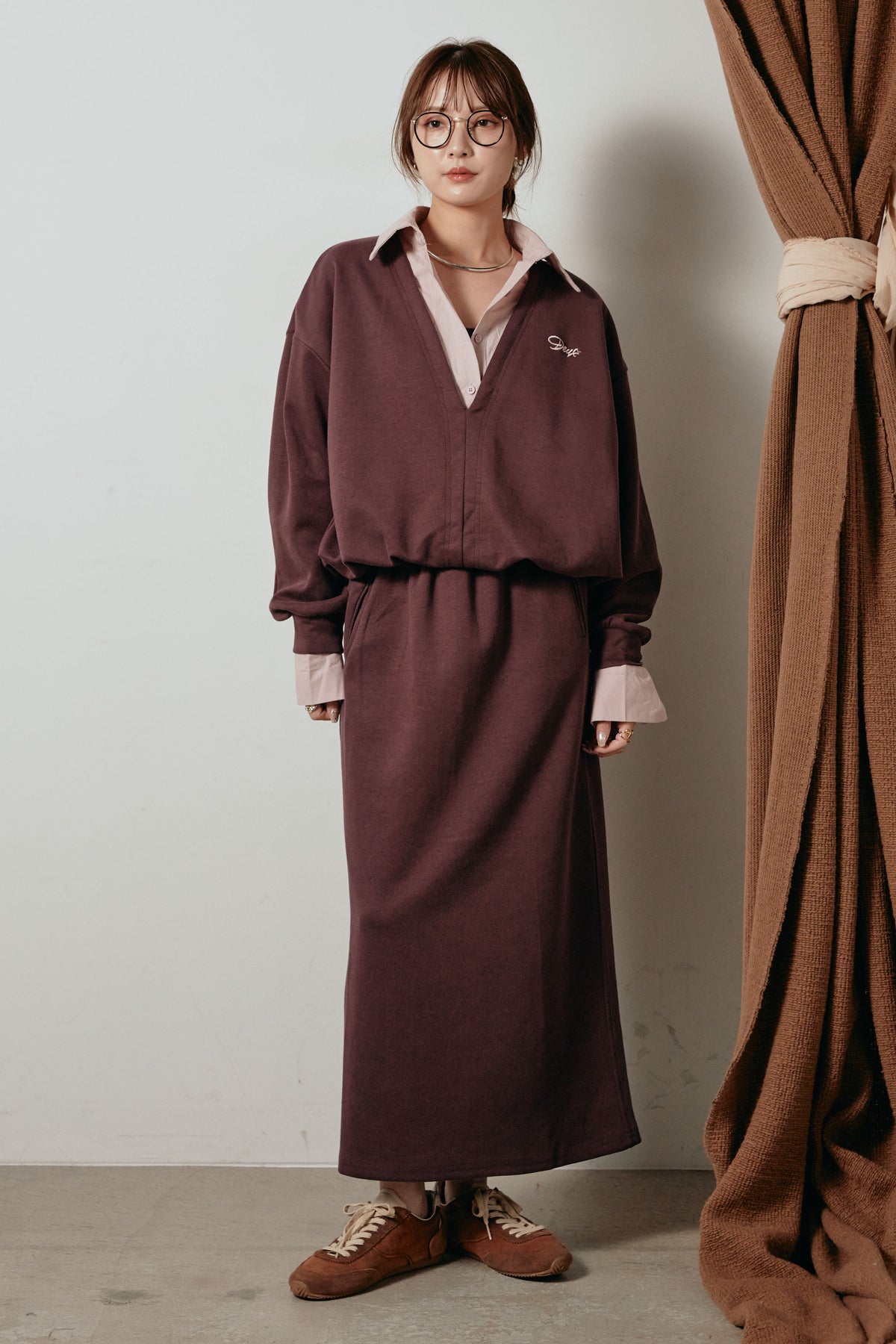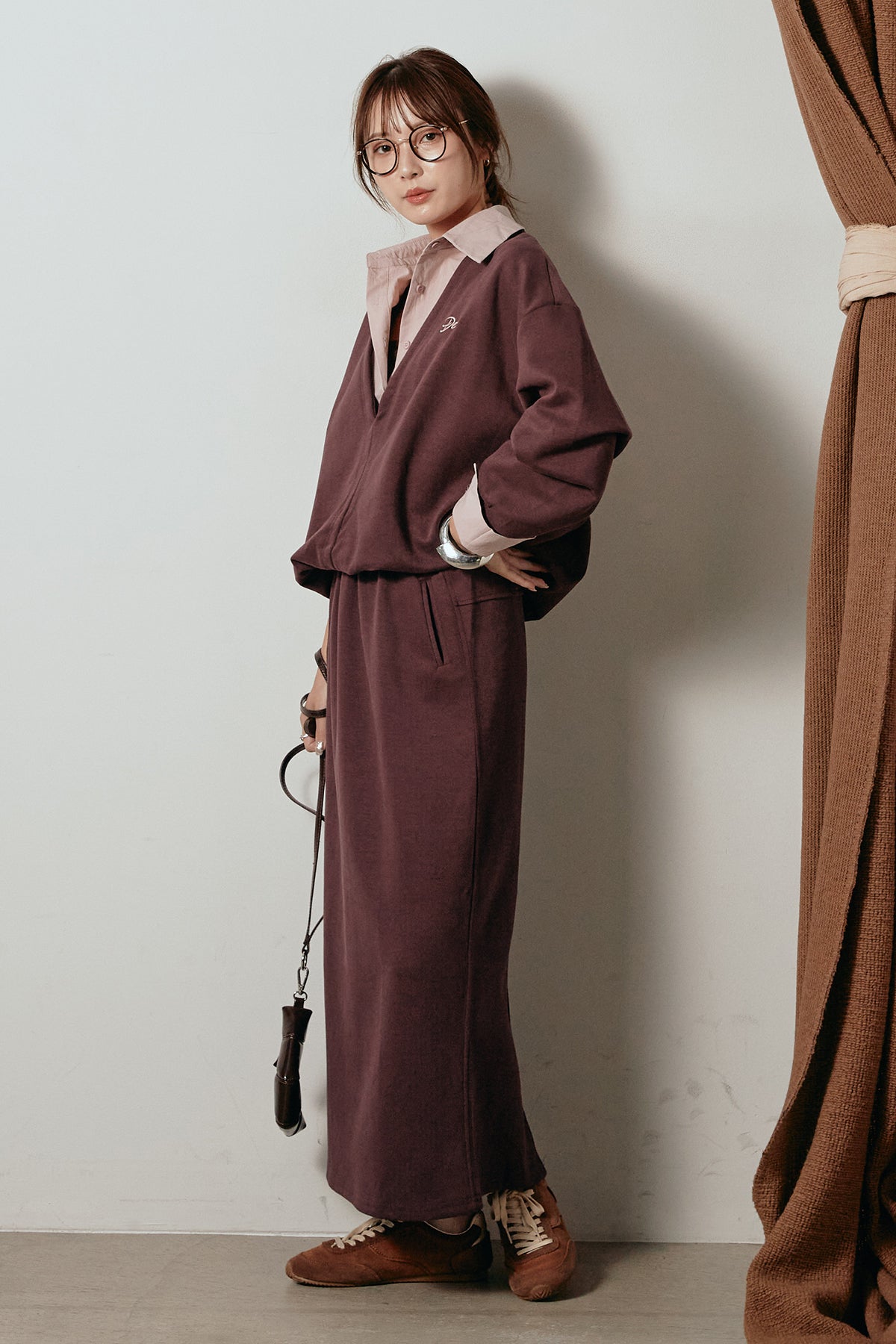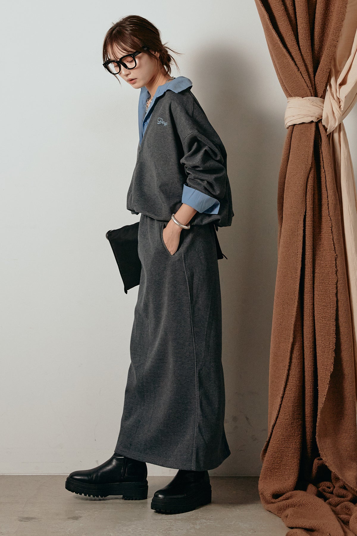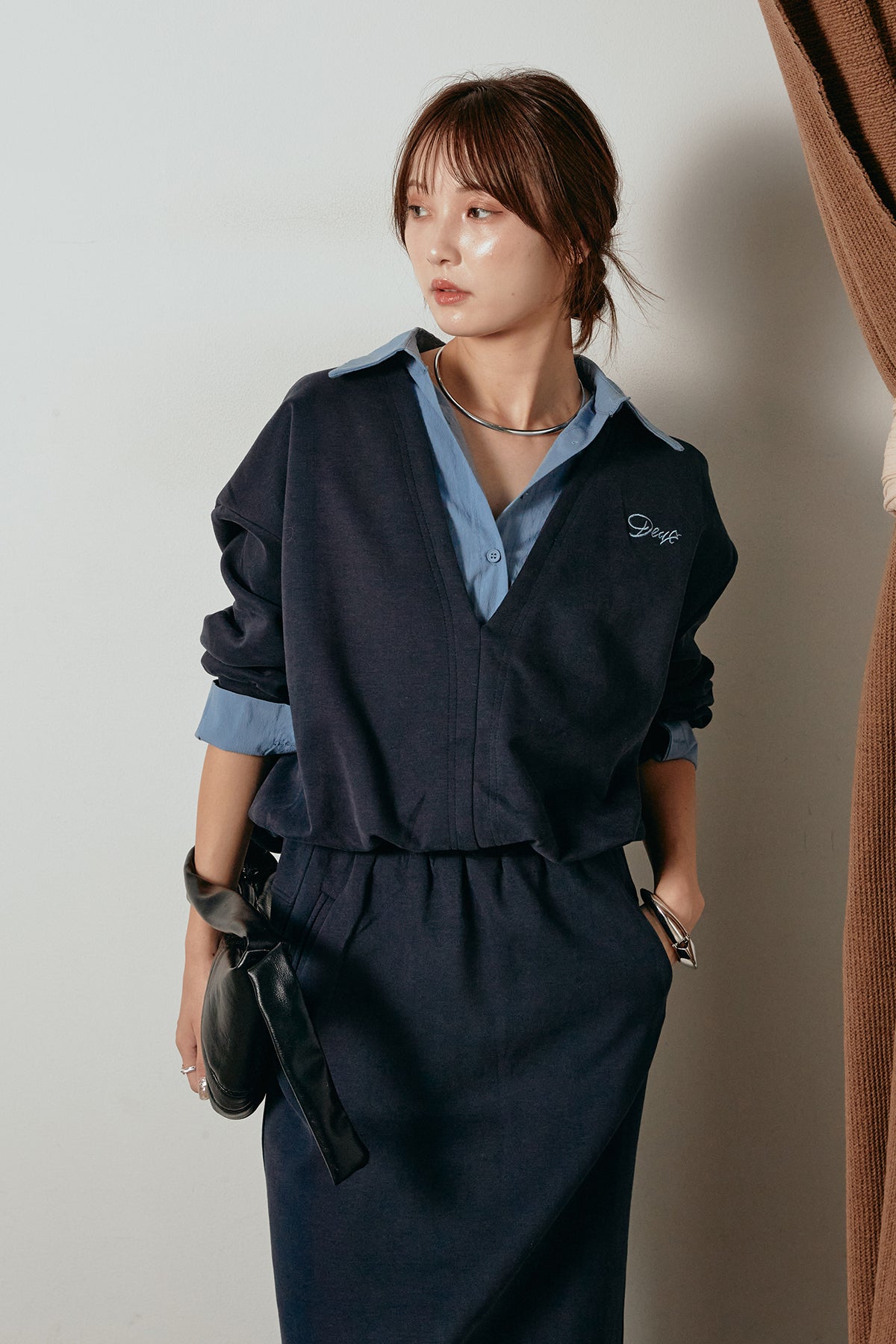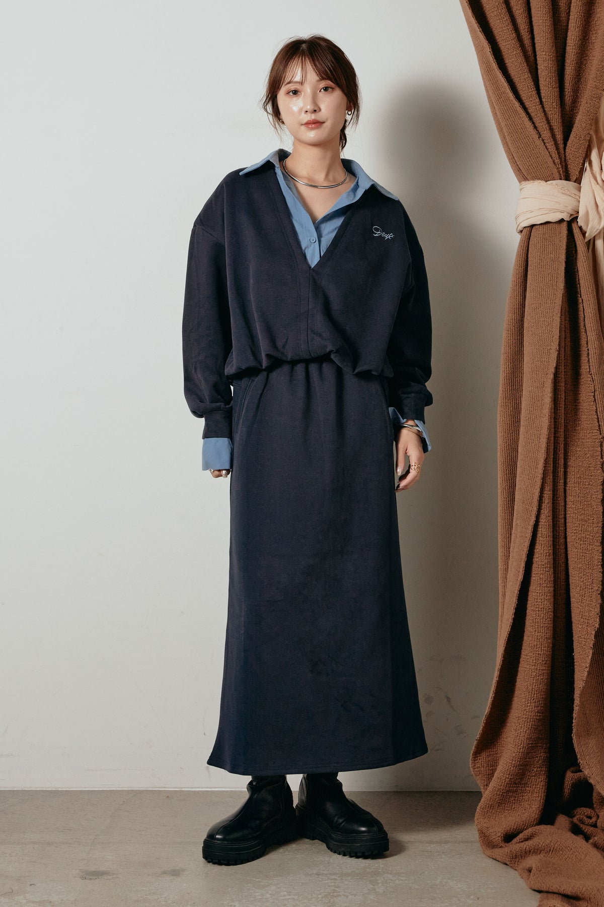 シャツを重ね着したようなドッキングデザインが目を惹くスウェットセットアップ。程よくゆとりのあるトップスと、すっきりとしたIラインスカートのバランスがこなれた印象を与えます。カジュアルなスウェット素材ながらも襟や袖のシャツディテールで品よく仕上げ、1枚で完成度の高いスタイリングが叶うアイテム。デイリーからお出かけまで幅広く活躍します。