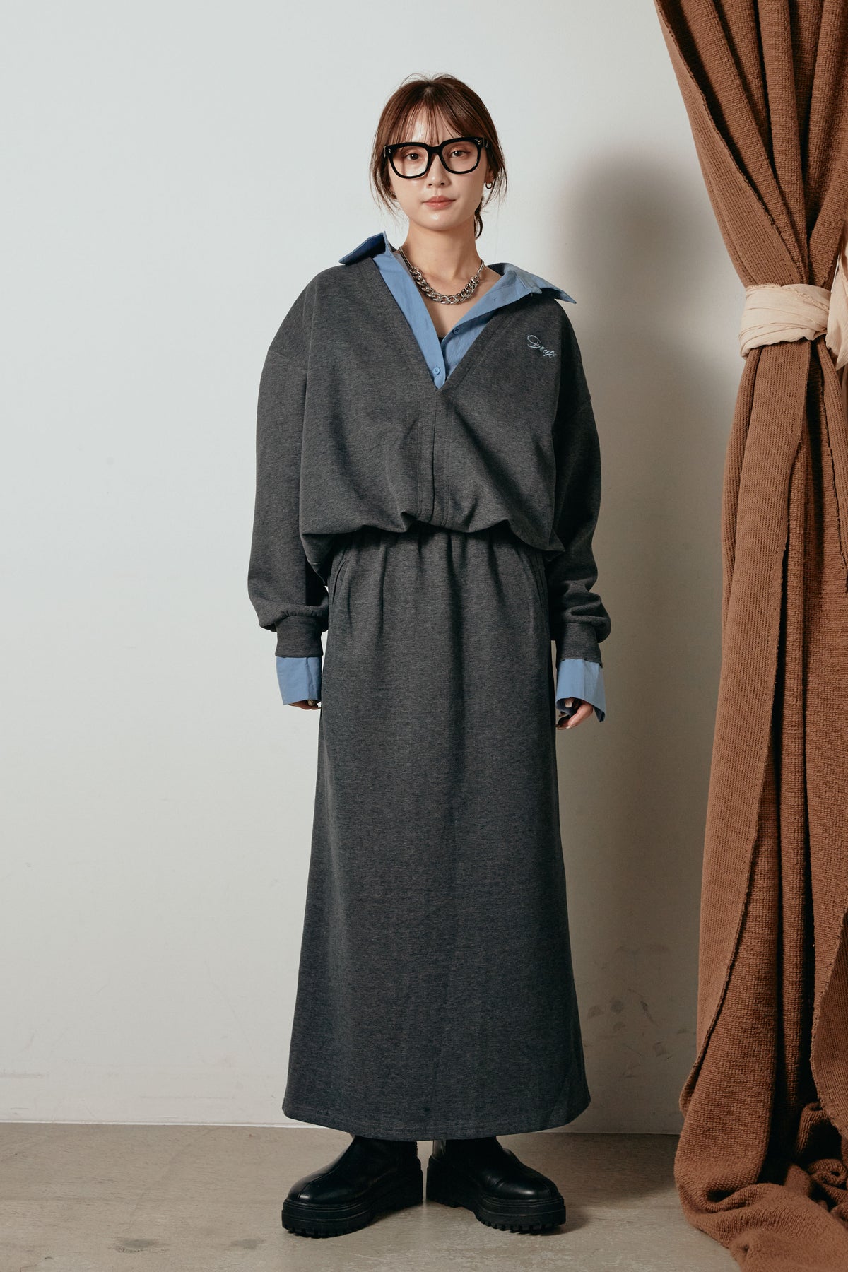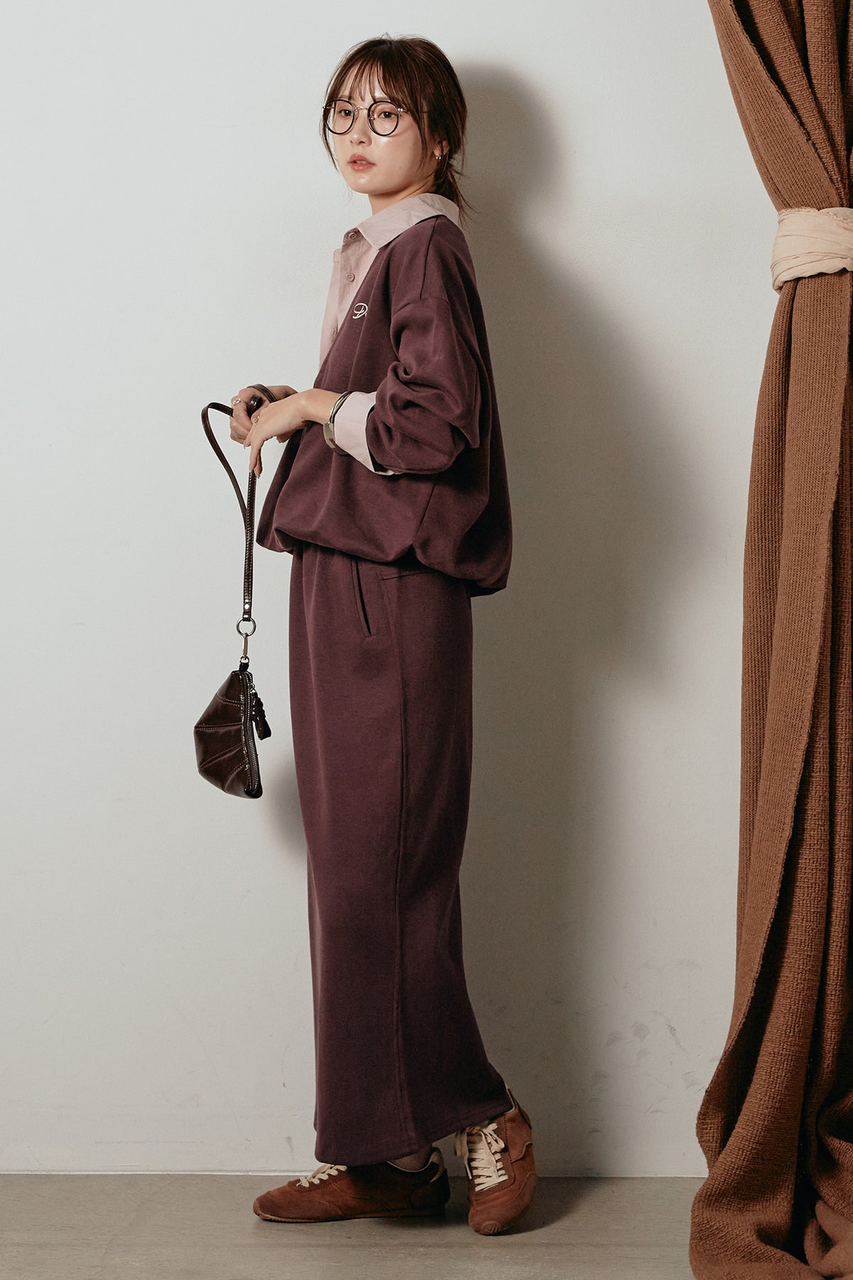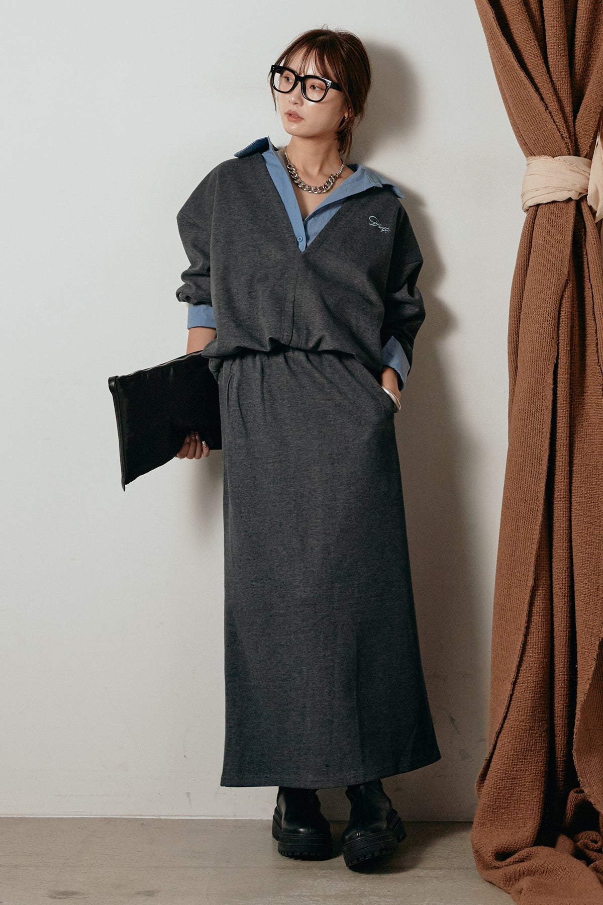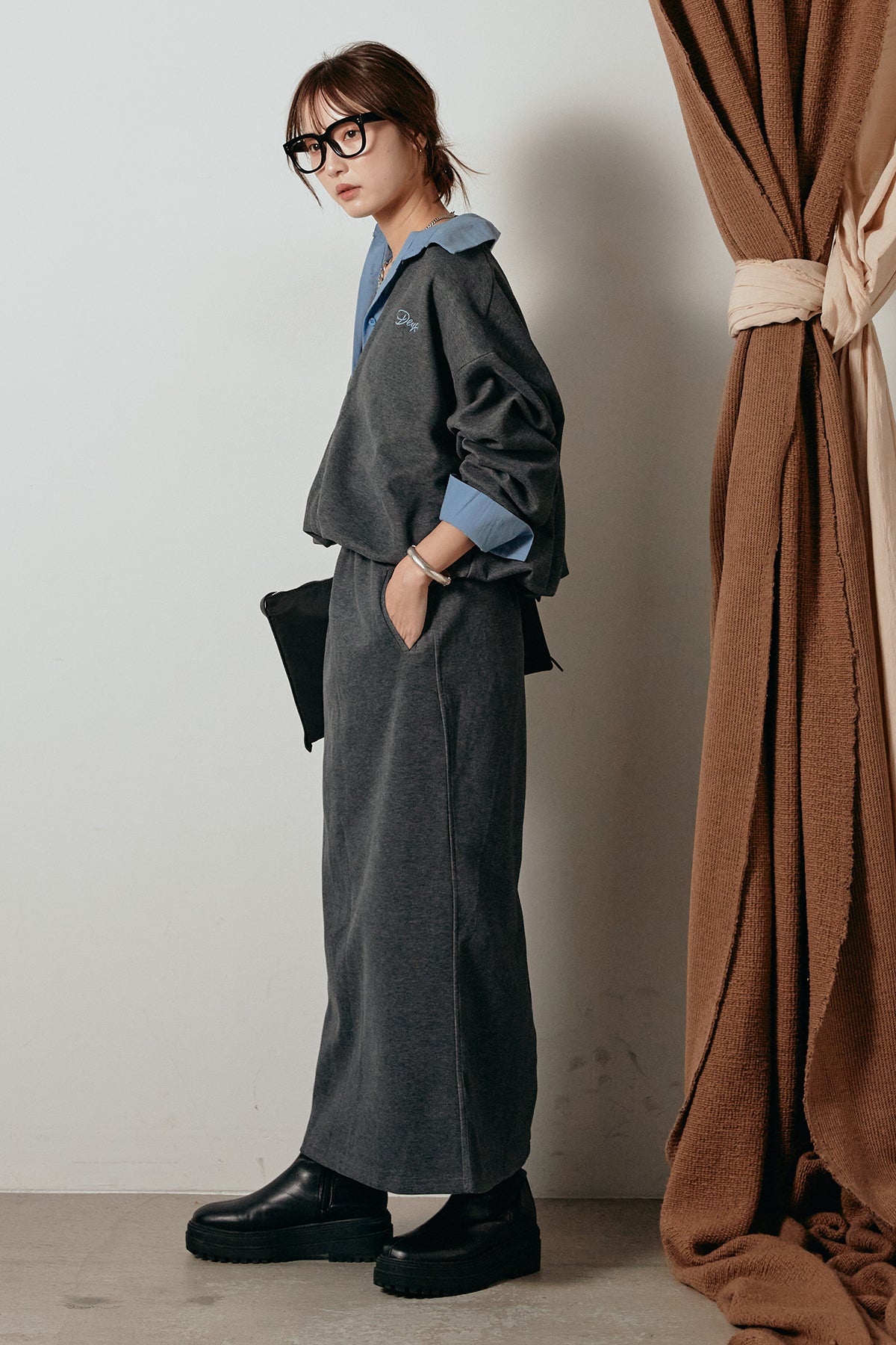シャツを重ね着したようなドッキングデザインが目を惹くスウェットセットアップ。程よくゆとりのあるトップスと、すっきりとしたIラインスカートのバランスがこなれた印象を与えます。カジュアルなスウェット素材ながらも襟や袖のシャツディテールで品よく仕上げ、1枚で完成度の高いスタイリングが叶うアイテム。デイリーからお出かけまで幅広く活躍します。