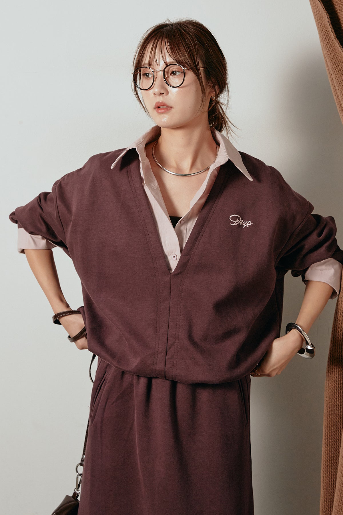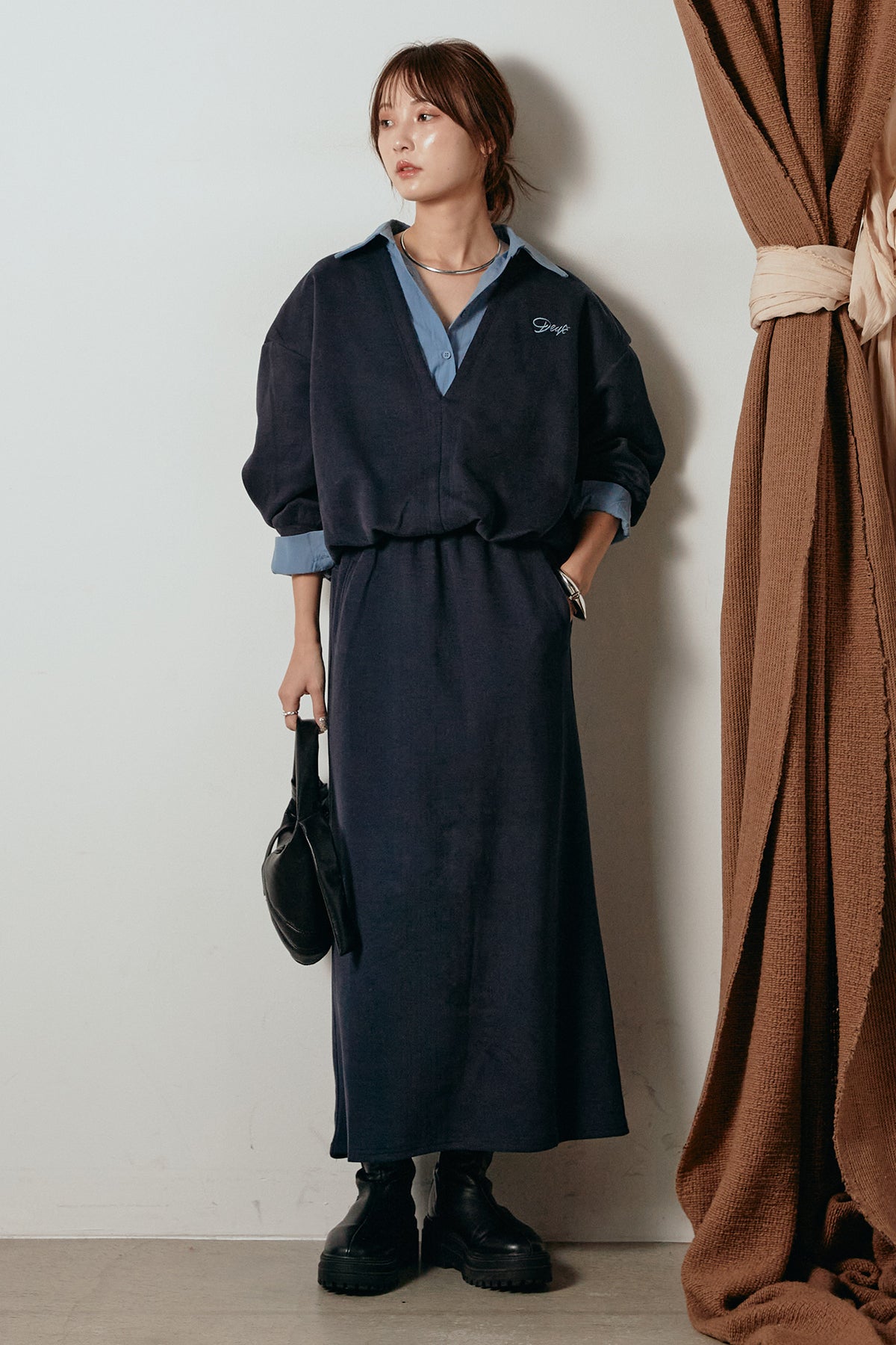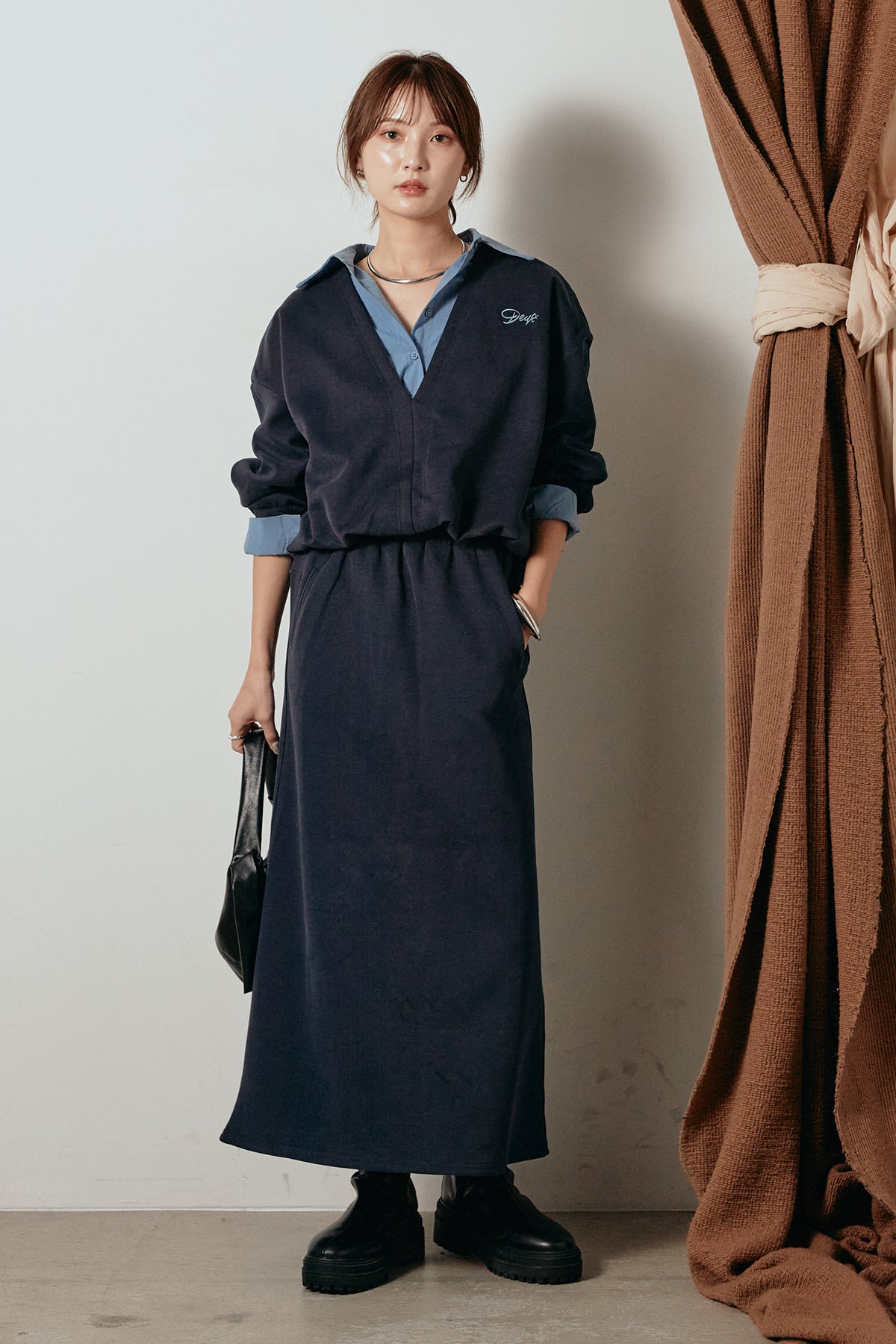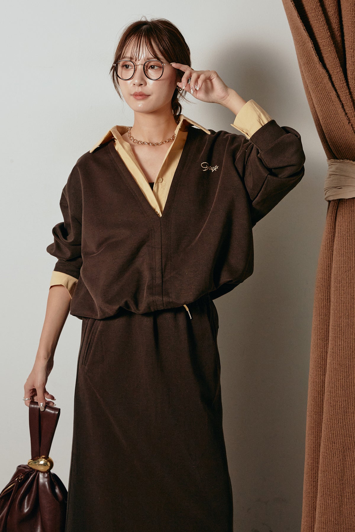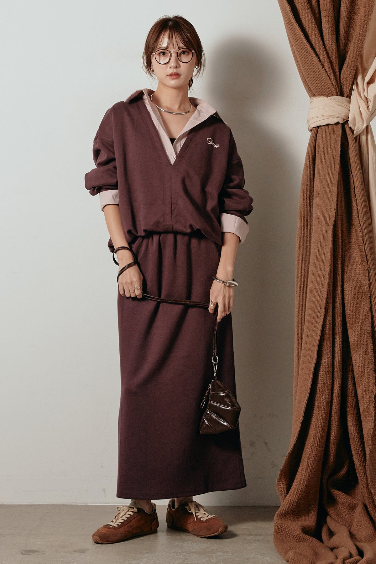 シャツを重ね着したようなドッキングデザインが目を惹くスウェットセットアップ。程よくゆとりのあるトップスと、すっきりとしたIラインスカートのバランスがこなれた印象を与えます。カジュアルなスウェット素材ながらも襟や袖のシャツディテールで品よく仕上げ、1枚で完成度の高いスタイリングが叶うアイテム。デイリーからお出かけまで幅広く活躍します。