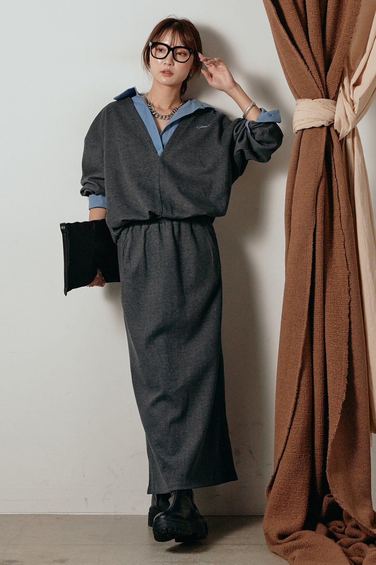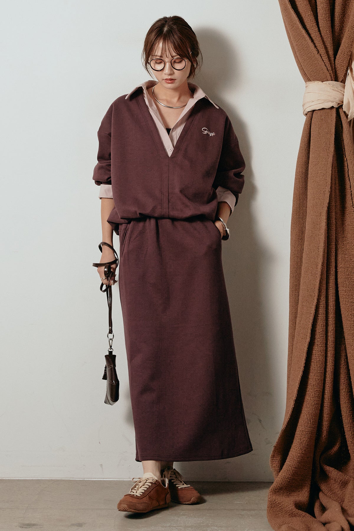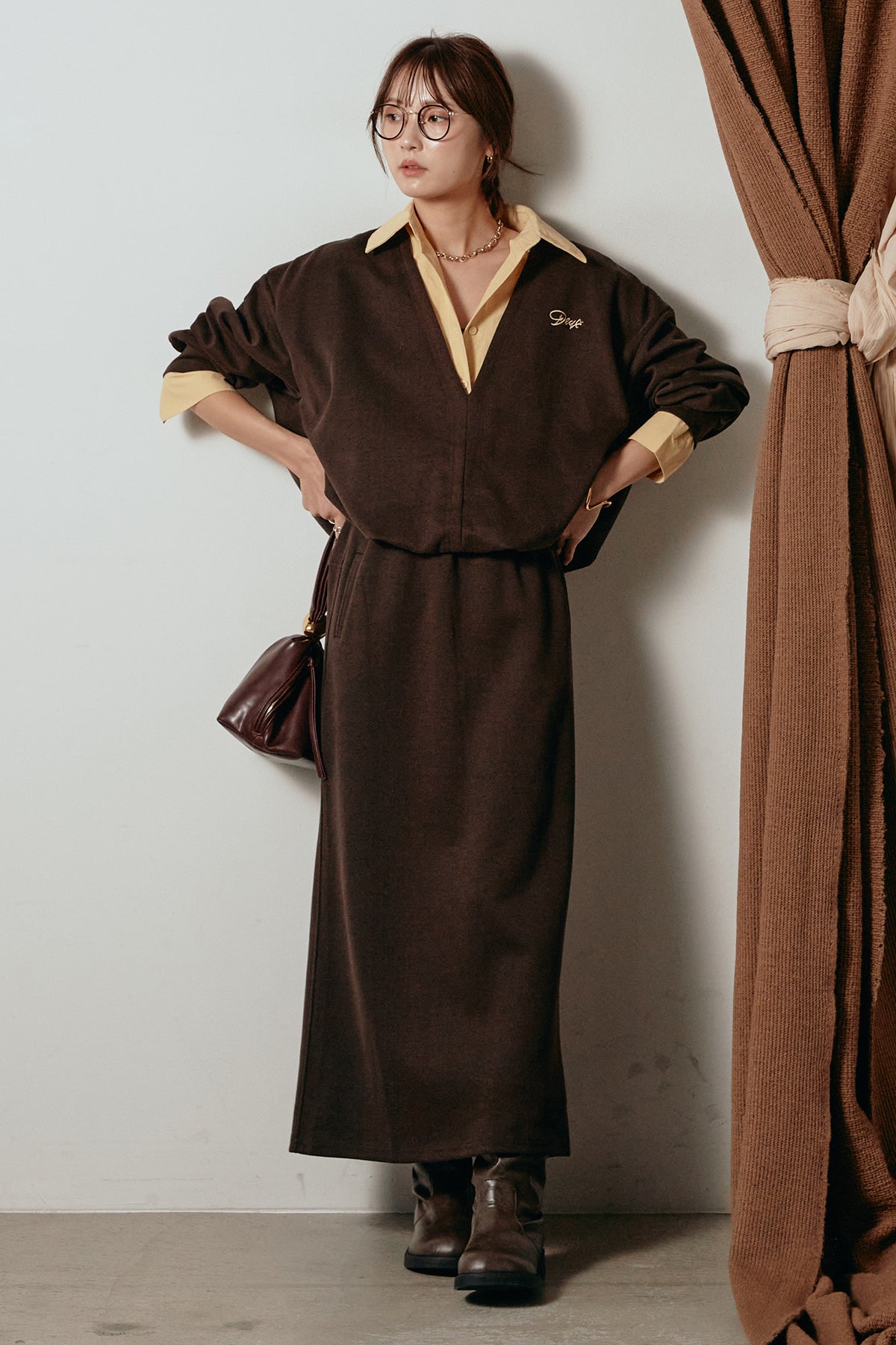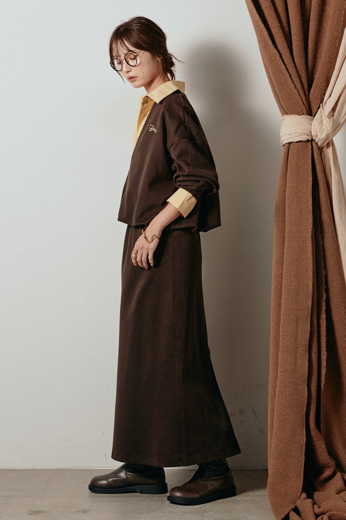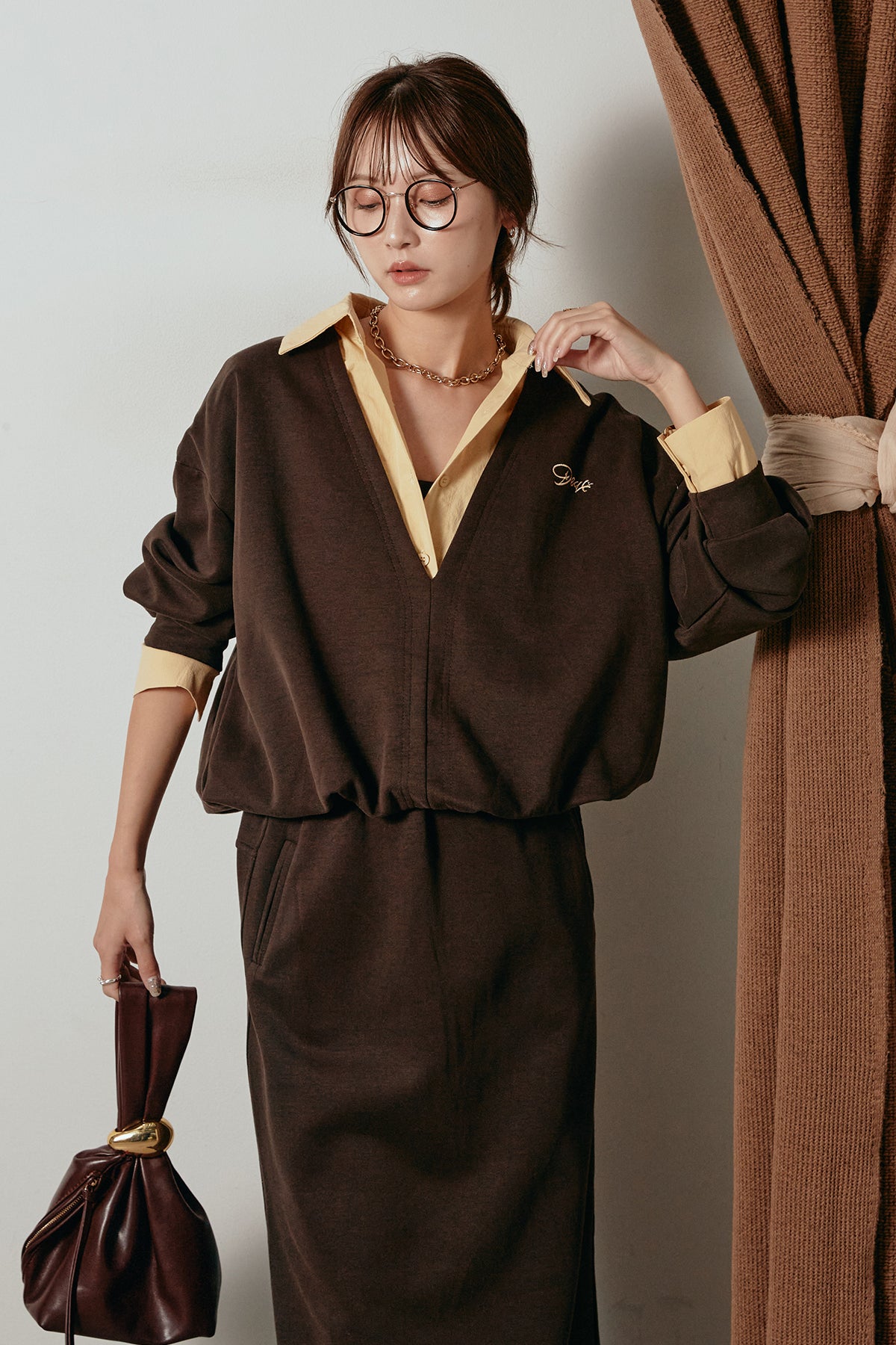 シャツを重ね着したようなドッキングデザインが目を惹くスウェットセットアップ。程よくゆとりのあるトップスと、すっきりとしたIラインスカートのバランスがこなれた印象を与えます。カジュアルなスウェット素材ながらも襟や袖のシャツディテールで品よく仕上げ、1枚で完成度の高いスタイリングが叶うアイテム。デイリーからお出かけまで幅広く活躍します。