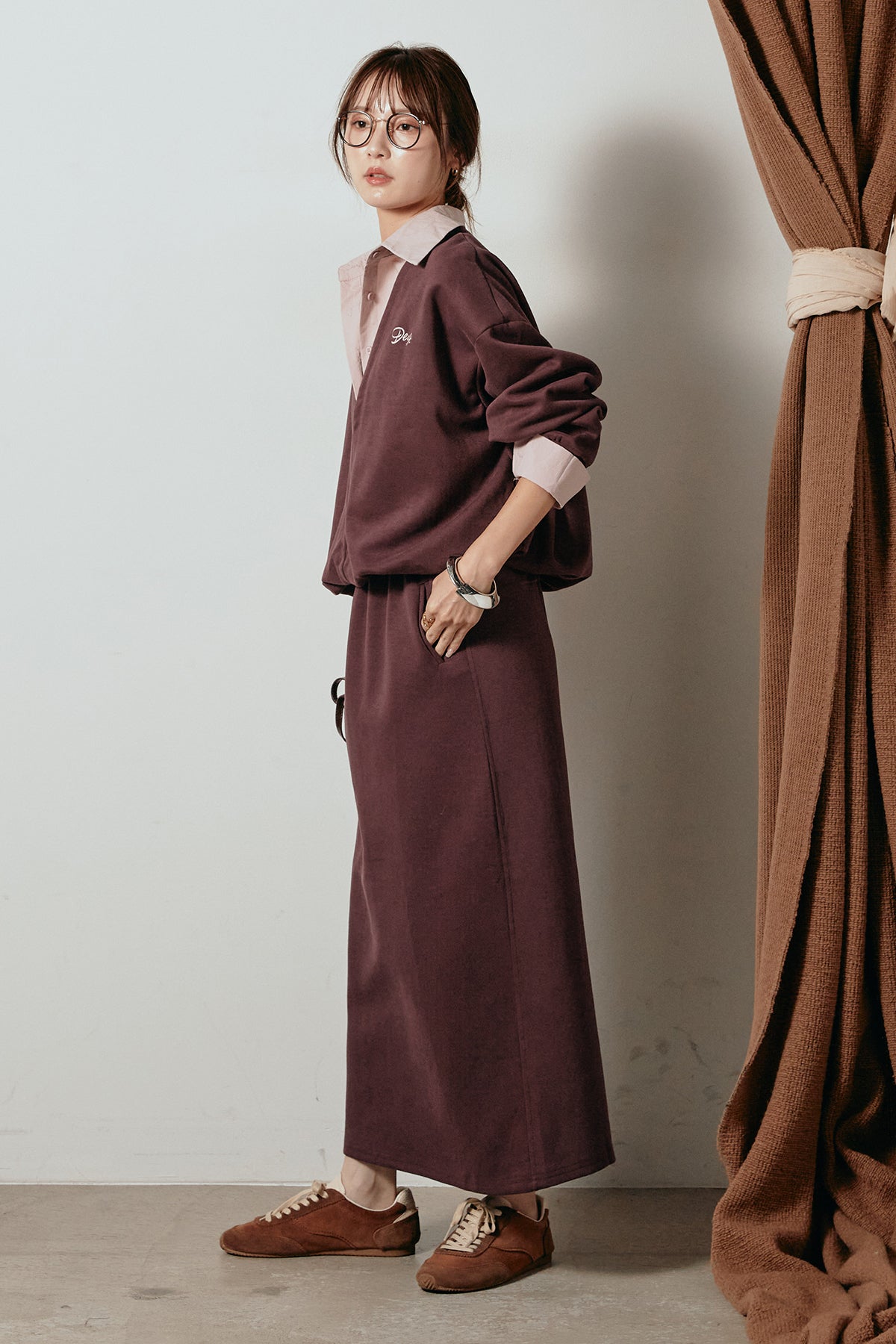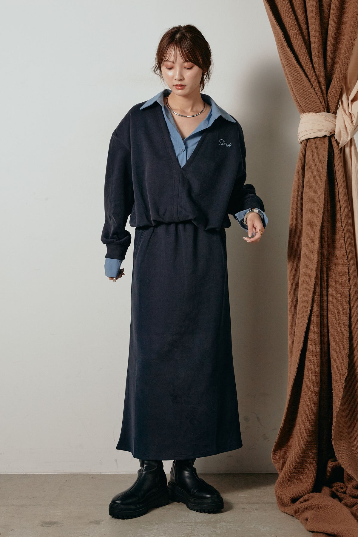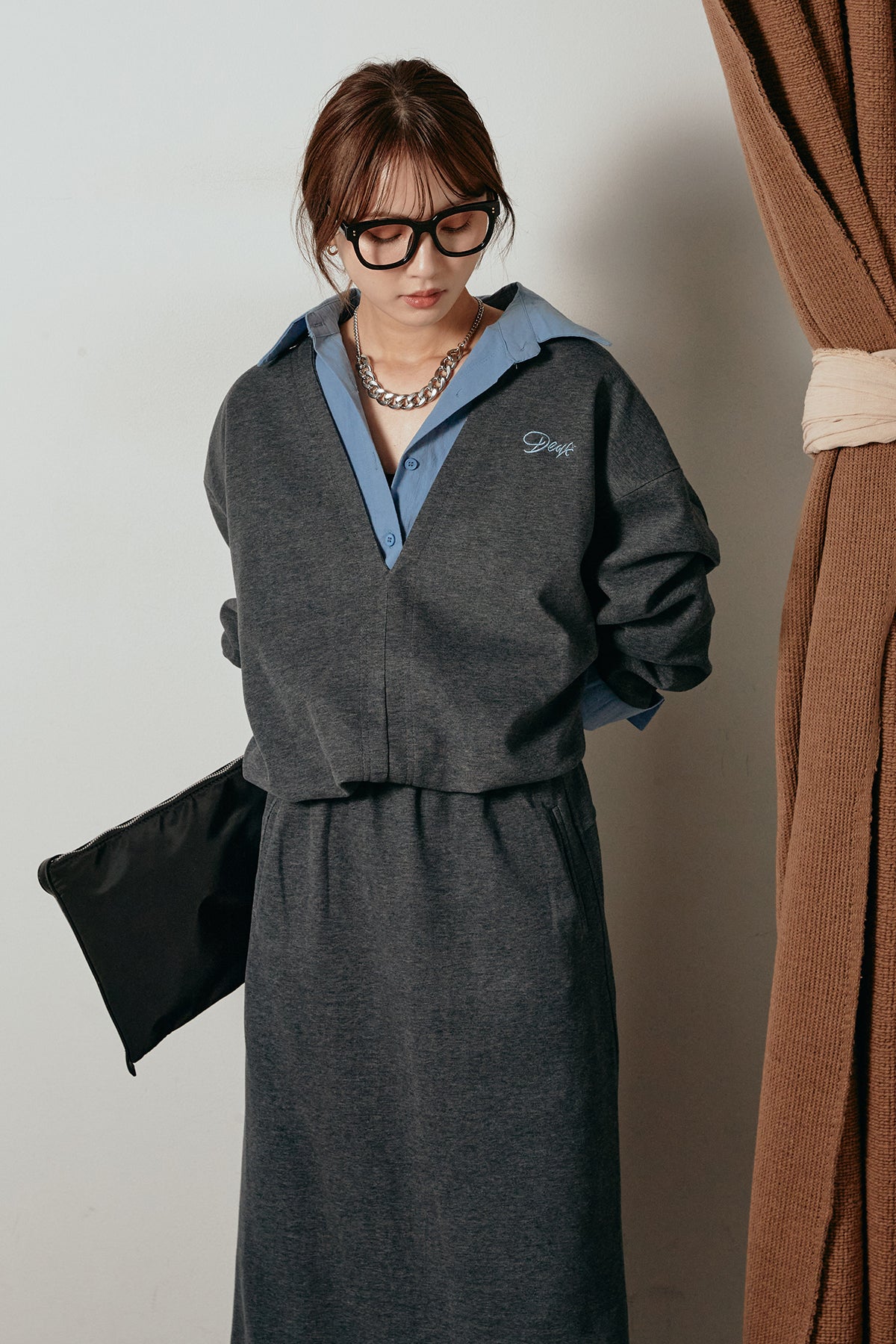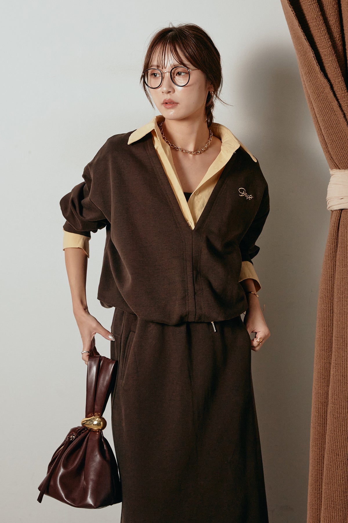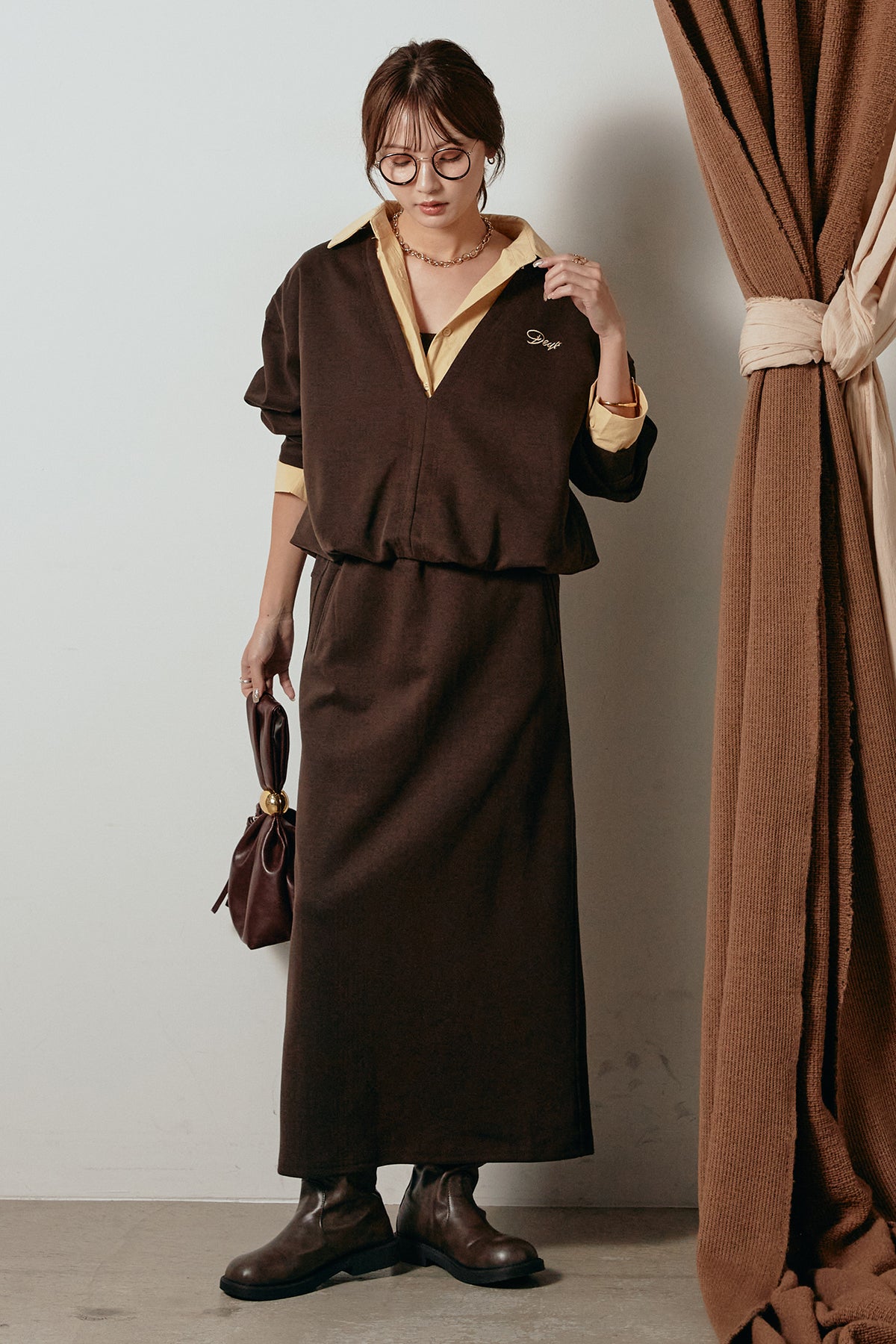 シャツを重ね着したようなドッキングデザインが目を惹くスウェットセットアップ。程よくゆとりのあるトップスと、すっきりとしたIラインスカートのバランスがこなれた印象を与えます。カジュアルなスウェット素材ながらも襟や袖のシャツディテールで品よく仕上げ、1枚で完成度の高いスタイリングが叶うアイテム。デイリーからお出かけまで幅広く活躍します。