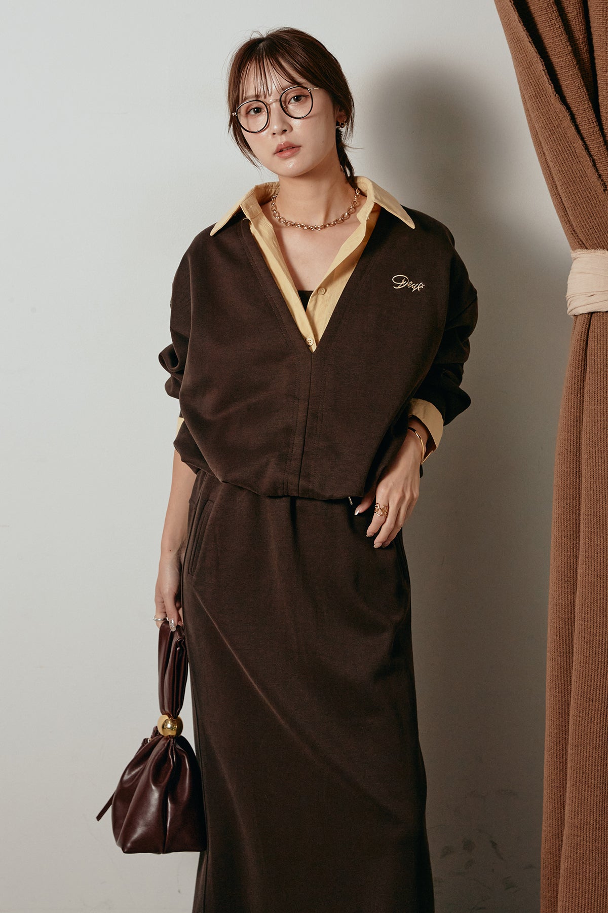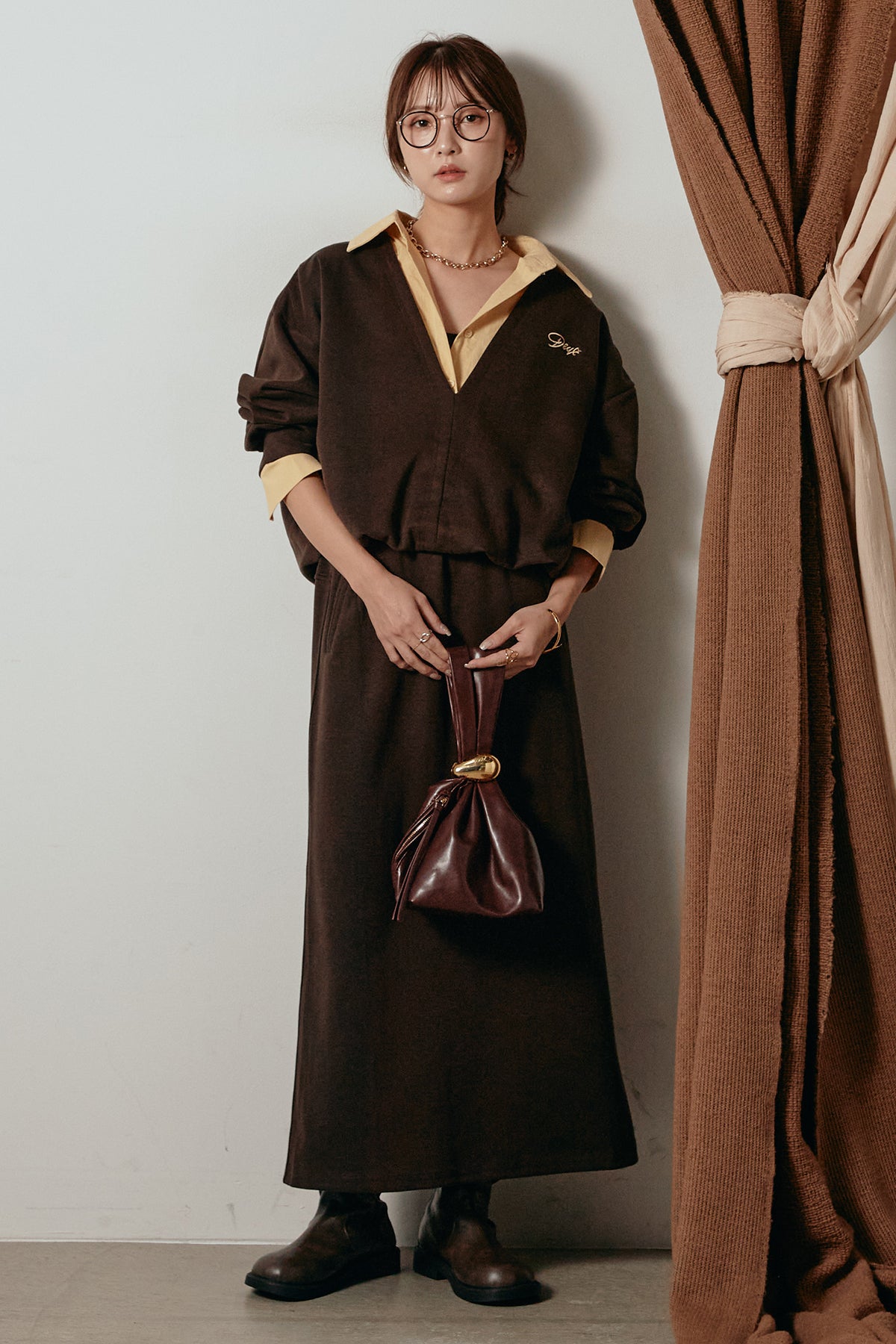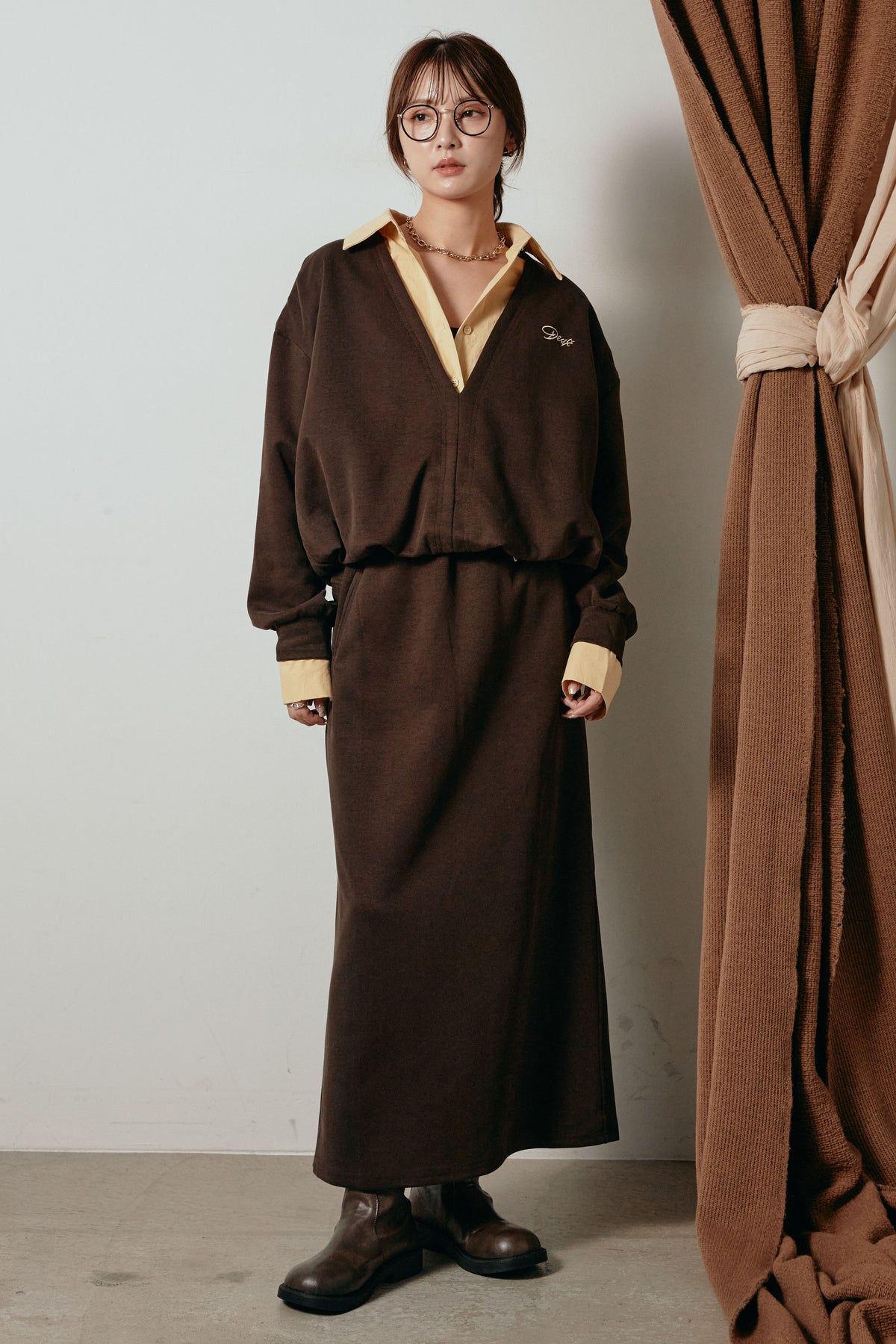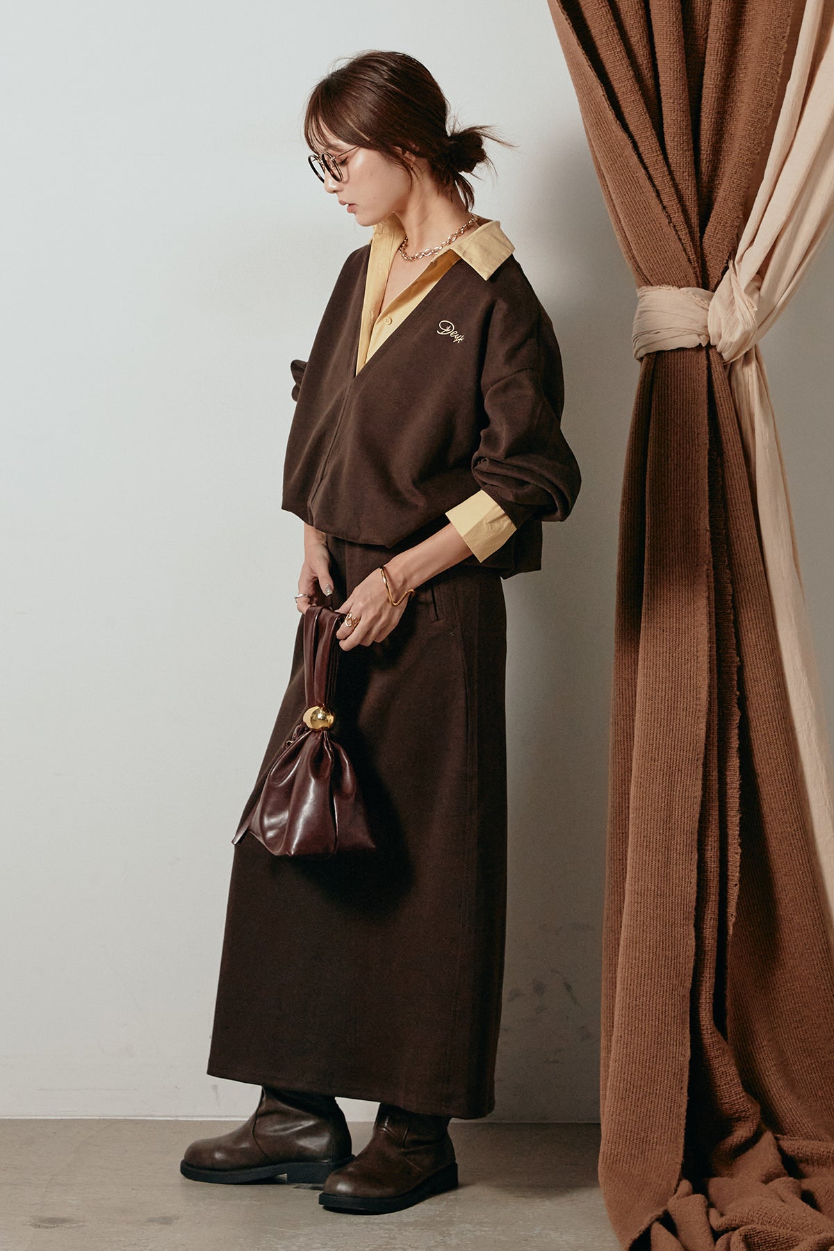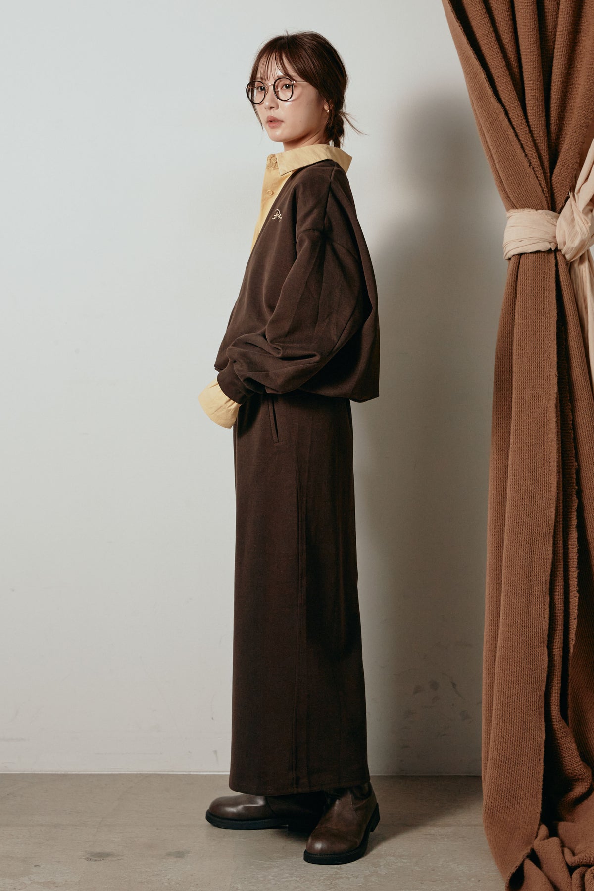 シャツを重ね着したようなドッキングデザインが目を惹くスウェットセットアップ。程よくゆとりのあるトップスと、すっきりとしたIラインスカートのバランスがこなれた印象を与えます。カジュアルなスウェット素材ながらも襟や袖のシャツディテールで品よく仕上げ、1枚で完成度の高いスタイリングが叶うアイテム。デイリーからお出かけまで幅広く活躍します。