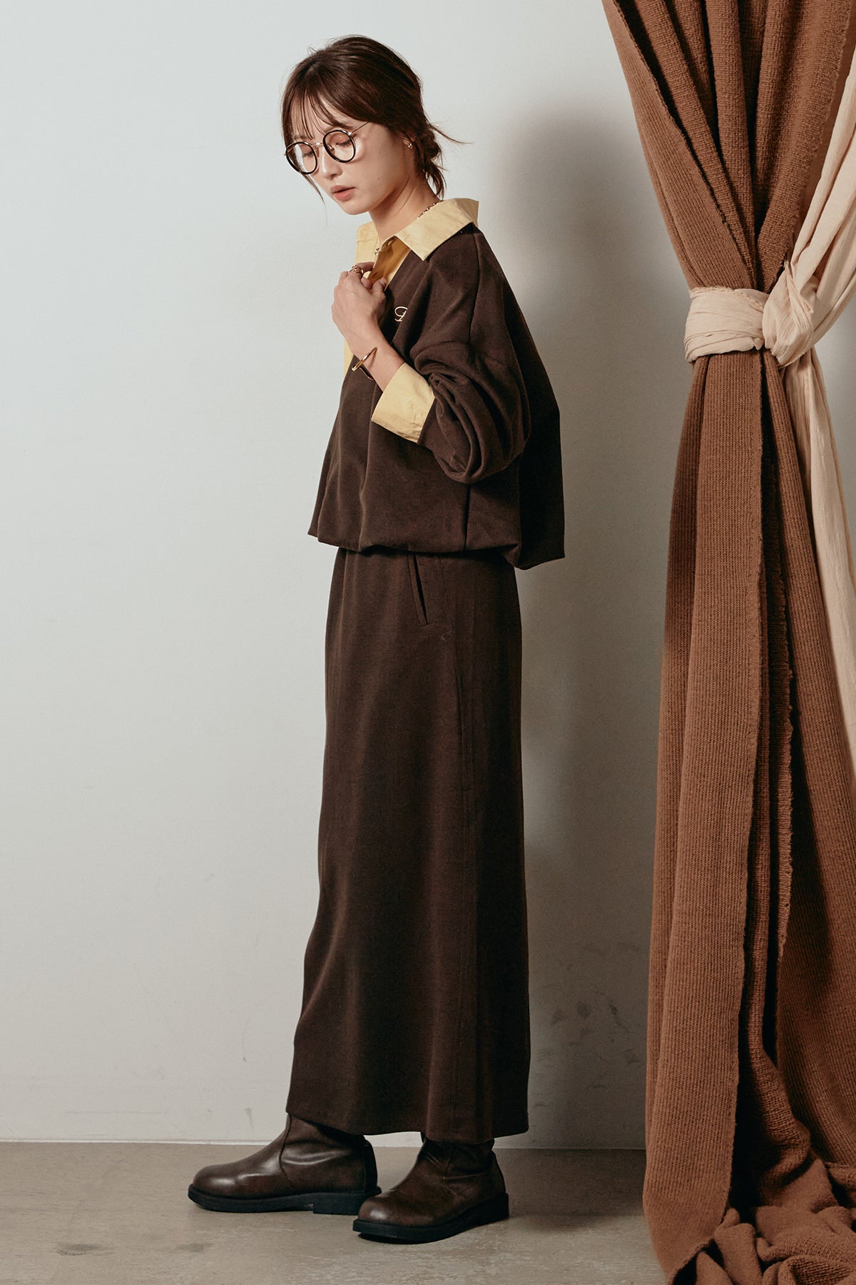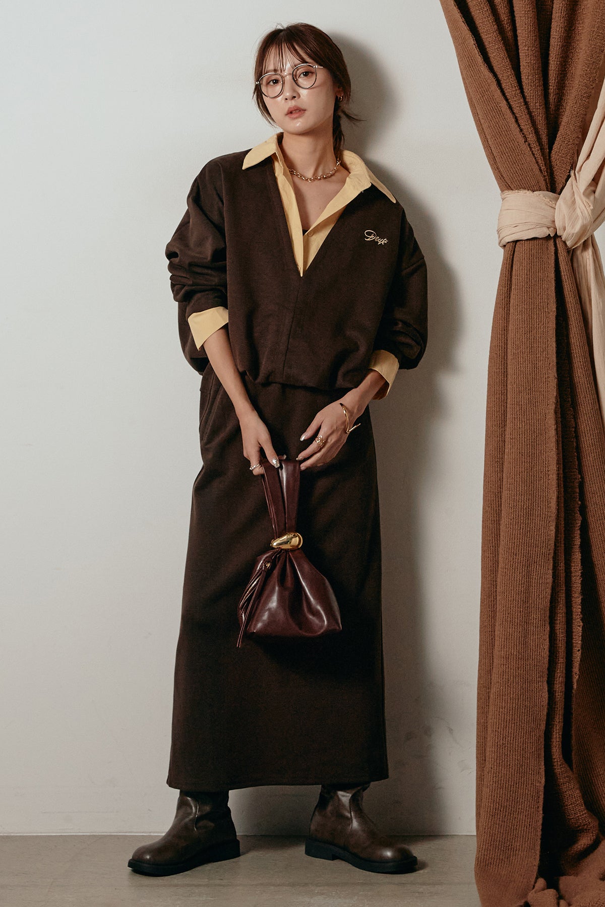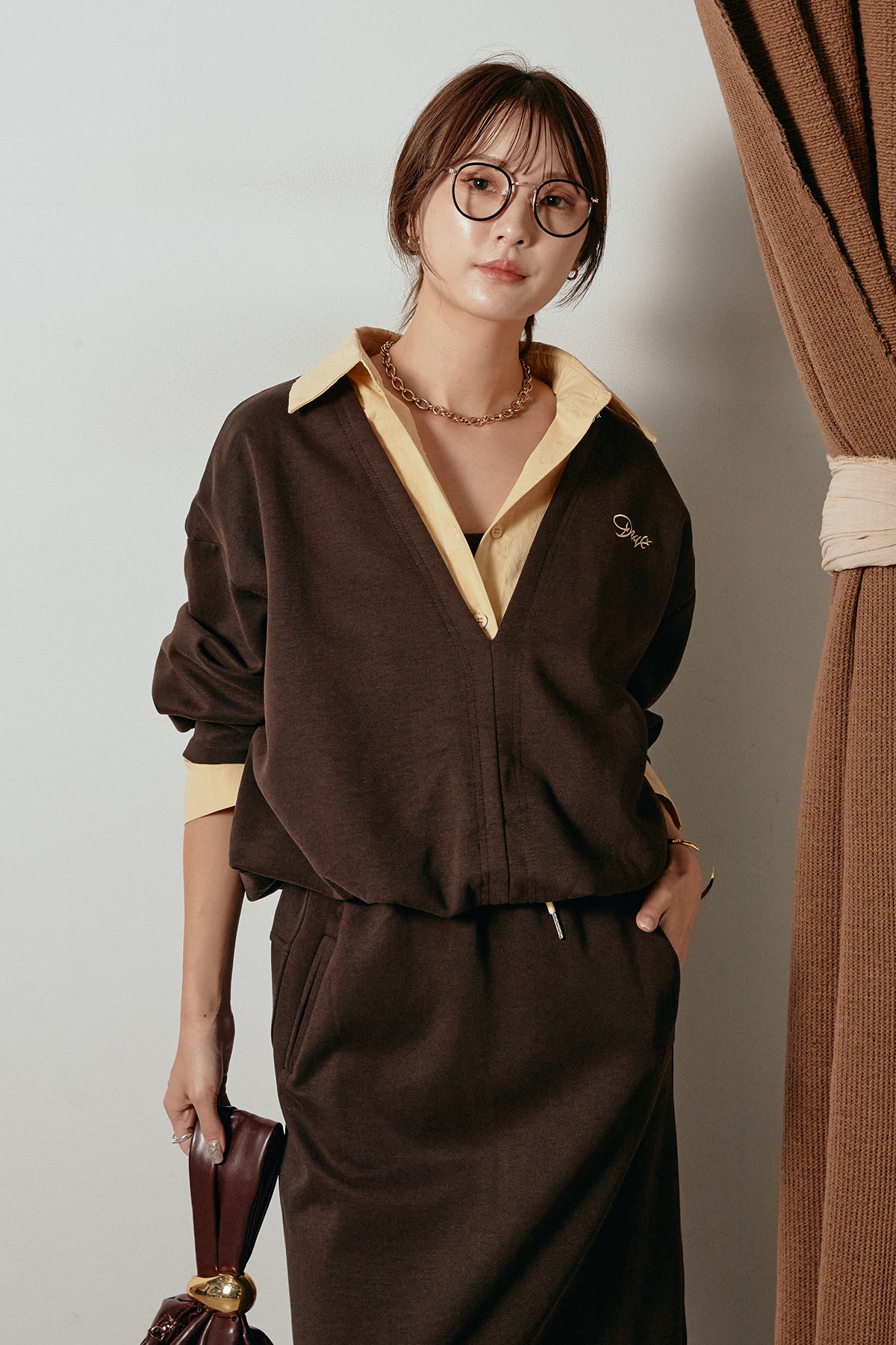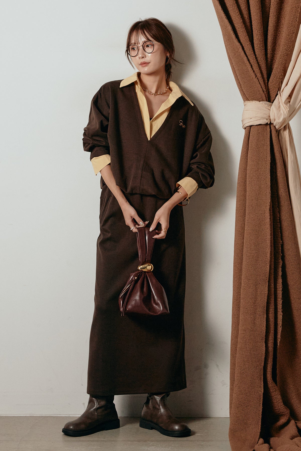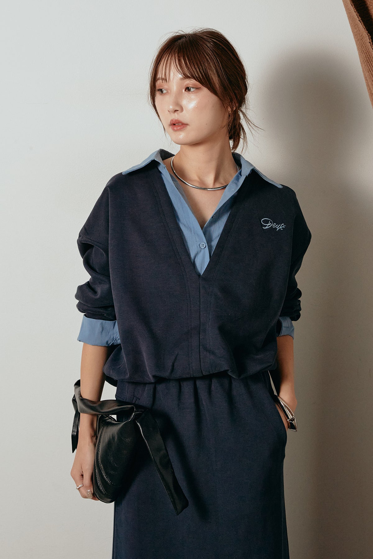 シャツを重ね着したようなドッキングデザインが目を惹くスウェットセットアップ。程よくゆとりのあるトップスと、すっきりとしたIラインスカートのバランスがこなれた印象を与えます。カジュアルなスウェット素材ながらも襟や袖のシャツディテールで品よく仕上げ、1枚で完成度の高いスタイリングが叶うアイテム。デイリーからお出かけまで幅広く活躍します。