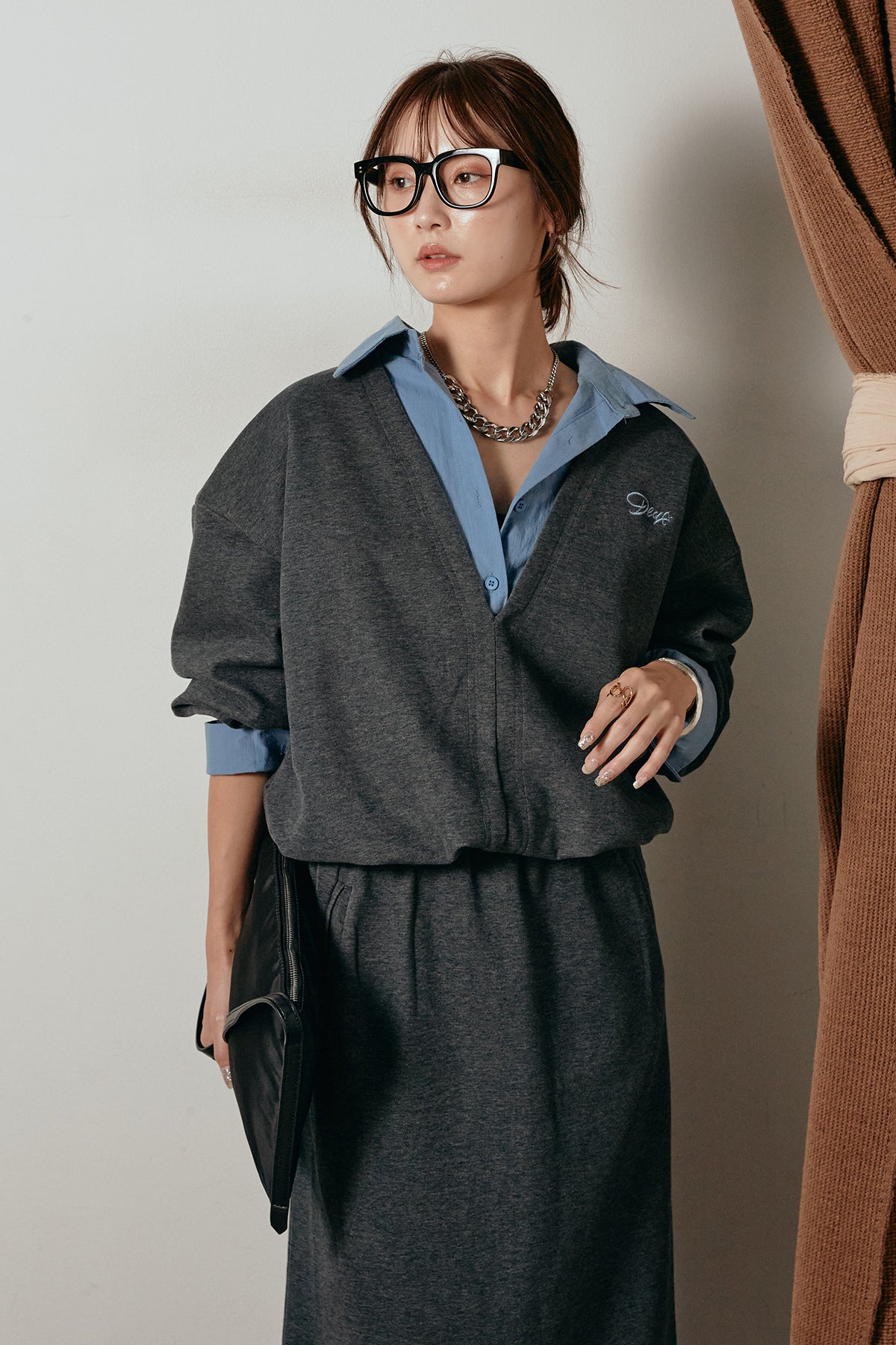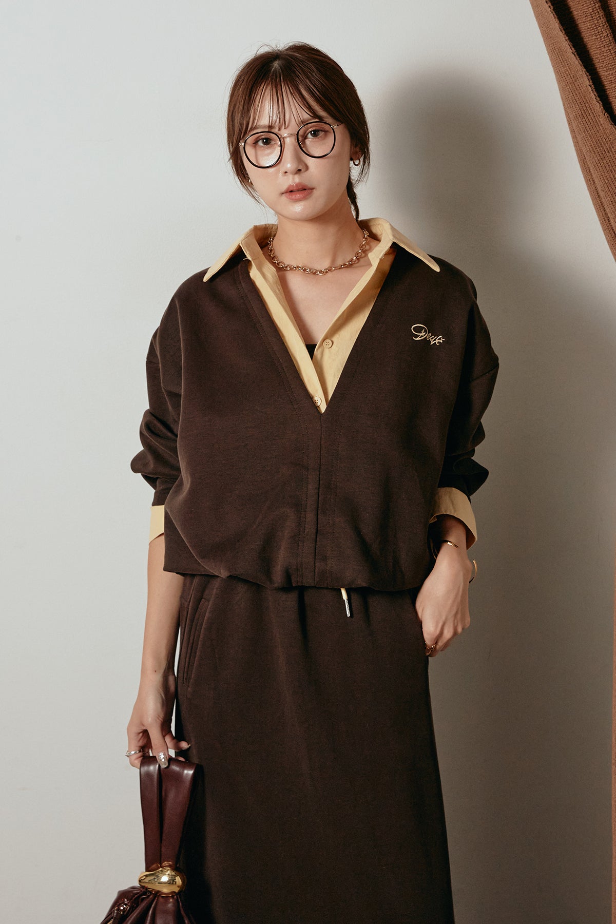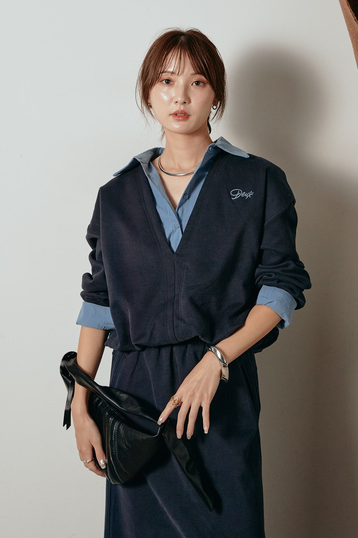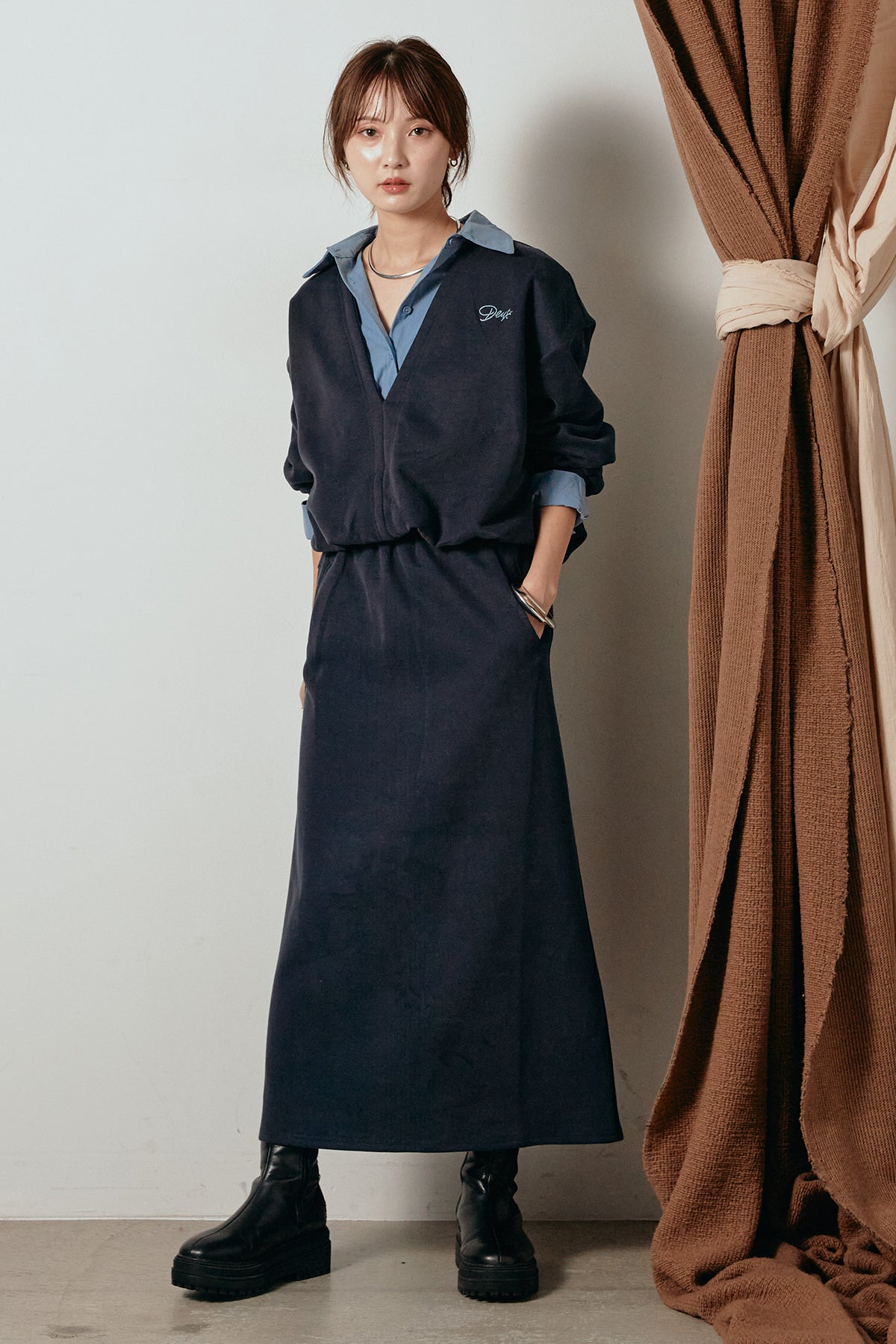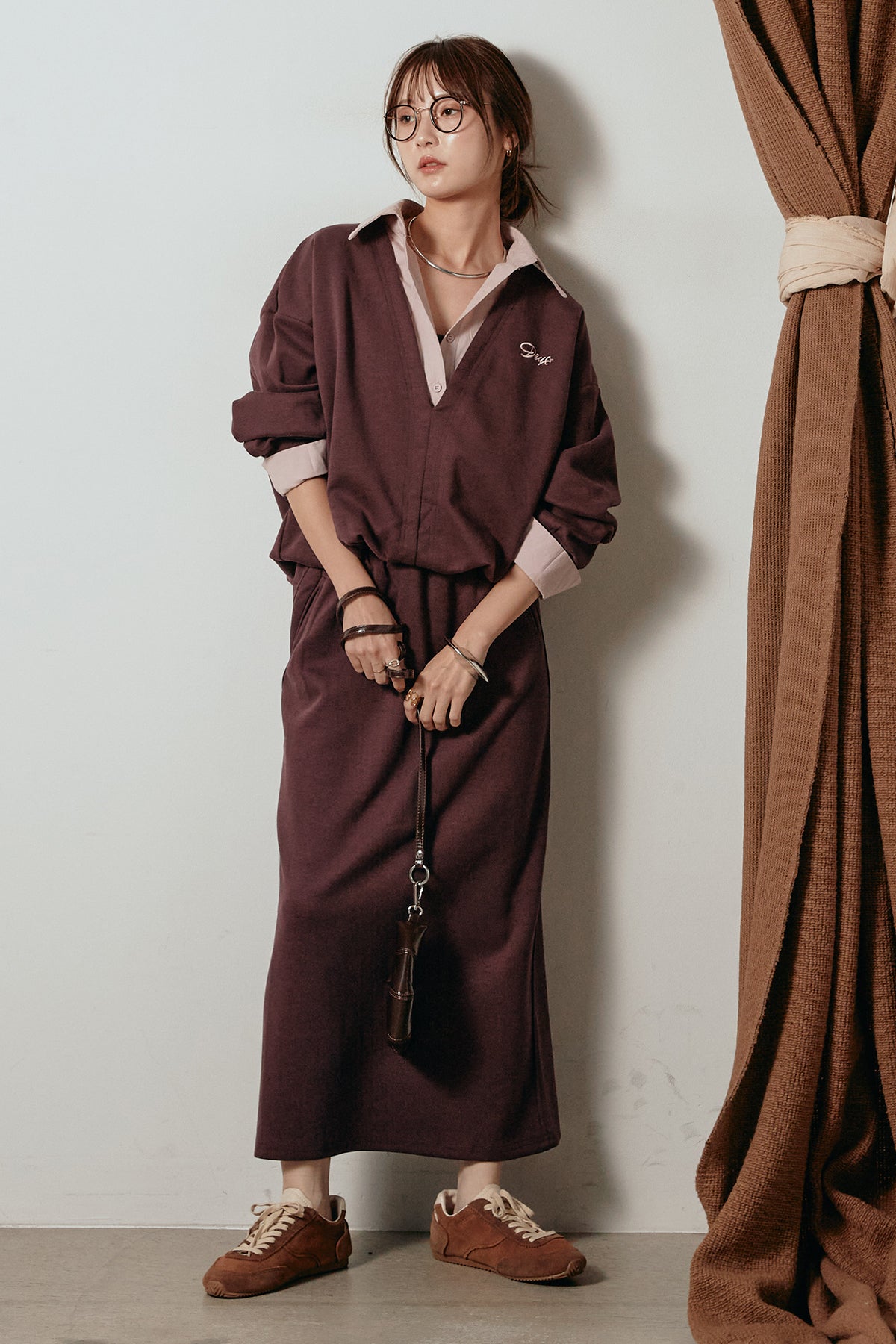 シャツを重ね着したようなドッキングデザインが目を惹くスウェットセットアップ。程よくゆとりのあるトップスと、すっきりとしたIラインスカートのバランスがこなれた印象を与えます。カジュアルなスウェット素材ながらも襟や袖のシャツディテールで品よく仕上げ、1枚で完成度の高いスタイリングが叶うアイテム。デイリーからお出かけまで幅広く活躍します。