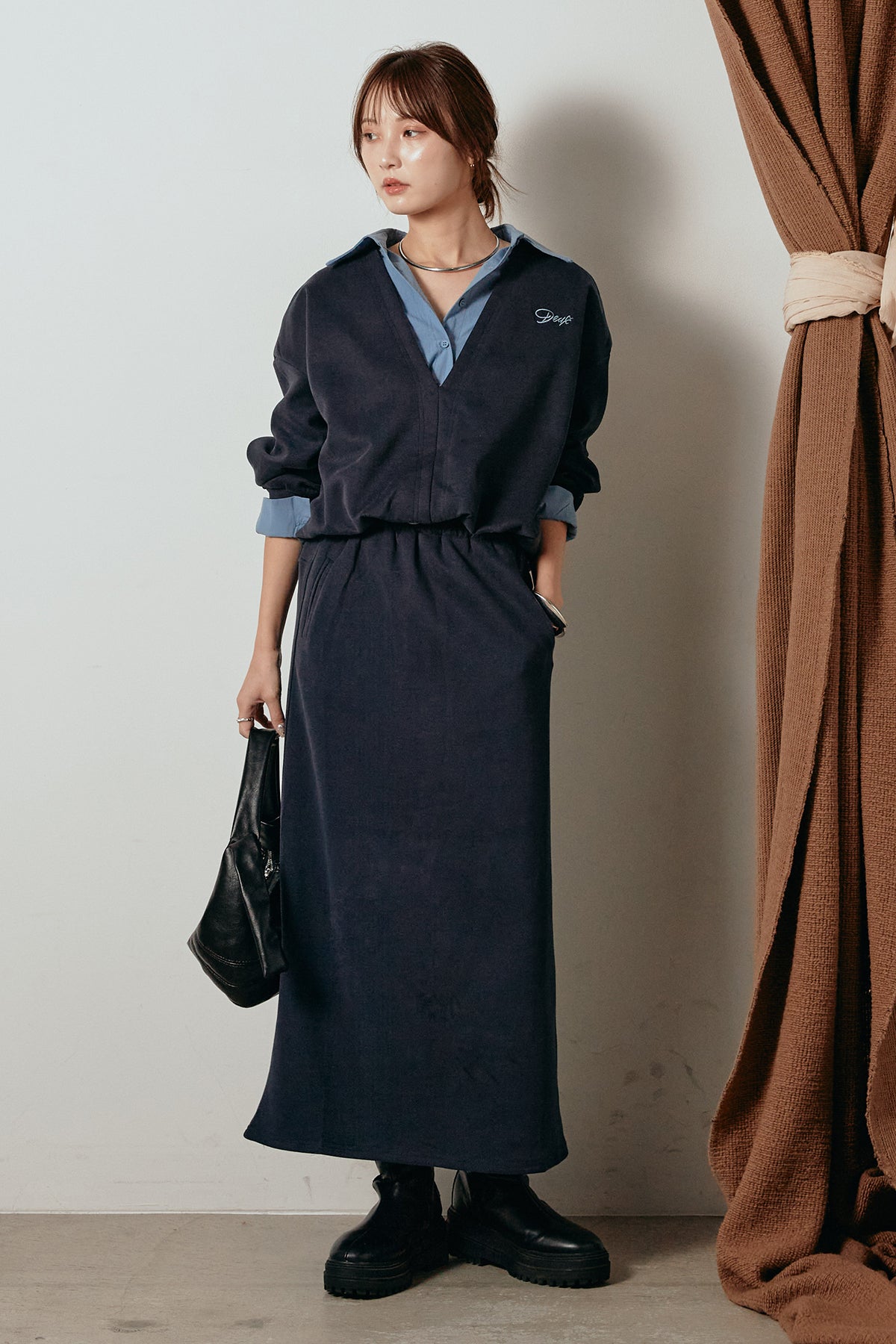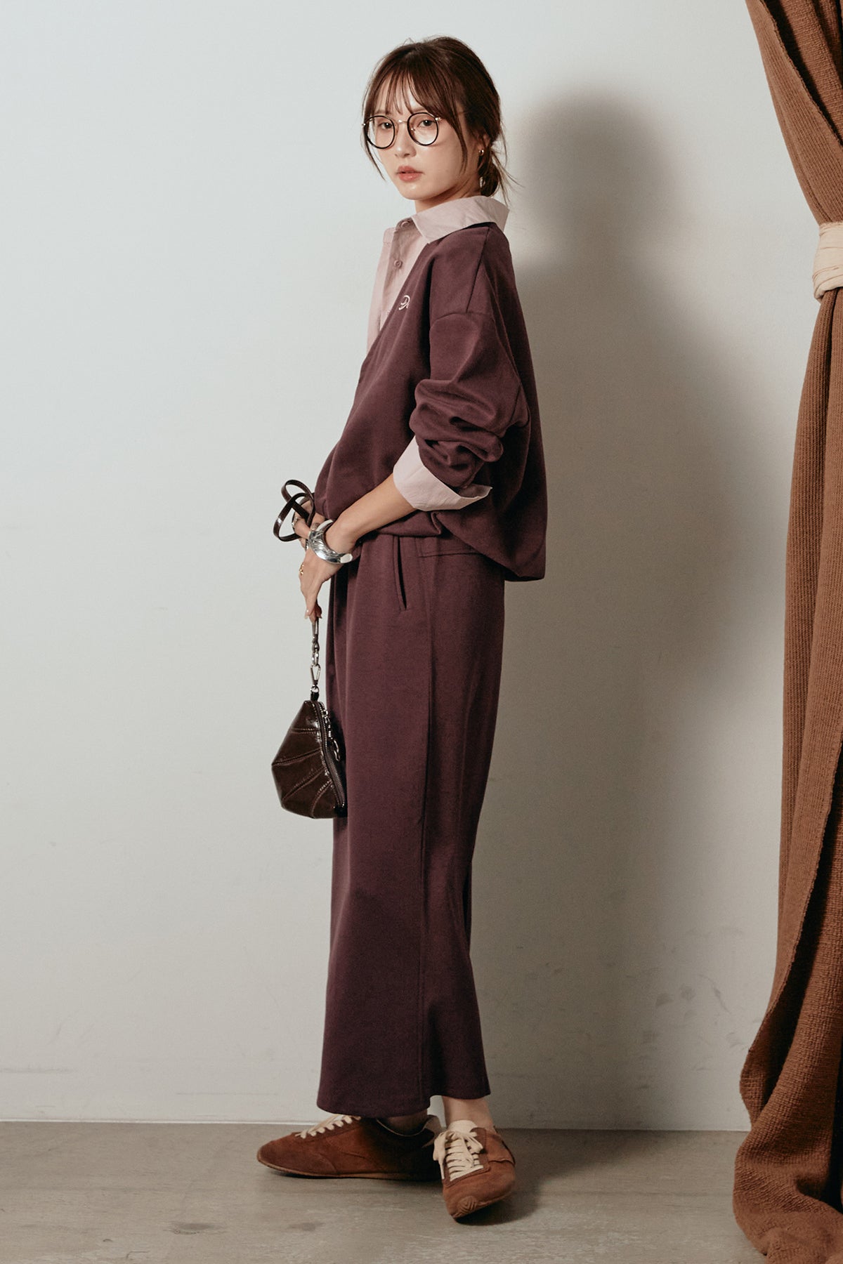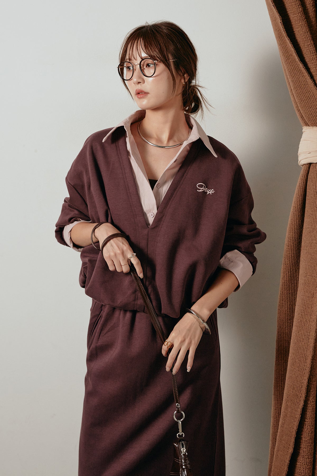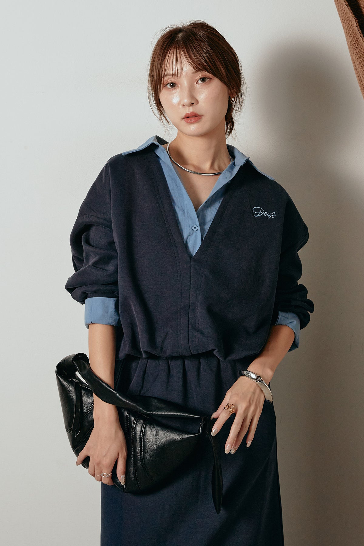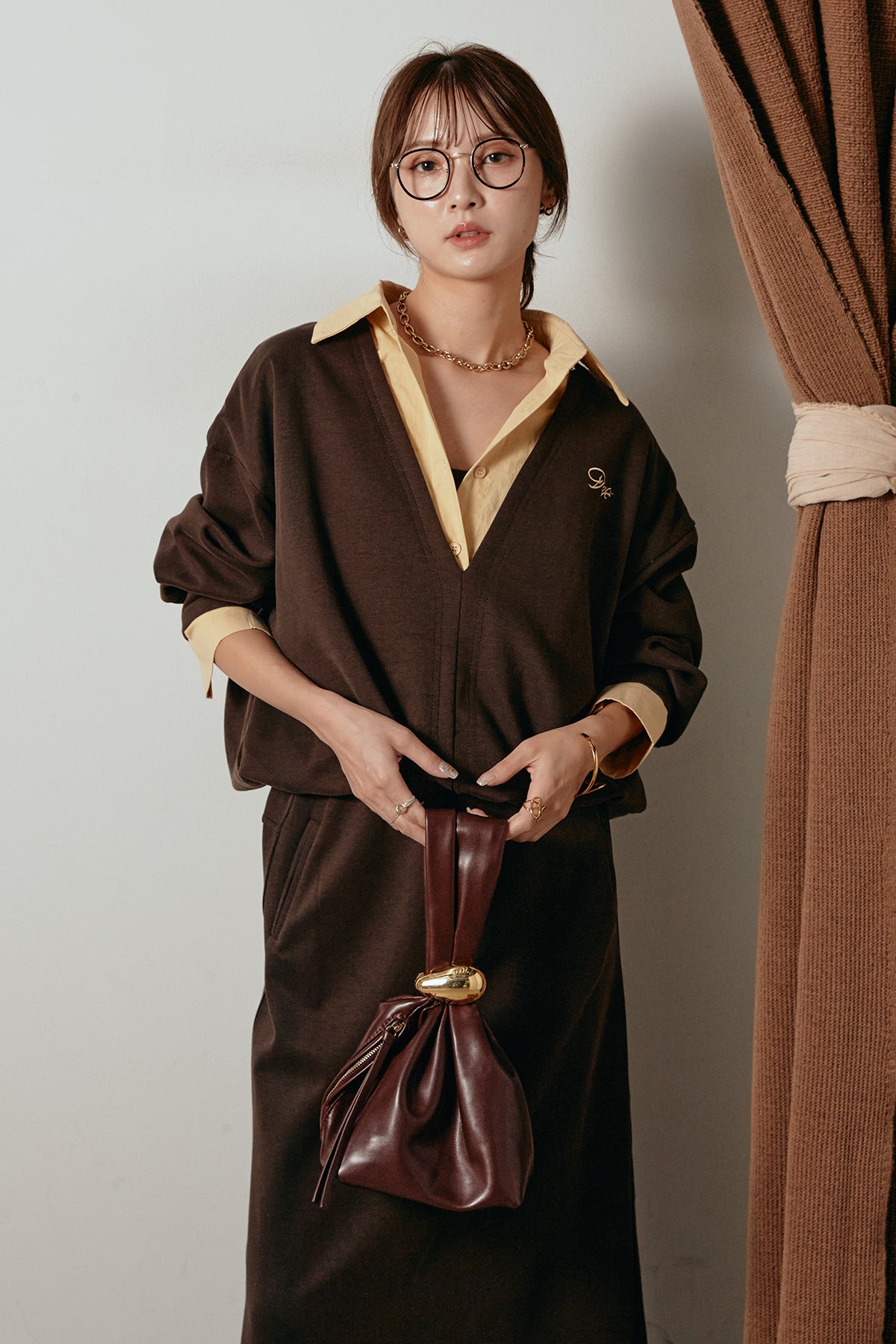 シャツを重ね着したようなドッキングデザインが目を惹くスウェットセットアップ。程よくゆとりのあるトップスと、すっきりとしたIラインスカートのバランスがこなれた印象を与えます。カジュアルなスウェット素材ながらも襟や袖のシャツディテールで品よく仕上げ、1枚で完成度の高いスタイリングが叶うアイテム。デイリーからお出かけまで幅広く活躍します。