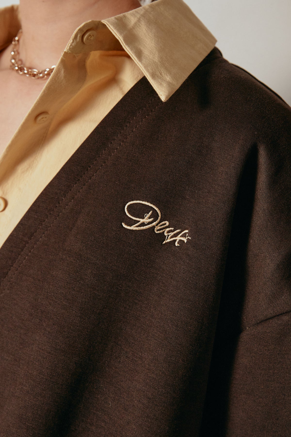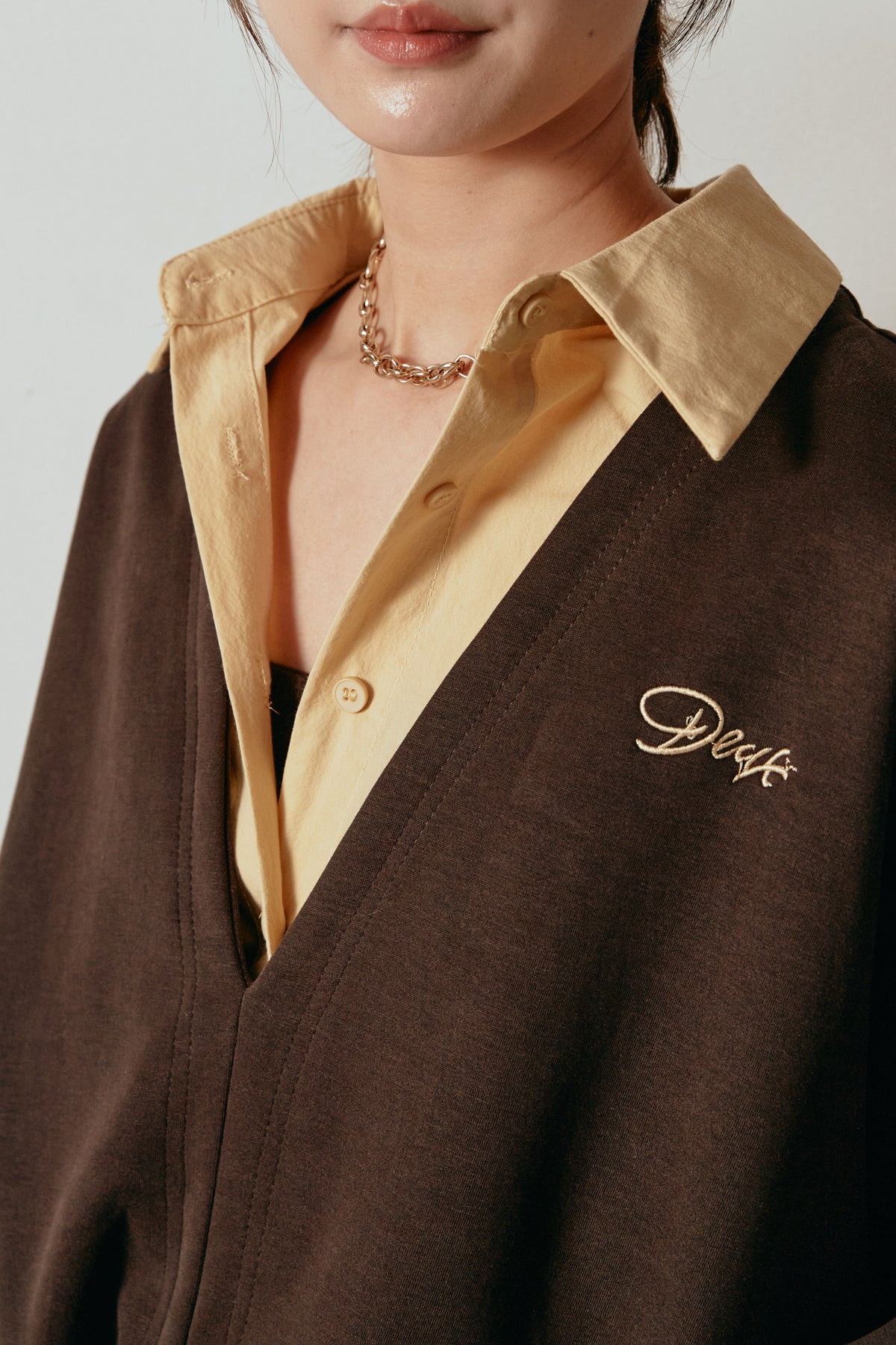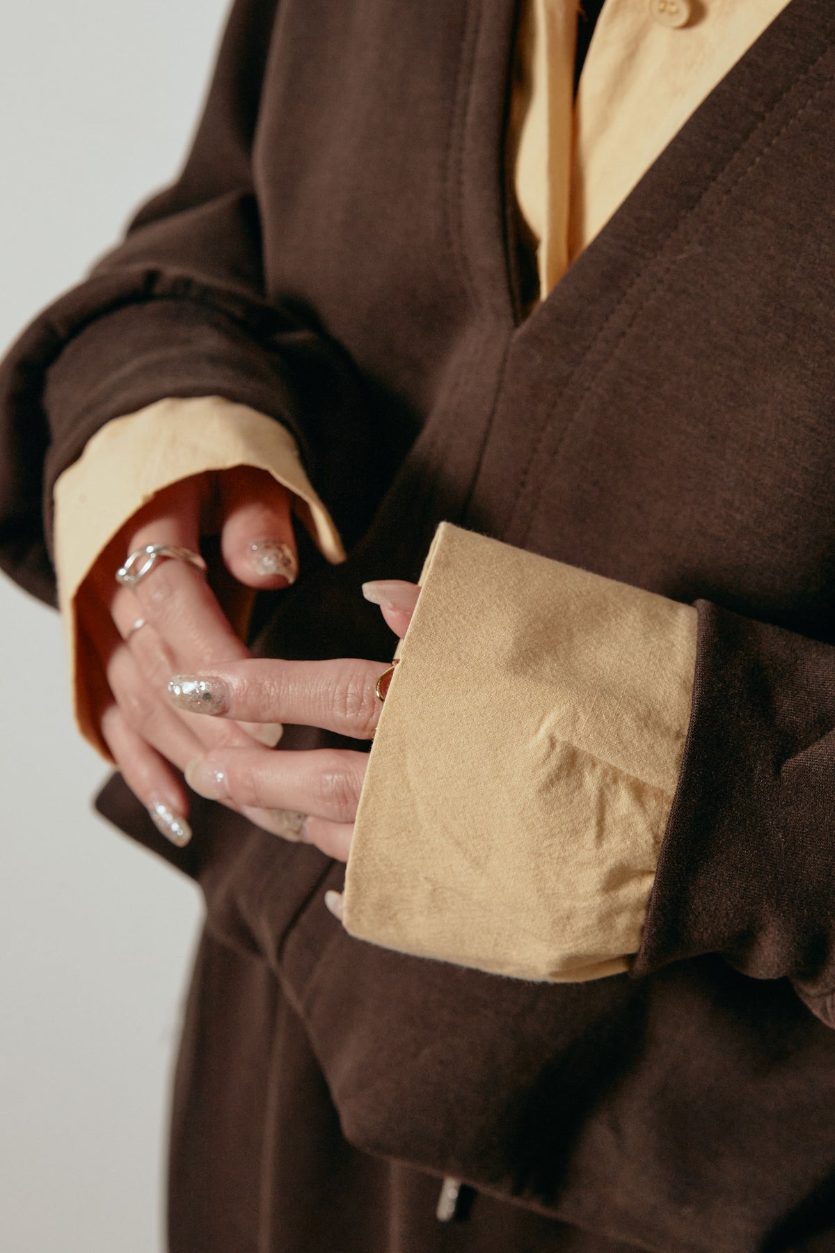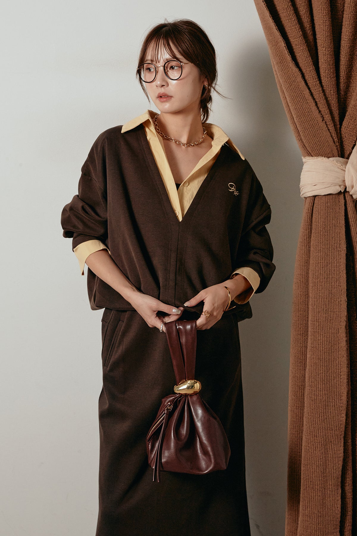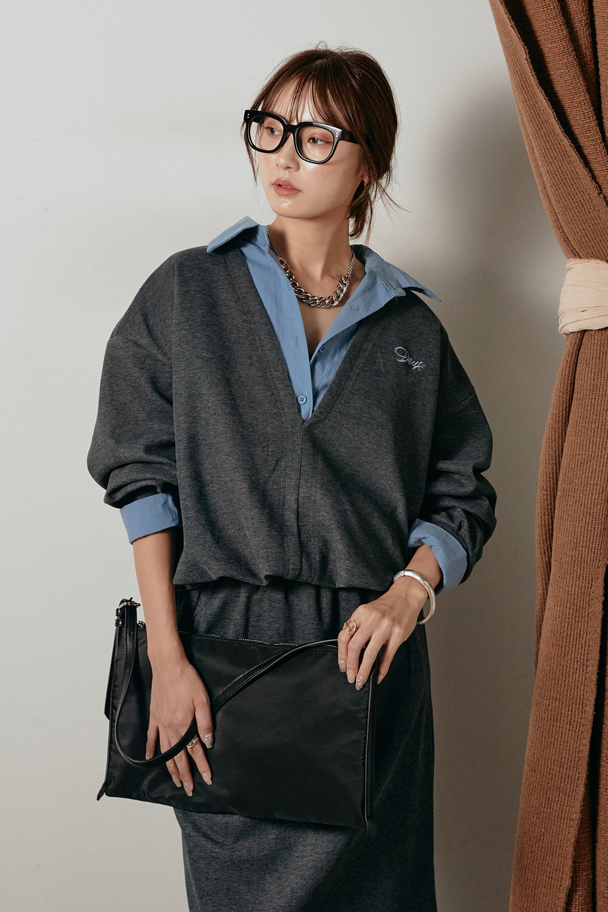 シャツを重ね着したようなドッキングデザインが目を惹くスウェットセットアップ。程よくゆとりのあるトップスと、すっきりとしたIラインスカートのバランスがこなれた印象を与えます。カジュアルなスウェット素材ながらも襟や袖のシャツディテールで品よく仕上げ、1枚で完成度の高いスタイリングが叶うアイテム。デイリーからお出かけまで幅広く活躍します。