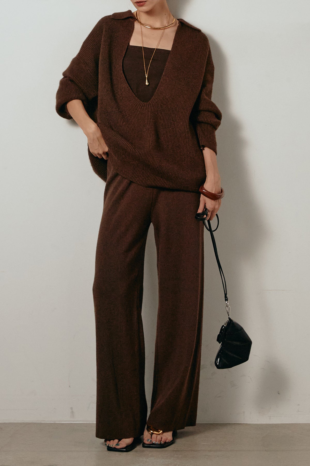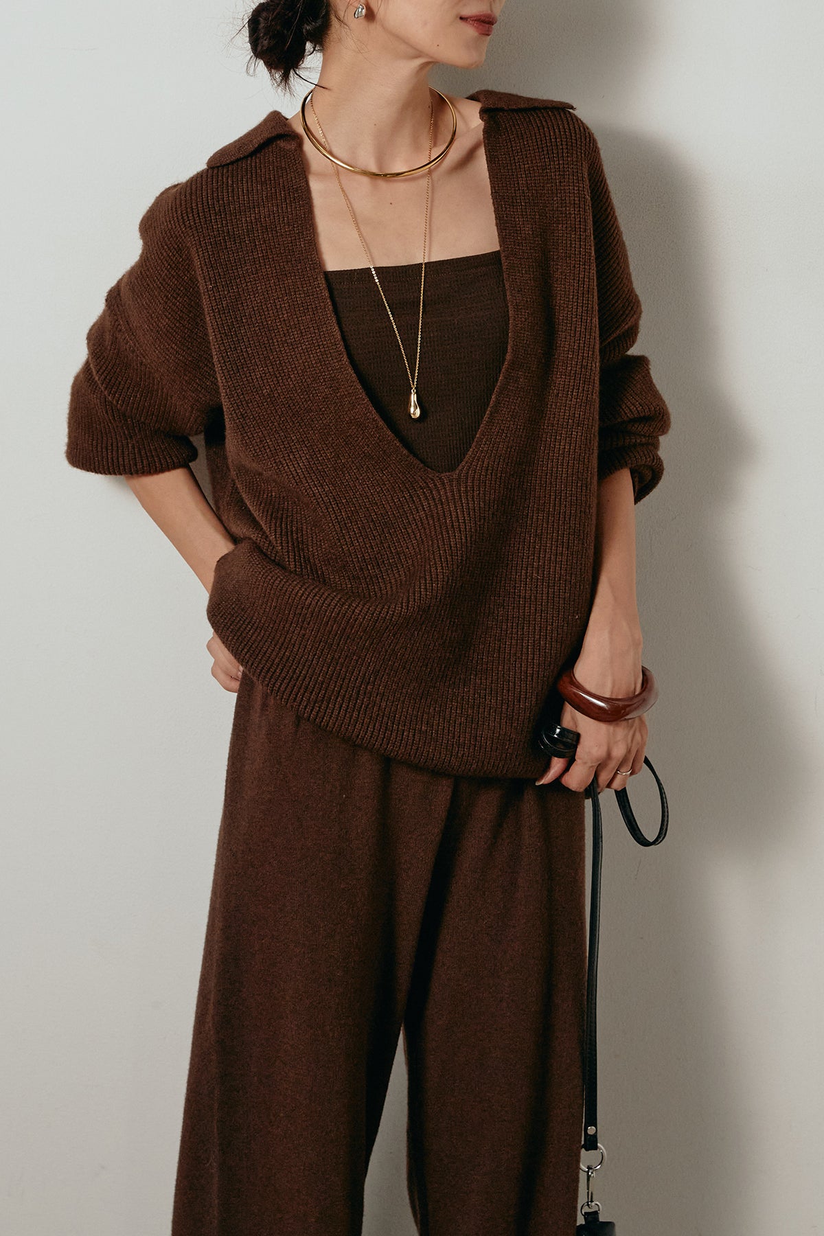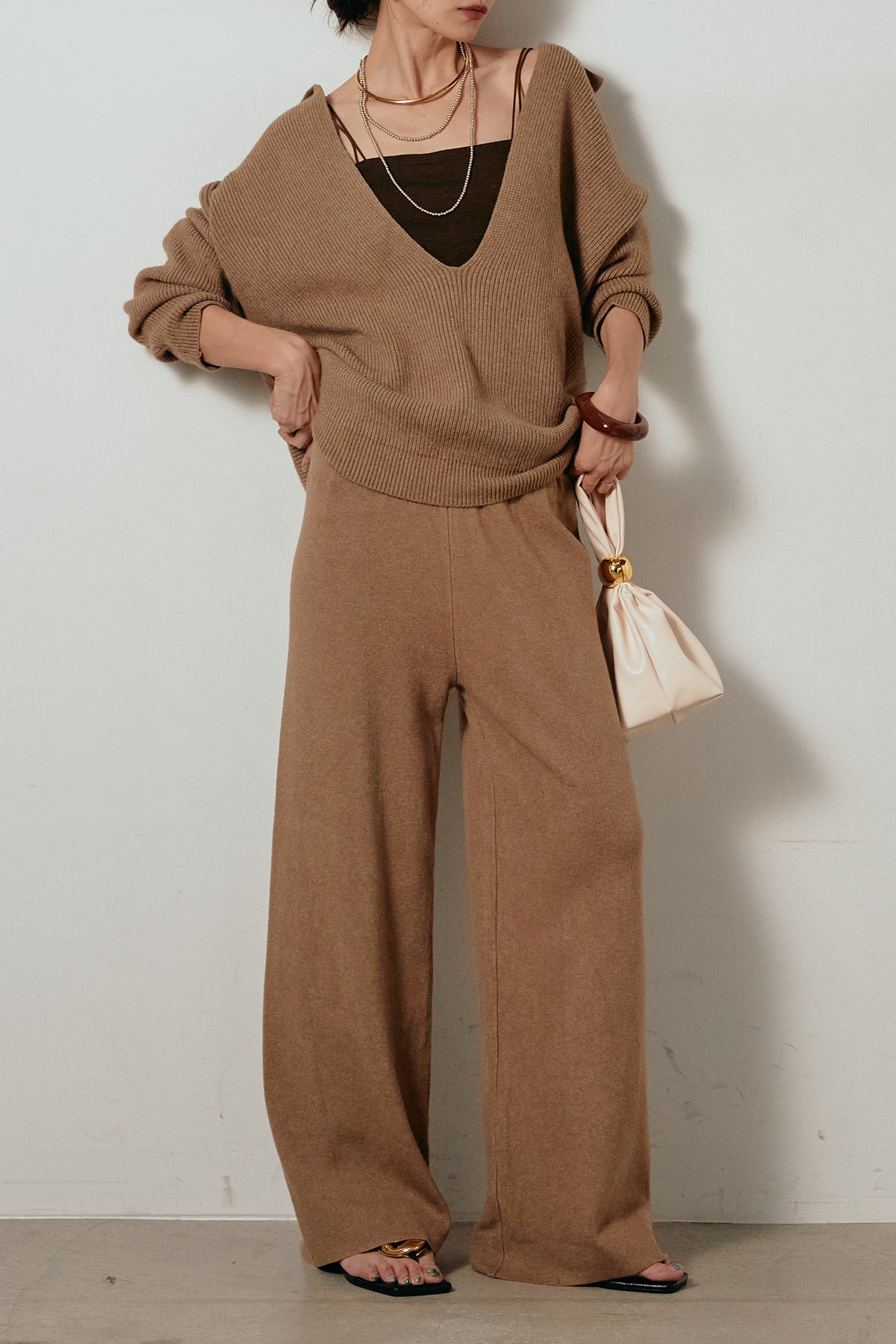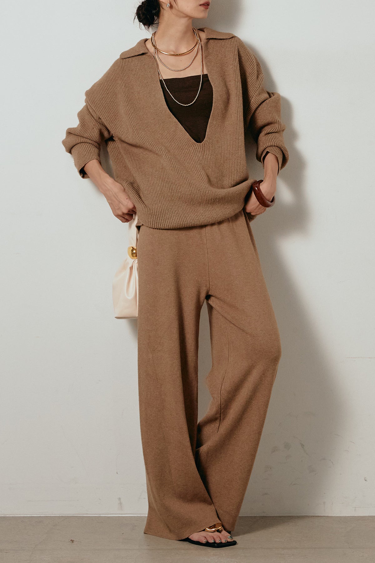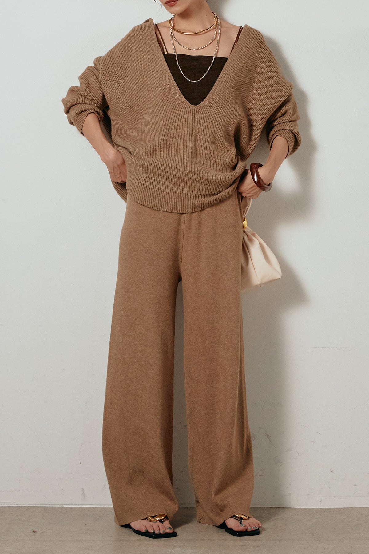 ざっくりとした編地が特徴の深Vネックニットセットアップ。トップスはデコルテがきれいに見える深めのVラインに太ベルトを合わせ、ウエストマークができるバランスの取れたシルエットに。パンツはゆるやかなストレートラインで抜け感をプラス。単品使いでも着回しやすく、ラフさと上品さを兼ね備えたアイテムです。