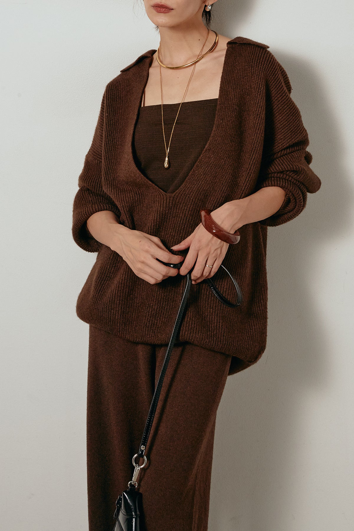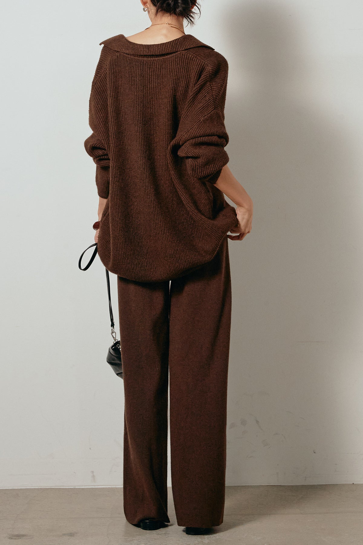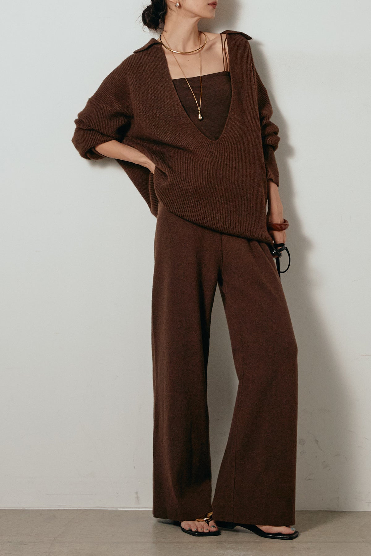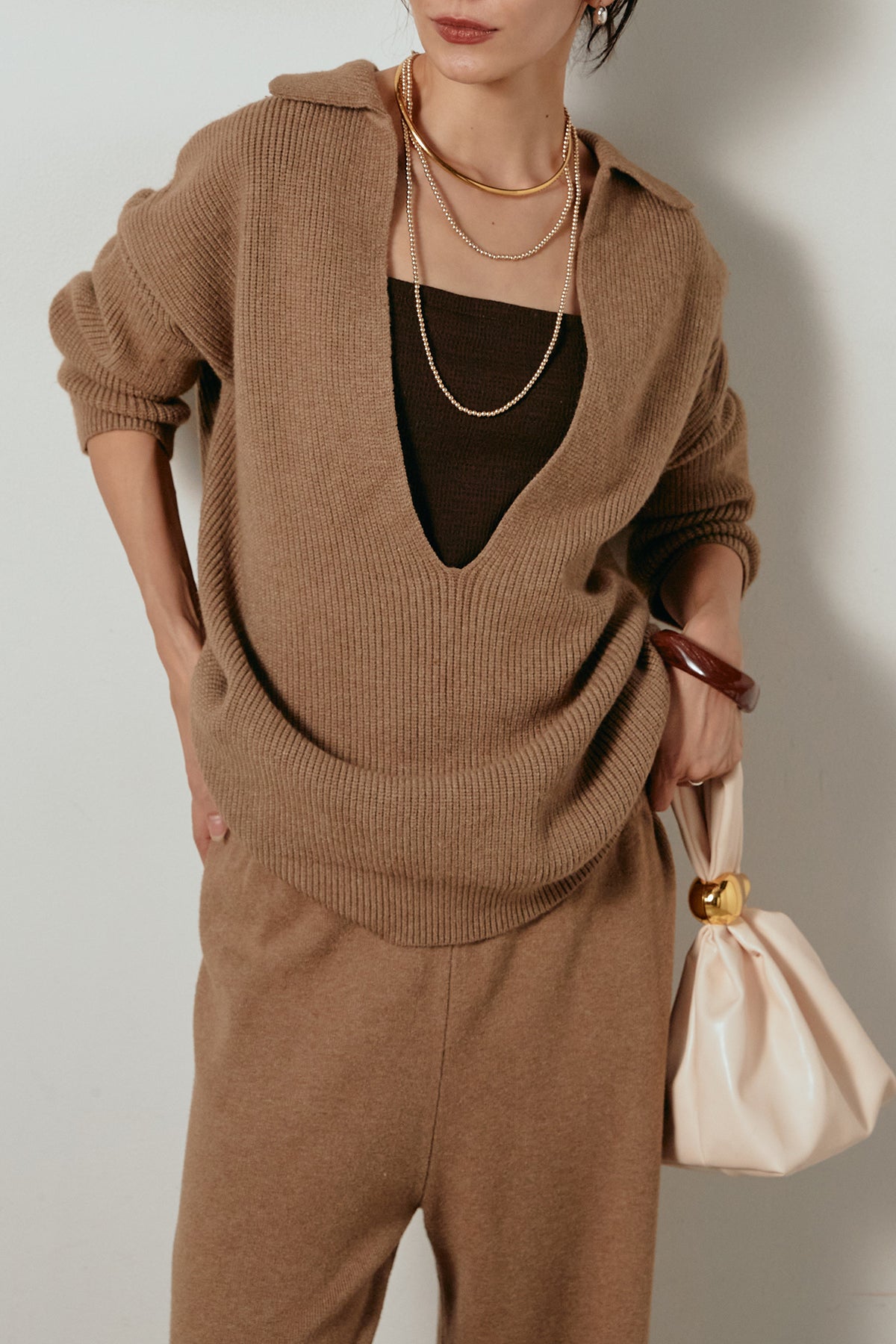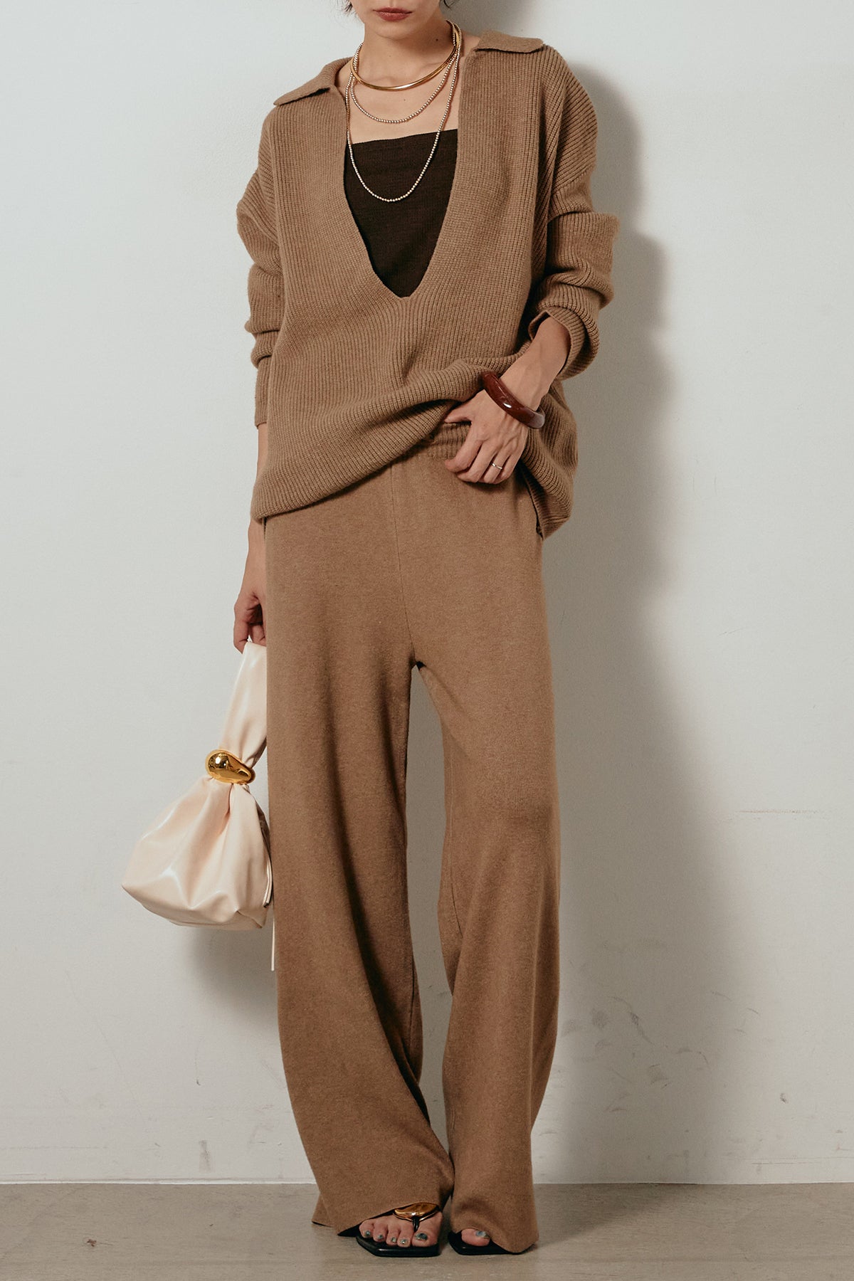ざっくりとした編地が特徴の深Vネックニットセットアップ。トップスはデコルテがきれいに見える深めのVラインに太ベルトを合わせ、ウエストマークができるバランスの取れたシルエットに。パンツはゆるやかなストレートラインで抜け感をプラス。単品使いでも着回しやすく、ラフさと上品さを兼ね備えたアイテムです。