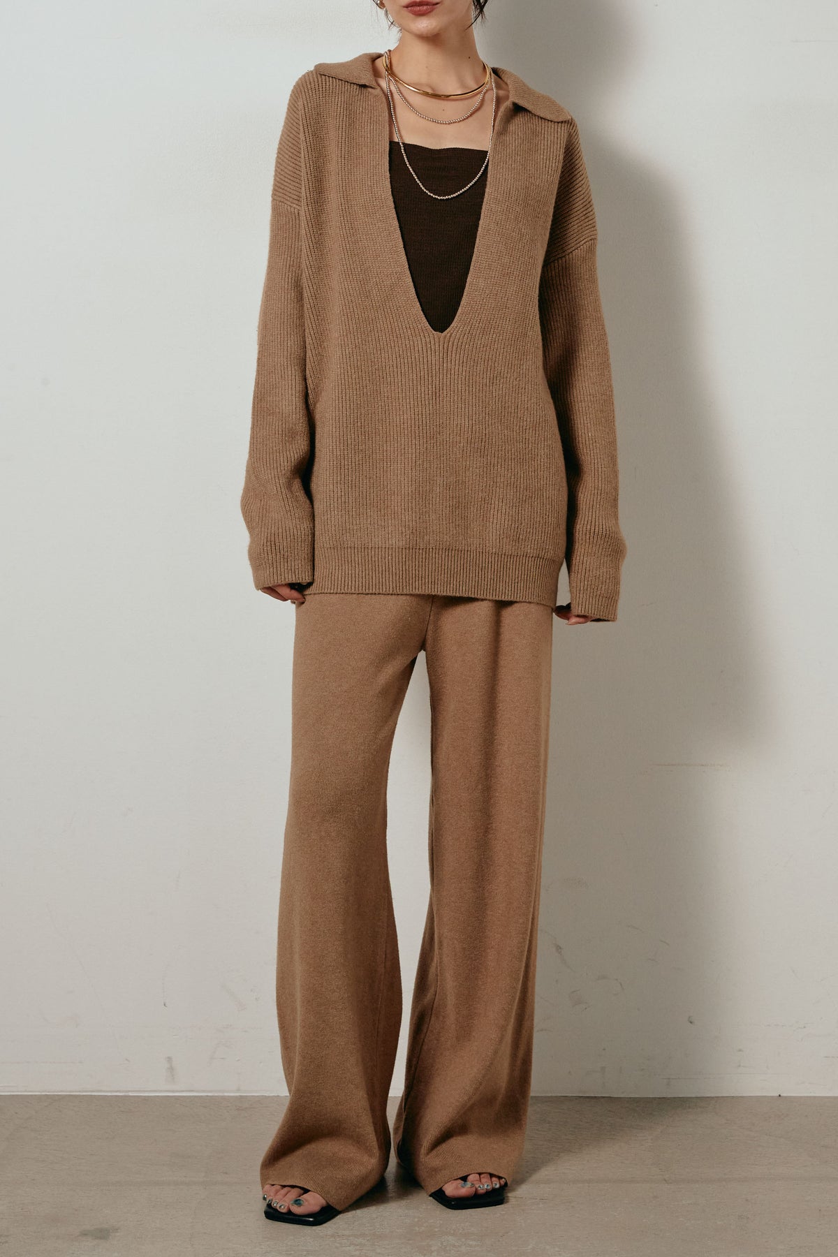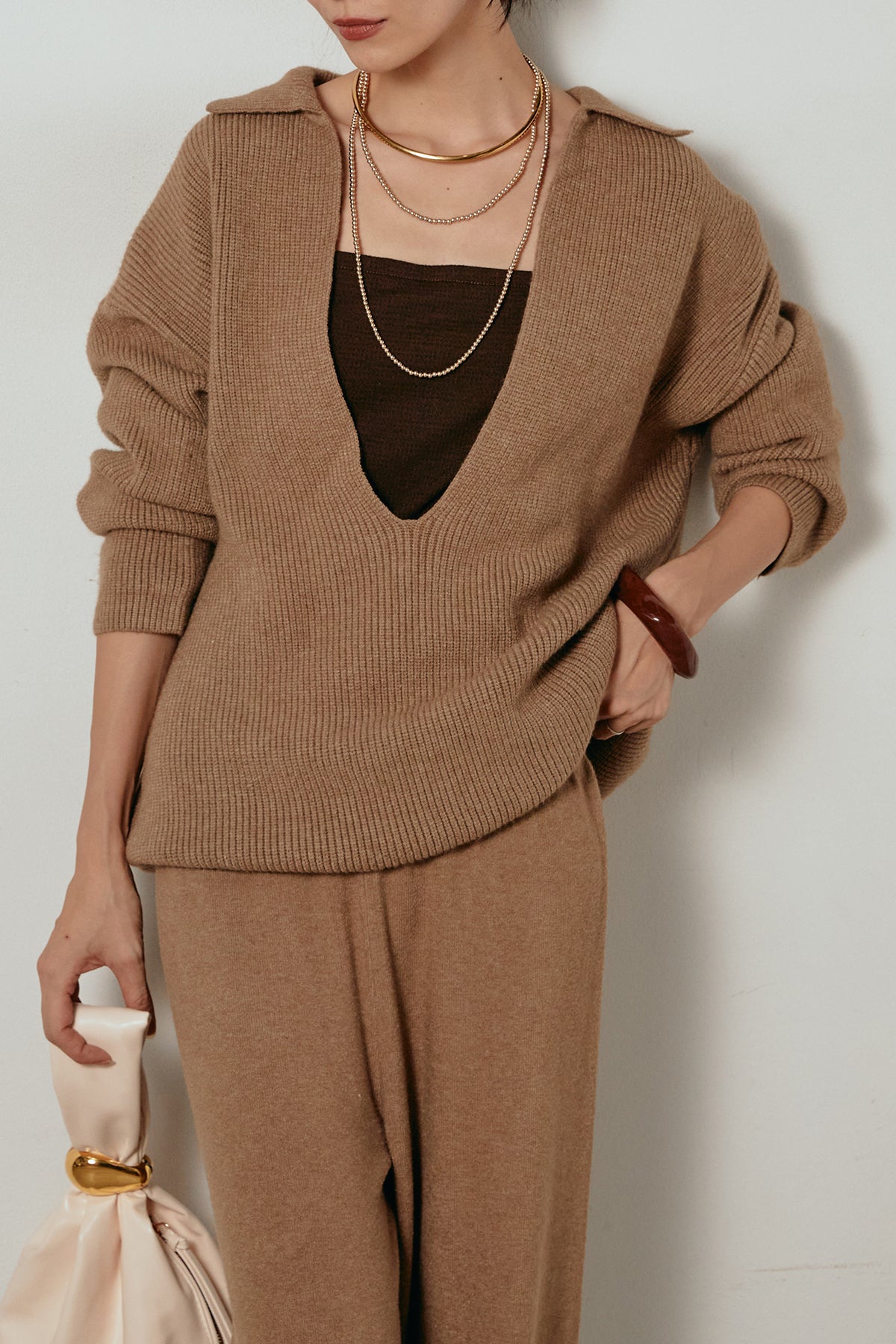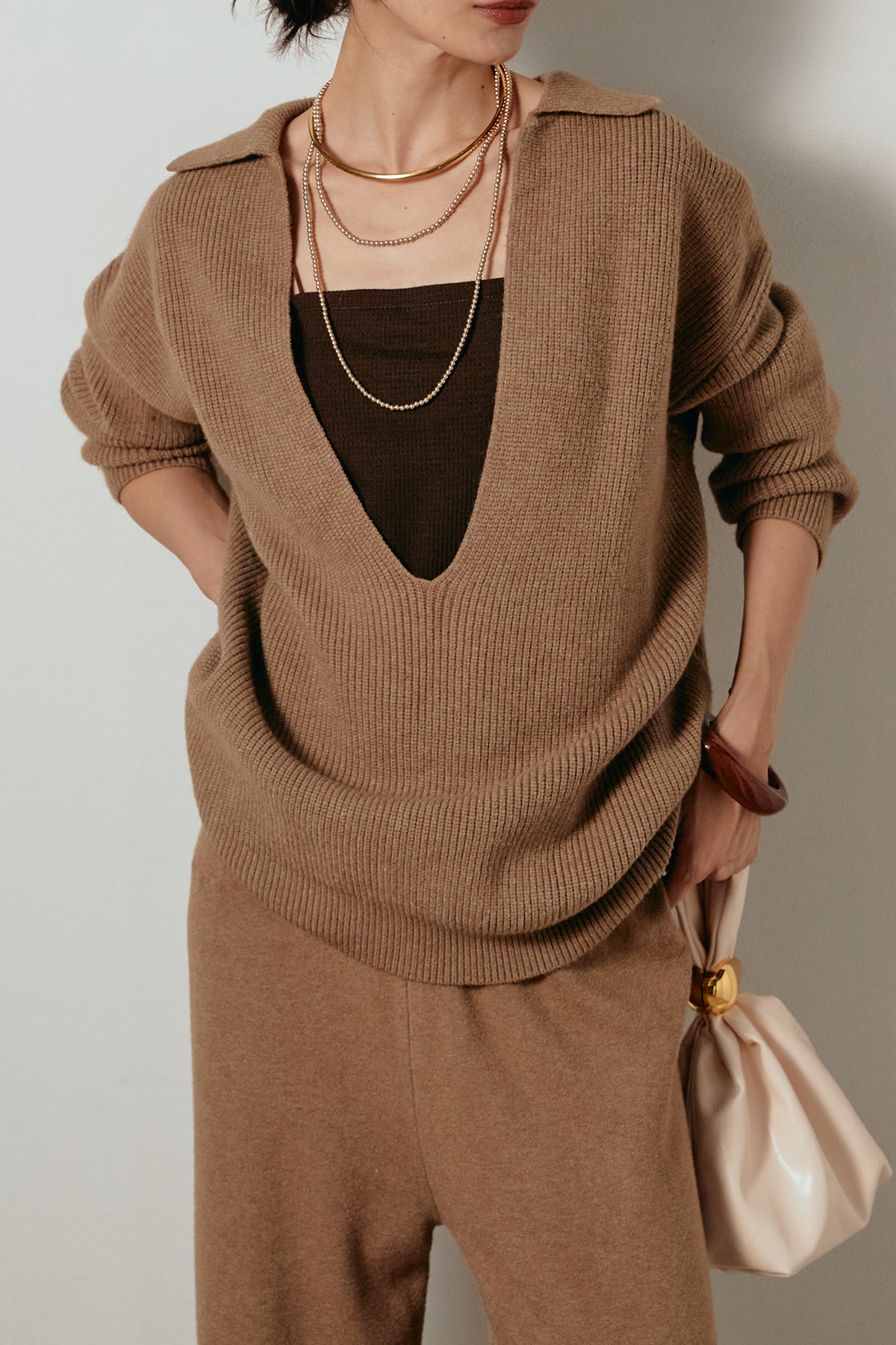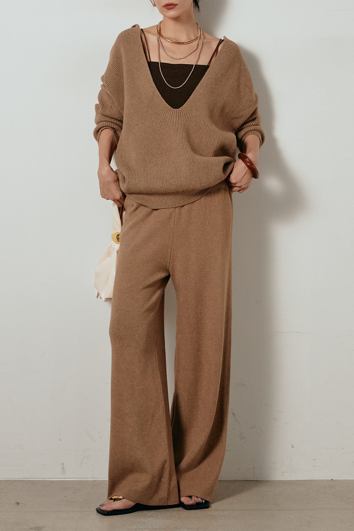 ざっくりとした編地が特徴の深Vネックニットセットアップ。トップスはデコルテがきれいに見える深めのVラインに太ベルトを合わせ、ウエストマークができるバランスの取れたシルエットに。パンツはゆるやかなストレートラインで抜け感をプラス。単品使いでも着回しやすく、ラフさと上品さを兼ね備えたアイテムです。