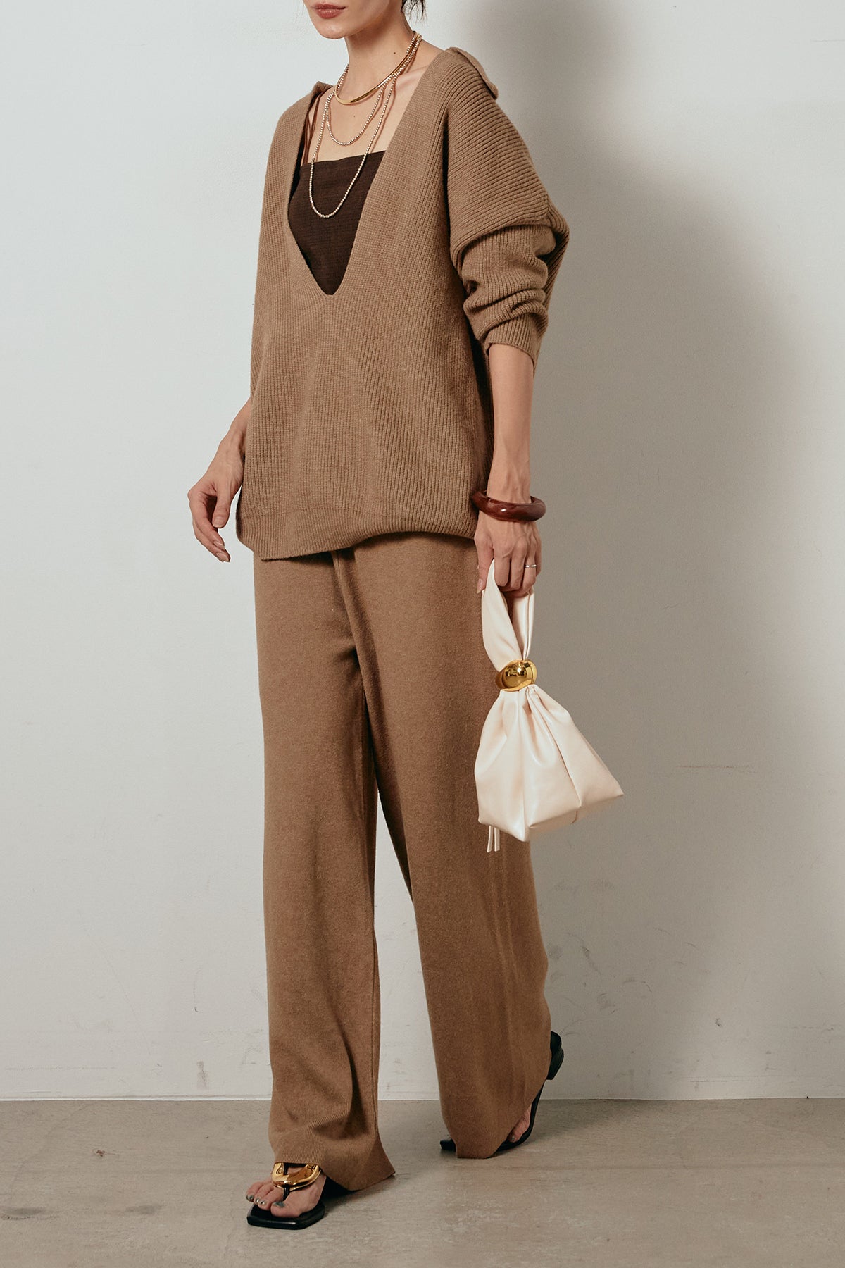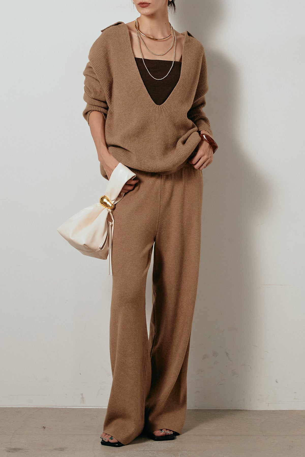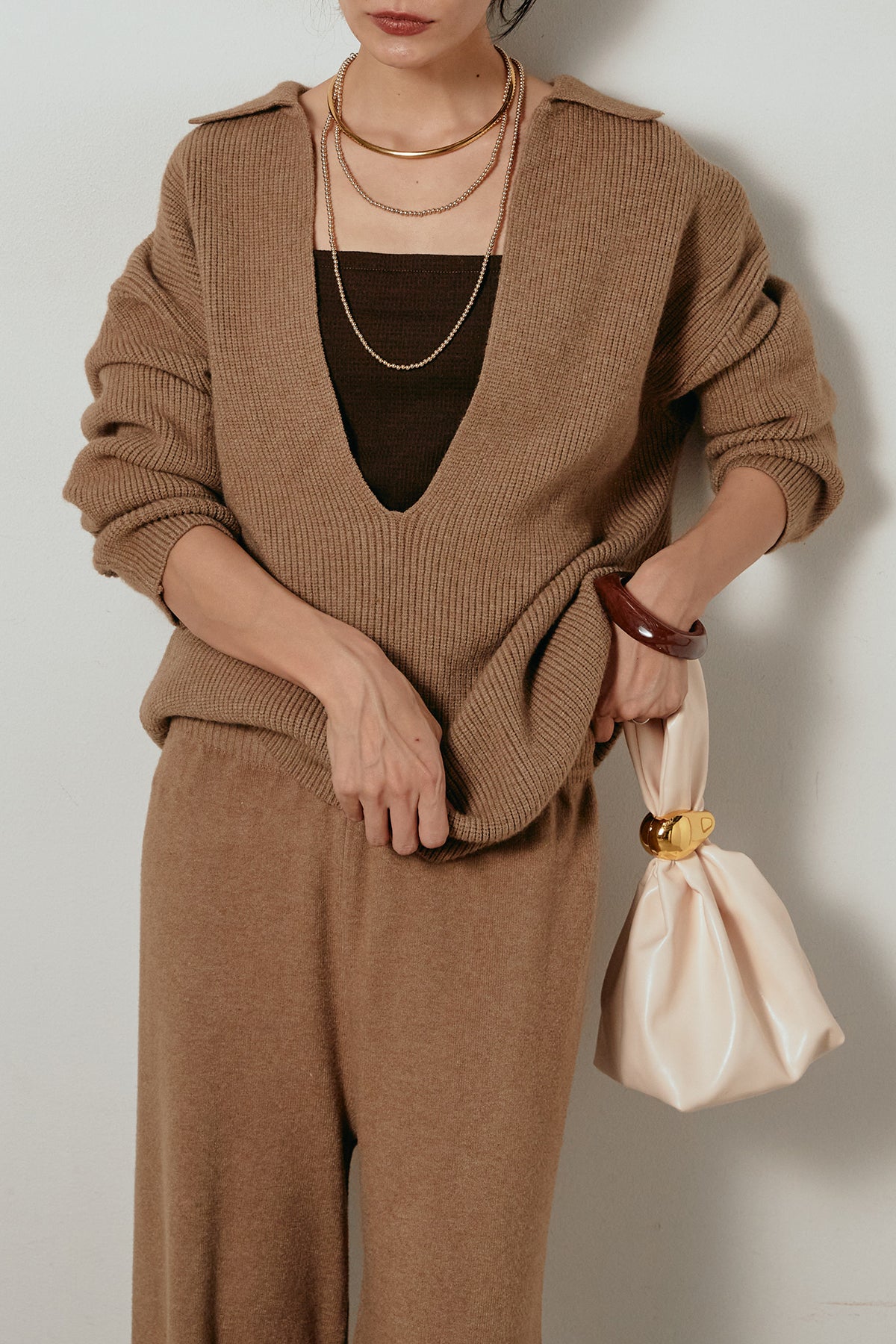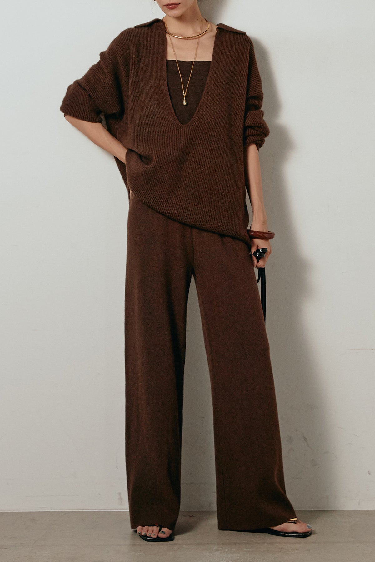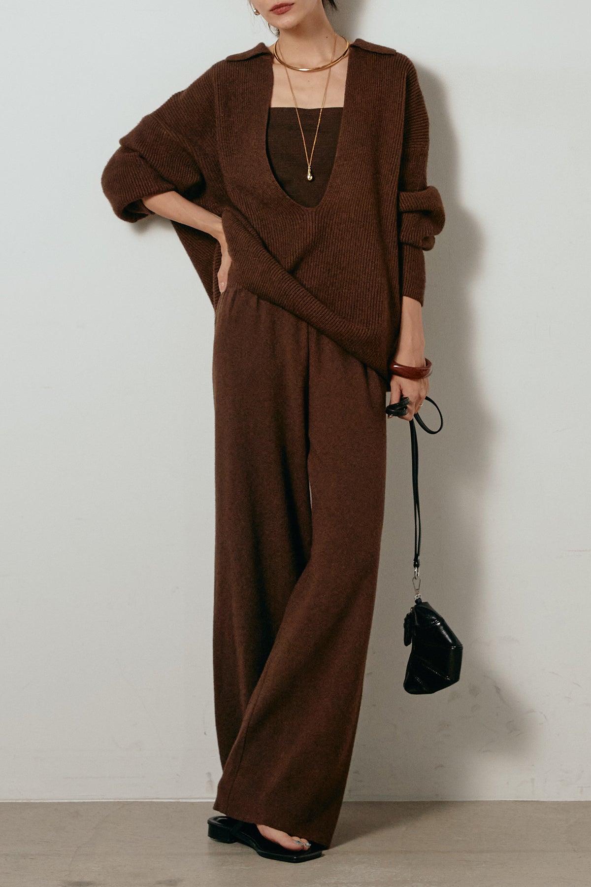 ざっくりとした編地が特徴の深Vネックニットセットアップ。トップスはデコルテがきれいに見える深めのVラインに太ベルトを合わせ、ウエストマークができるバランスの取れたシルエットに。パンツはゆるやかなストレートラインで抜け感をプラス。単品使いでも着回しやすく、ラフさと上品さを兼ね備えたアイテムです。