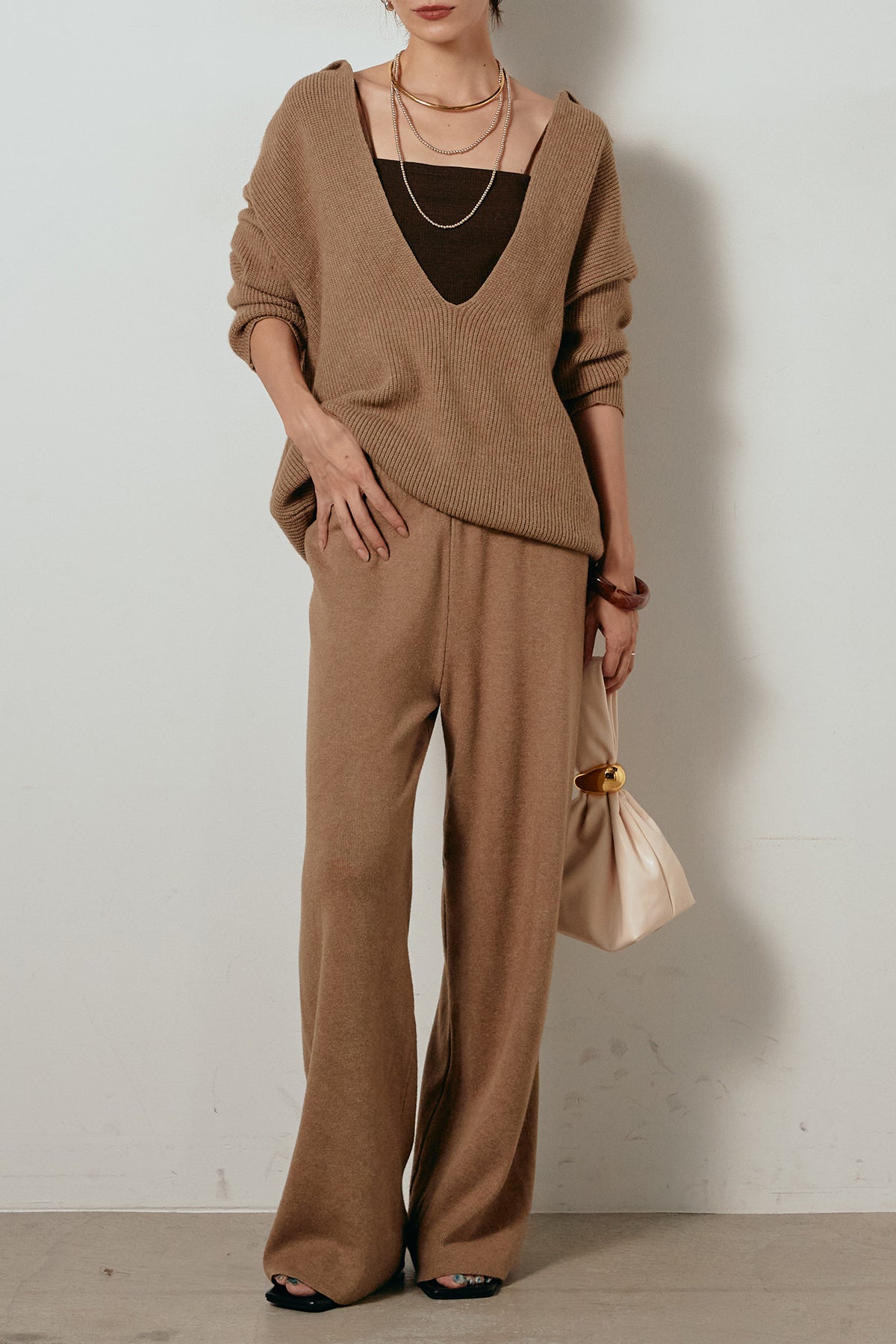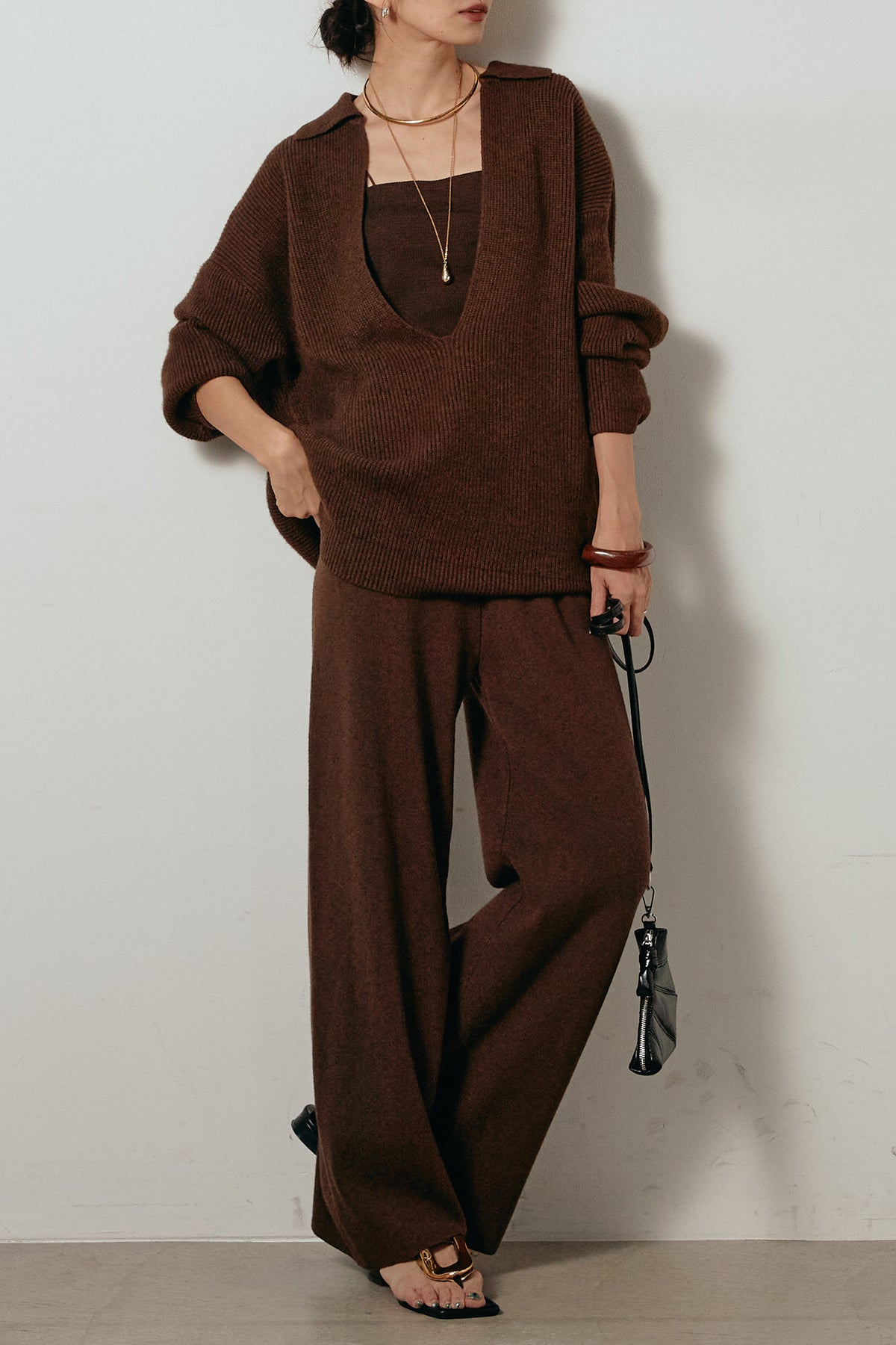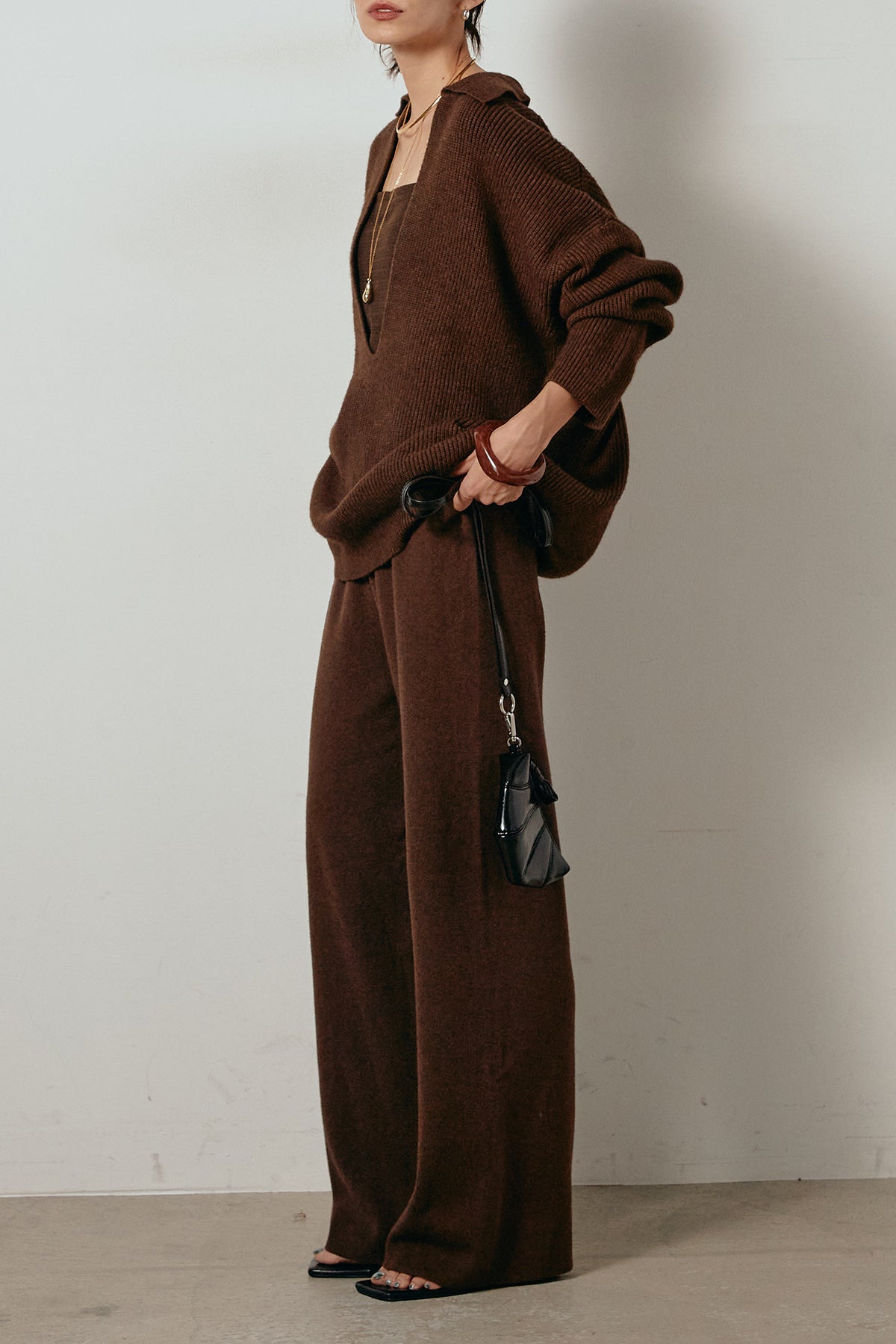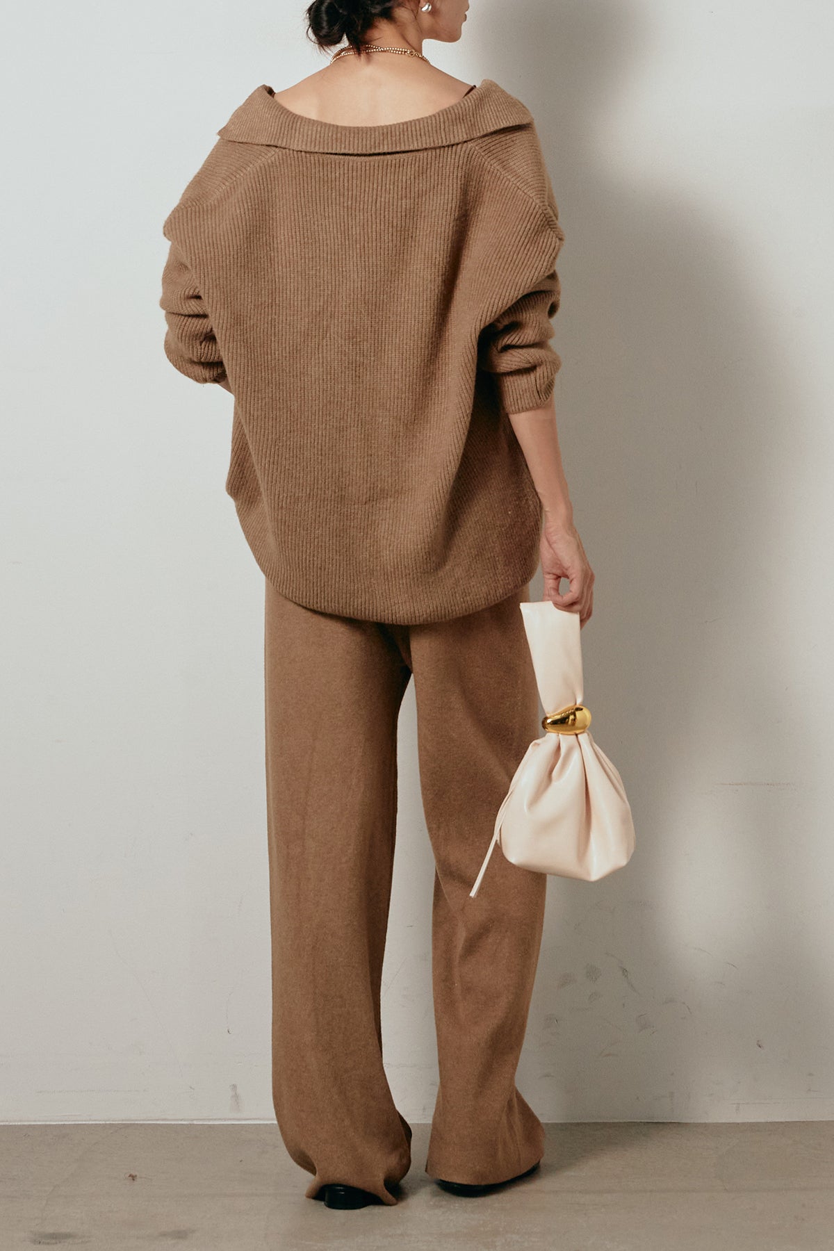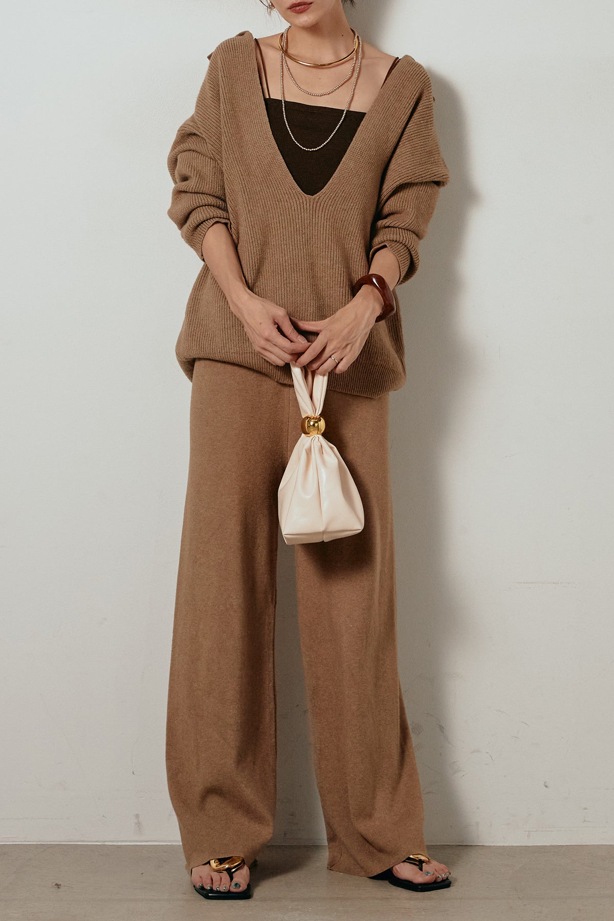 ざっくりとした編地が特徴の深Vネックニットセットアップ。トップスはデコルテがきれいに見える深めのVラインに太ベルトを合わせ、ウエストマークができるバランスの取れたシルエットに。パンツはゆるやかなストレートラインで抜け感をプラス。単品使いでも着回しやすく、ラフさと上品さを兼ね備えたアイテムです。